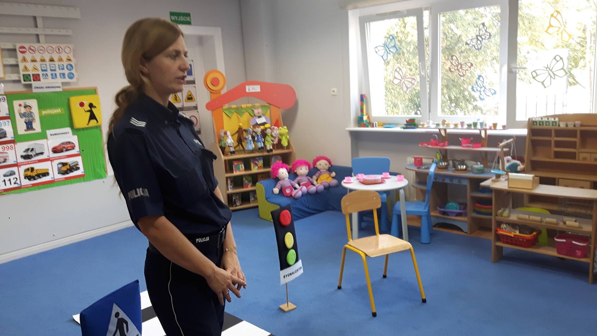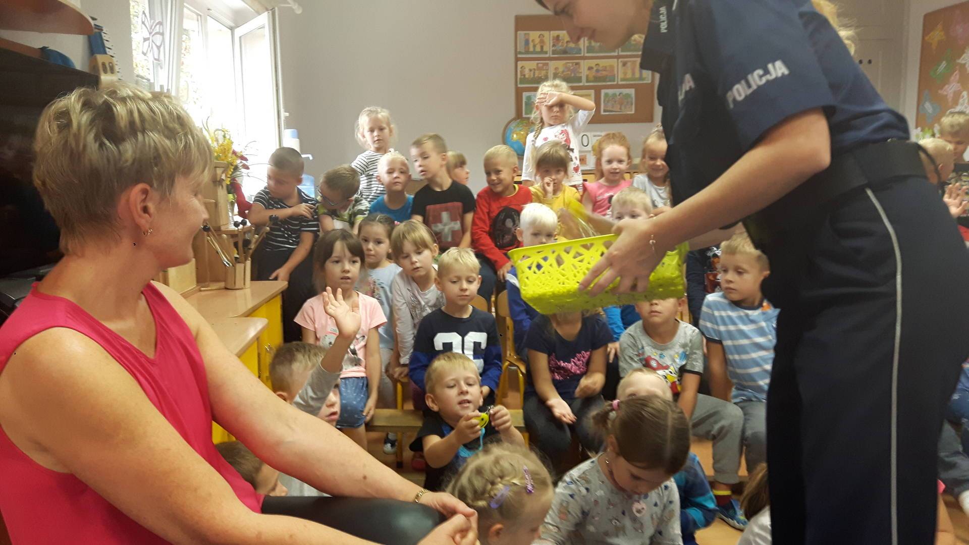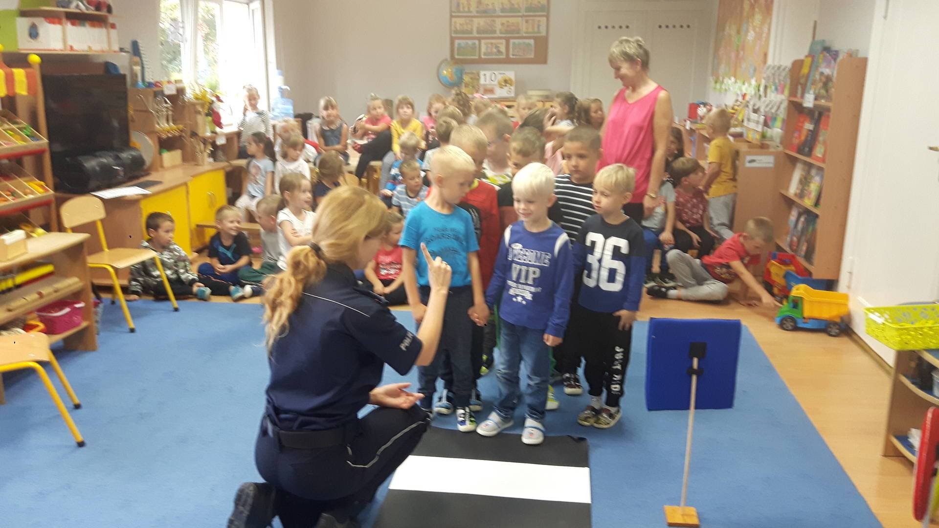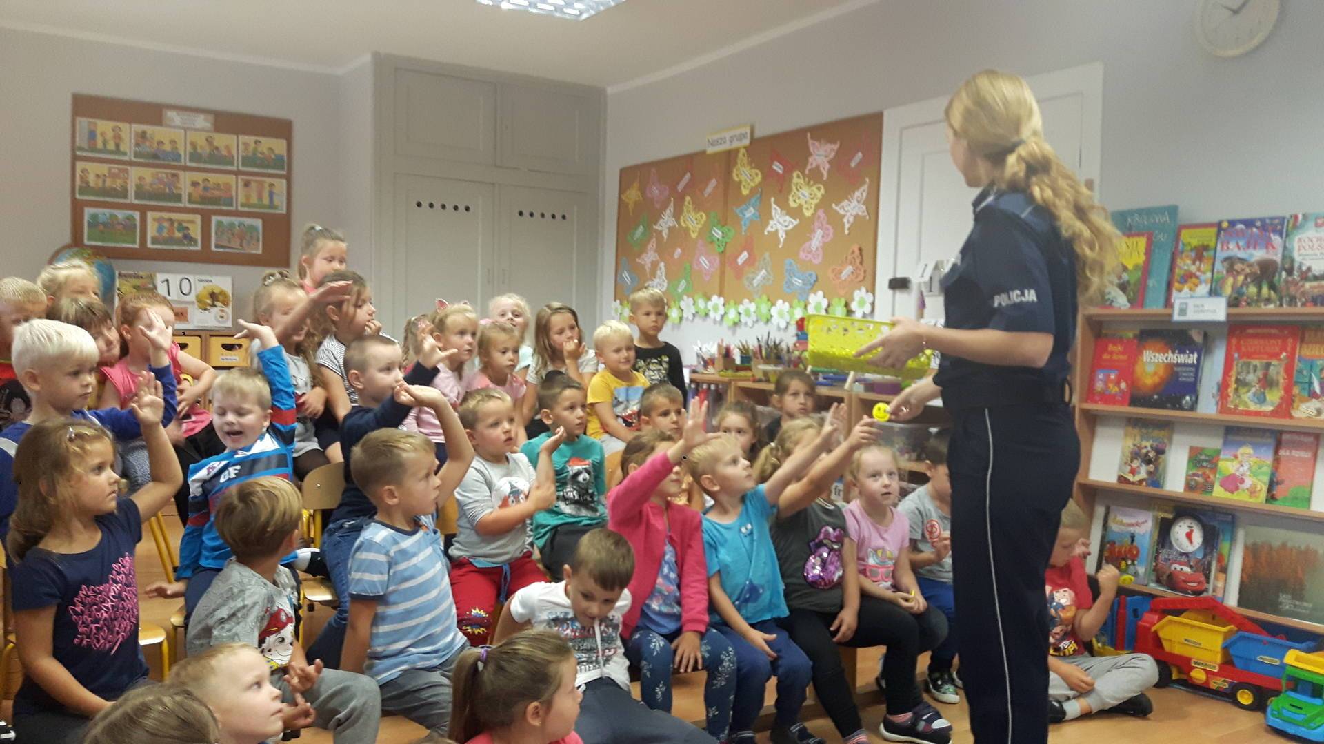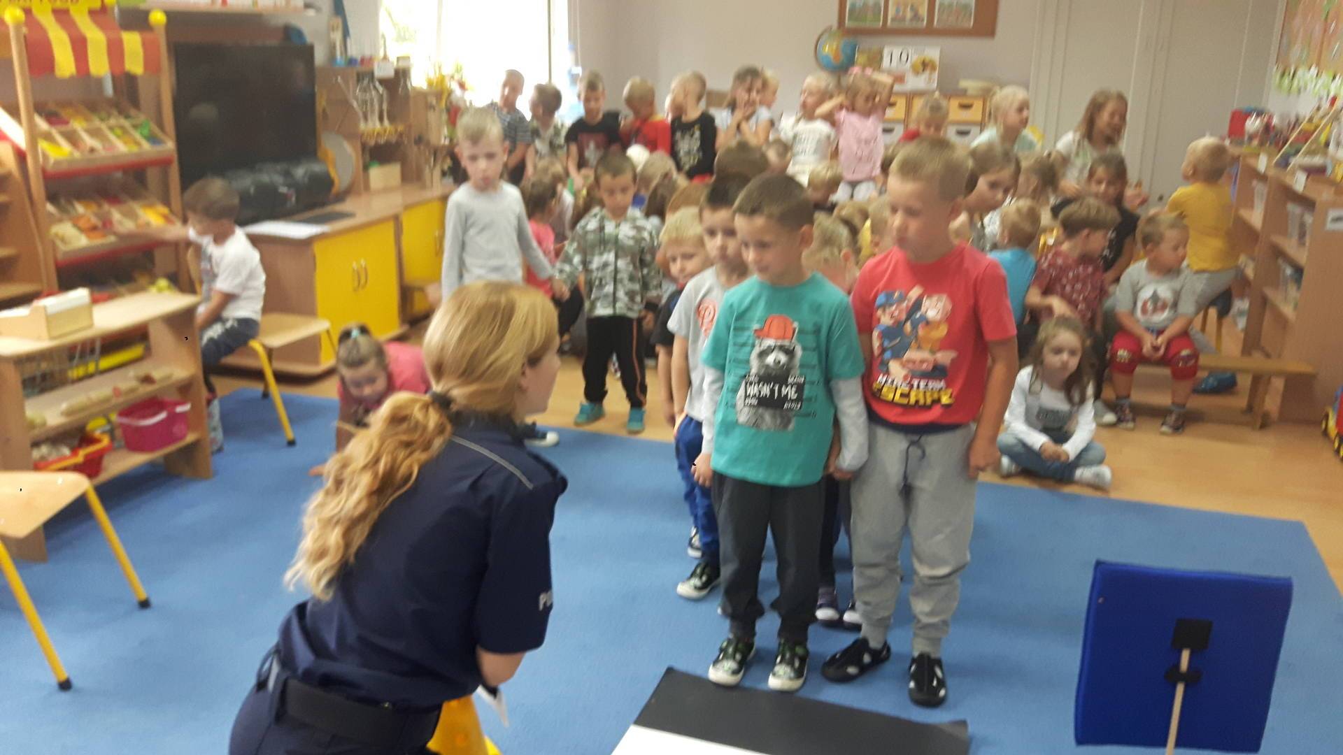 09września 2019r. w naszym przedszkolu odbyło się spotkanie z Panią policjantką z Komisariatu Policji w Lęborku. Tematem spotkania było utrwalenie z dziećmi zasad ruchu drogowego oraz przypomnienie zagadnień dotyczących bezpieczeństwa dzieci w przedszkolu i w domu. Pani policjantka, w formie praktycznej, przypomniała podstawowe zasady zachowania się podczas przechodzenia przez jezdnię. Następnie wytłumaczyła jak należy zachować się w kontaktach z obcymi ludźmi, jak dbać o bezpieczeństwo własne i innych oraz do kogo zwracać się o pomoc w sytuacji zagrożenia. Dzieci z dużym zainteresowaniem słuchały rad i wskazówek zaproszonego gościa. Na zakończenie wizyty przedszkolaki wręczyły Pani policjantce podziękowanie.