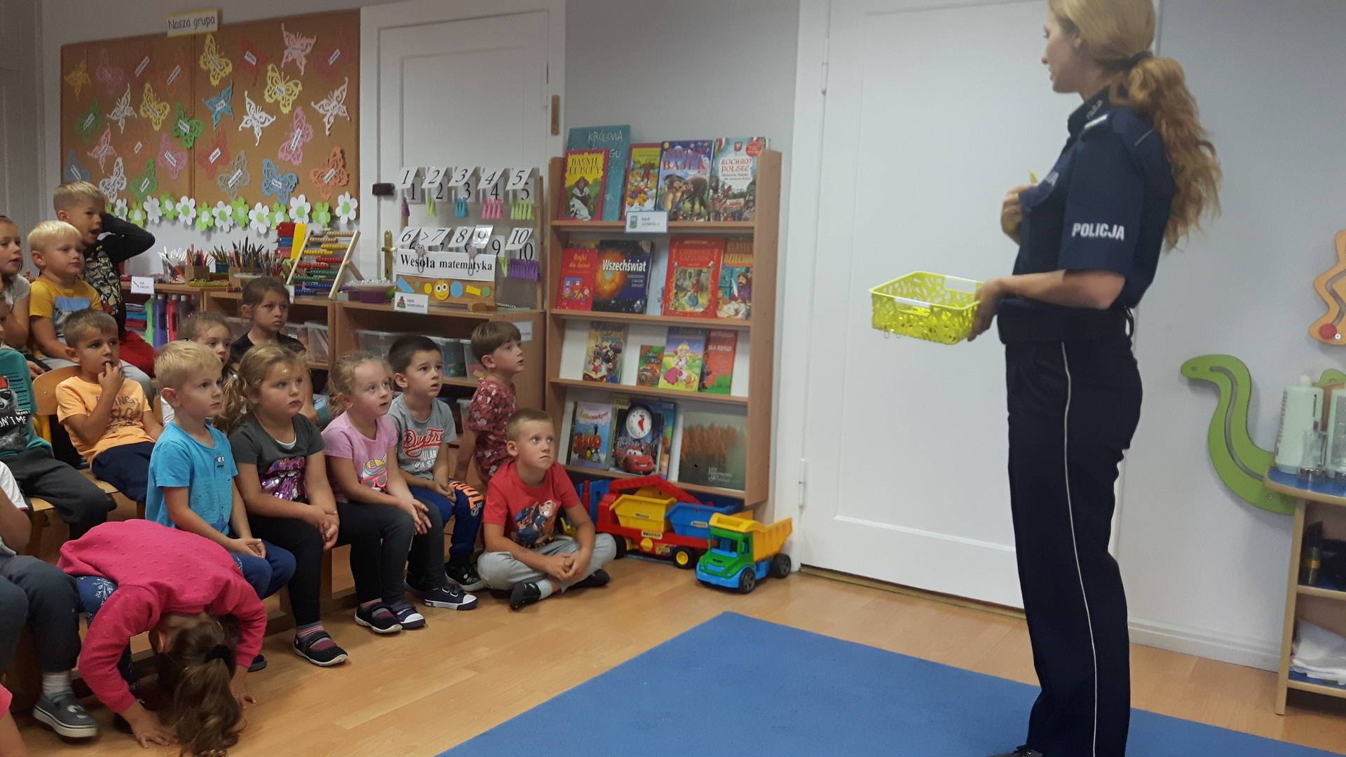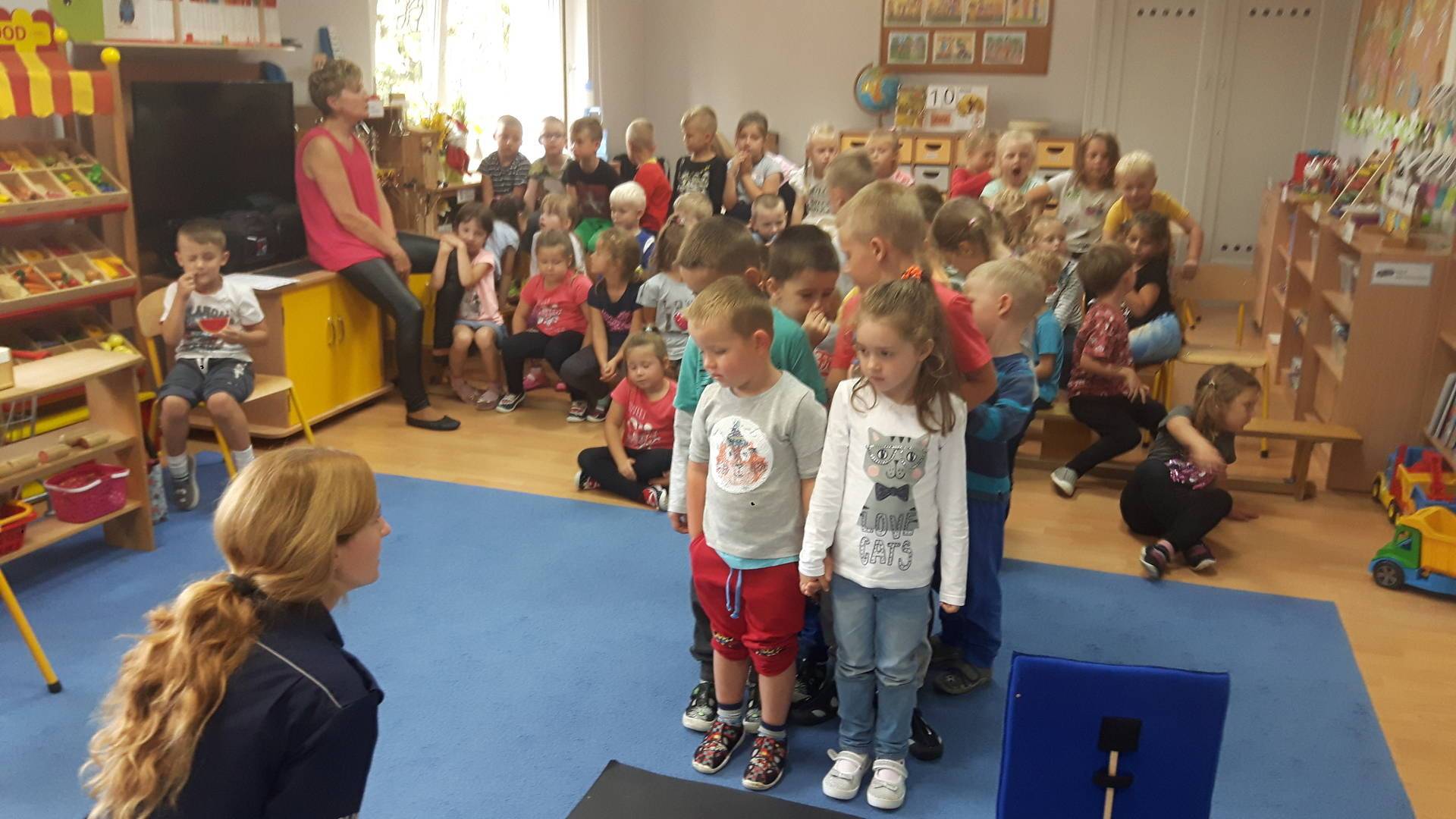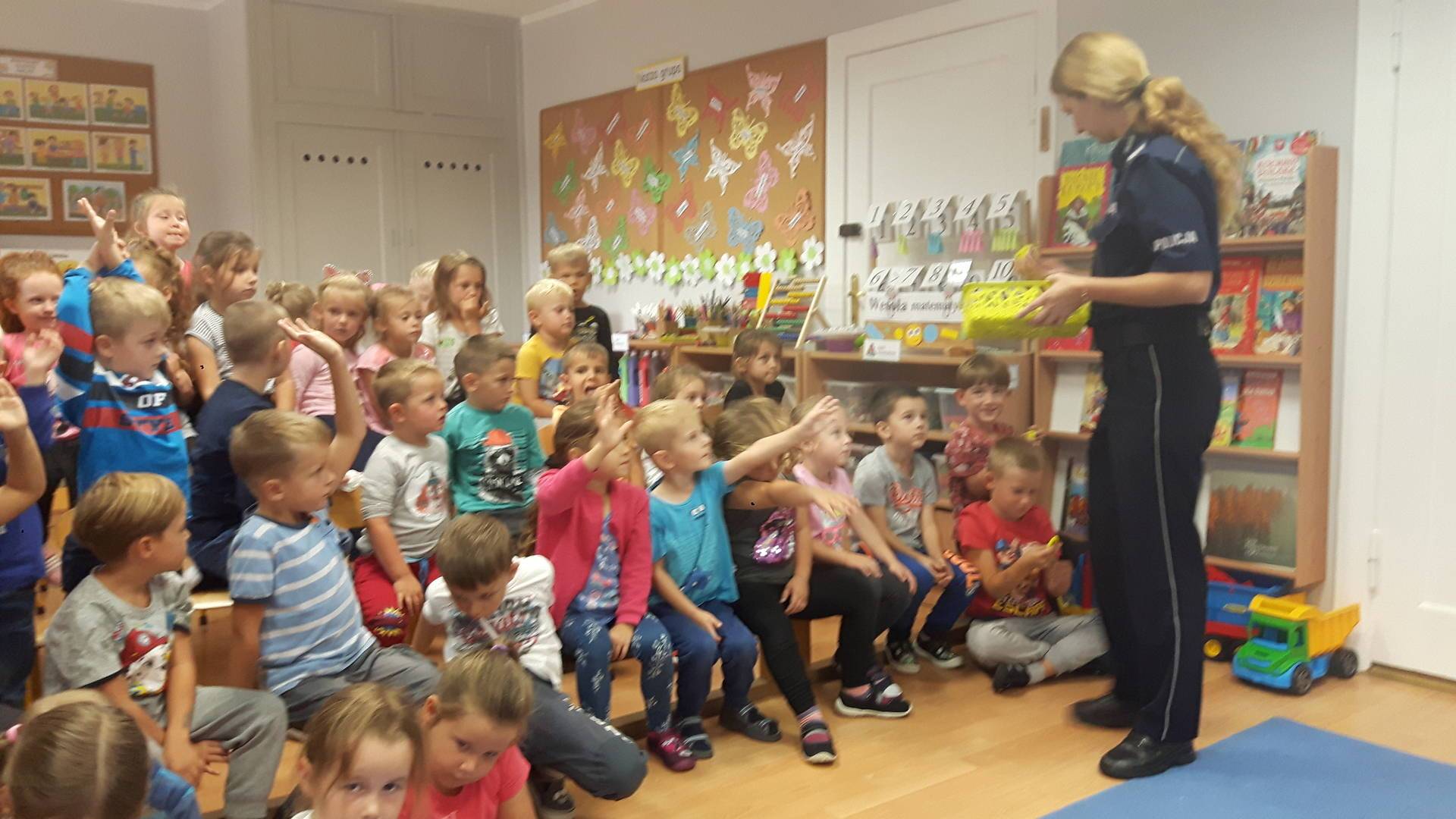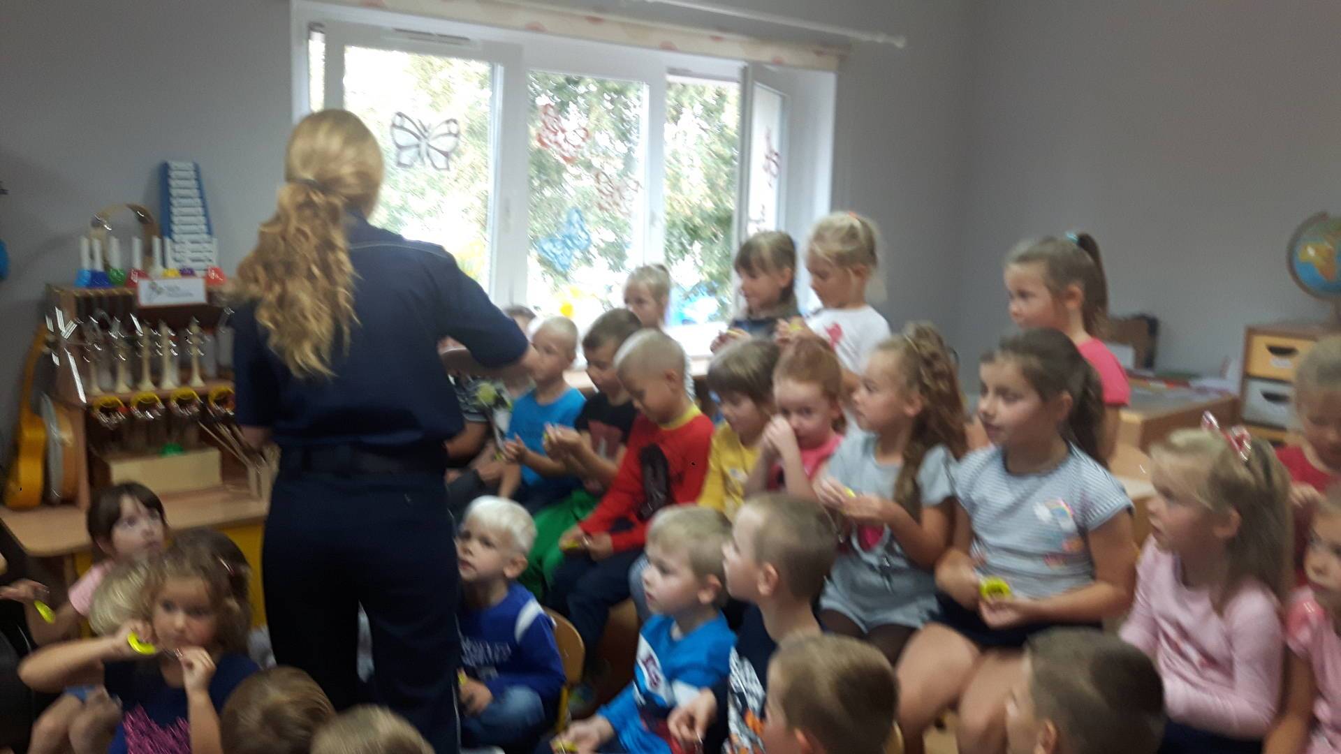 09września 2019r. w naszym przedszkolu odbyło się spotkanie z Panią policjantką z Komisariatu Policji w Lęborku. Tematem spotkania było utrwalenie z dziećmi zasad ruchu drogowego oraz przypomnienie zagadnień dotyczących bezpieczeństwa dzieci w przedszkolu i w domu. Pani policjantka, w formie praktycznej, przypomniała podstawowe zasady zachowania się podczas przechodzenia przez jezdnię. Następnie wytłumaczyła jak należy zachować się w kontaktach z obcymi ludźmi, jak dbać o bezpieczeństwo własne i innych oraz do kogo zwracać się o pomoc w sytuacji zagrożenia. Dzieci z dużym zainteresowaniem słuchały rad i wskazówek zaproszonego gościa. Na zakończenie wizyty przedszkolaki wręczyły Pani policjantce podziękowanie.