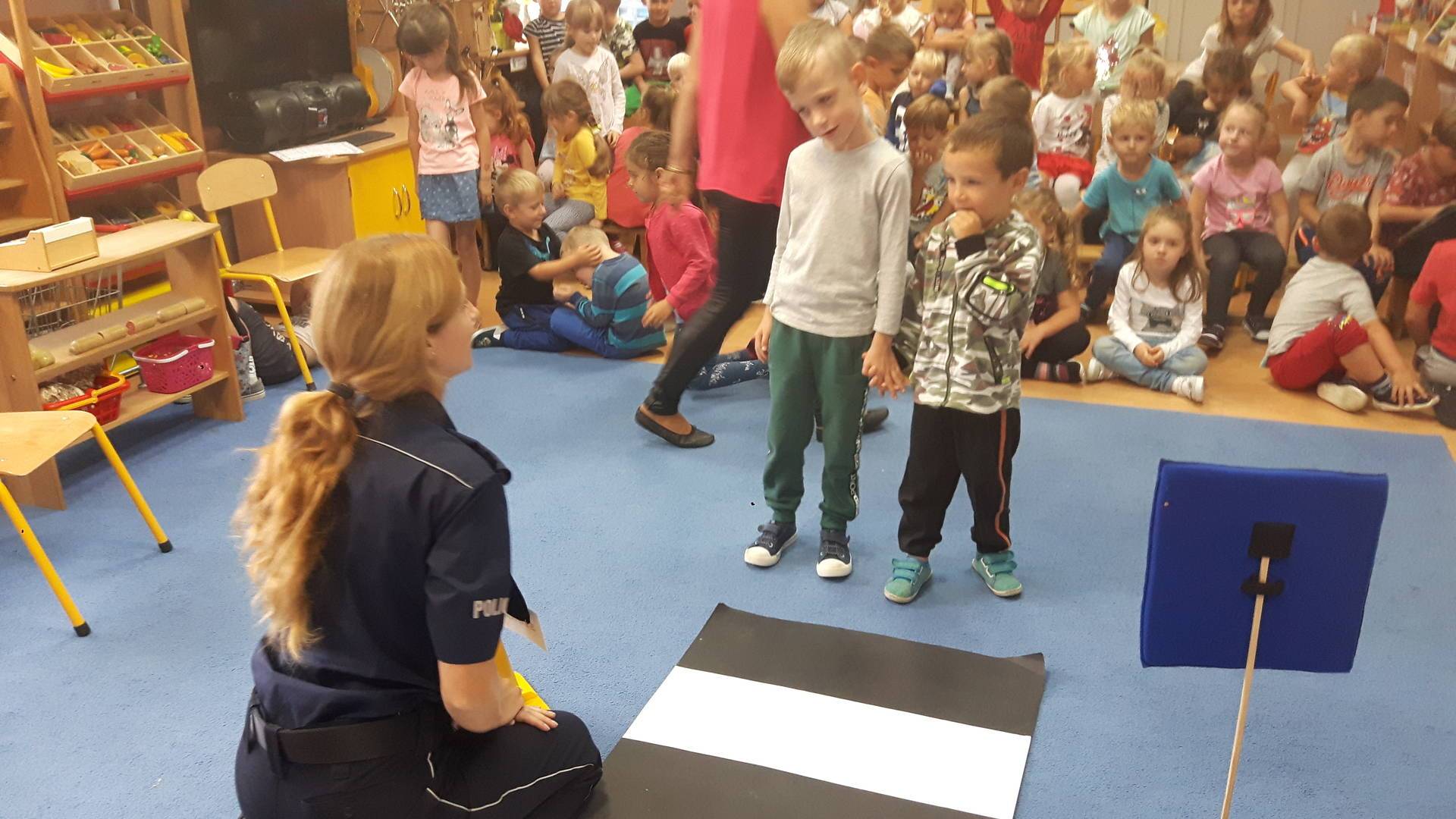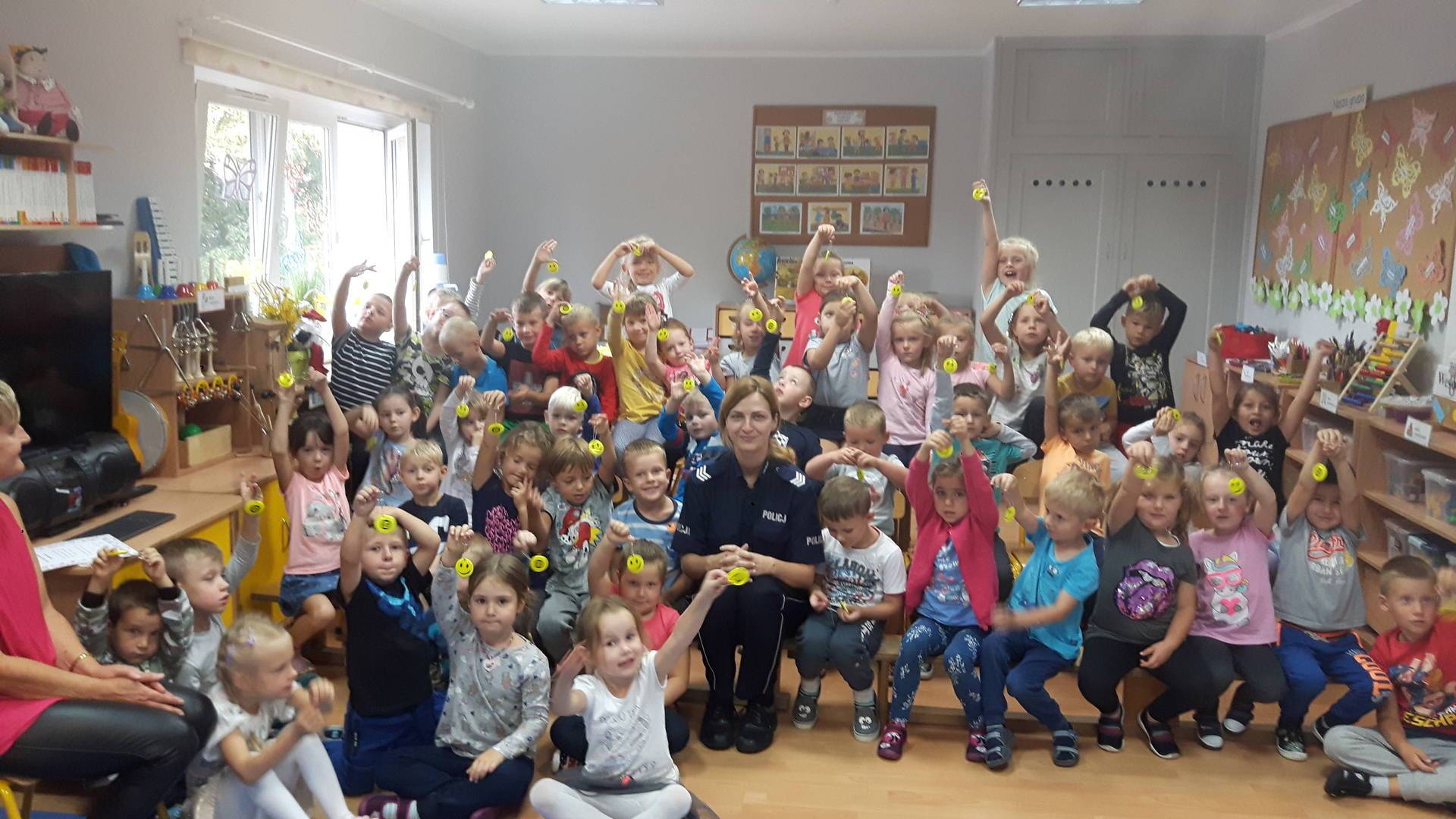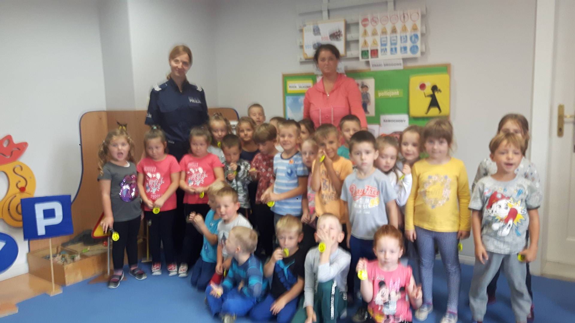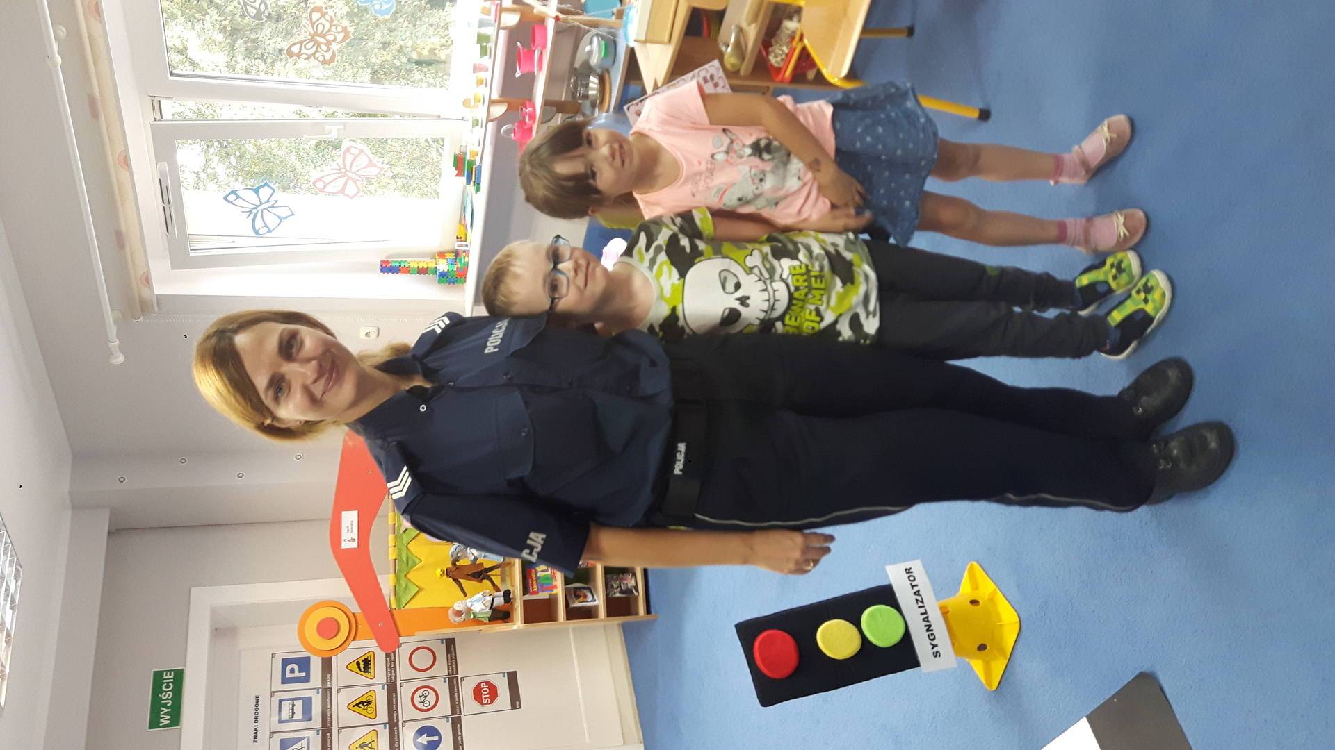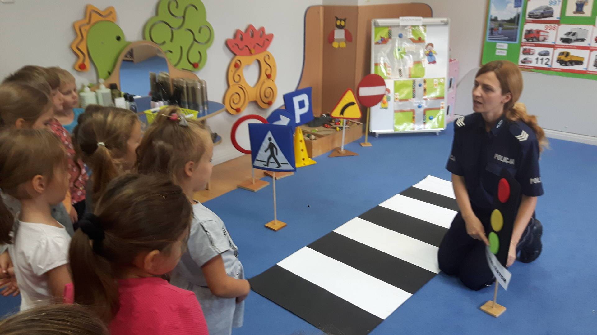 09września 2019r. w naszym przedszkolu odbyło się spotkanie z Panią policjantką z Komisariatu Policji w Lęborku. Tematem spotkania było utrwalenie z dziećmi zasad ruchu drogowego oraz przypomnienie zagadnień dotyczących bezpieczeństwa dzieci w przedszkolu i w domu. Pani policjantka, w formie praktycznej, przypomniała podstawowe zasady zachowania się podczas przechodzenia przez jezdnię. Następnie wytłumaczyła jak należy zachować się w kontaktach z obcymi ludźmi, jak dbać o bezpieczeństwo własne i innych oraz do kogo zwracać się o pomoc w sytuacji zagrożenia. Dzieci z dużym zainteresowaniem słuchały rad i wskazówek zaproszonego gościa. Na zakończenie wizyty przedszkolaki wręczyły Pani policjantce podziękowanie.