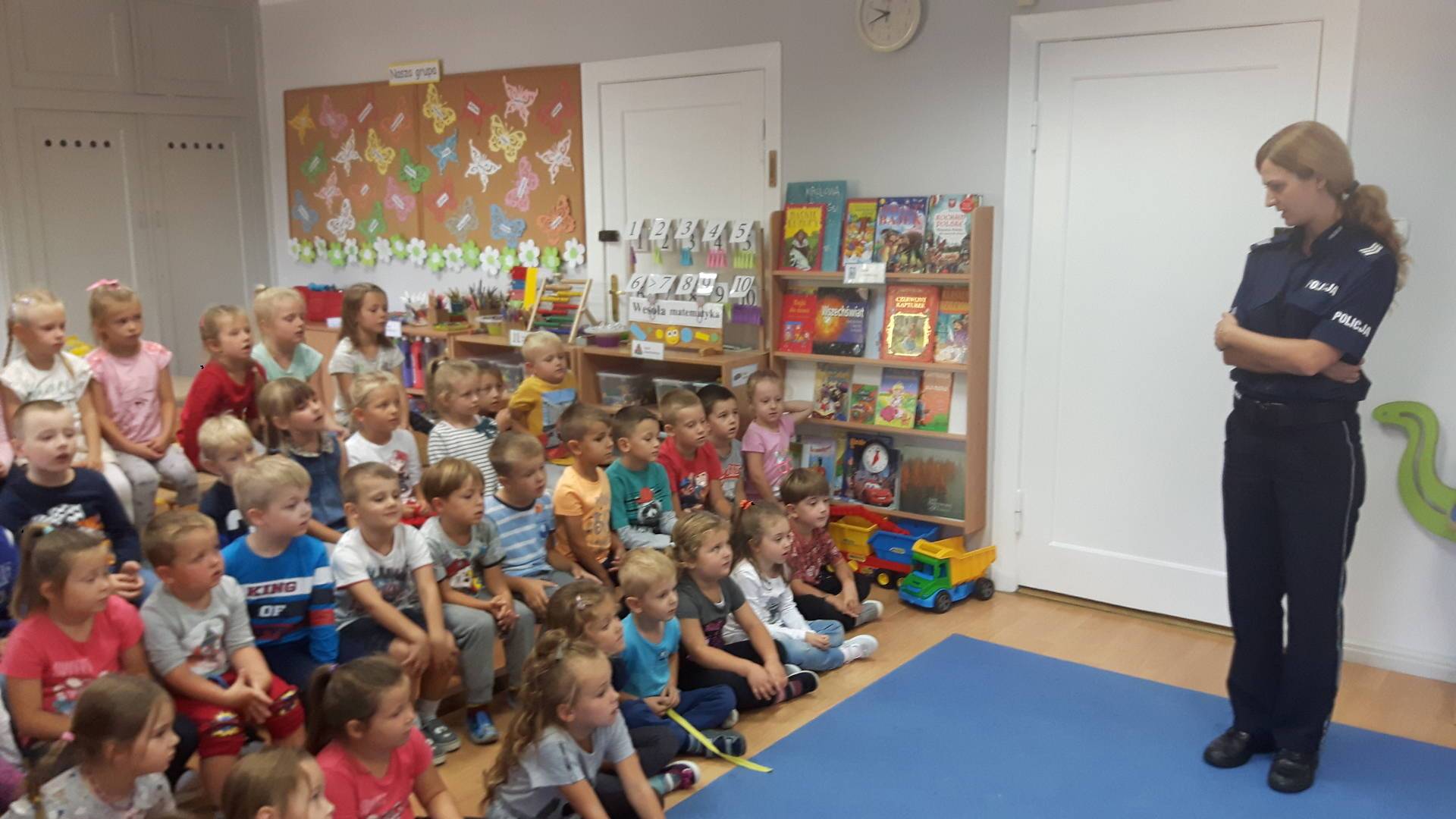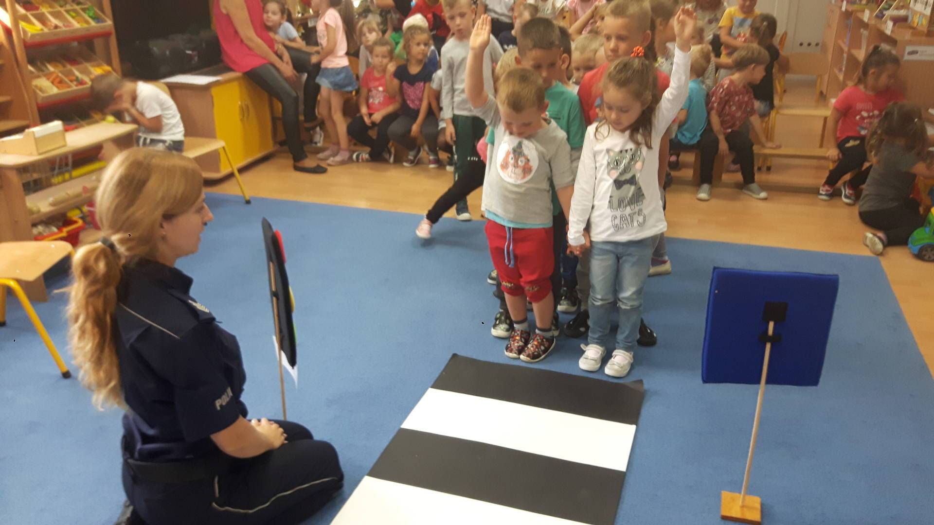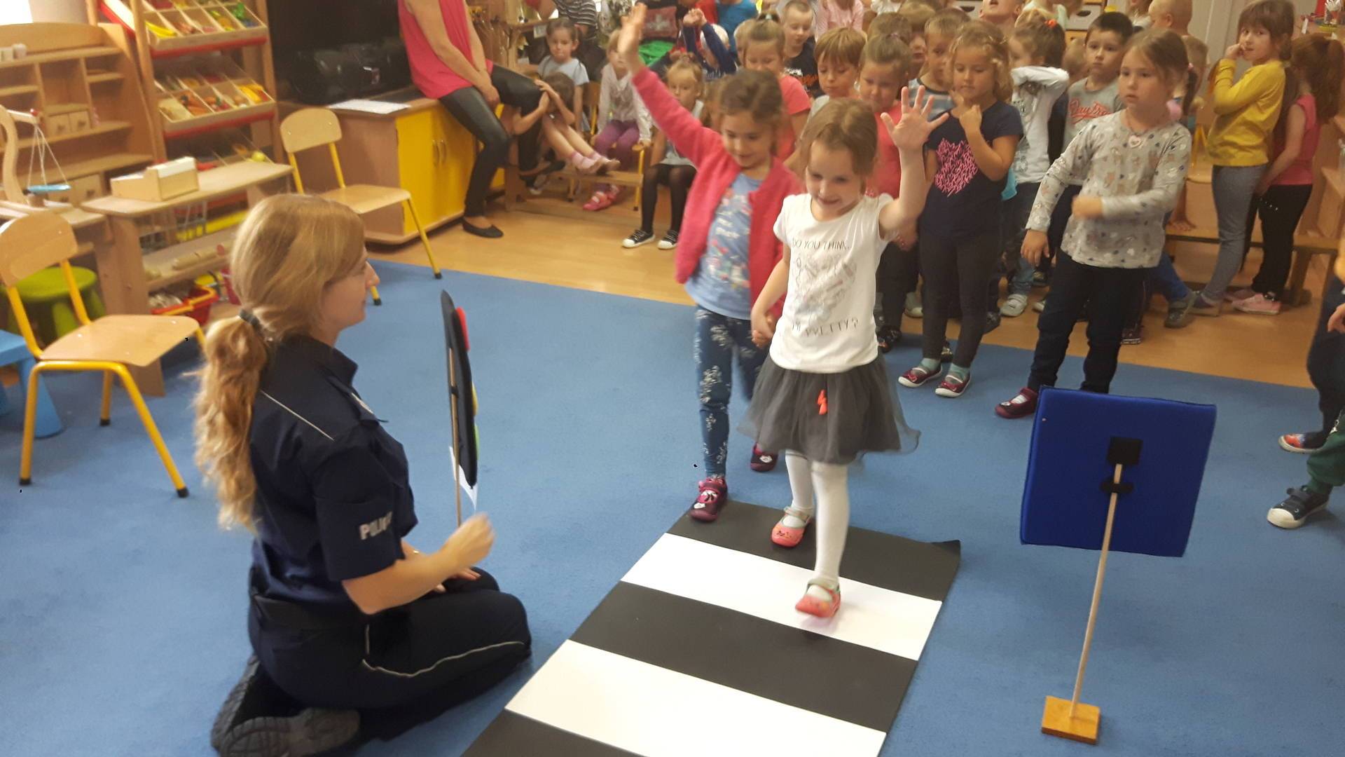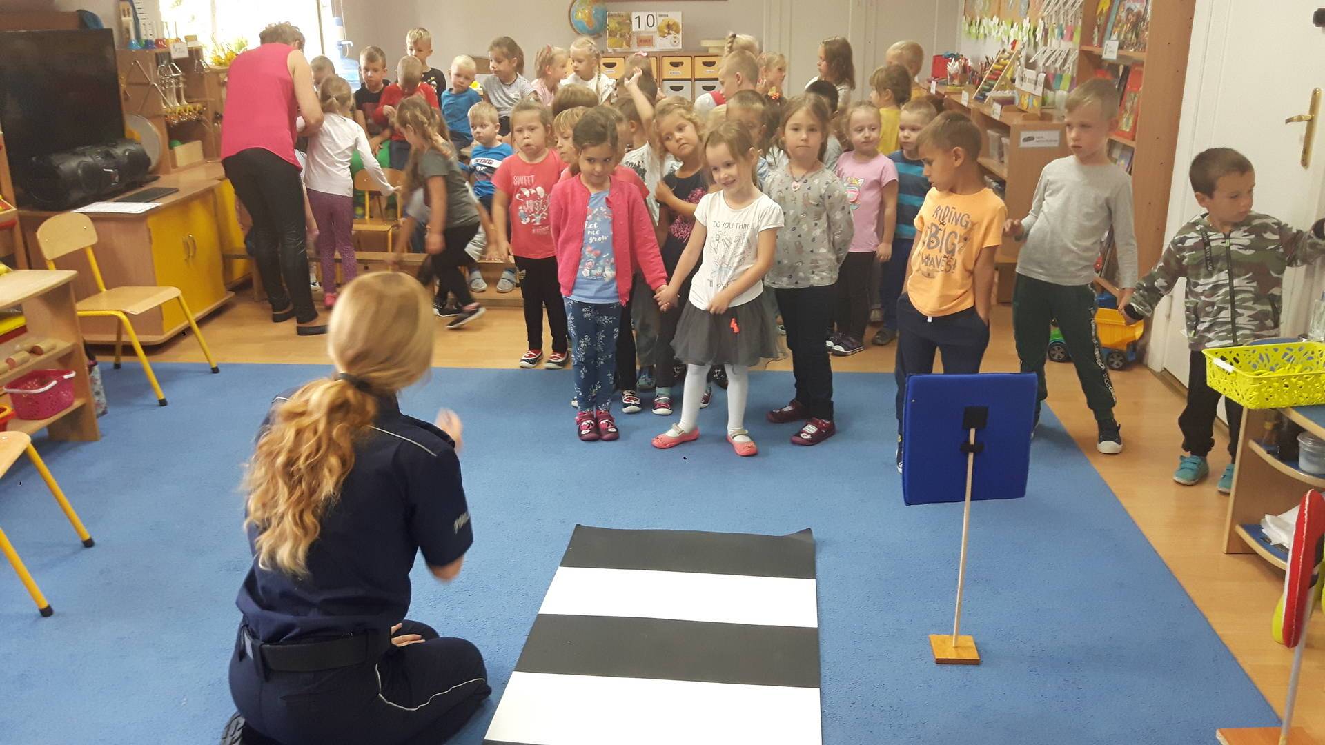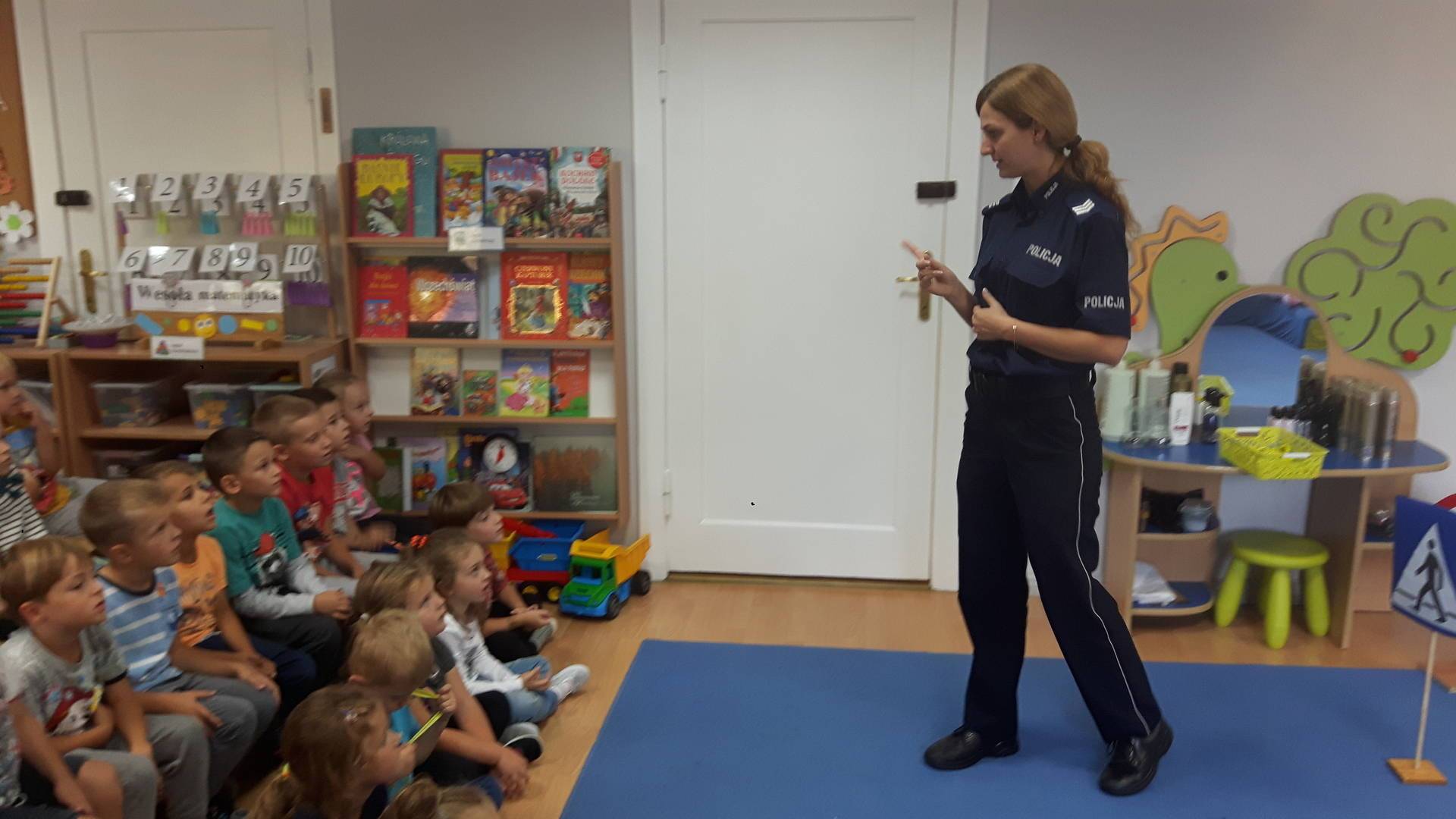 09września 2019r. w naszym przedszkolu odbyło się spotkanie z Panią policjantką z Komisariatu Policji w Lęborku. Tematem spotkania było utrwalenie z dziećmi zasad ruchu drogowego oraz przypomnienie zagadnień dotyczących bezpieczeństwa dzieci w przedszkolu i w domu. Pani policjantka, w formie praktycznej, przypomniała podstawowe zasady zachowania się podczas przechodzenia przez jezdnię. Następnie wytłumaczyła jak należy zachować się w kontaktach z obcymi ludźmi, jak dbać o bezpieczeństwo własne i innych oraz do kogo zwracać się o pomoc w sytuacji zagrożenia. Dzieci z dużym zainteresowaniem słuchały rad i wskazówek zaproszonego gościa. Na zakończenie wizyty przedszkolaki wręczyły Pani policjantce podziękowanie.