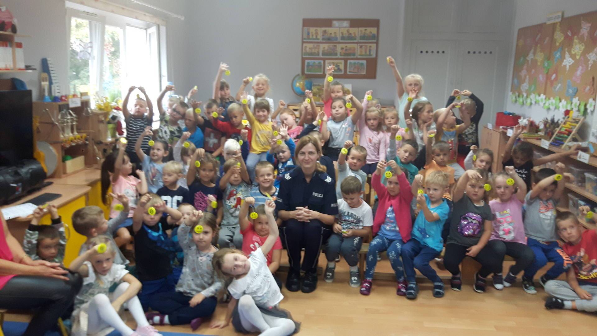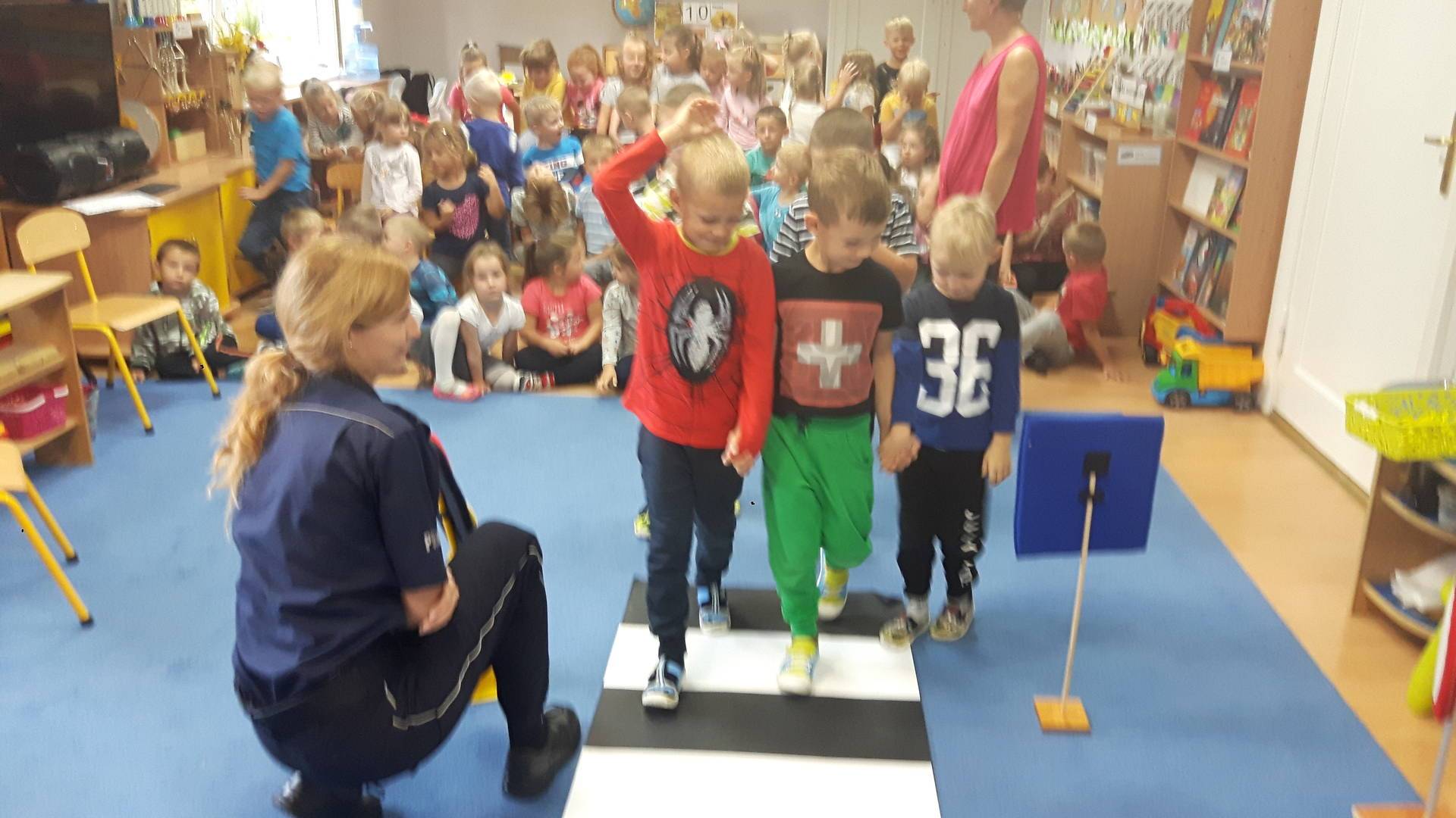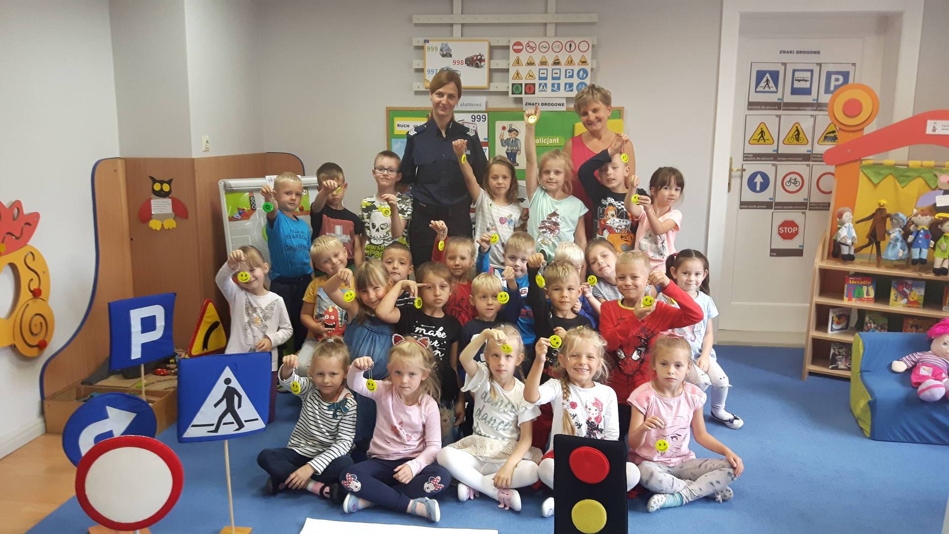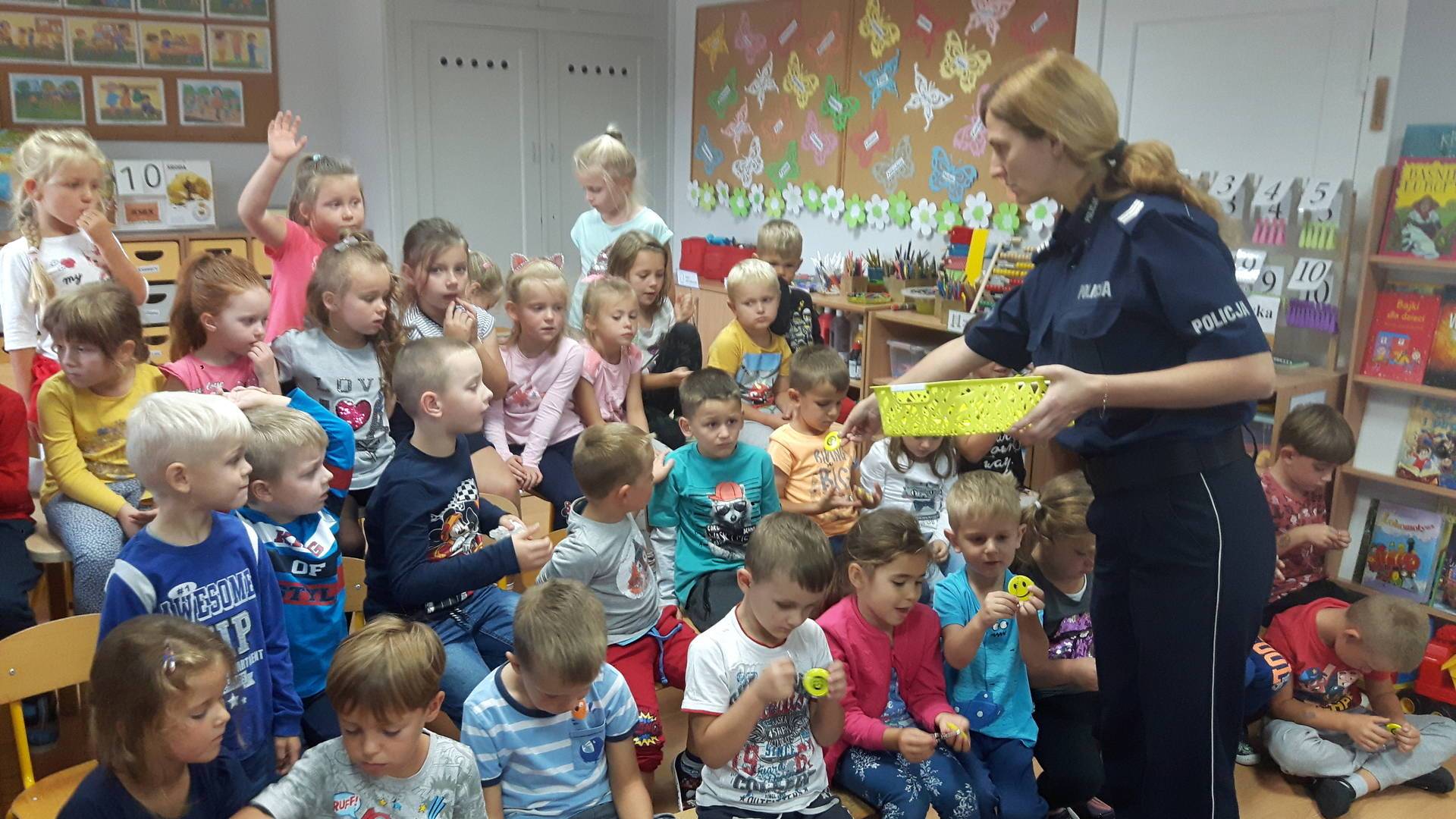 09września 2019r. w naszym przedszkolu odbyło się spotkanie z Panią policjantką z Komisariatu Policji w Lęborku. Tematem spotkania było utrwalenie z dziećmi zasad ruchu drogowego oraz przypomnienie zagadnień dotyczących bezpieczeństwa dzieci w przedszkolu i w domu. Pani policjantka, w formie praktycznej, przypomniała podstawowe zasady zachowania się podczas przechodzenia przez jezdnię. Następnie wytłumaczyła jak należy zachować się w kontaktach z obcymi ludźmi, jak dbać o bezpieczeństwo własne i innych oraz do kogo zwracać się o pomoc w sytuacji zagrożenia. Dzieci z dużym zainteresowaniem słuchały rad i wskazówek zaproszonego gościa. Na zakończenie wizyty przedszkolaki wręczyły Pani policjantce podziękowanie.