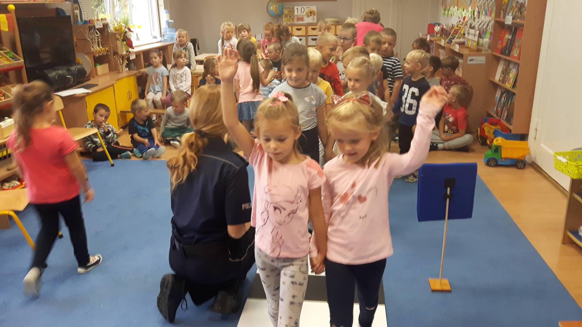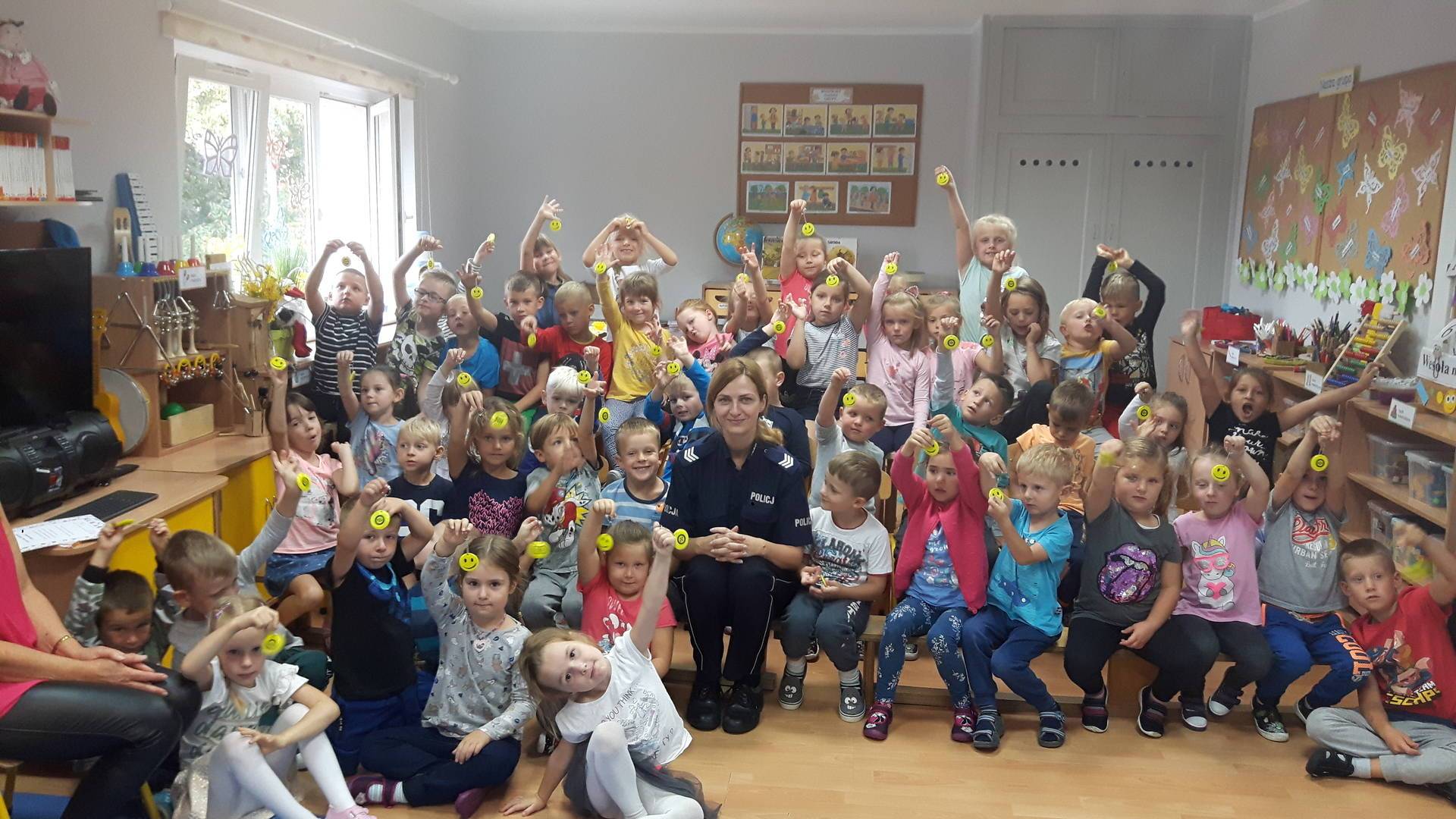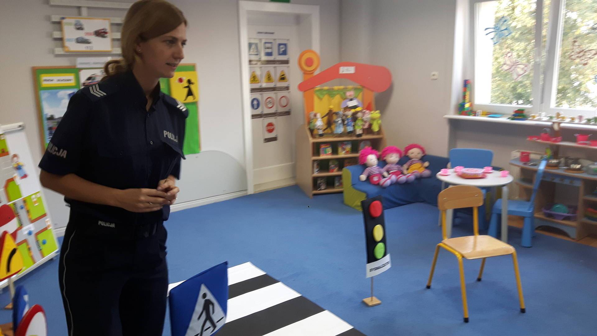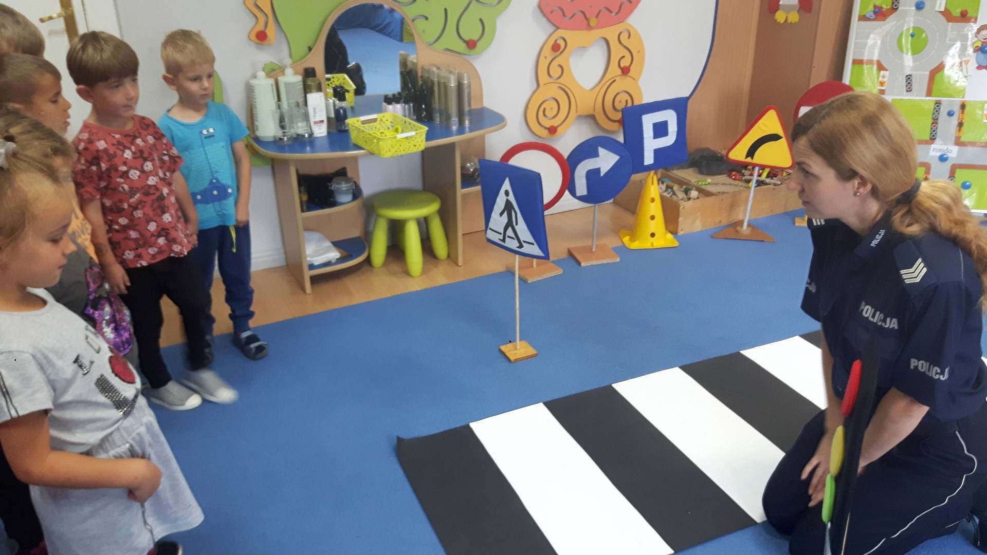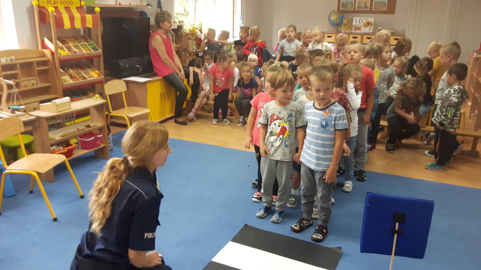09września 2019r. w naszym przedszkolu odbyło się spotkanie z Panią policjantką z Komisariatu Policji w Lęborku. Tematem spotkania było utrwalenie z dziećmi zasad ruchu drogowego oraz przypomnienie zagadnień dotyczących bezpieczeństwa dzieci w przedszkolu i w domu. Pani policjantka, w formie praktycznej, przypomniała podstawowe zasady zachowania się podczas przechodzenia przez jezdnię. Następnie wytłumaczyła jak należy zachować się w kontaktach z obcymi ludźmi, jak dbać o bezpieczeństwo własne i innych oraz do kogo zwracać się o pomoc w sytuacji zagrożenia. Dzieci z dużym zainteresowaniem słuchały rad i wskazówek zaproszonego gościa. Na zakończenie wizyty przedszkolaki wręczyły Pani policjantce podziękowanie.
