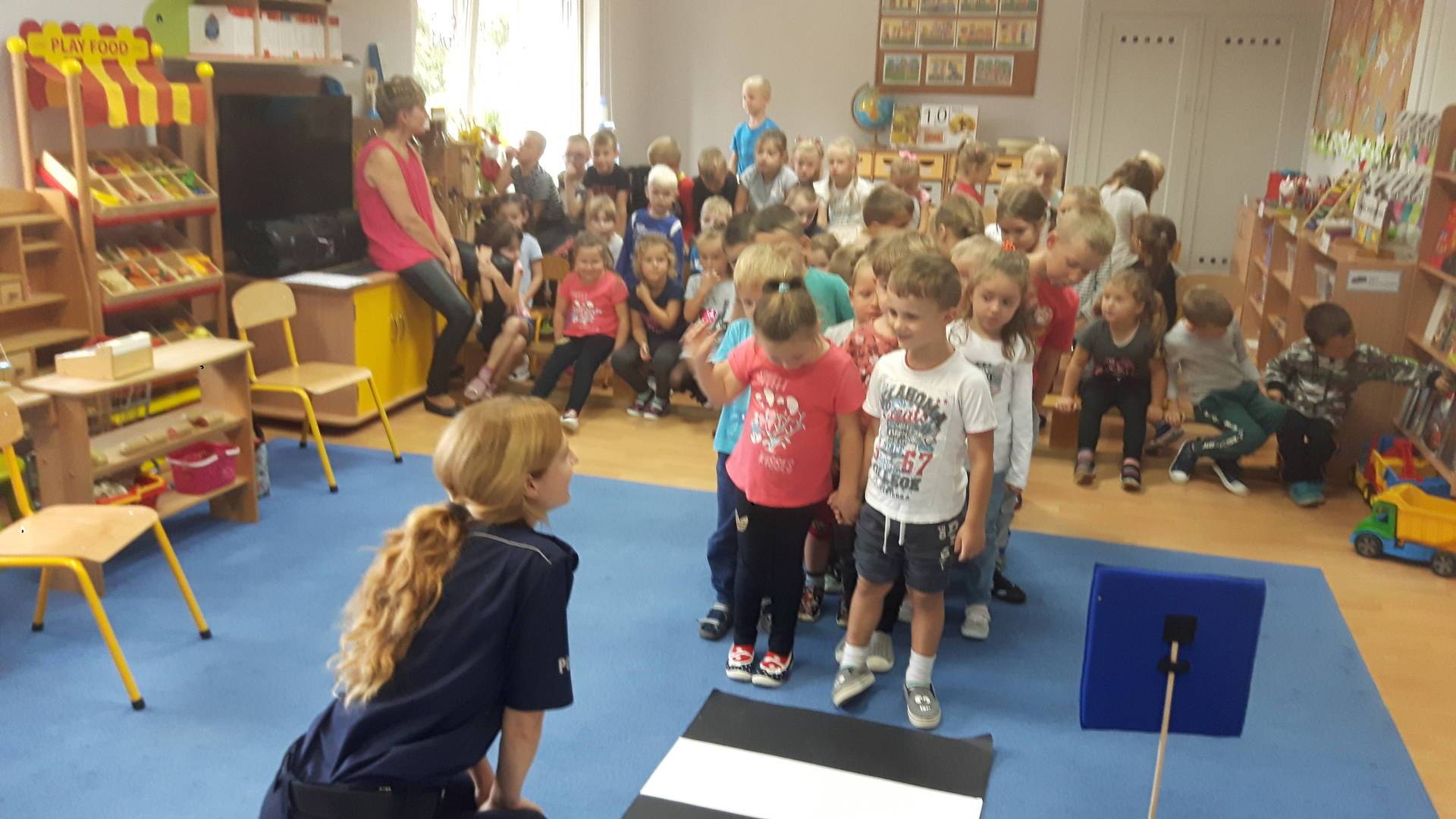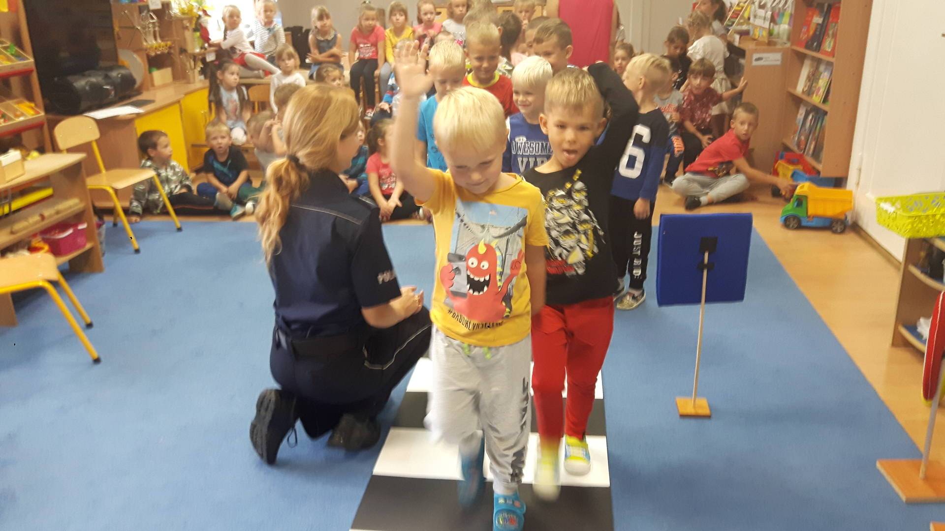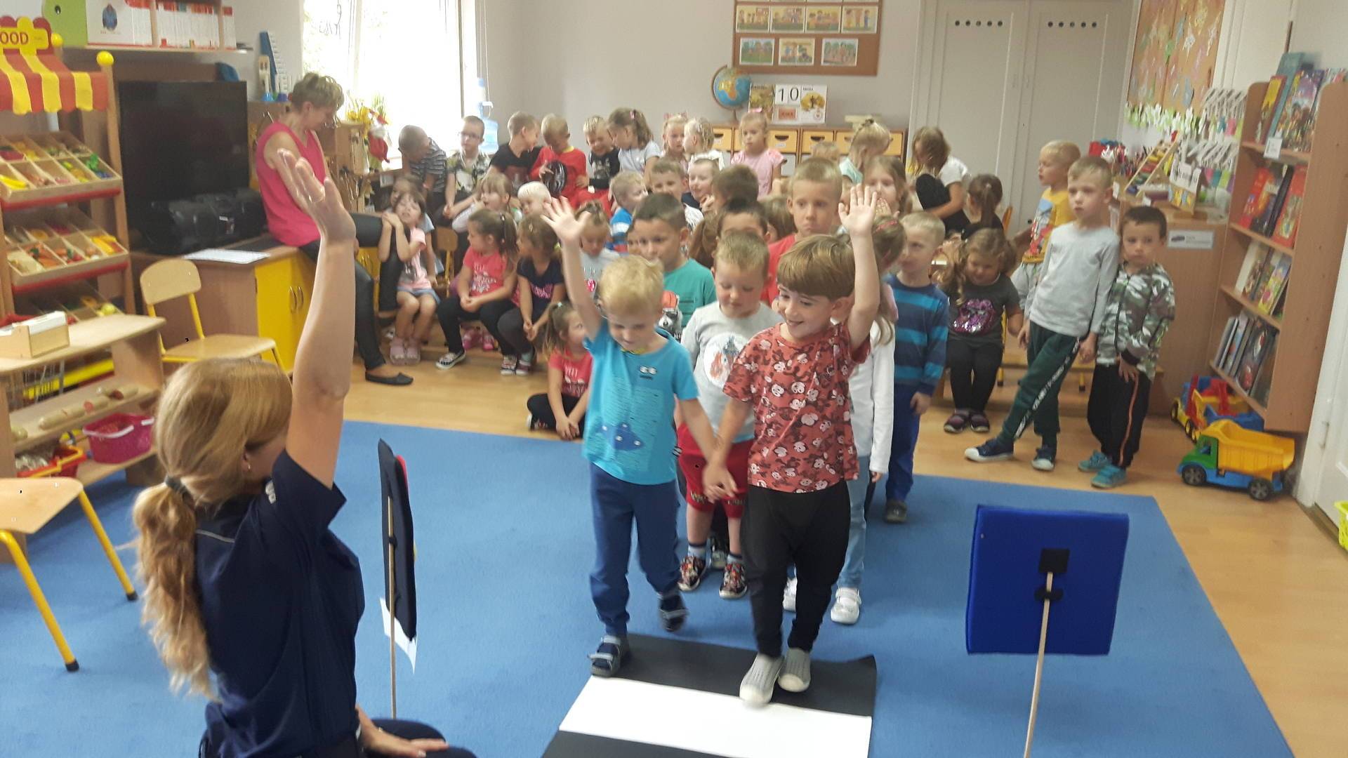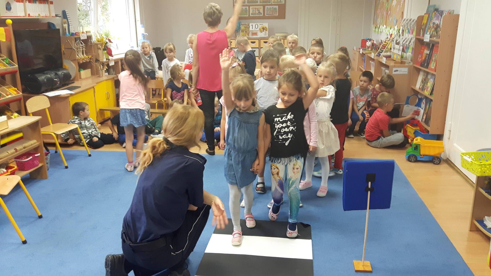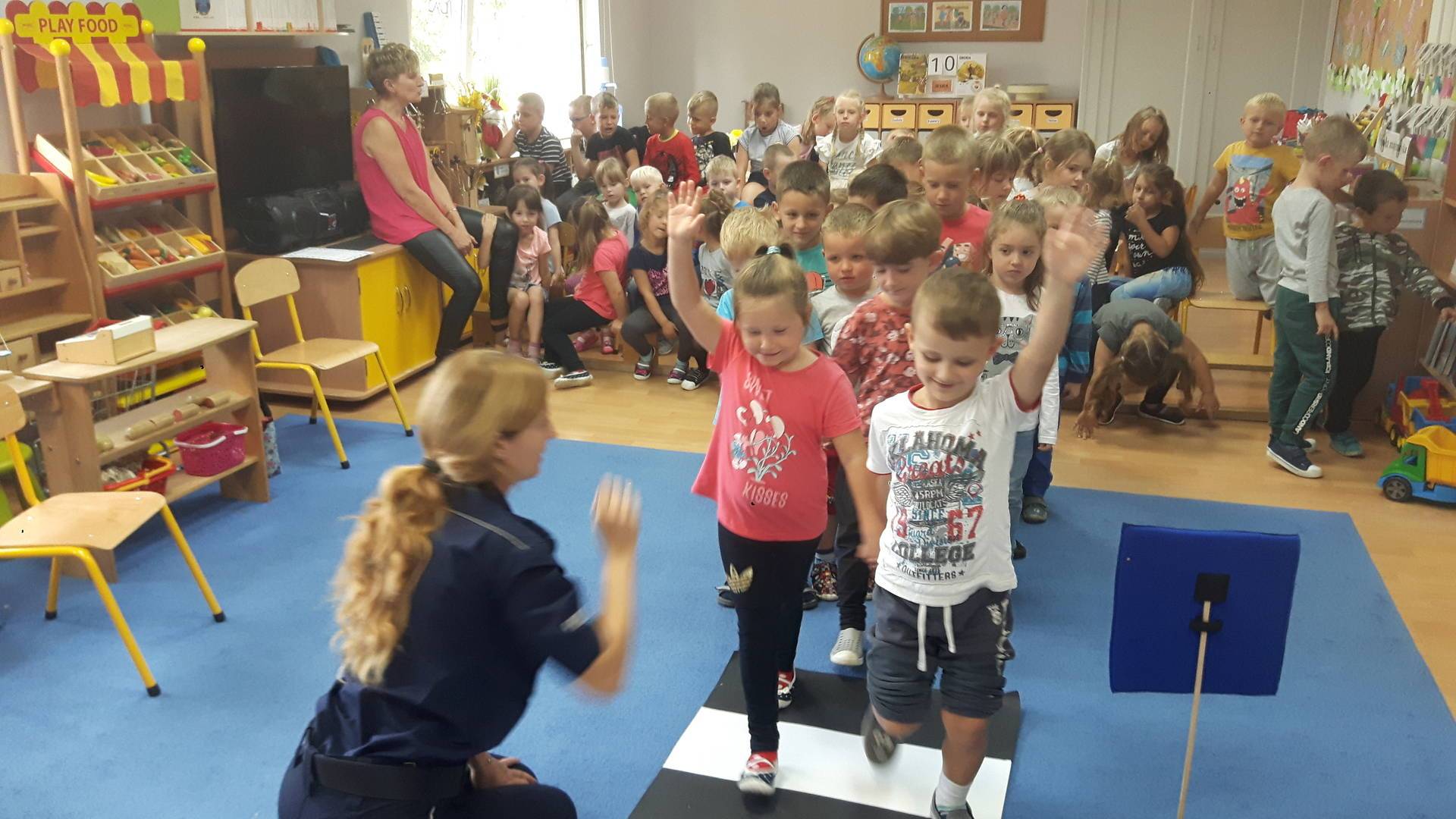 09września 2019r. w naszym przedszkolu odbyło się spotkanie z Panią policjantką z Komisariatu Policji w Lęborku. Tematem spotkania było utrwalenie z dziećmi zasad ruchu drogowego oraz przypomnienie zagadnień dotyczących bezpieczeństwa dzieci w przedszkolu i w domu. Pani policjantka, w formie praktycznej, przypomniała podstawowe zasady zachowania się podczas przechodzenia przez jezdnię. Następnie wytłumaczyła jak należy zachować się w kontaktach z obcymi ludźmi, jak dbać o bezpieczeństwo własne i innych oraz do kogo zwracać się o pomoc w sytuacji zagrożenia. Dzieci z dużym zainteresowaniem słuchały rad i wskazówek zaproszonego gościa. Na zakończenie wizyty przedszkolaki wręczyły Pani policjantce podziękowanie.