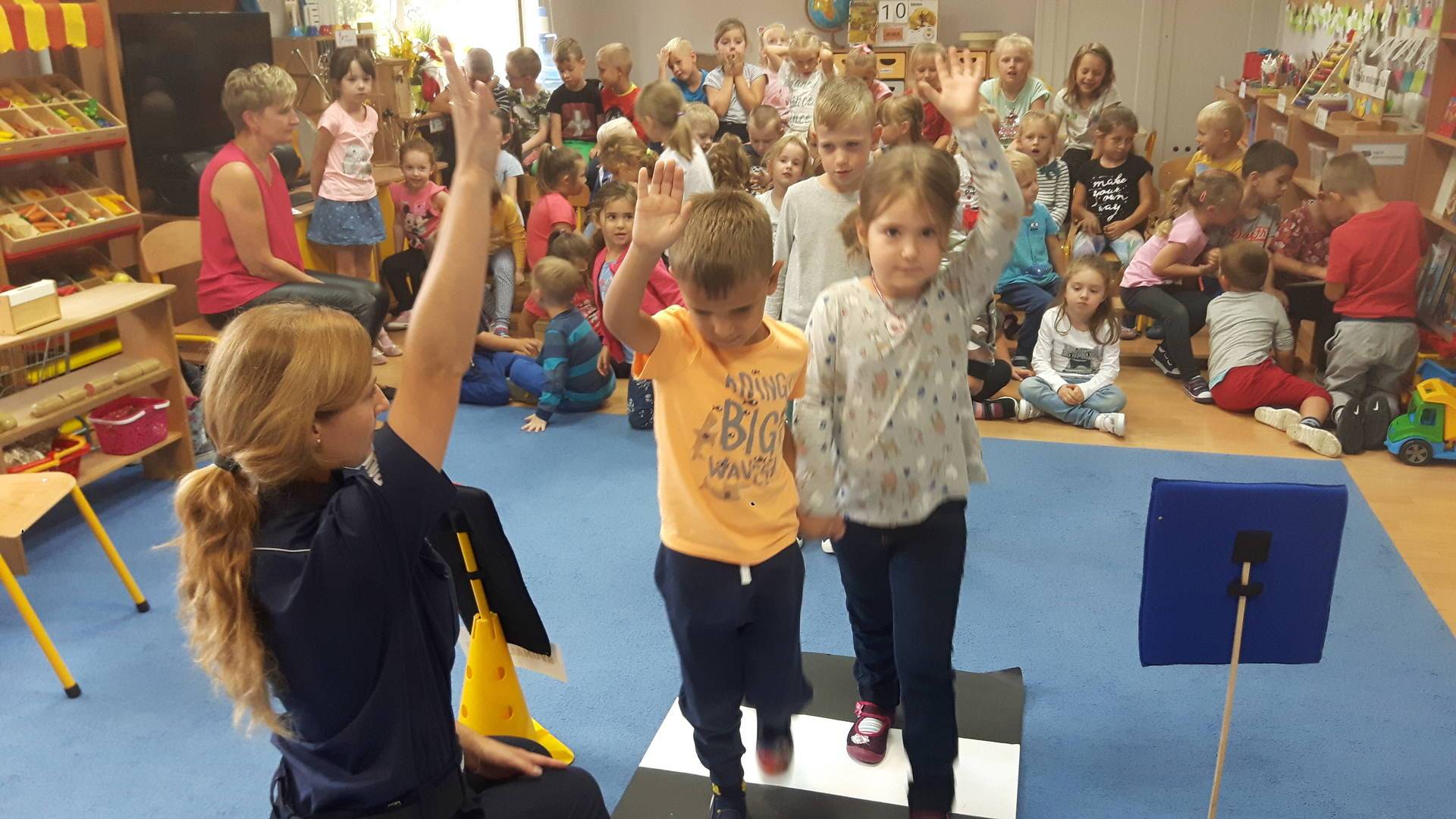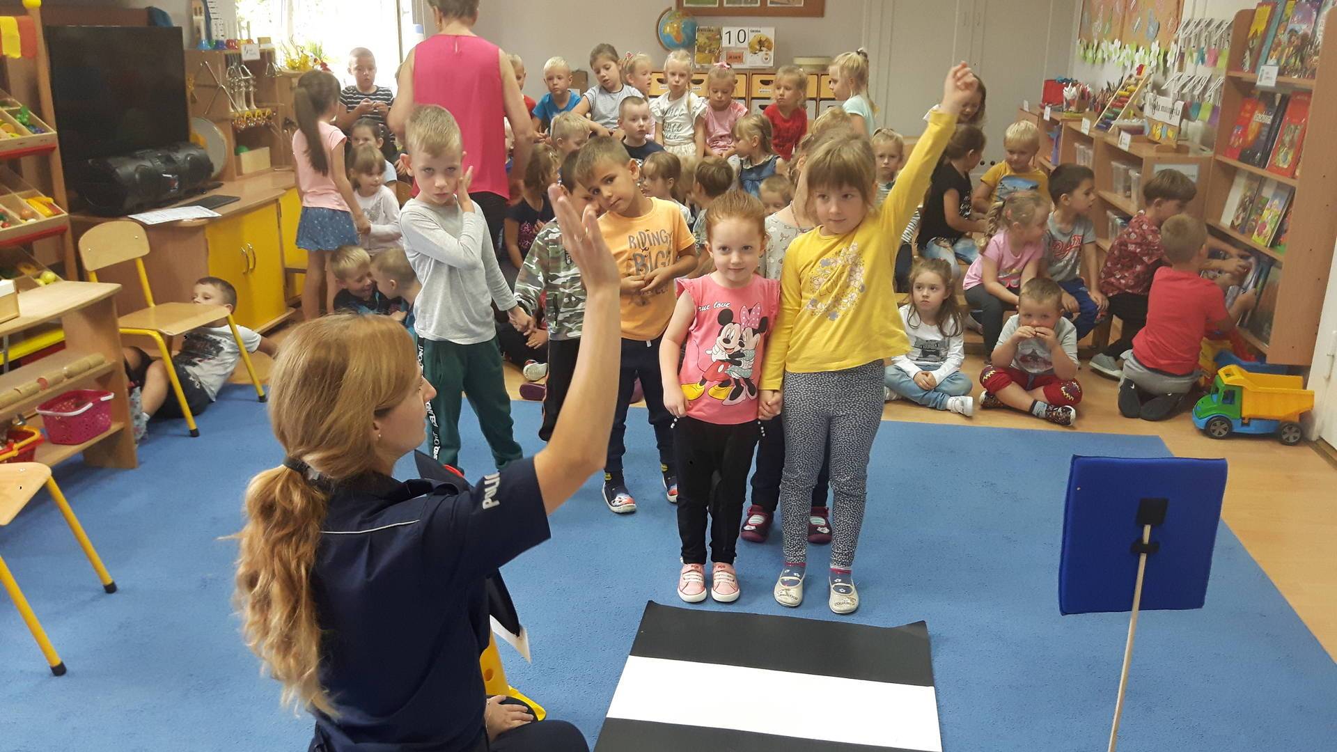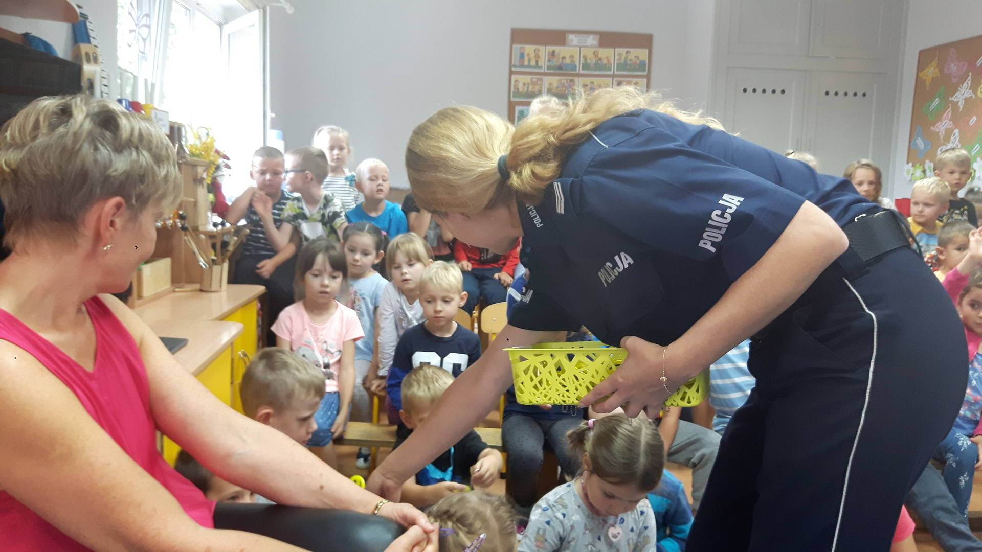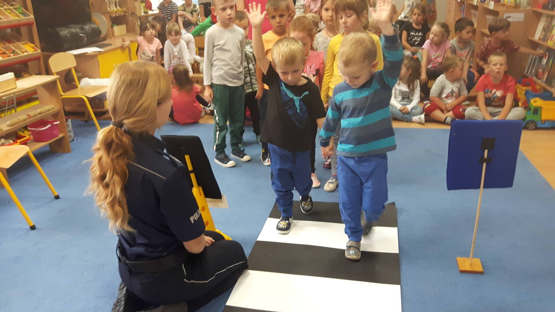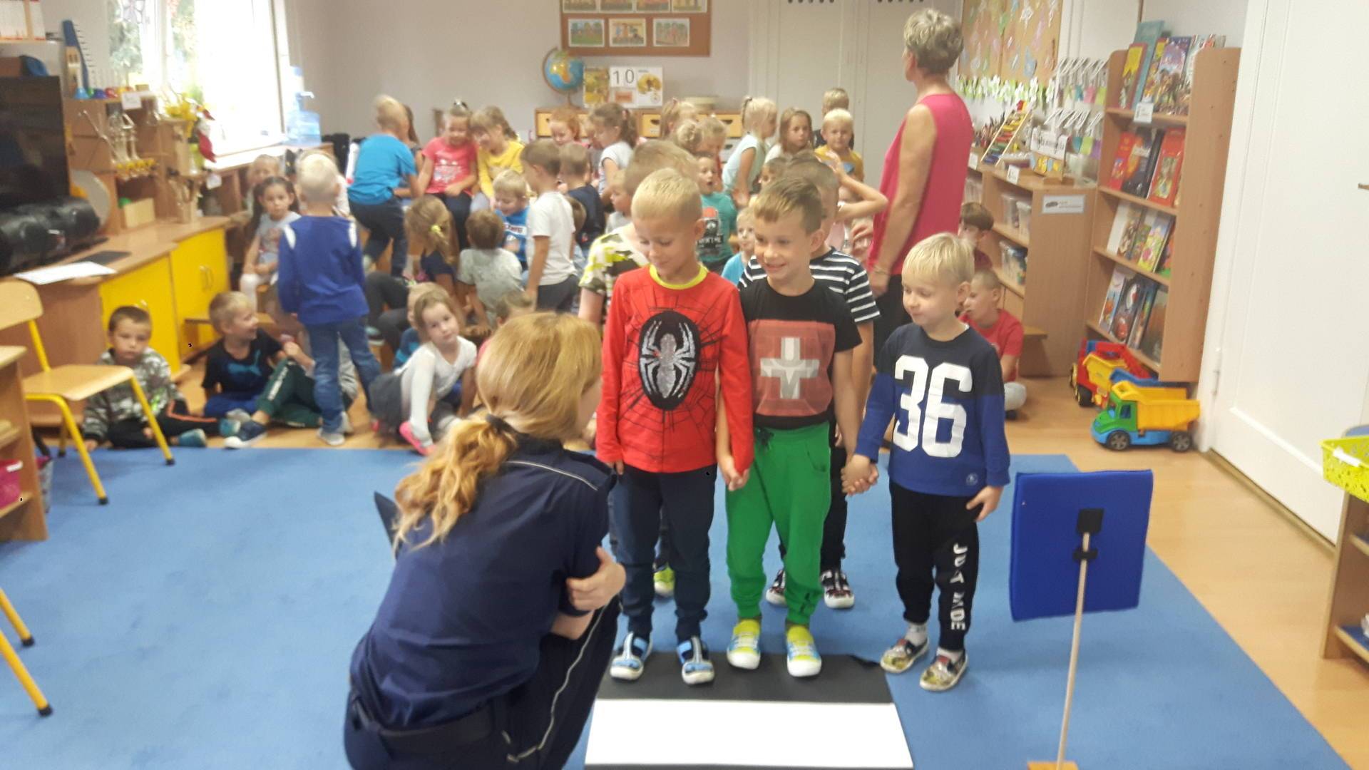 09września 2019r. w naszym przedszkolu odbyło się spotkanie z Panią policjantką z Komisariatu Policji w Lęborku. Tematem spotkania było utrwalenie z dziećmi zasad ruchu drogowego oraz przypomnienie zagadnień dotyczących bezpieczeństwa dzieci w przedszkolu i w domu. Pani policjantka, w formie praktycznej, przypomniała podstawowe zasady zachowania się podczas przechodzenia przez jezdnię. Następnie wytłumaczyła jak należy zachować się w kontaktach z obcymi ludźmi, jak dbać o bezpieczeństwo własne i innych oraz do kogo zwracać się o pomoc w sytuacji zagrożenia. Dzieci z dużym zainteresowaniem słuchały rad i wskazówek zaproszonego gościa. Na zakończenie wizyty przedszkolaki wręczyły Pani policjantce podziękowanie.
