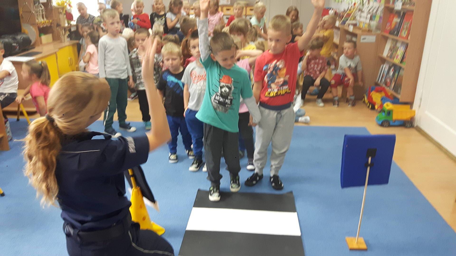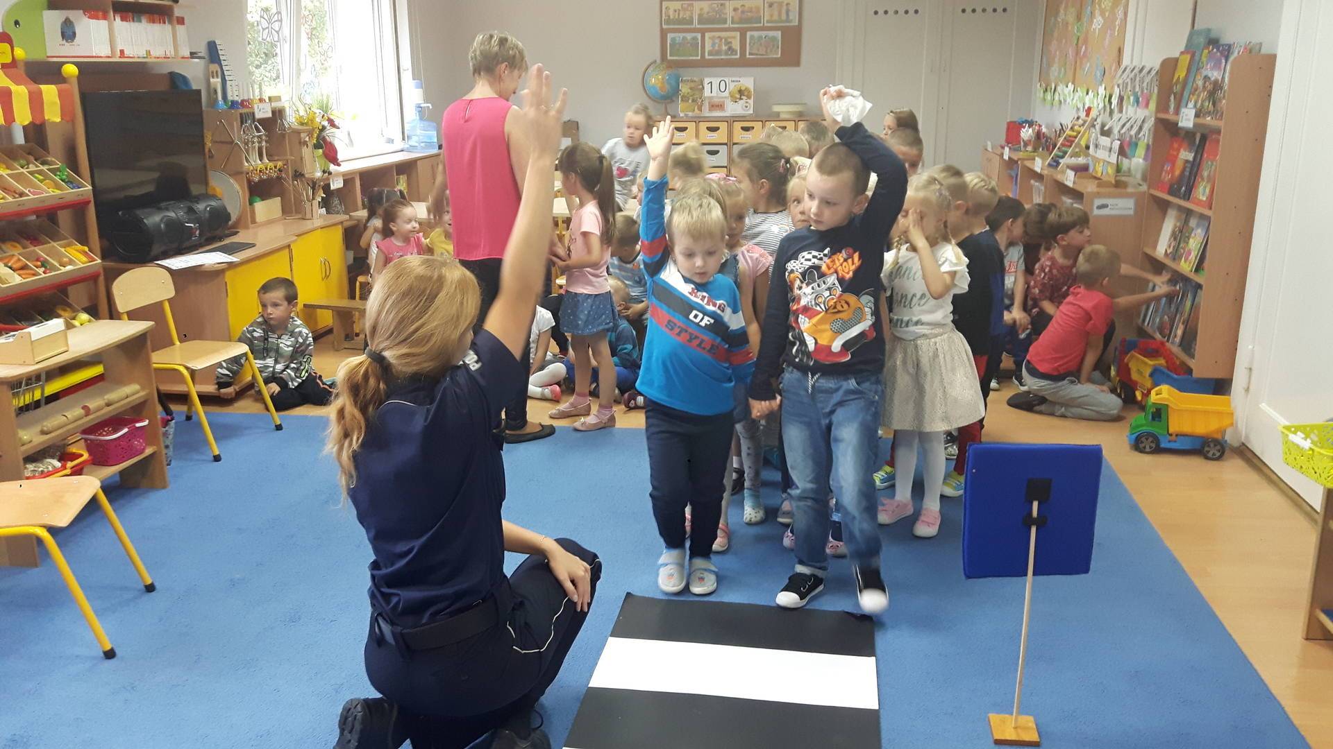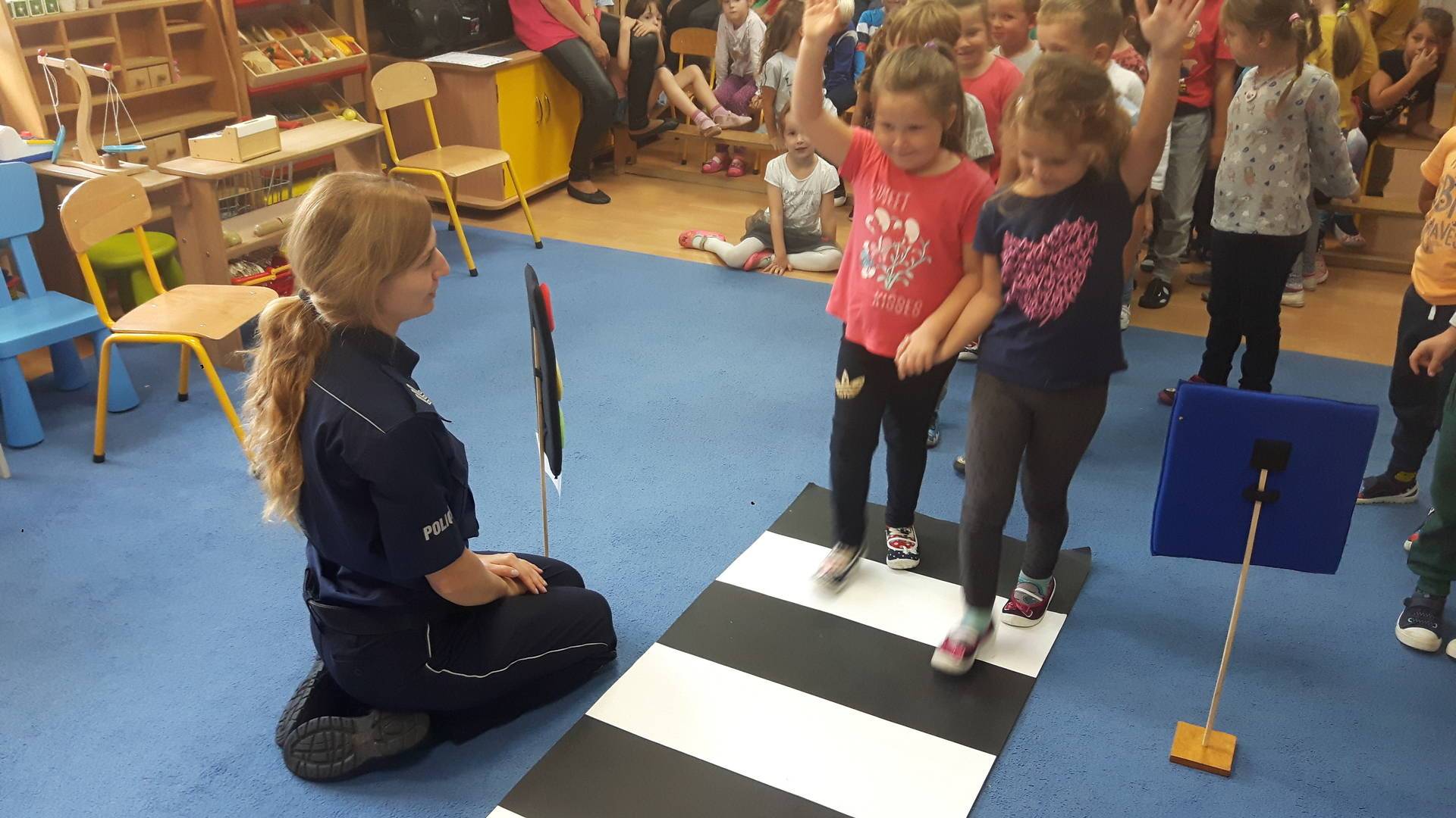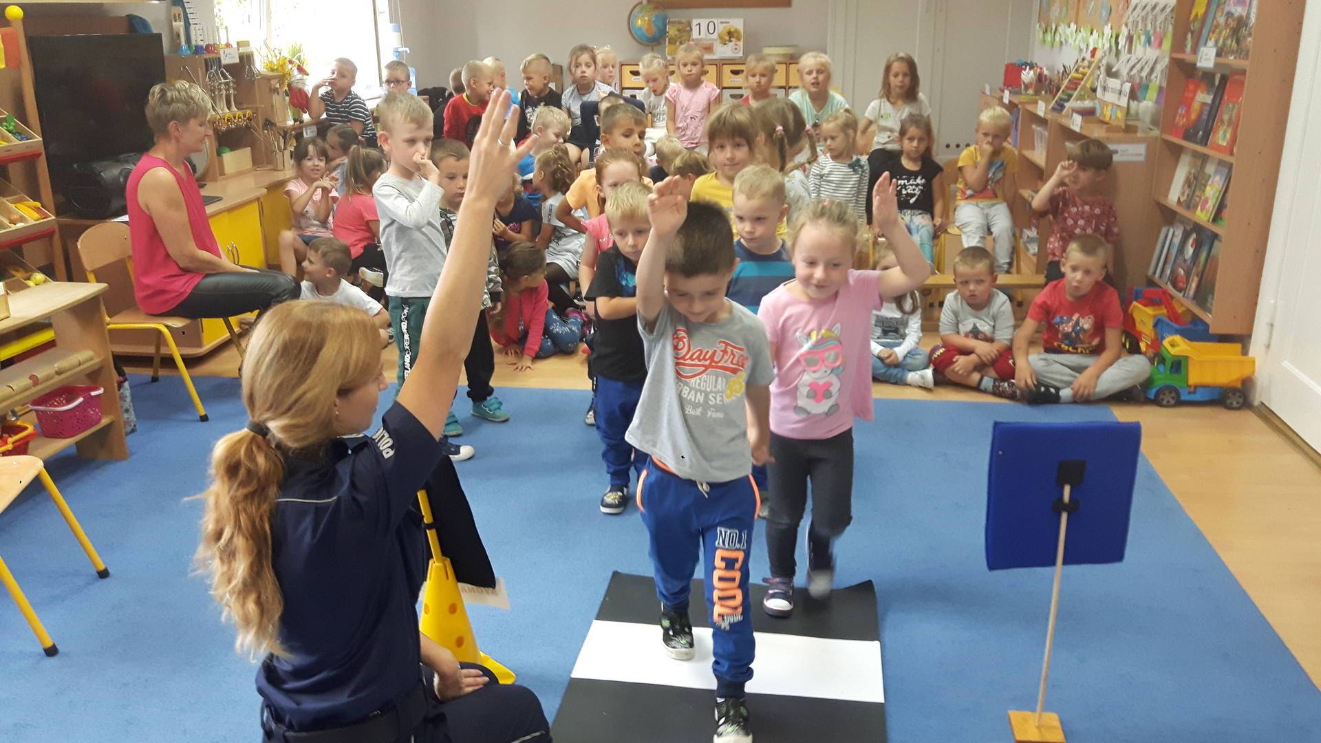 09września 2019r. w naszym przedszkolu odbyło się spotkanie z Panią policjantką z Komisariatu Policji w Lęborku. Tematem spotkania było utrwalenie z dziećmi zasad ruchu drogowego oraz przypomnienie zagadnień dotyczących bezpieczeństwa dzieci w przedszkolu i w domu. Pani policjantka, w formie praktycznej, przypomniała podstawowe zasady zachowania się podczas przechodzenia przez jezdnię. Następnie wytłumaczyła jak należy zachować się w kontaktach z obcymi ludźmi, jak dbać o bezpieczeństwo własne i innych oraz do kogo zwracać się o pomoc w sytuacji zagrożenia. Dzieci z dużym zainteresowaniem słuchały rad i wskazówek zaproszonego gościa. Na zakończenie wizyty przedszkolaki wręczyły Pani policjantce podziękowanie.