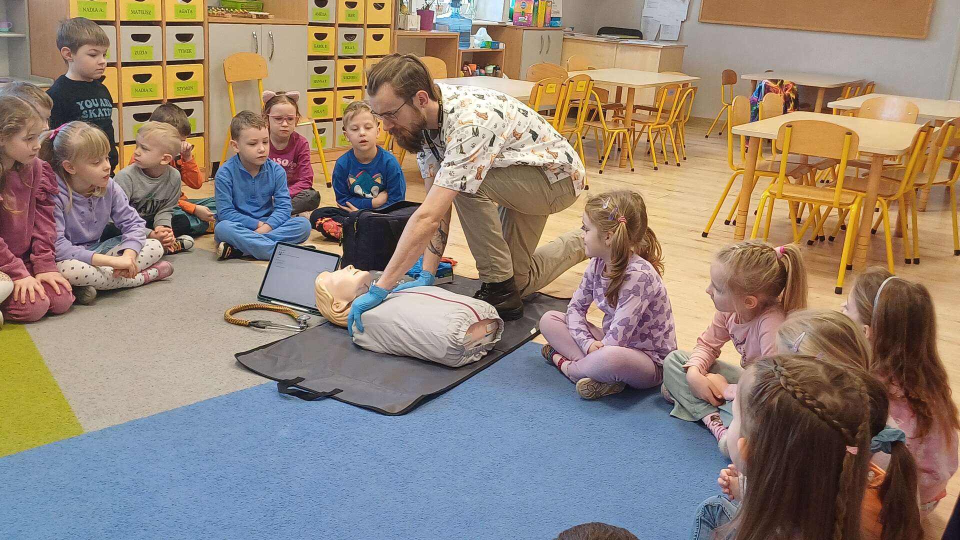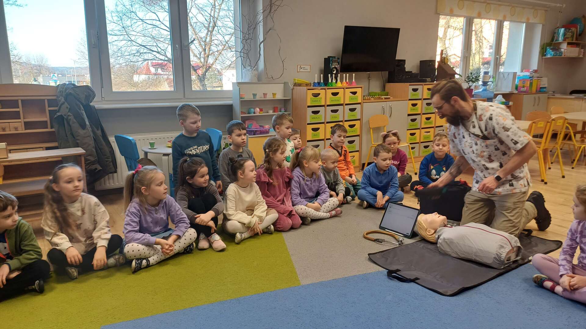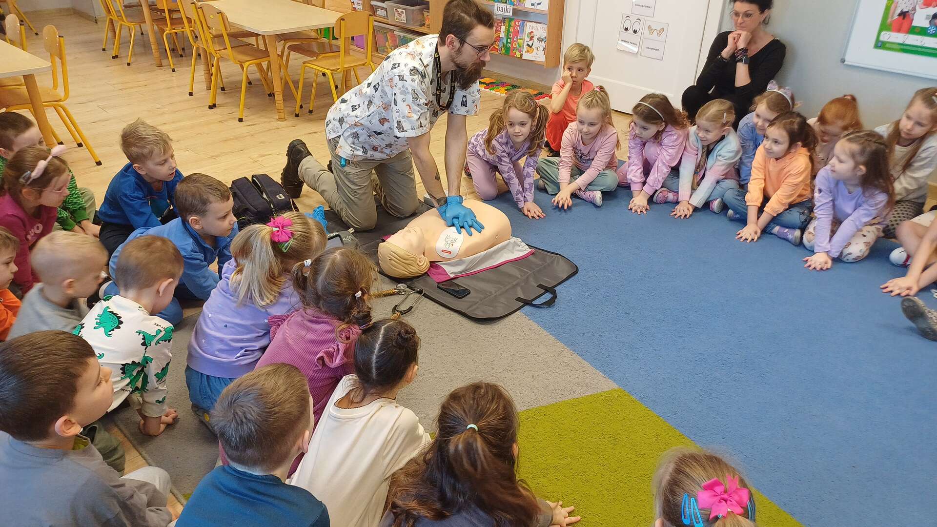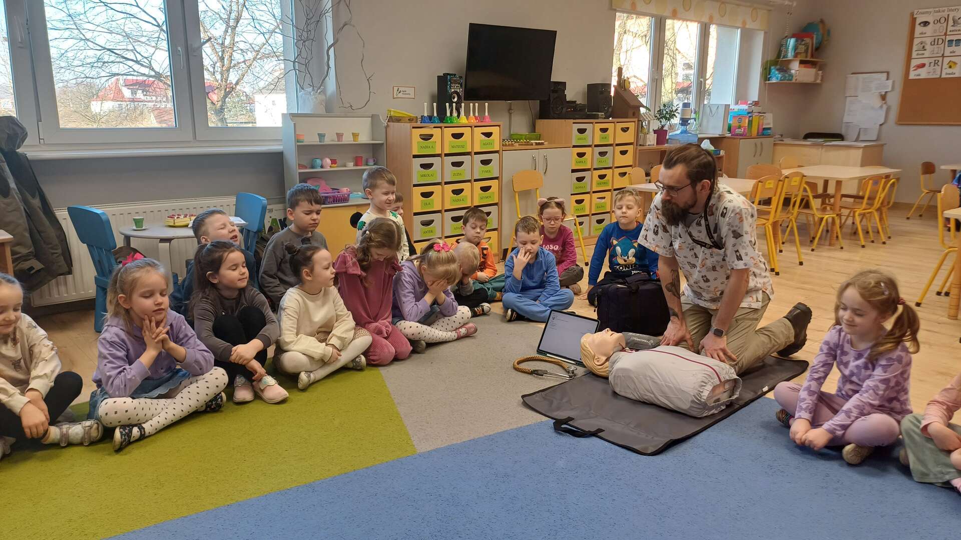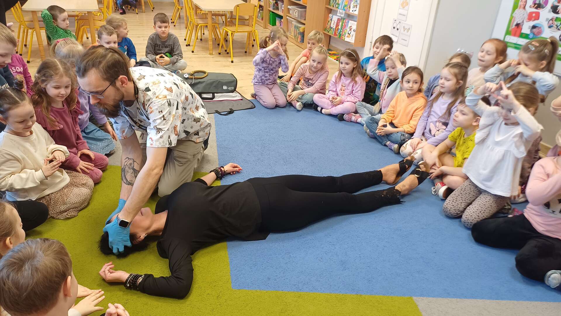 Dzisiaj dzieci z grup starszych uczestniczyły w zajęciach z pierwszej pomocy przedmedycznej. Zajęcia poprowadził p. Rafał Bocian z Ochotniczej Straży Ratowniczej z Lęborka. Podczas zajęć dzieci poznały podstawowe zasady udzielania pierwszej pomocy oraz nabywały umiejętności rozpoznawania oparzeń, omdleń, zranień , sprawdzanie oddechu. Ćwiczyły także wykonywanie numeru alarmowego .