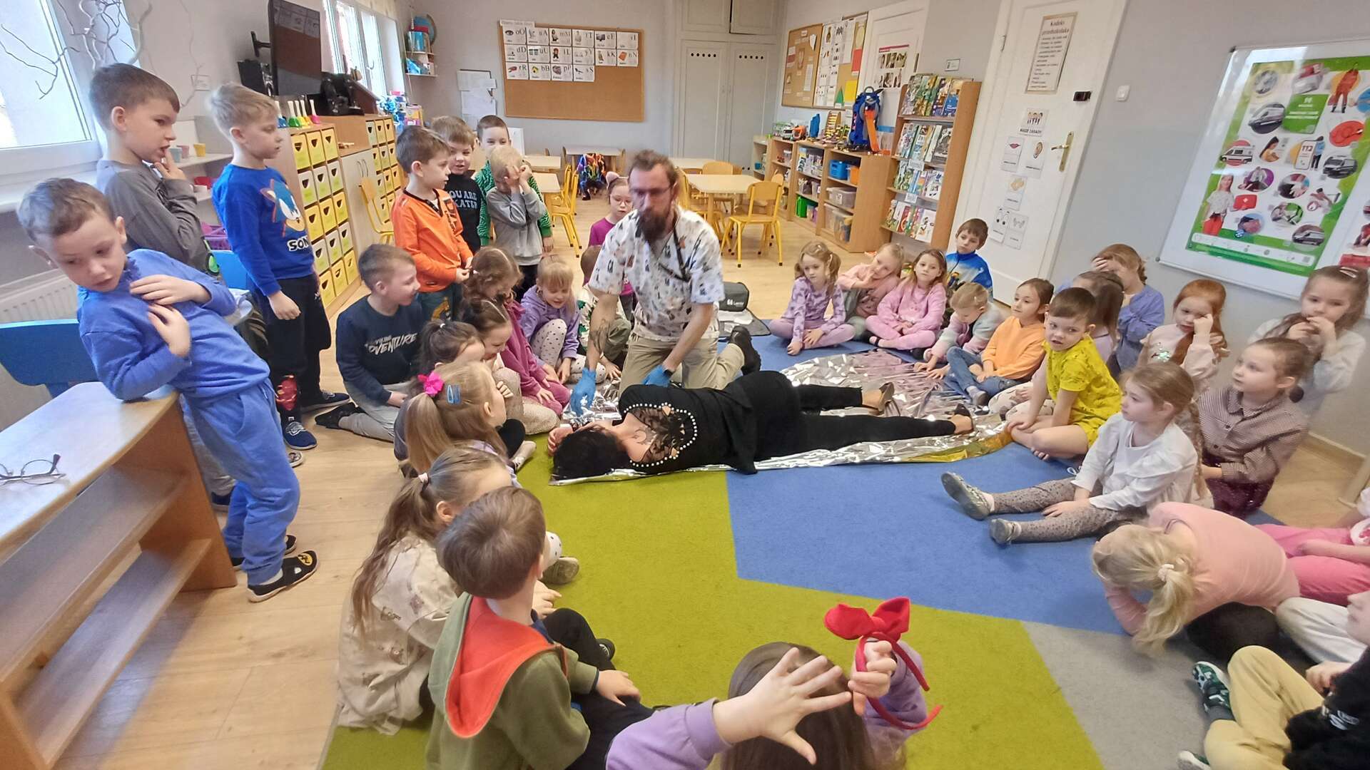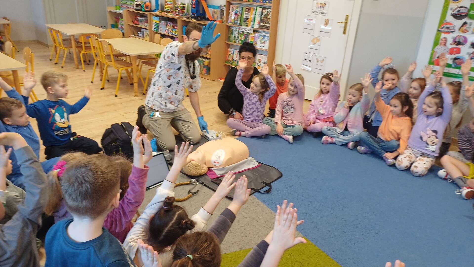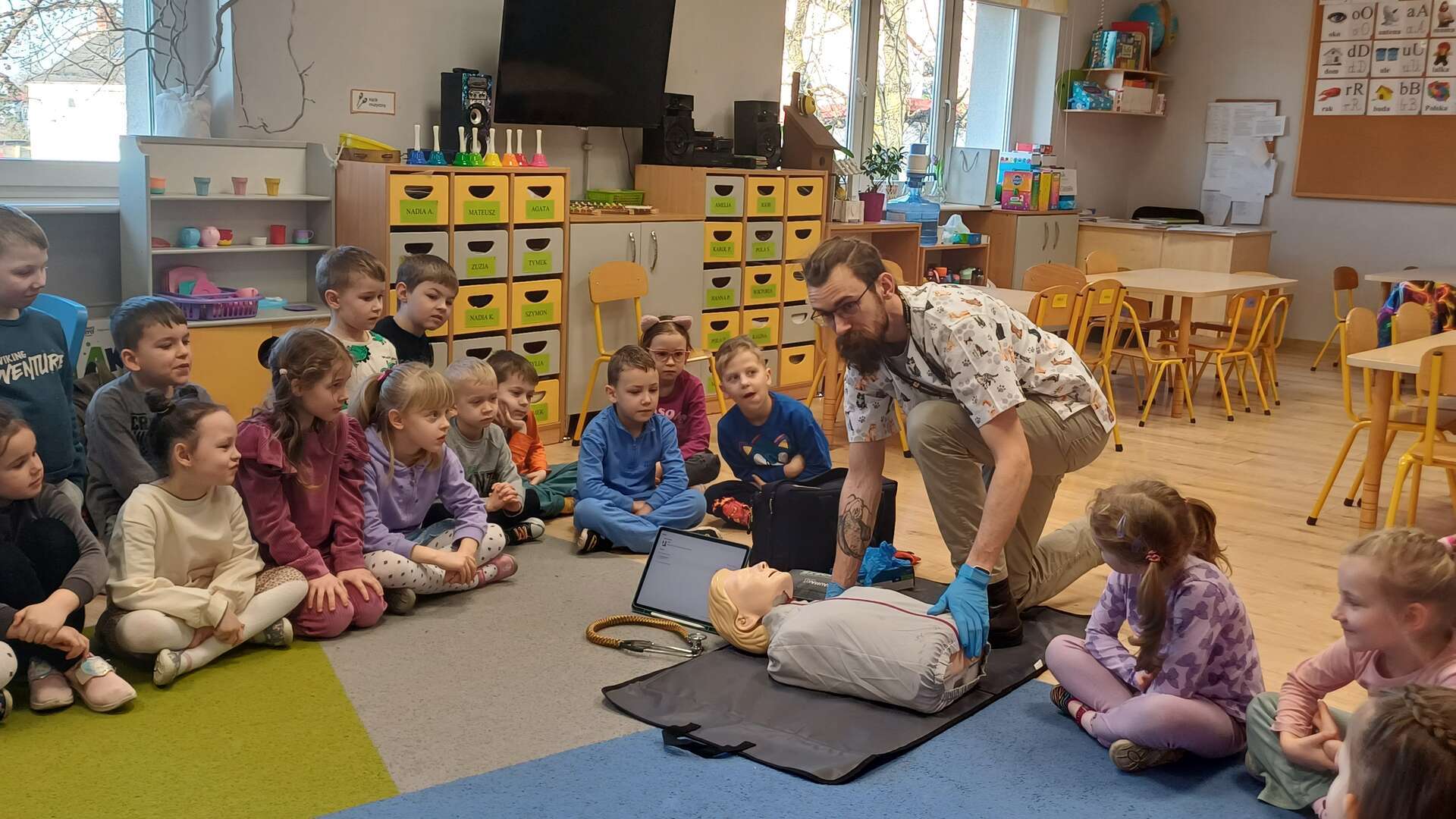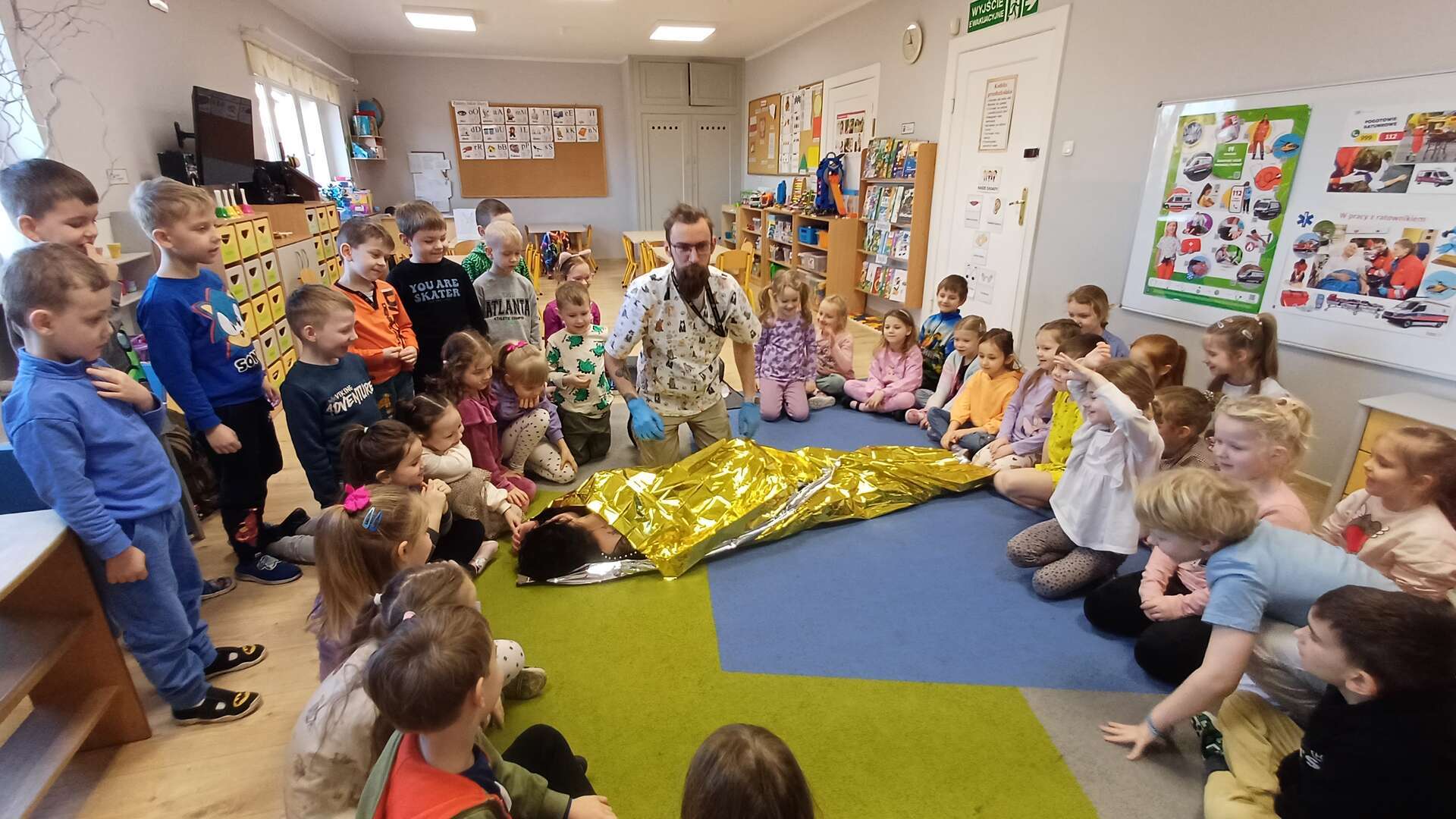 Dzisiaj dzieci z grup starszych uczestniczyły w zajęciach z pierwszej pomocy przedmedycznej. Zajęcia poprowadził p. Rafał Bocian z Ochotniczej Straży Ratowniczej z Lęborka. Podczas zajęć dzieci poznały podstawowe zasady udzielania pierwszej pomocy oraz nabywały umiejętności rozpoznawania oparzeń, omdleń, zranień , sprawdzanie oddechu. Ćwiczyły także wykonywanie numeru alarmowego .