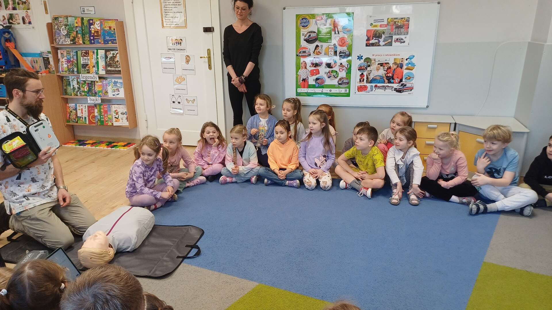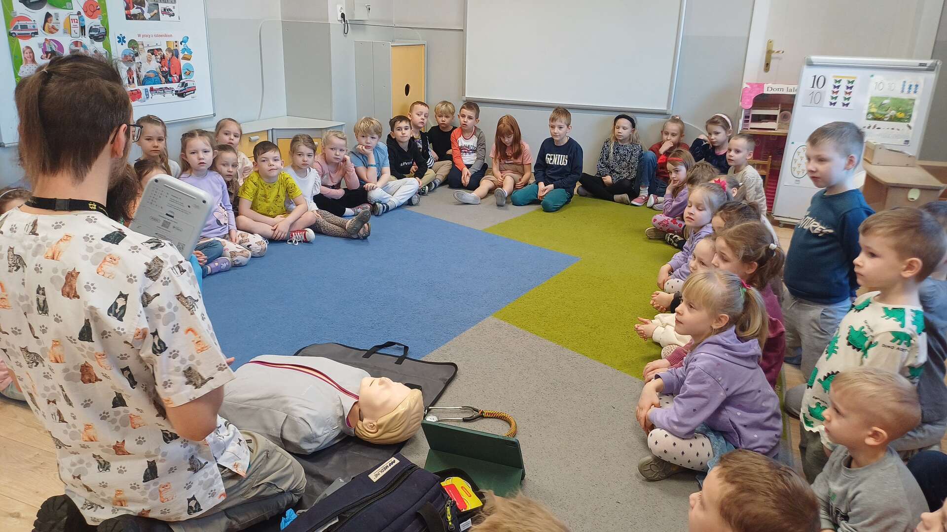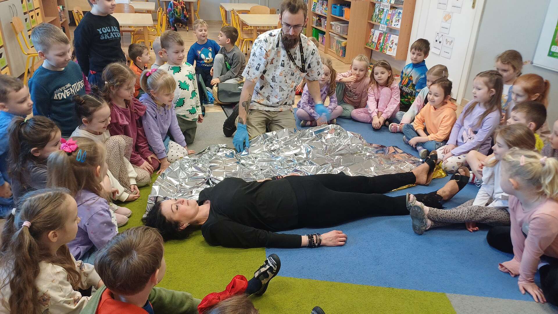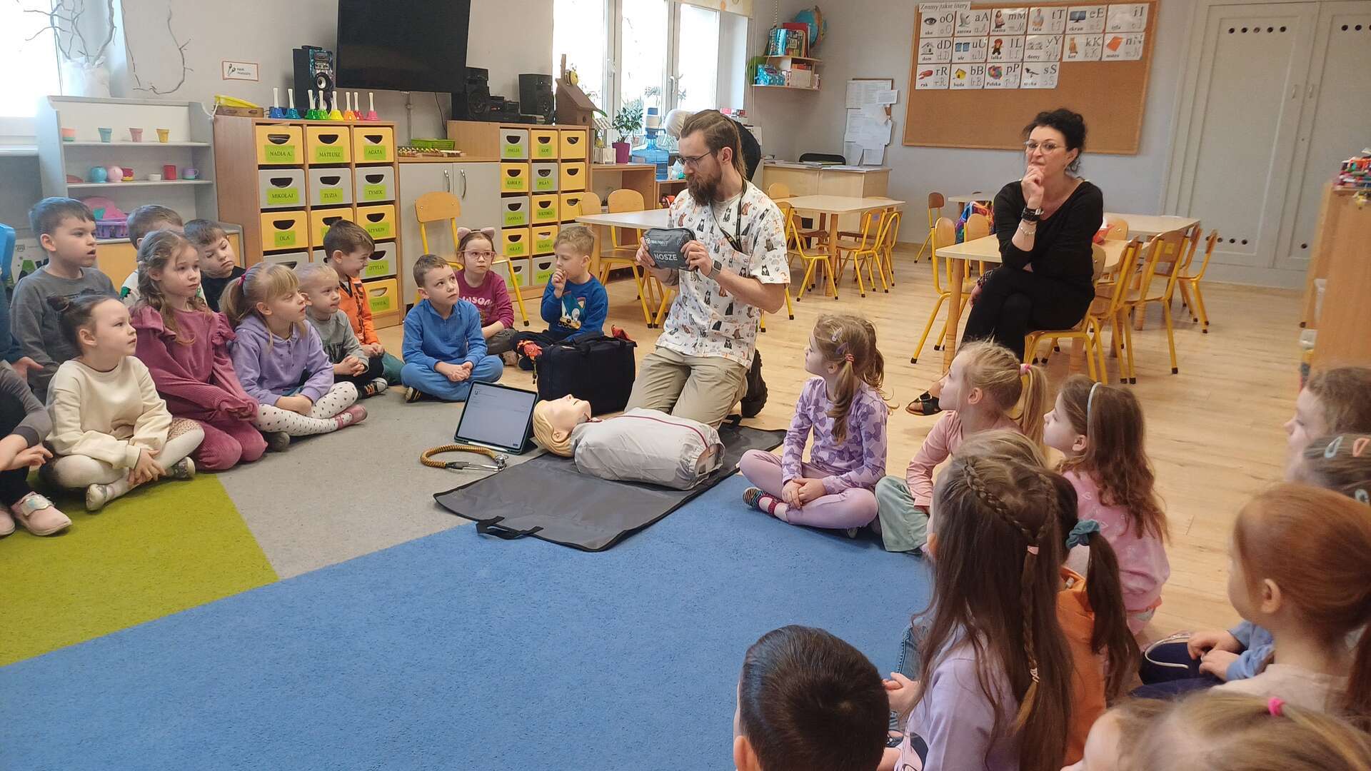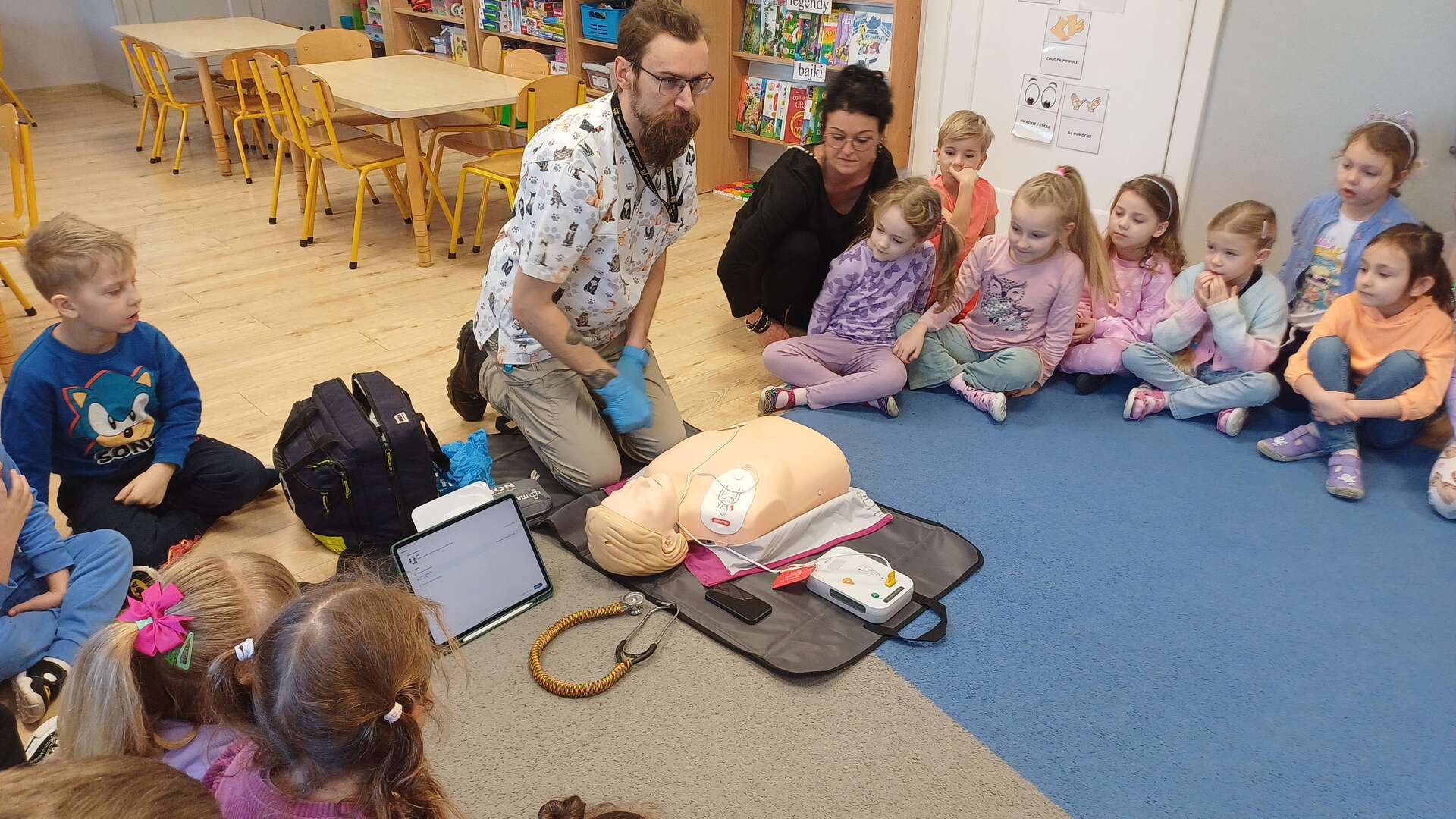 Dzisiaj dzieci z grup starszych uczestniczyły w zajęciach z pierwszej pomocy przedmedycznej. Zajęcia poprowadził p. Rafał Bocian z Ochotniczej Straży Ratowniczej z Lęborka. Podczas zajęć dzieci poznały podstawowe zasady udzielania pierwszej pomocy oraz nabywały umiejętności rozpoznawania oparzeń, omdleń, zranień , sprawdzanie oddechu. Ćwiczyły także wykonywanie numeru alarmowego .