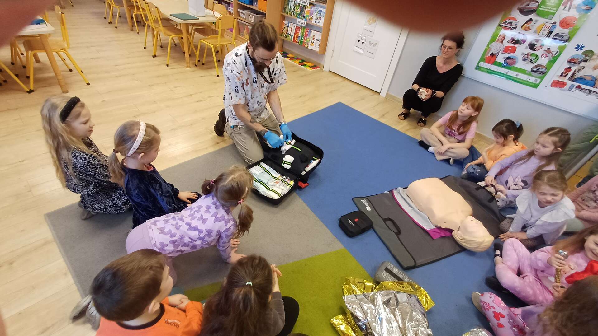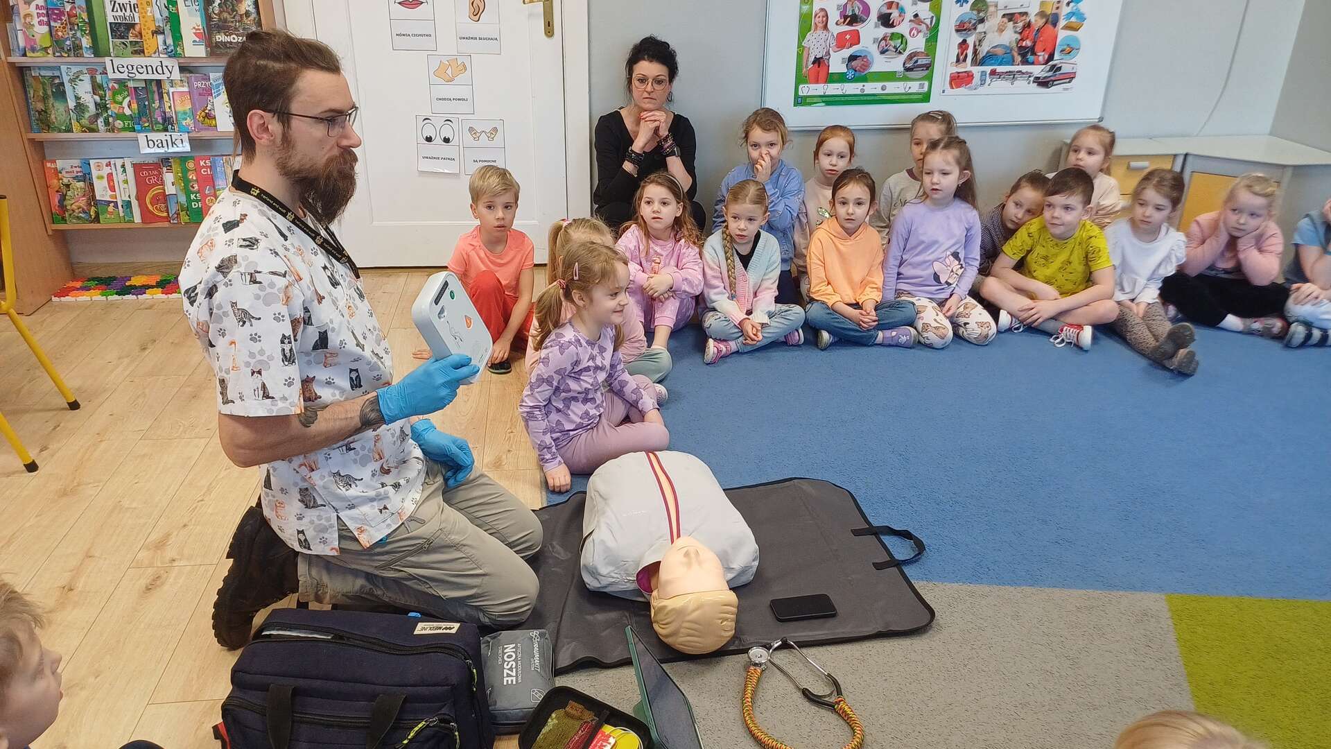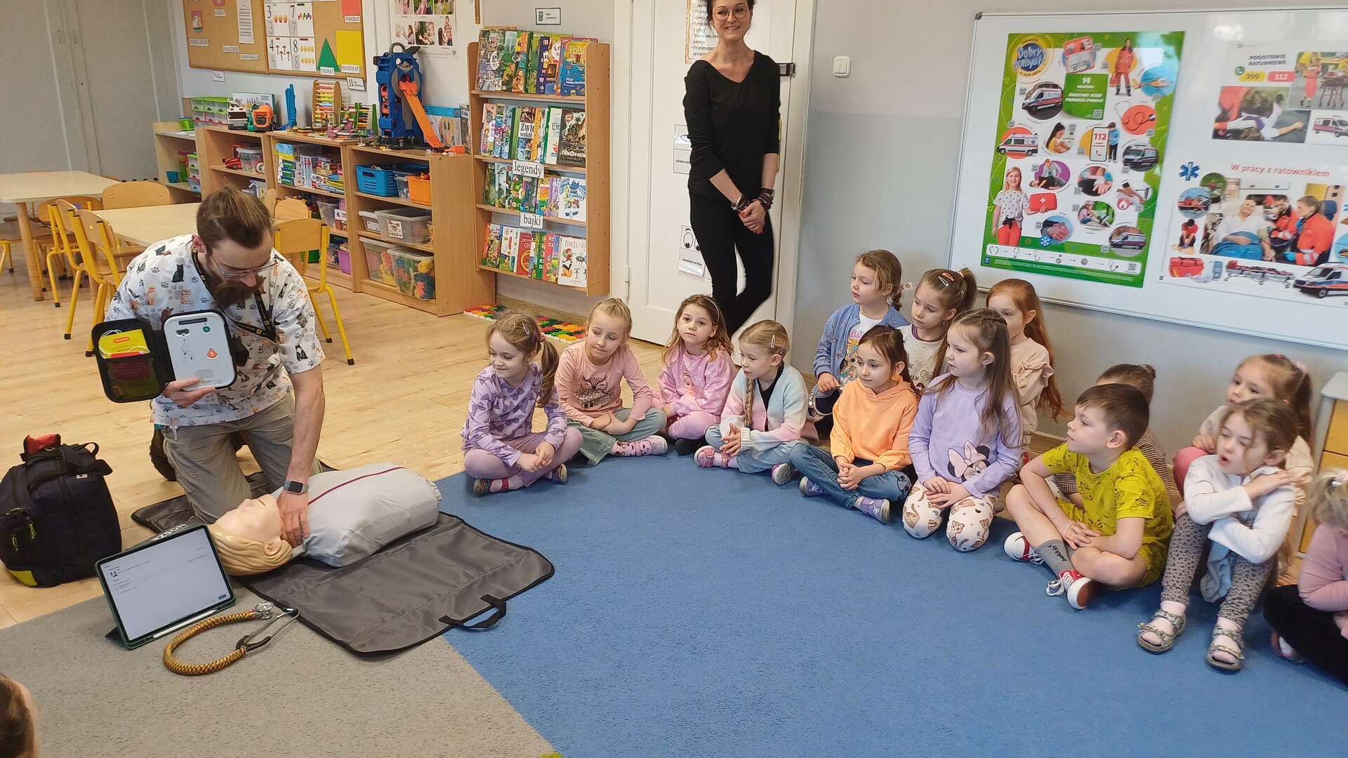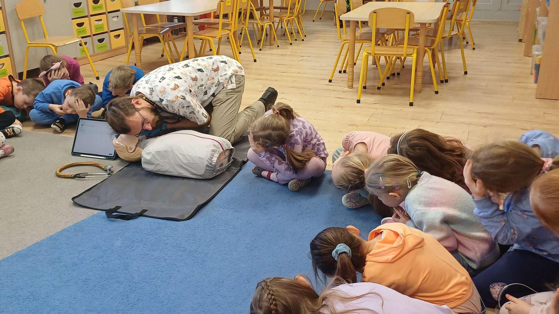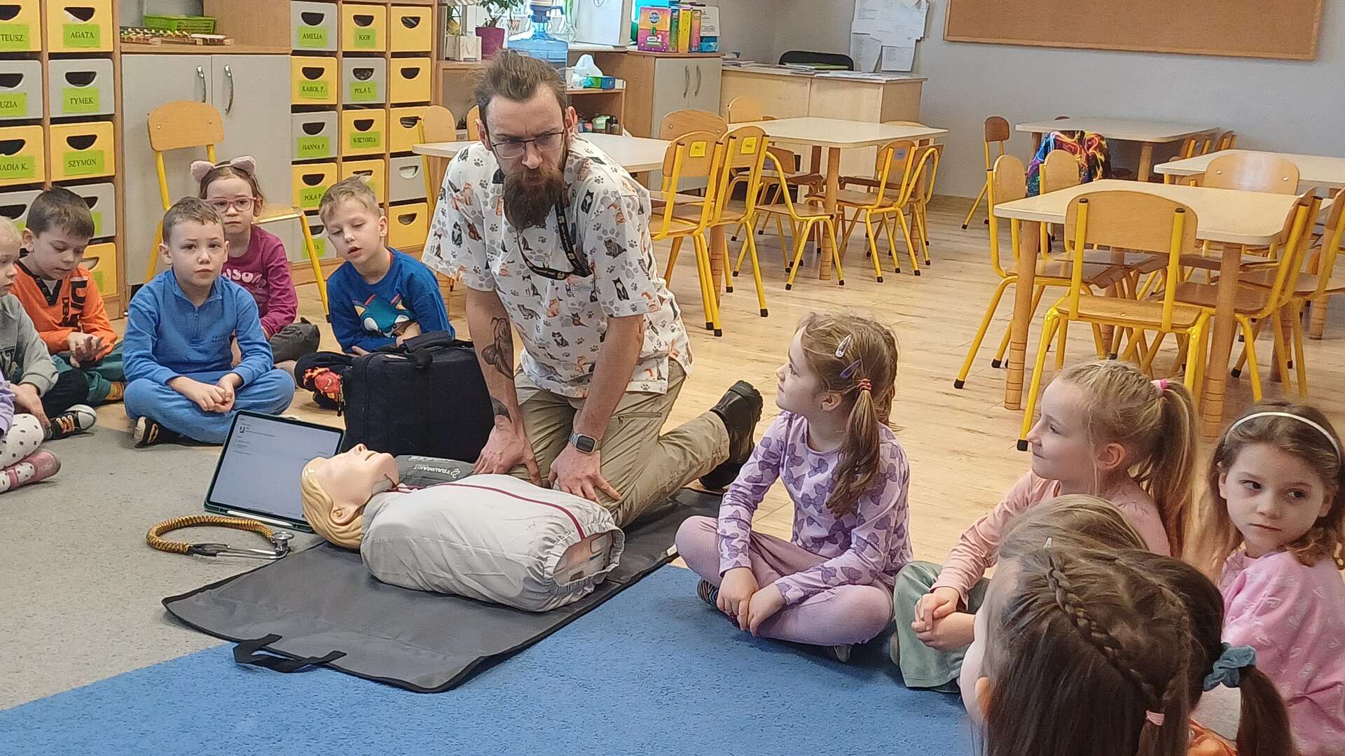 Dzisiaj dzieci z grup starszych uczestniczyły w zajęciach z pierwszej pomocy przedmedycznej. Zajęcia poprowadził p. Rafał Bocian z Ochotniczej Straży Ratowniczej z Lęborka. Podczas zajęć dzieci poznały podstawowe zasady udzielania pierwszej pomocy oraz nabywały umiejętności rozpoznawania oparzeń, omdleń, zranień , sprawdzanie oddechu. Ćwiczyły także wykonywanie numeru alarmowego .