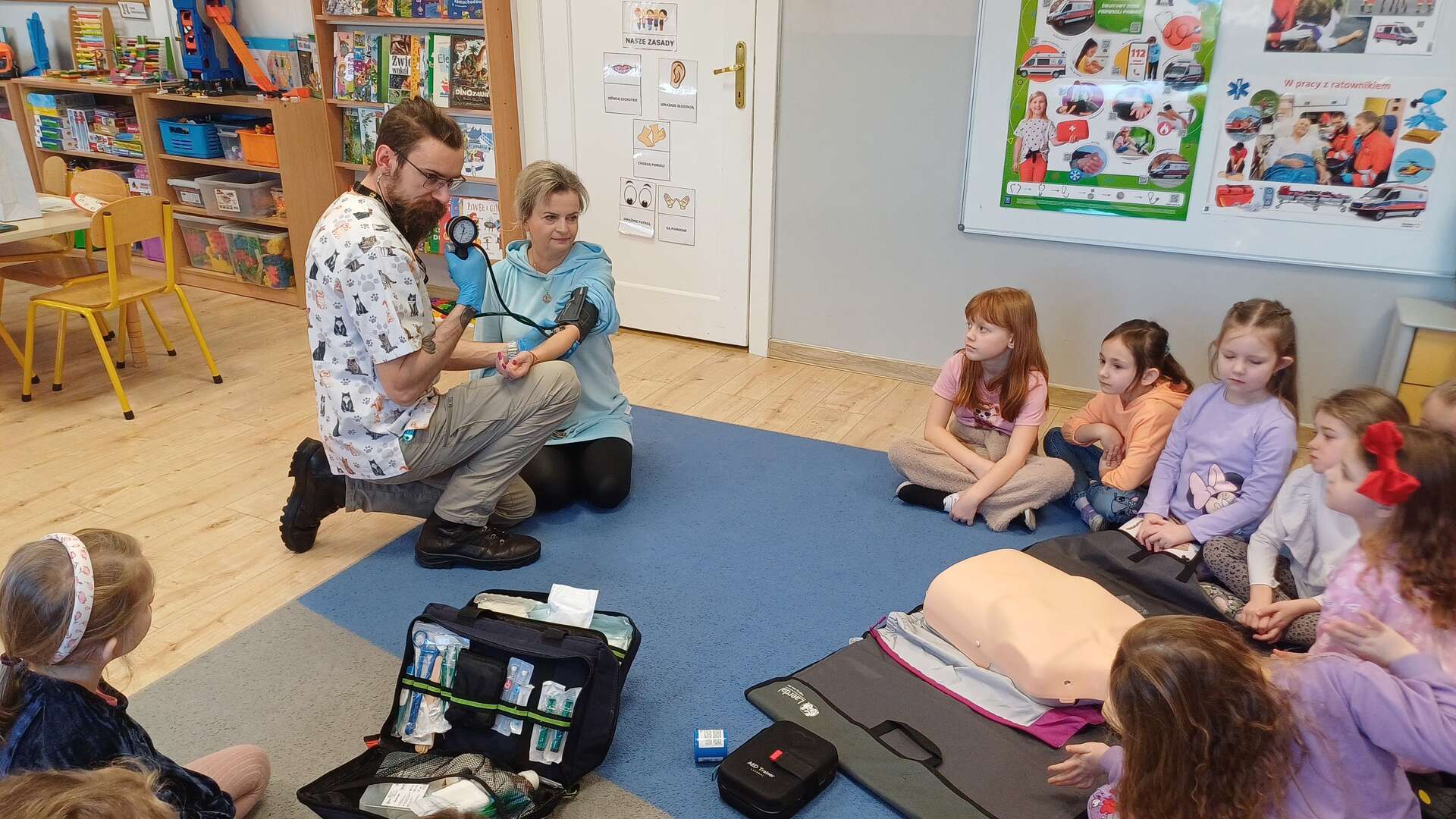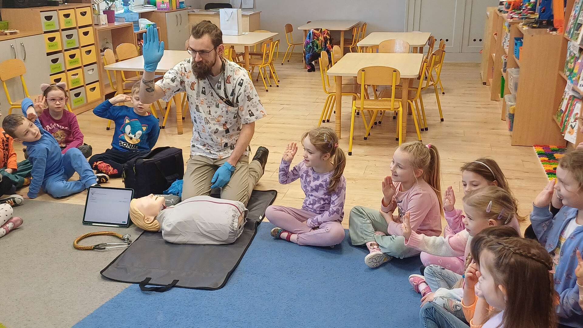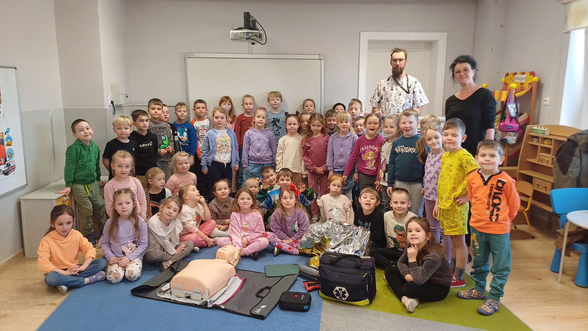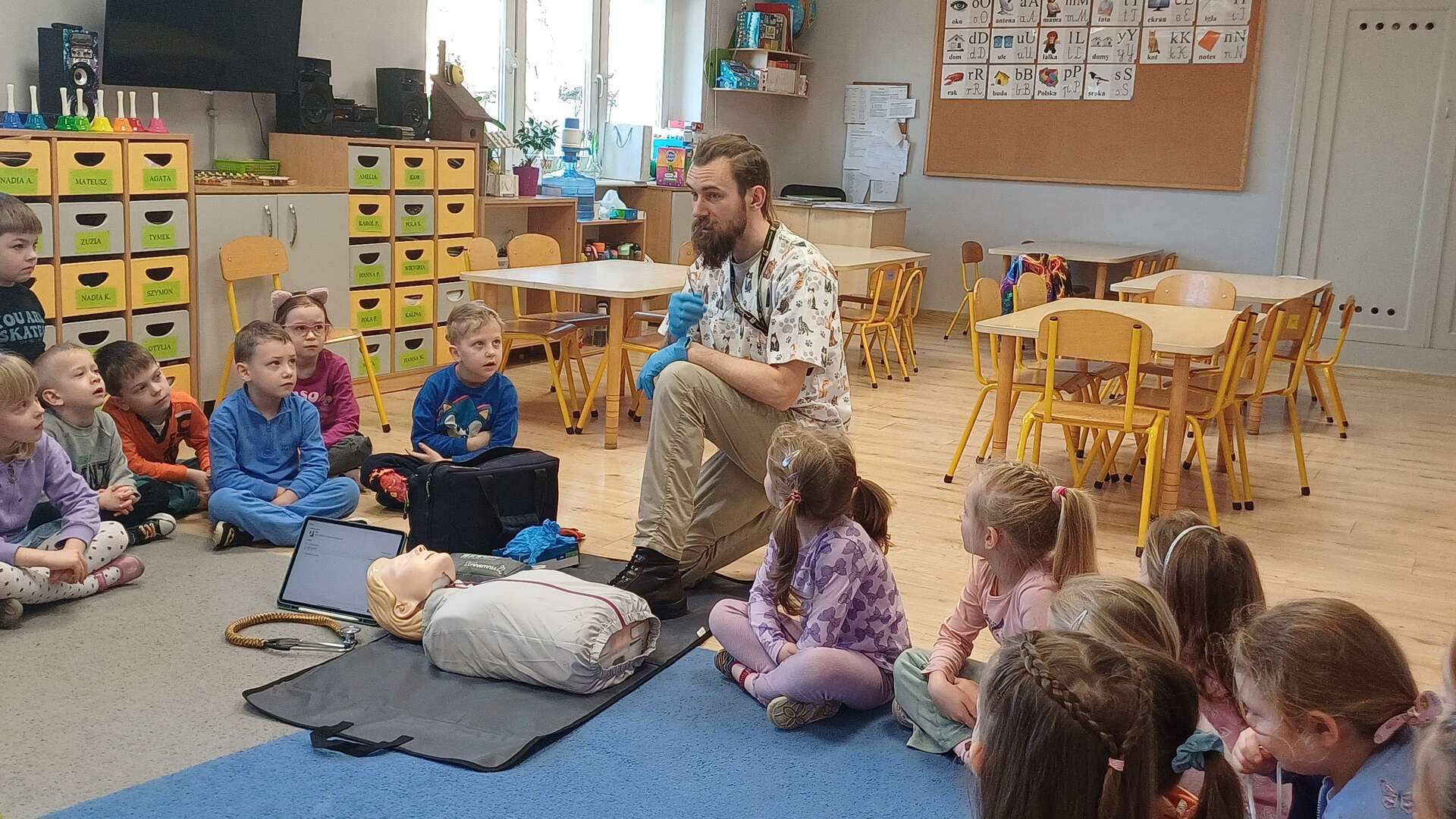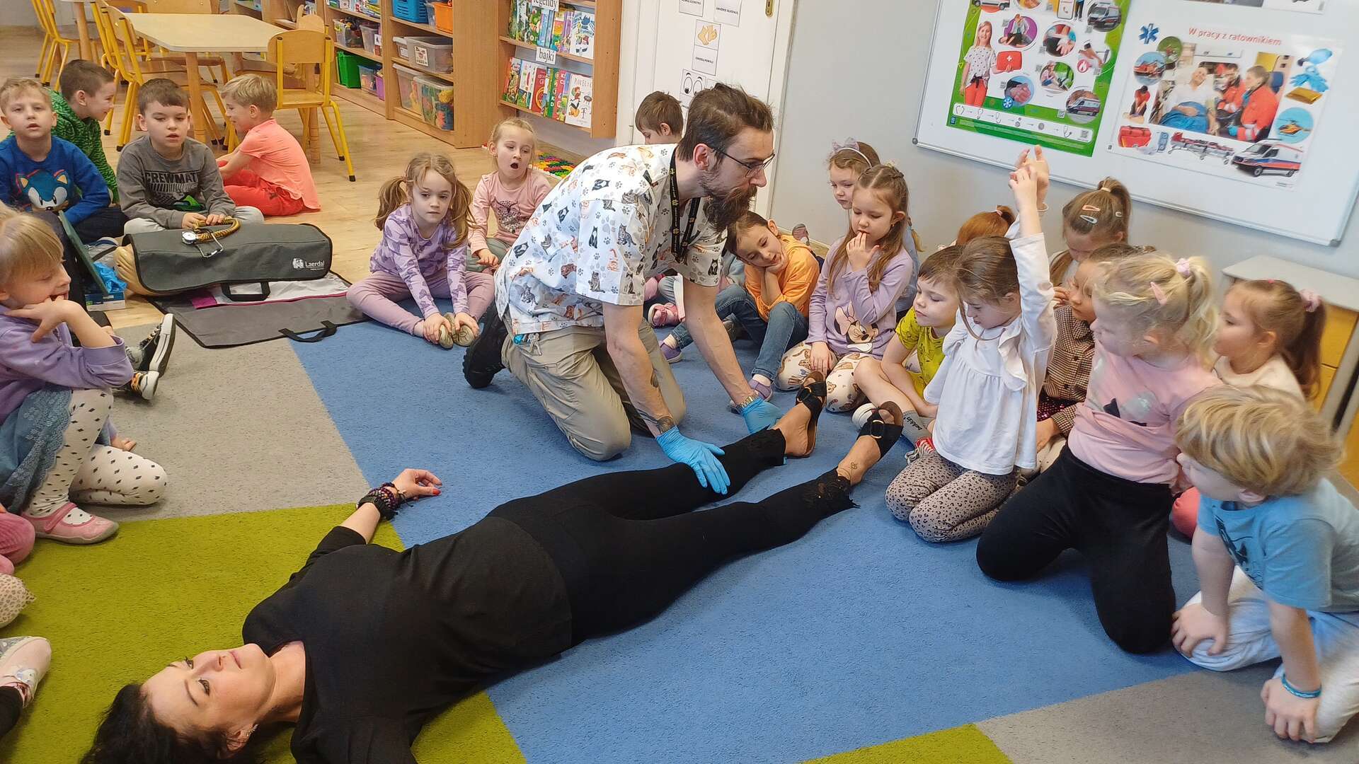 Dzisiaj dzieci z grup starszych uczestniczyły w zajęciach z pierwszej pomocy przedmedycznej. Zajęcia poprowadził p. Rafał Bocian z Ochotniczej Straży Ratowniczej z Lęborka. Podczas zajęć dzieci poznały podstawowe zasady udzielania pierwszej pomocy oraz nabywały umiejętności rozpoznawania oparzeń, omdleń, zranień , sprawdzanie oddechu. Ćwiczyły także wykonywanie numeru alarmowego .