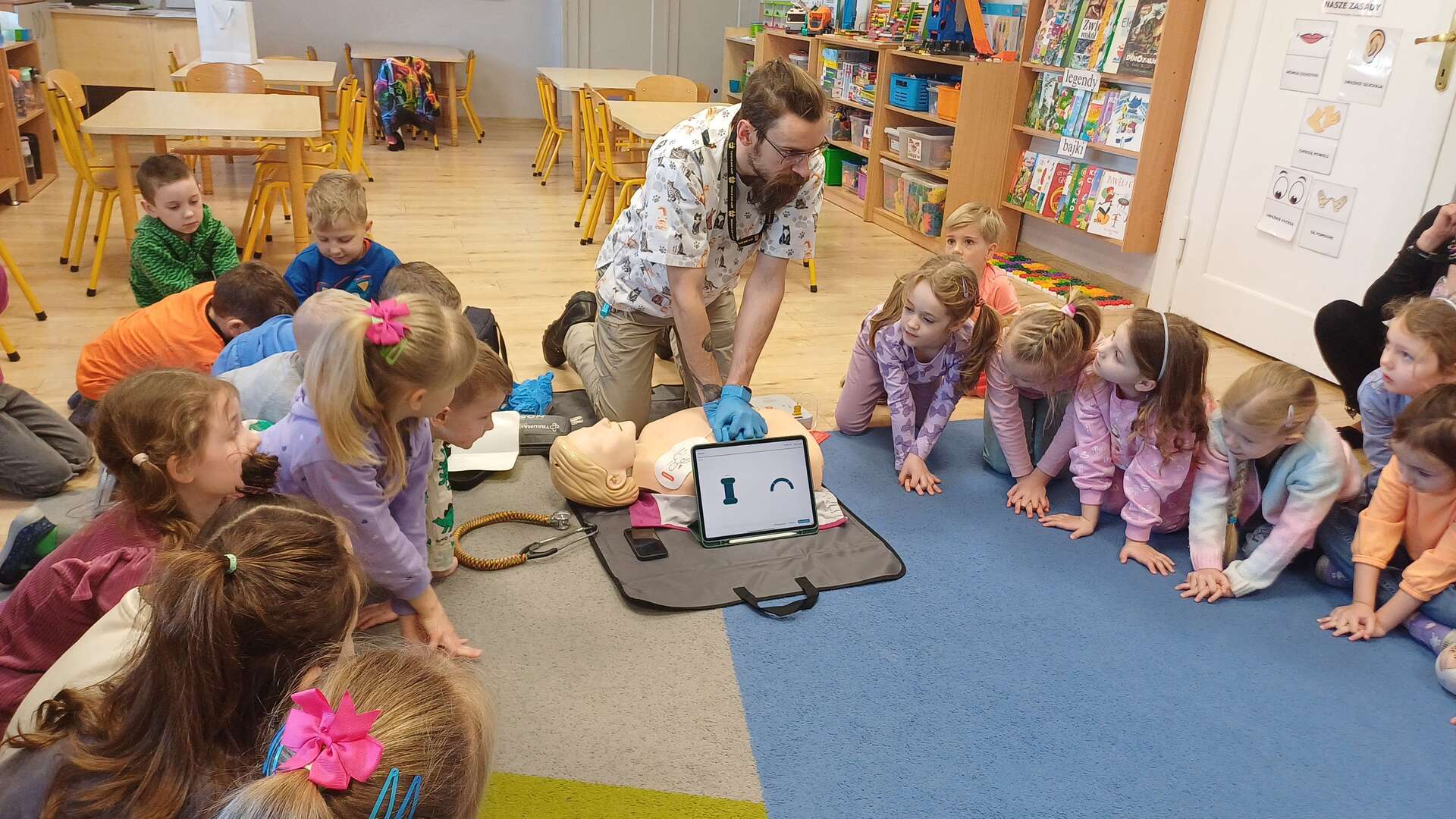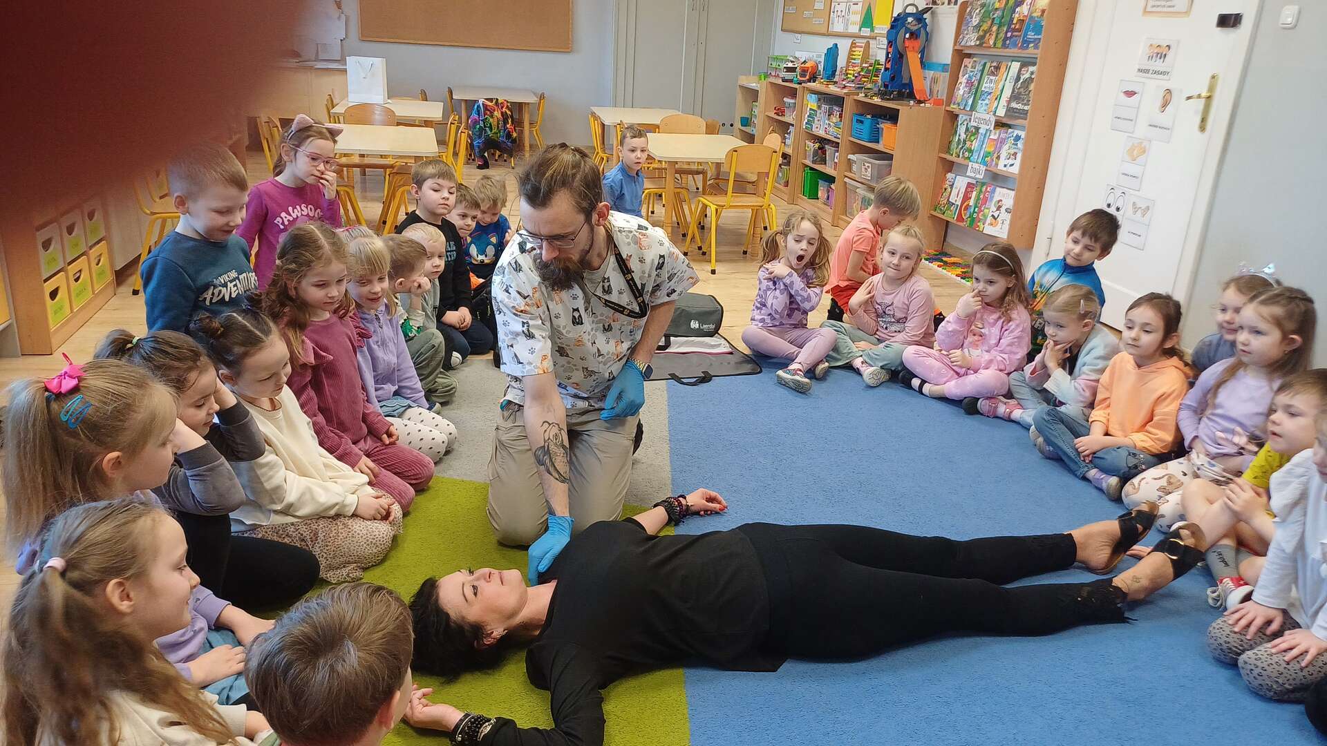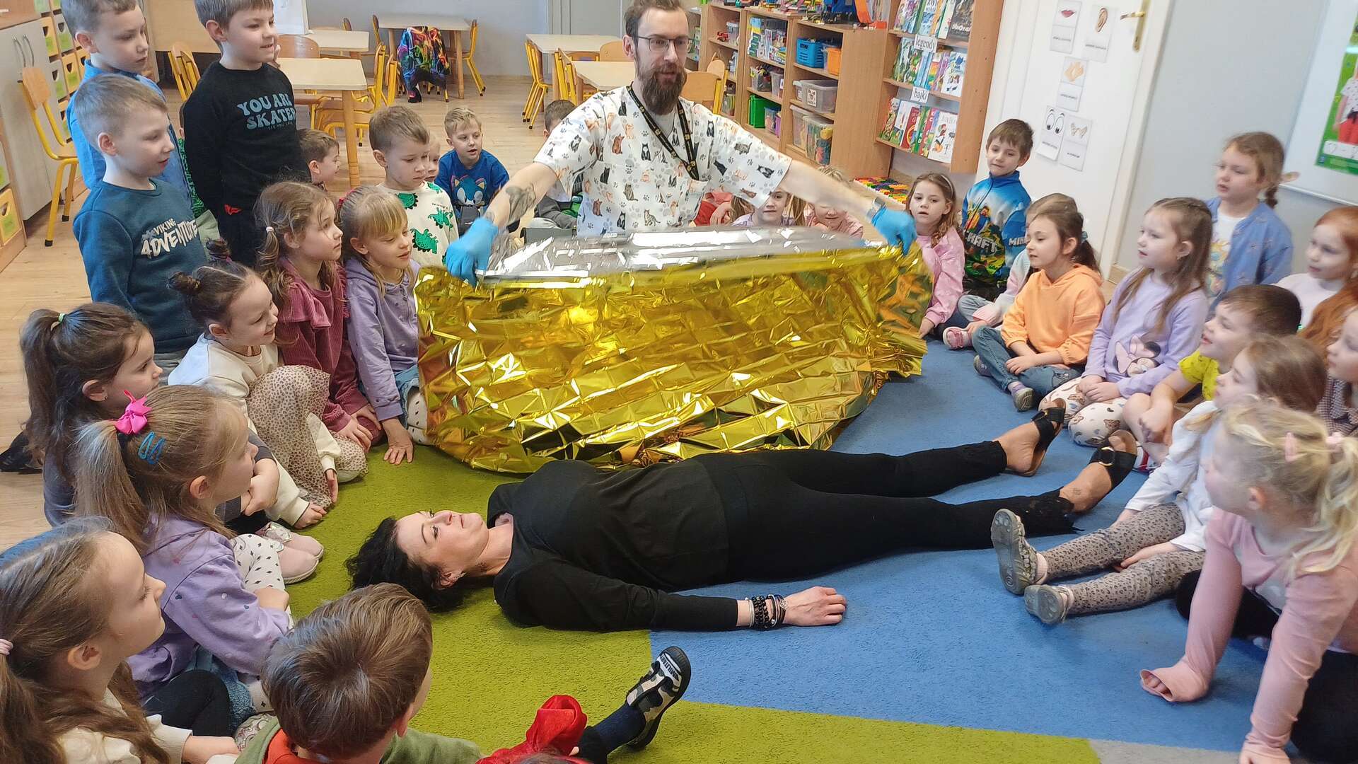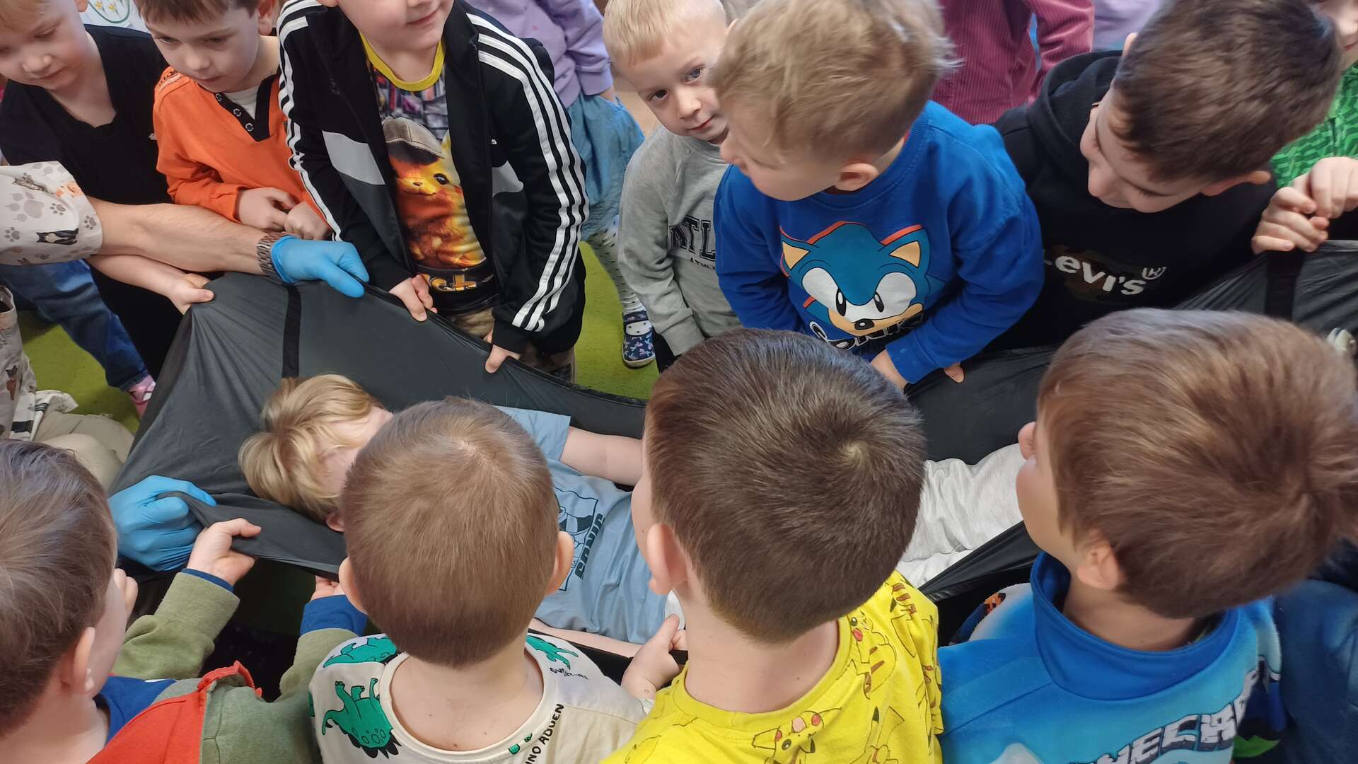 Dzisiaj dzieci z grup starszych uczestniczyły w zajęciach z pierwszej pomocy przedmedycznej. Zajęcia poprowadził p. Rafał Bocian z Ochotniczej Straży Ratowniczej z Lęborka. Podczas zajęć dzieci poznały podstawowe zasady udzielania pierwszej pomocy oraz nabywały umiejętności rozpoznawania oparzeń, omdleń, zranień , sprawdzanie oddechu. Ćwiczyły także wykonywanie numeru alarmowego .