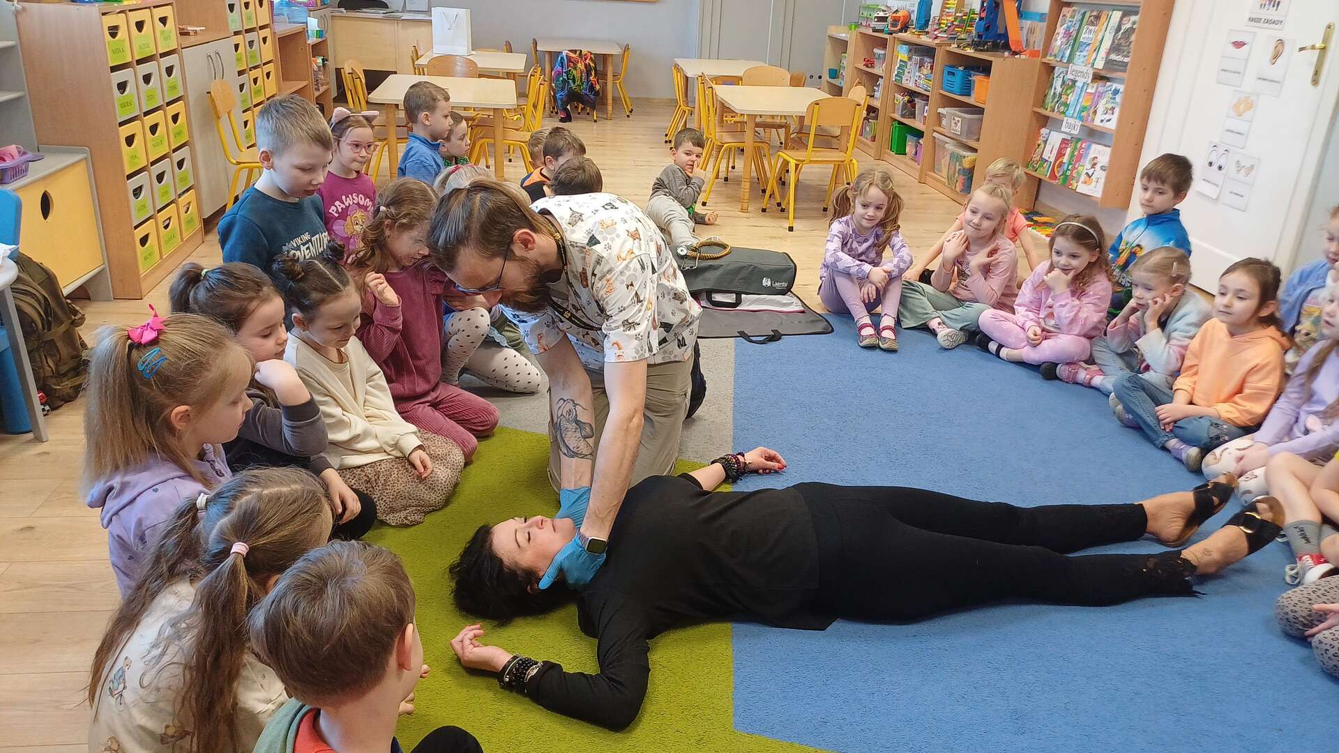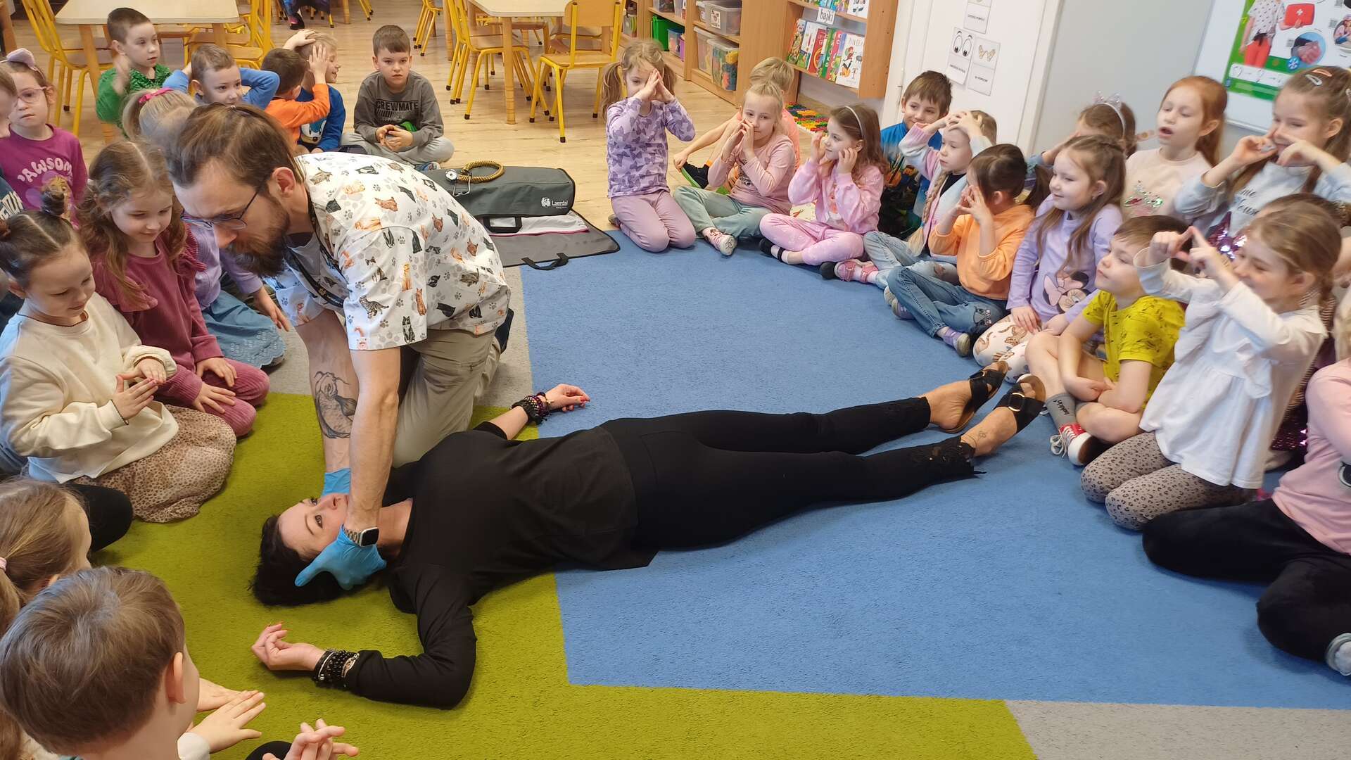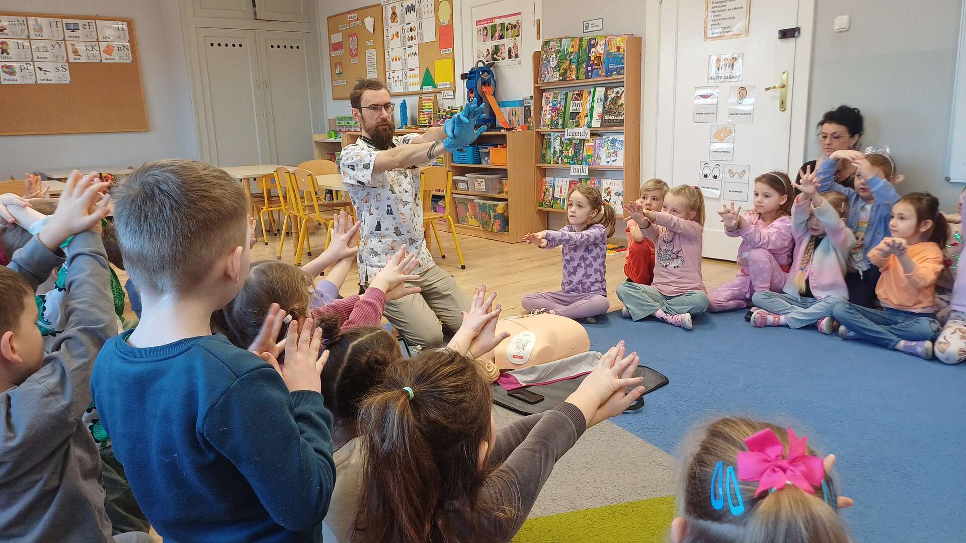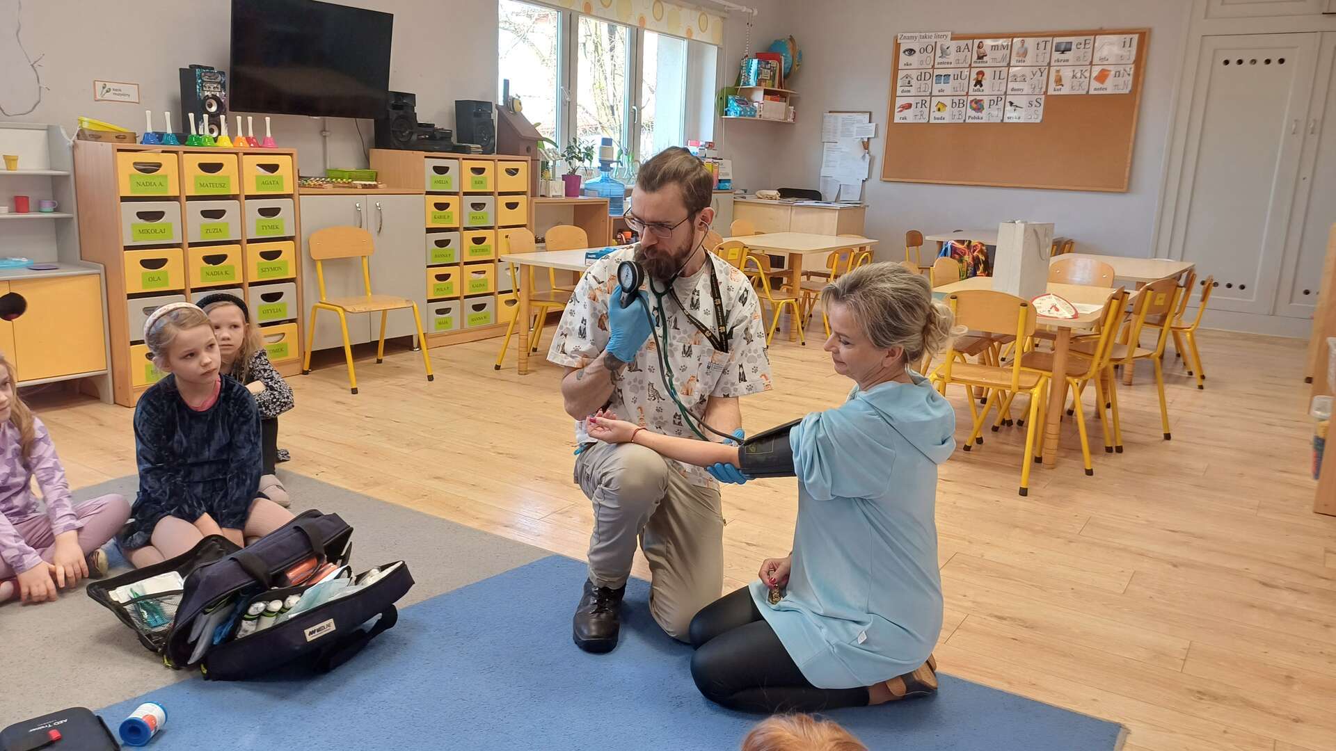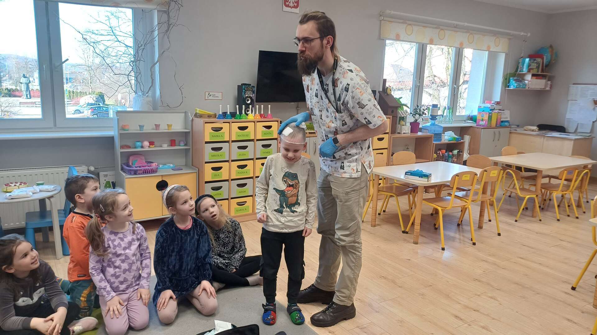 Dzisiaj dzieci z grup starszych uczestniczyły w zajęciach z pierwszej pomocy przedmedycznej. Zajęcia poprowadził p. Rafał Bocian z Ochotniczej Straży Ratowniczej z Lęborka. Podczas zajęć dzieci poznały podstawowe zasady udzielania pierwszej pomocy oraz nabywały umiejętności rozpoznawania oparzeń, omdleń, zranień , sprawdzanie oddechu. Ćwiczyły także wykonywanie numeru alarmowego .