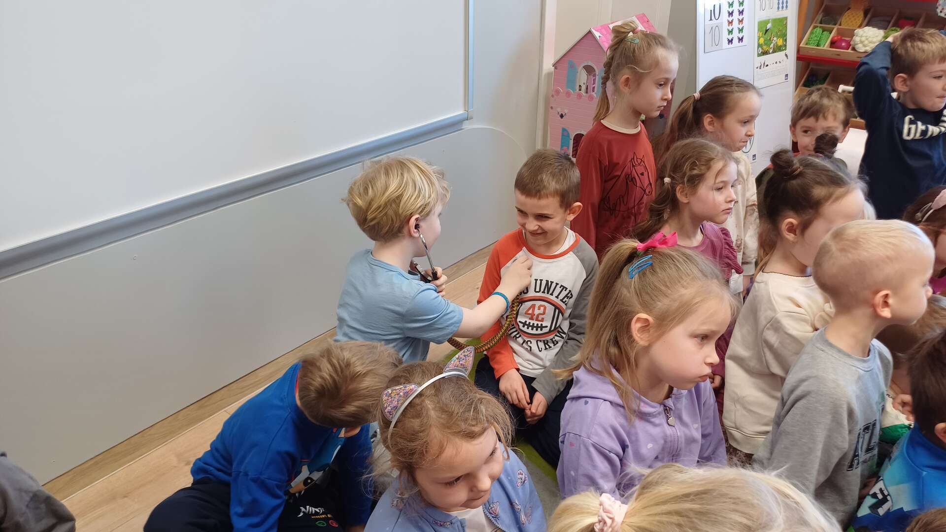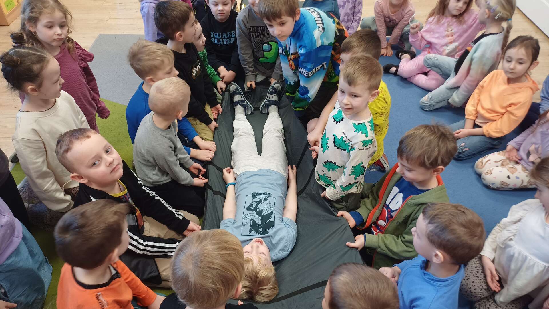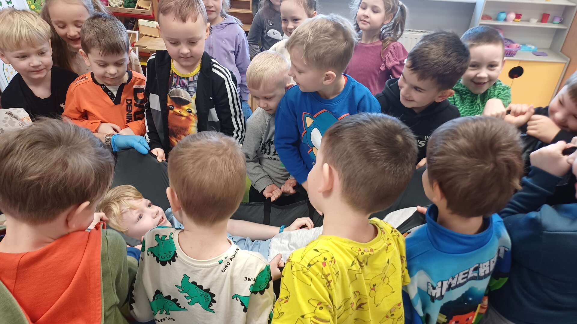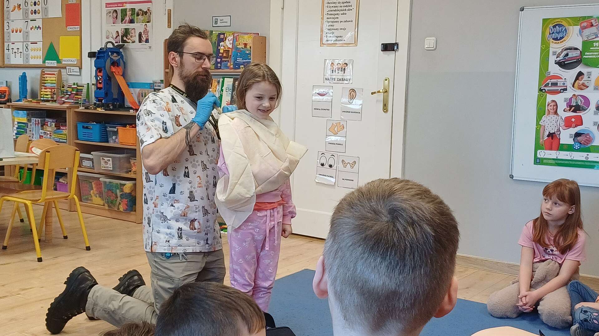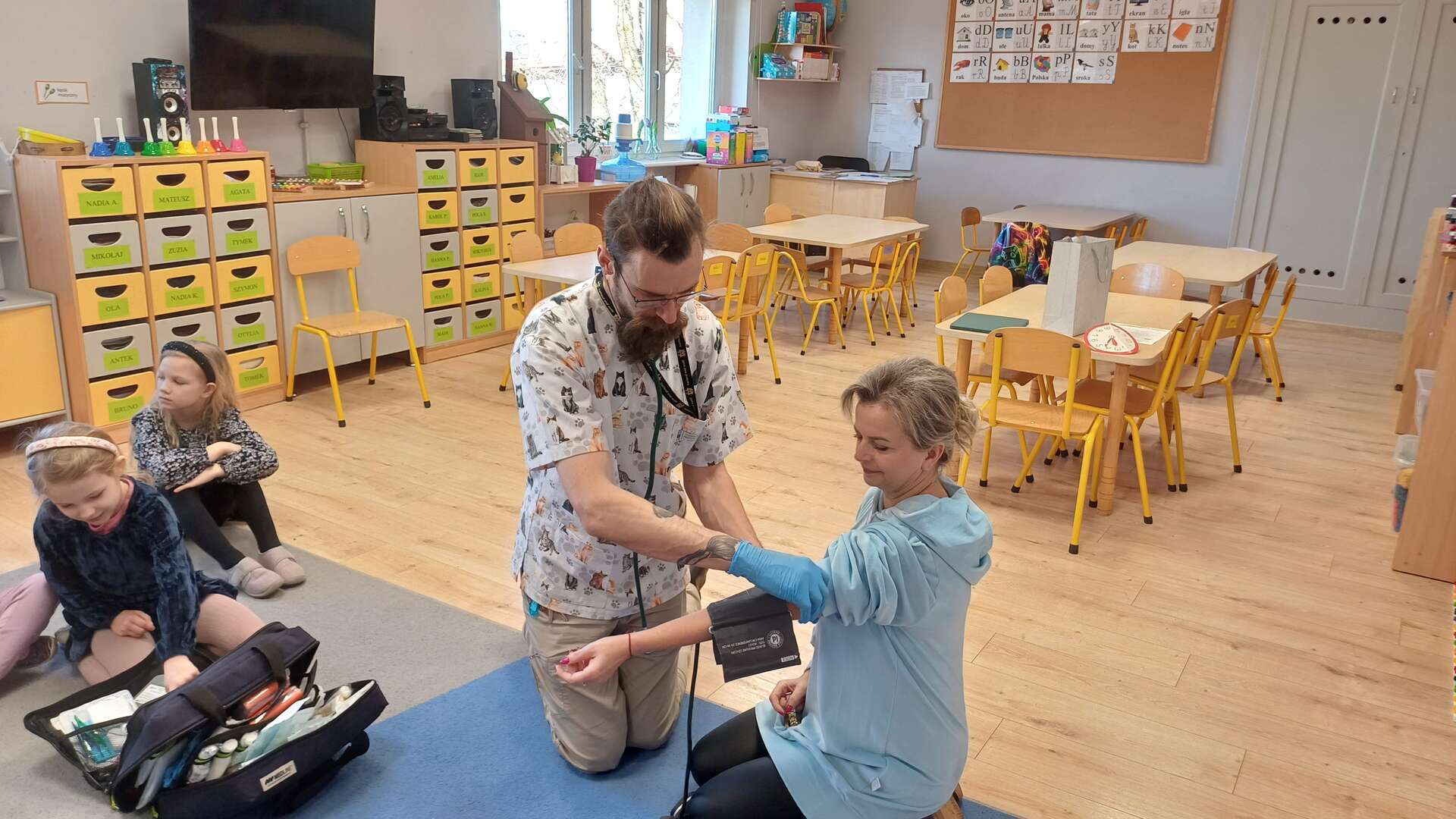 Dzisiaj dzieci z grup starszych uczestniczyły w zajęciach z pierwszej pomocy przedmedycznej. Zajęcia poprowadził p. Rafał Bocian z Ochotniczej Straży Ratowniczej z Lęborka. Podczas zajęć dzieci poznały podstawowe zasady udzielania pierwszej pomocy oraz nabywały umiejętności rozpoznawania oparzeń, omdleń, zranień , sprawdzanie oddechu. Ćwiczyły także wykonywanie numeru alarmowego .