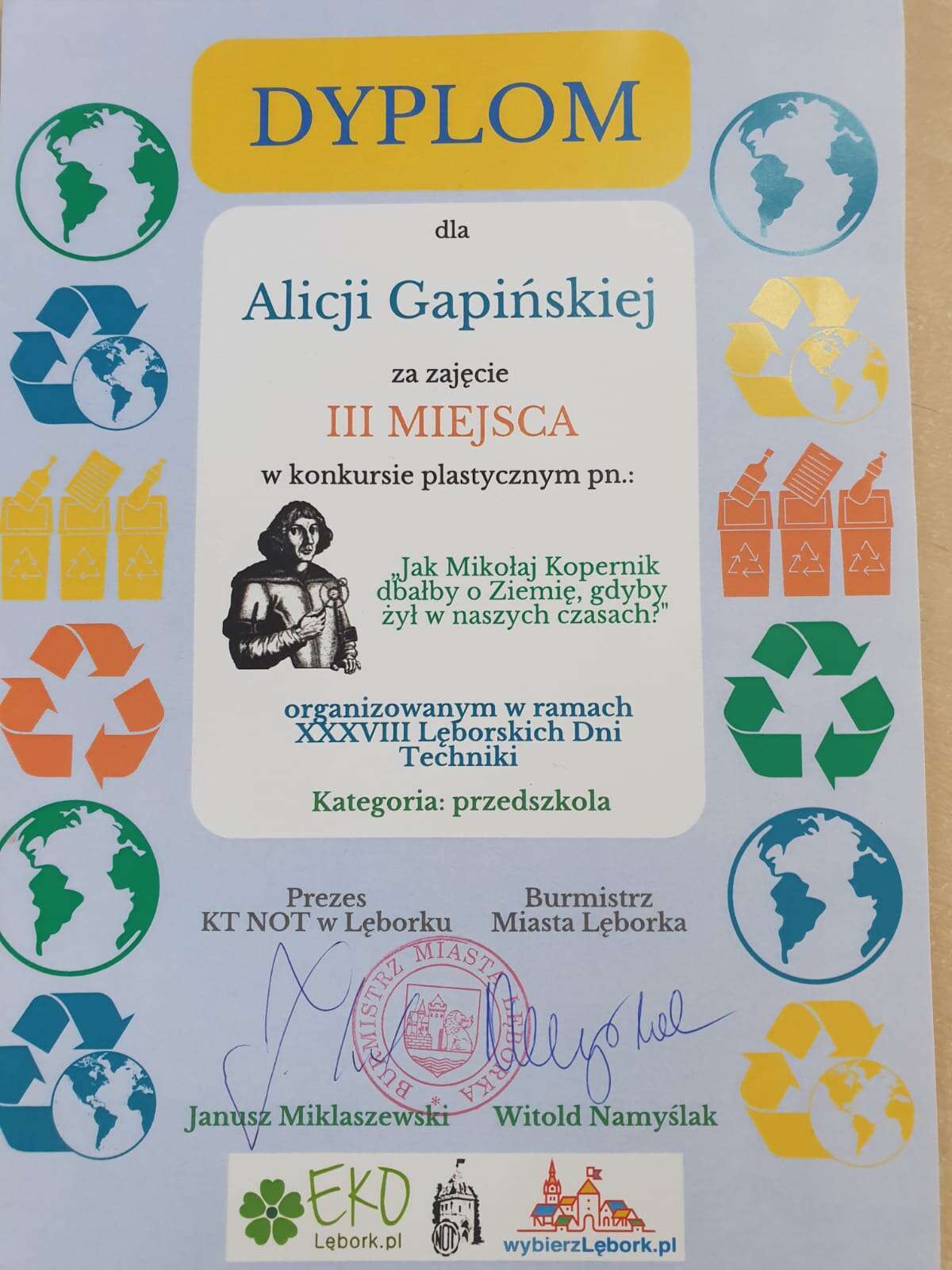 W ramach XXXVIII Lęborskich Dni Techniki zorganizowano konkurs plastyczny pod nazwą " Jak Mikołaj Kopernik dbałby o Ziemię, gdyby żył w naszych czasach". Konkurs skierowany był do dzieci z lęborskich placówek. Z naszego przedszkola w konkursie wzięły udział dzieci z grupy III. Łącznie wykonano 10 pięknych prac.