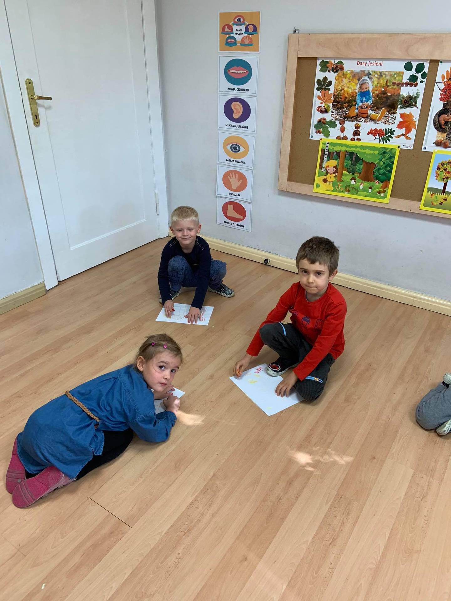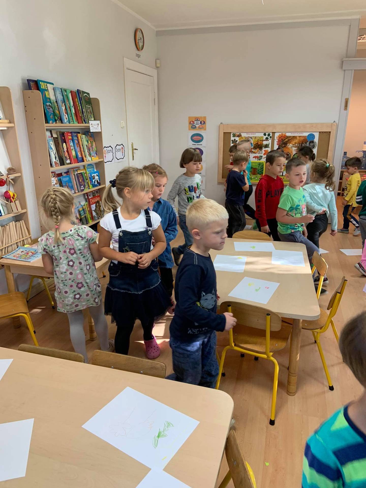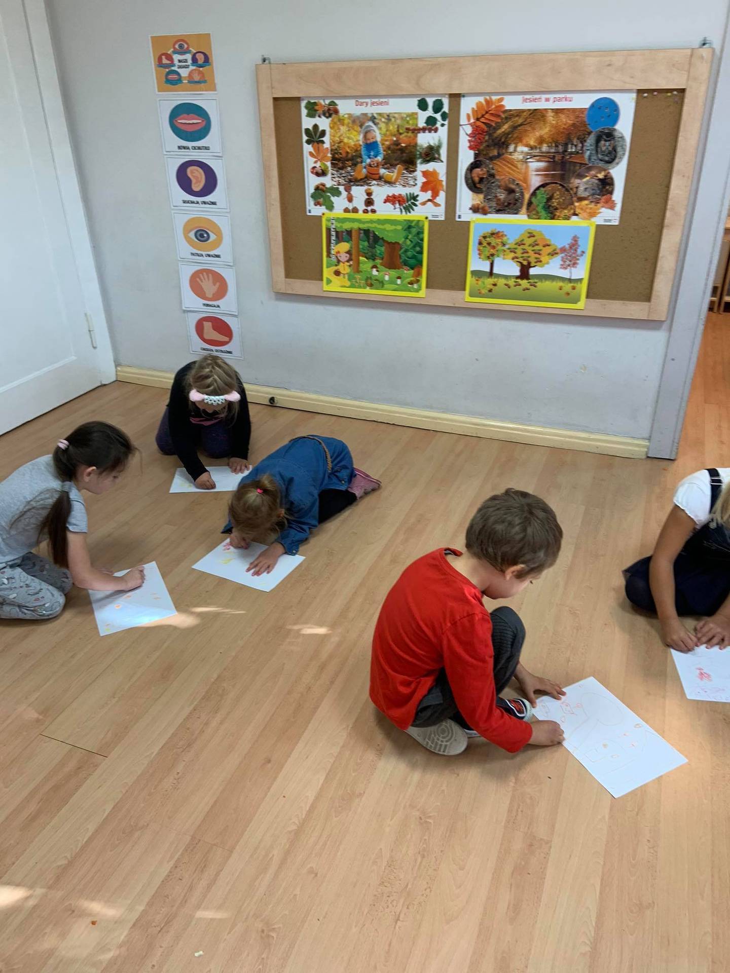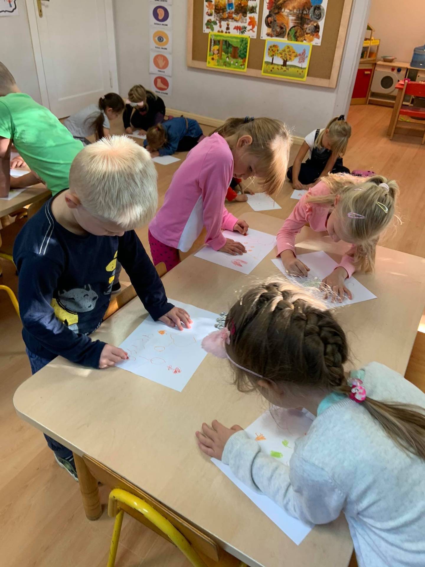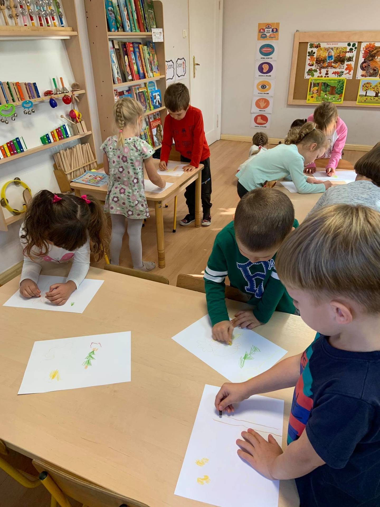 Dzisiaj dzieci z grupy III z wielkim zaangażowaniem uczestniczyły w zajęciach muzycznych. Przedszkolaki rysowały jesień na różnych kartkach do piosenki "Jesień maluje"