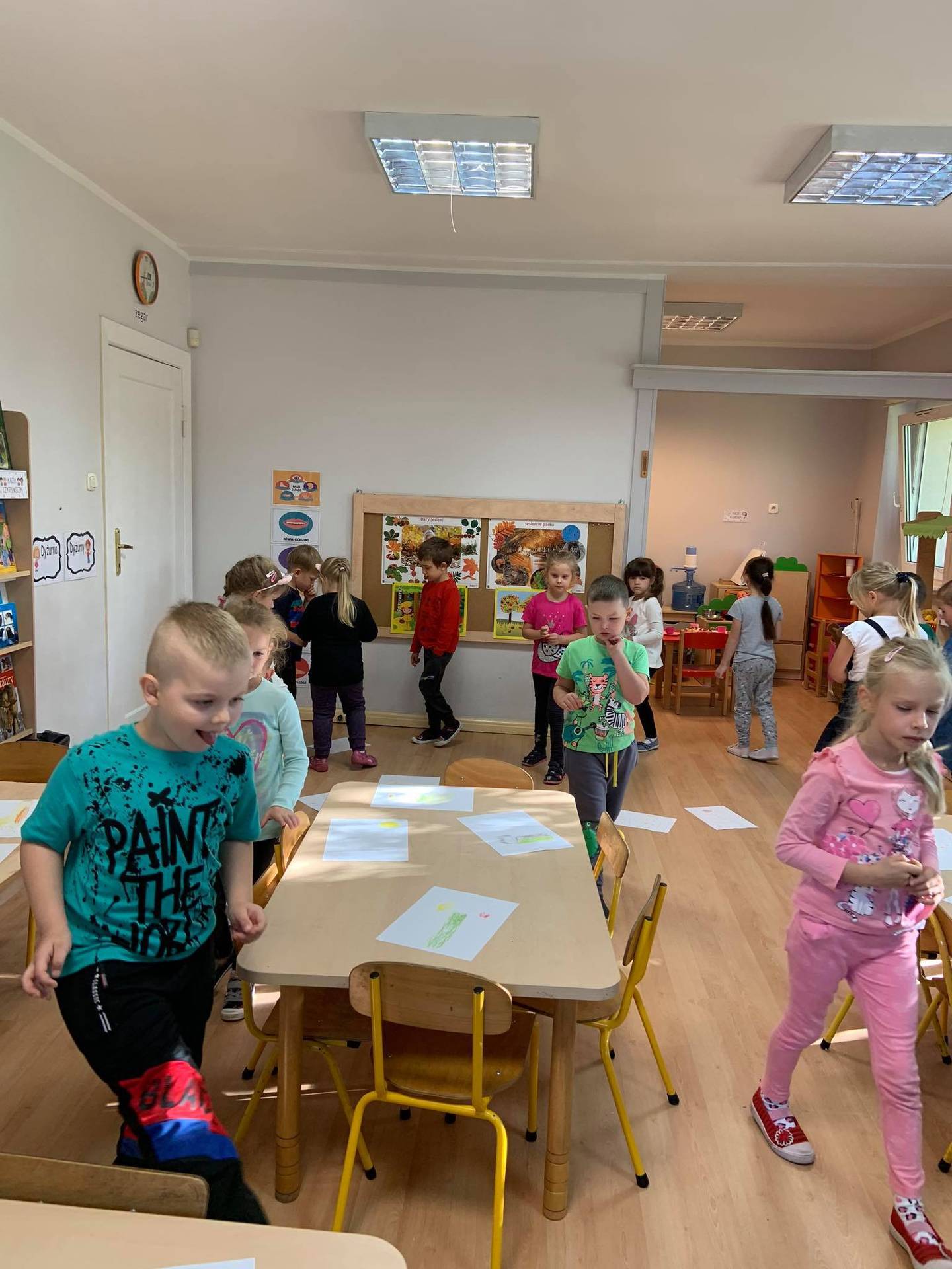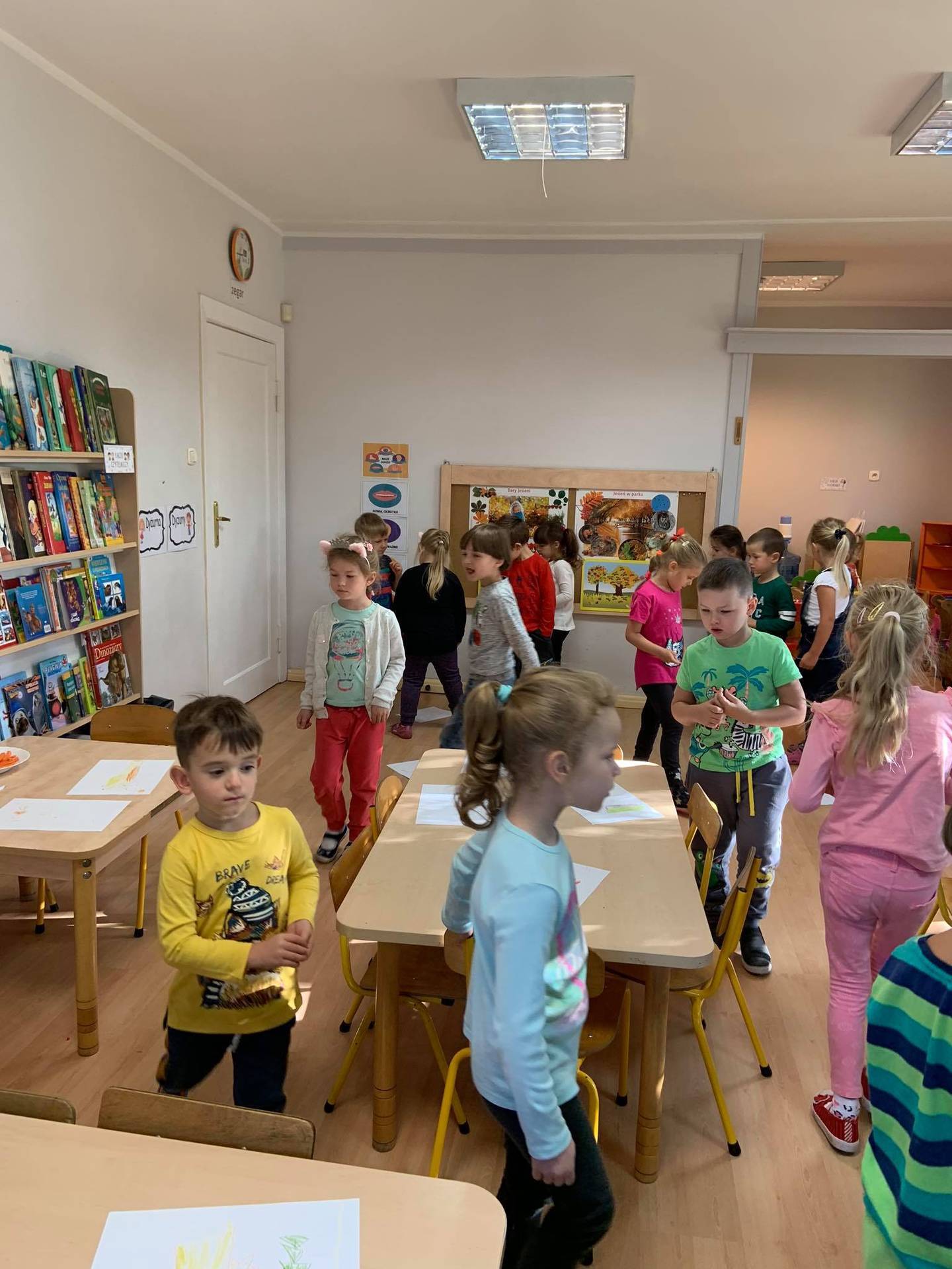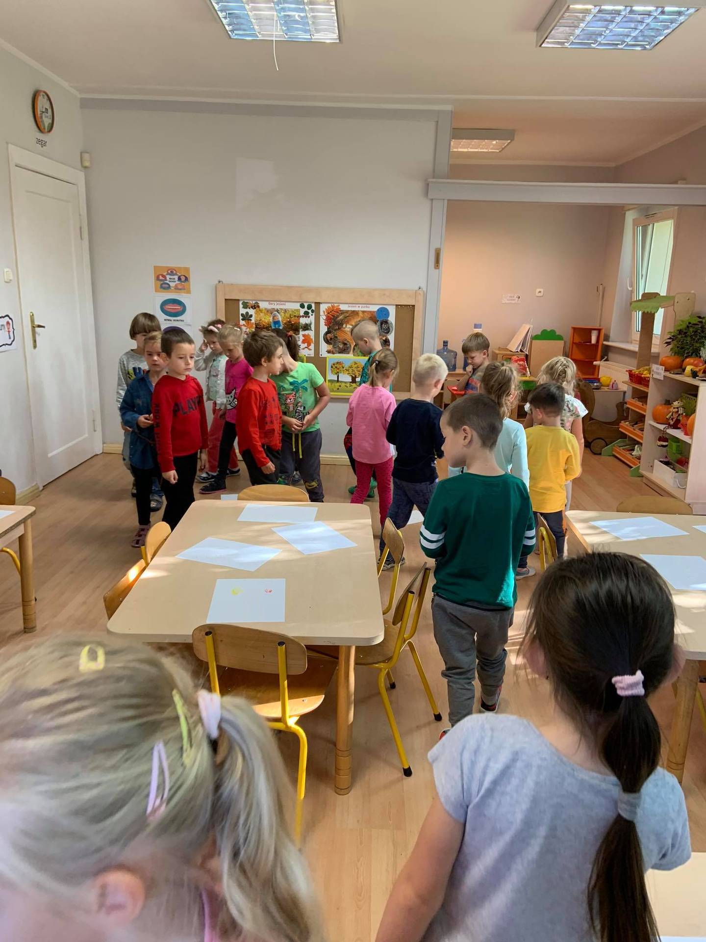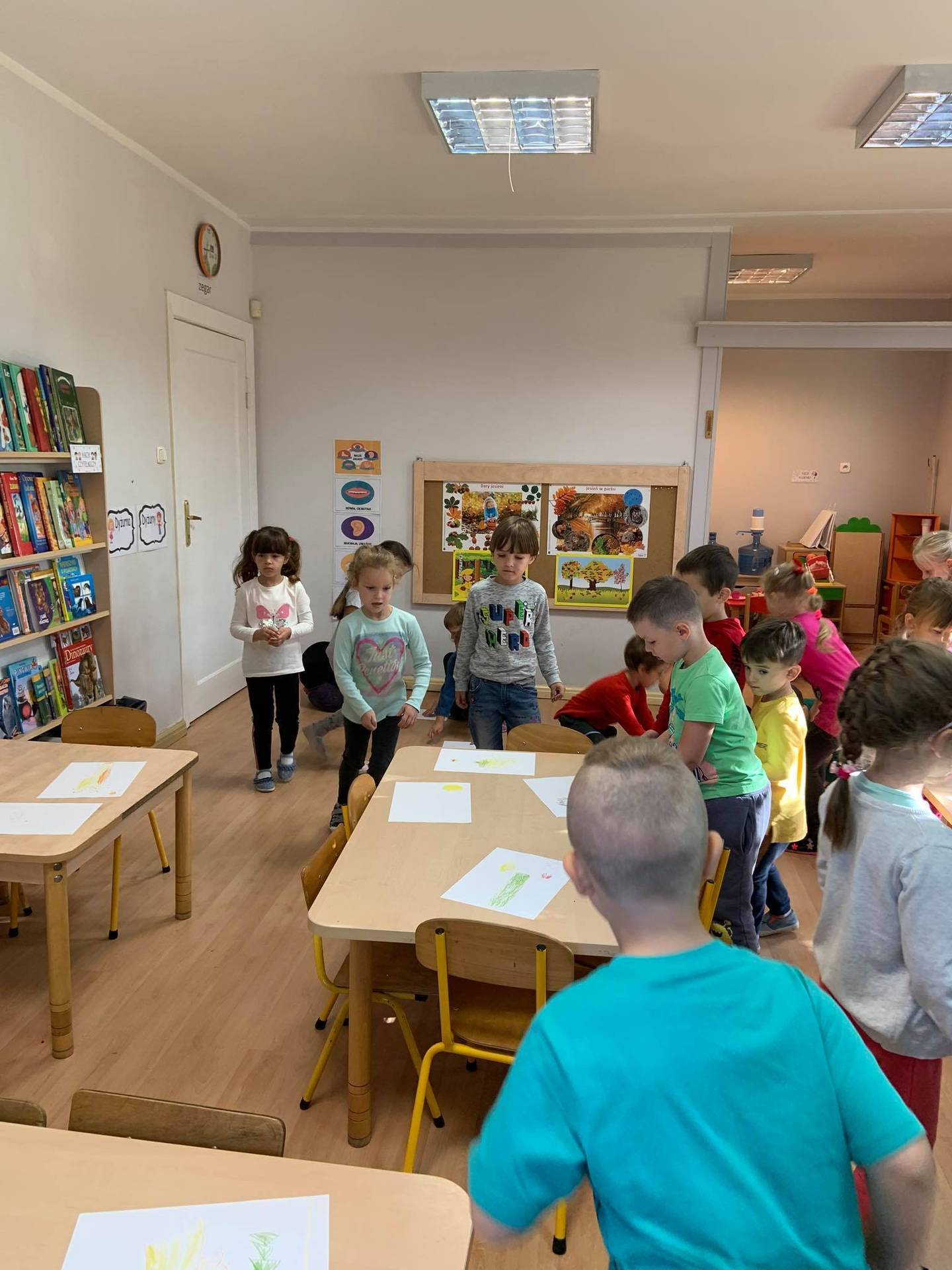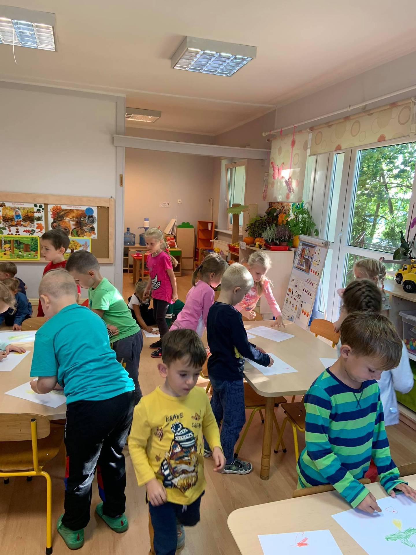 Dzisiaj dzieci z grupy III z wielkim zaangażowaniem uczestniczyły w zajęciach muzycznych. Przedszkolaki rysowały jesień na różnych kartkach do piosenki "Jesień maluje"