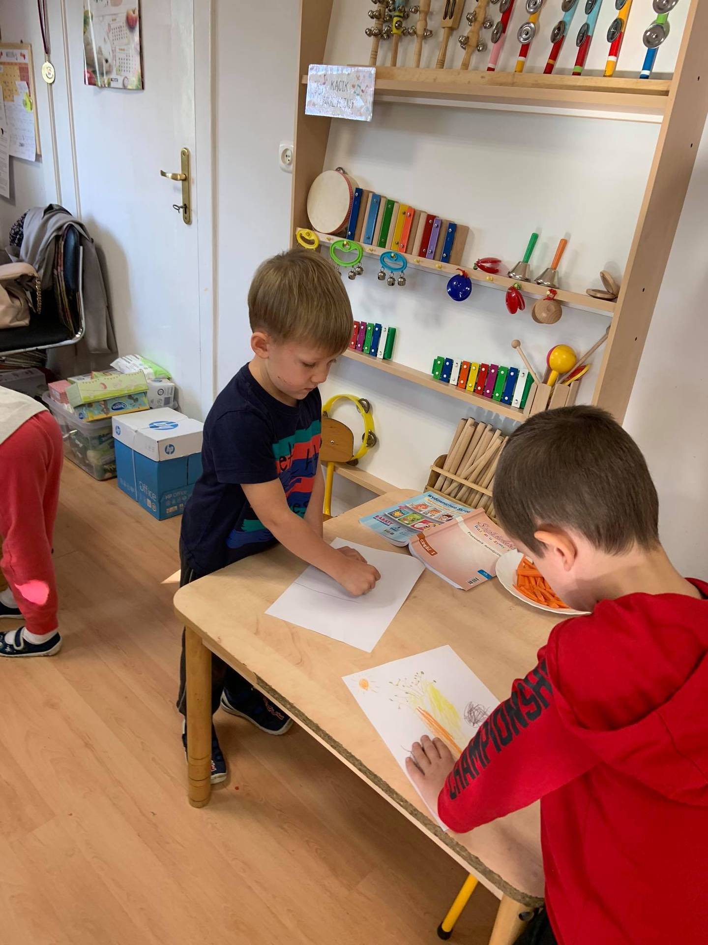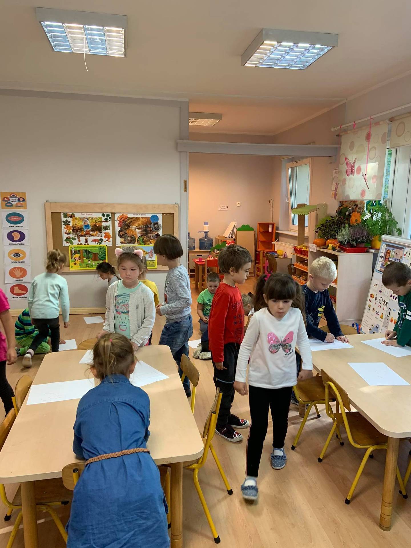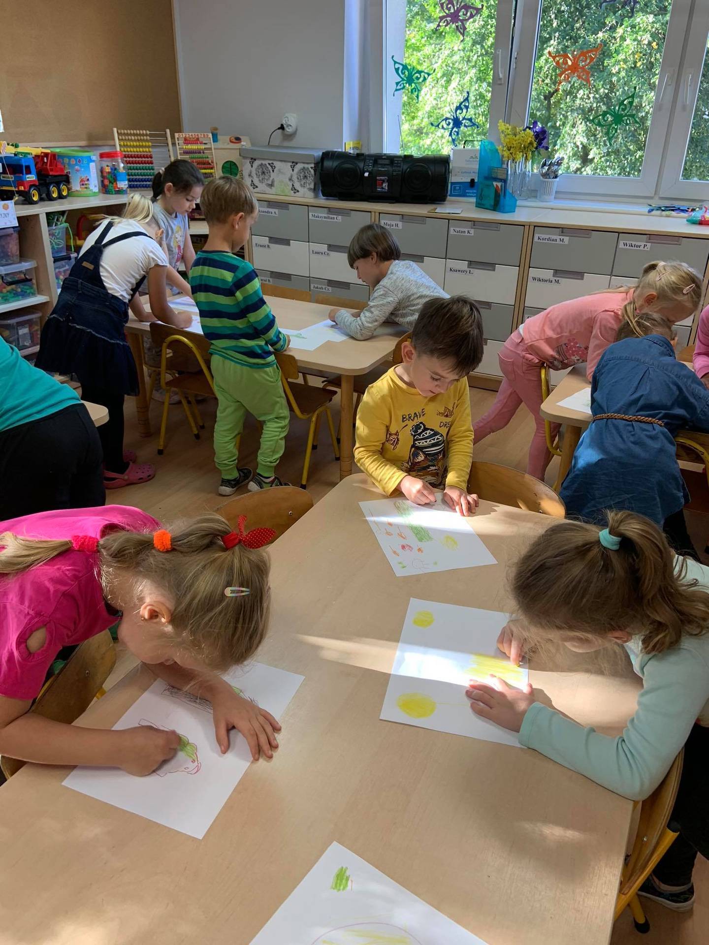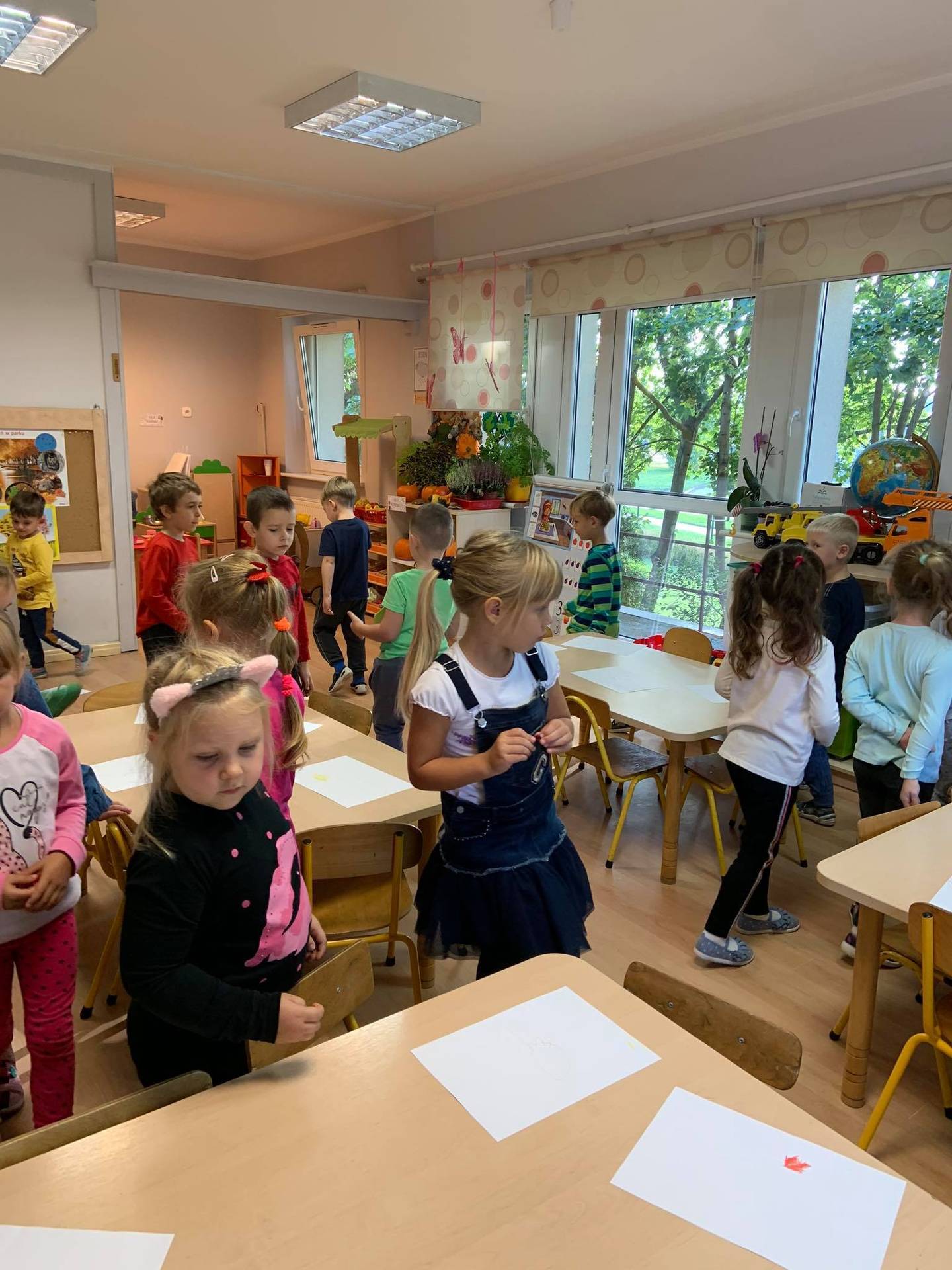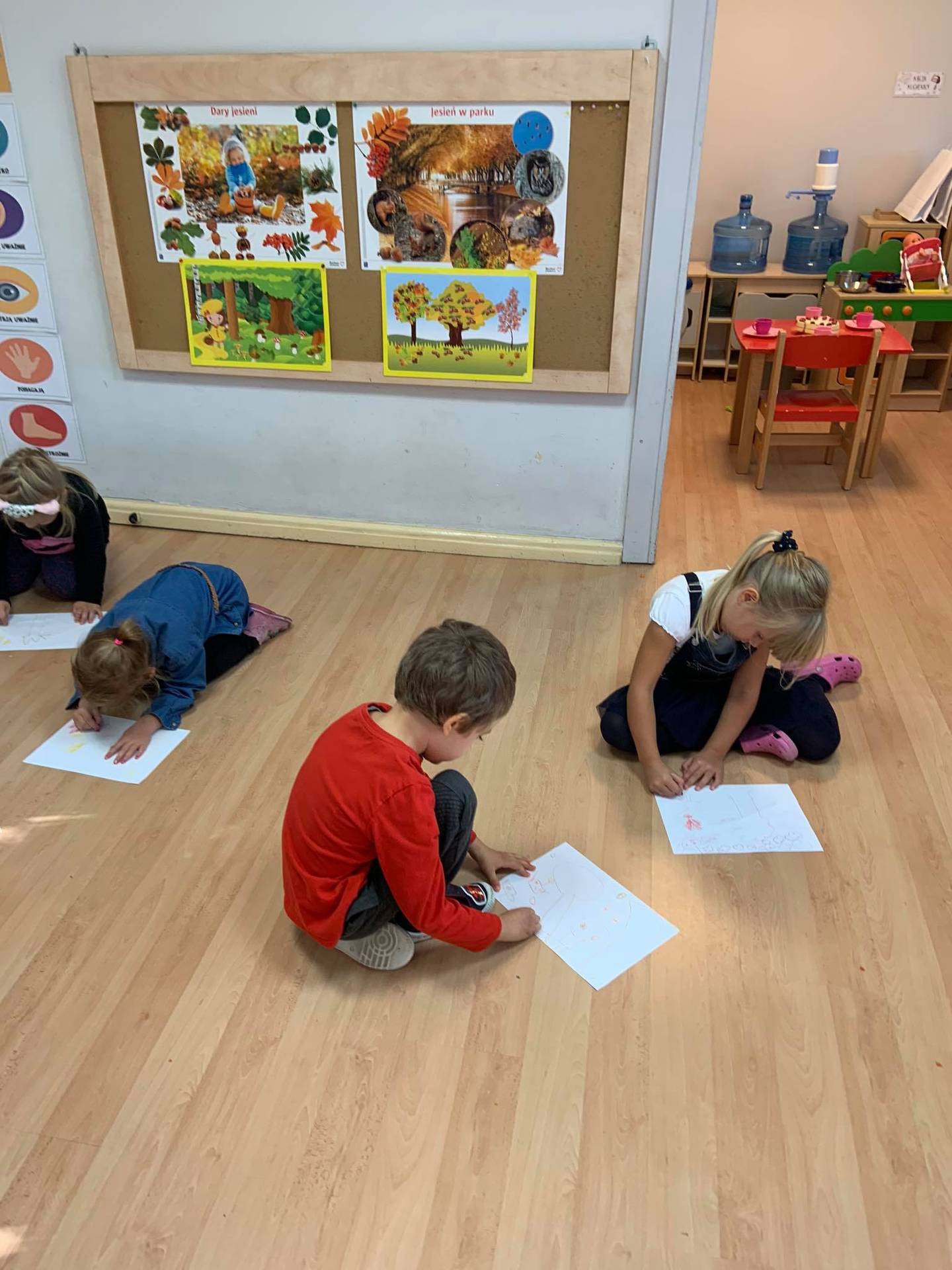 Dzisiaj dzieci z grupy III z wielkim zaangażowaniem uczestniczyły w zajęciach muzycznych. Przedszkolaki rysowały jesień na różnych kartkach do piosenki "Jesień maluje"