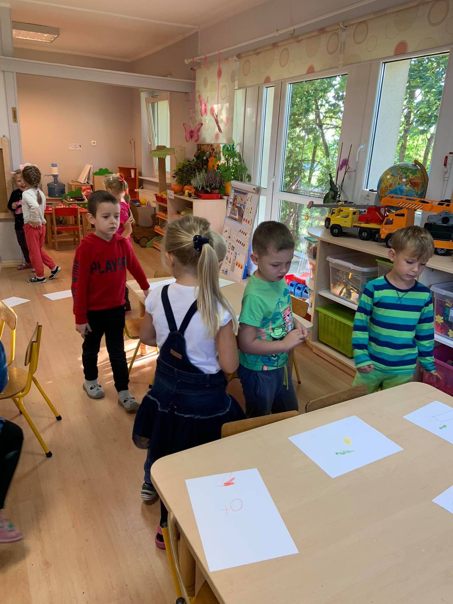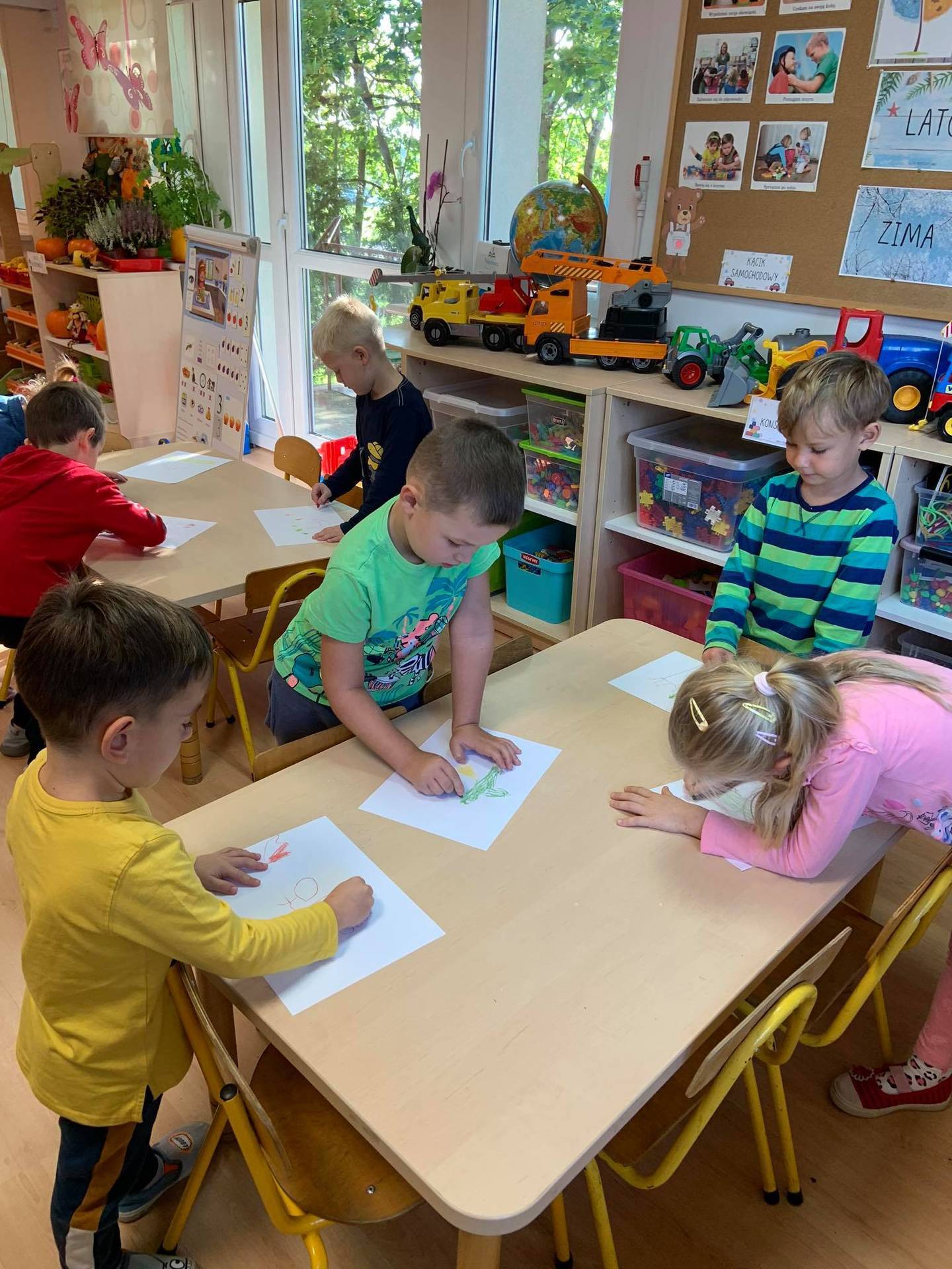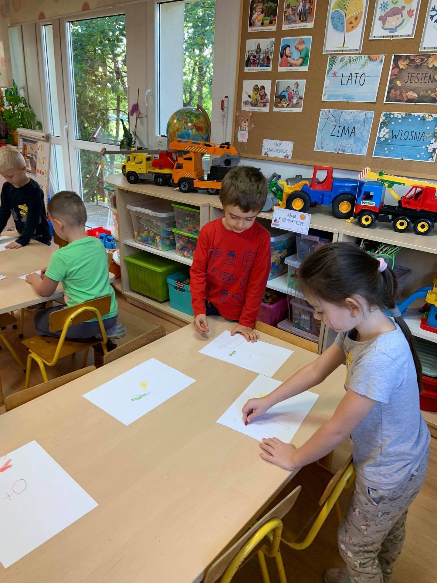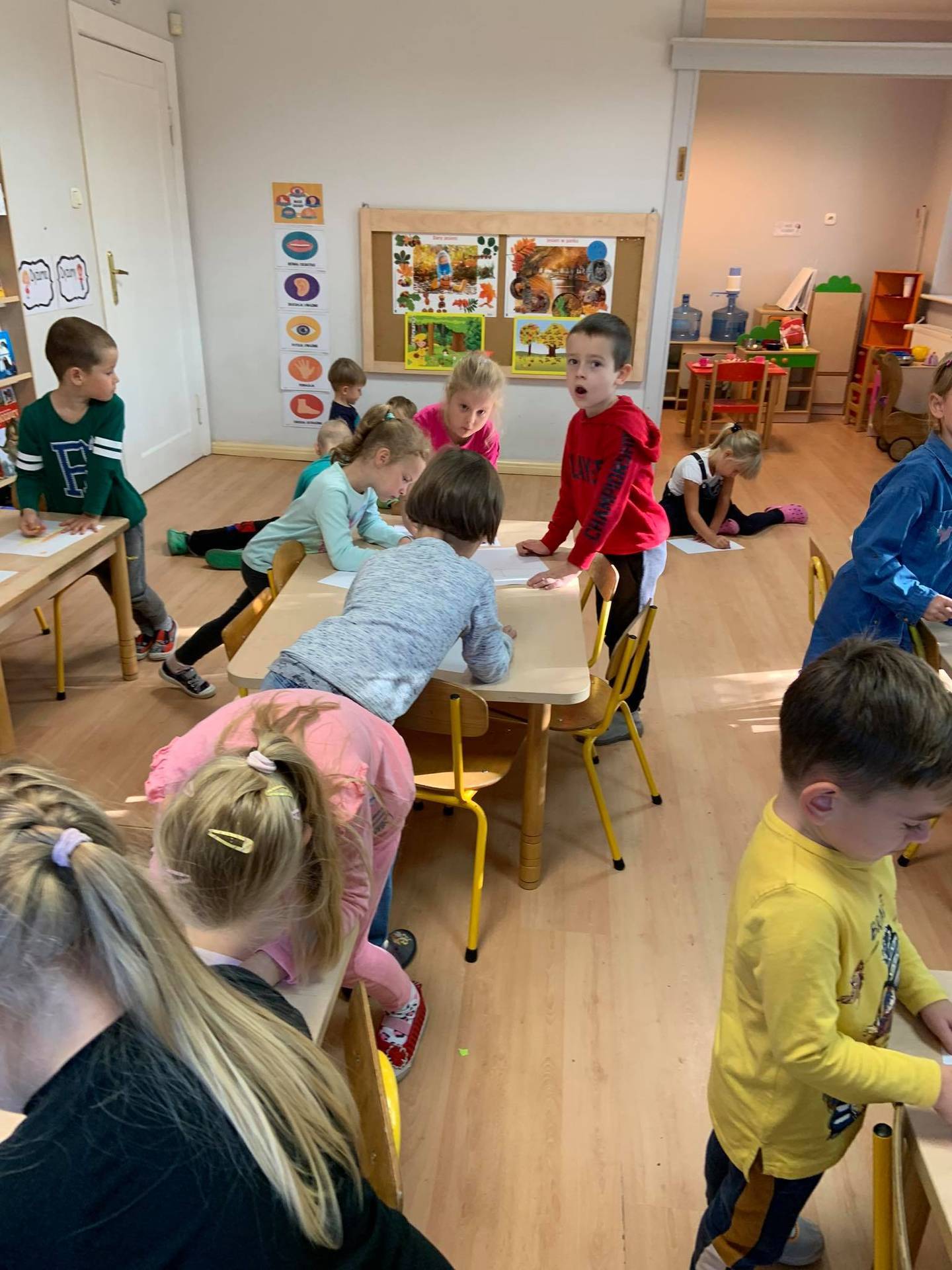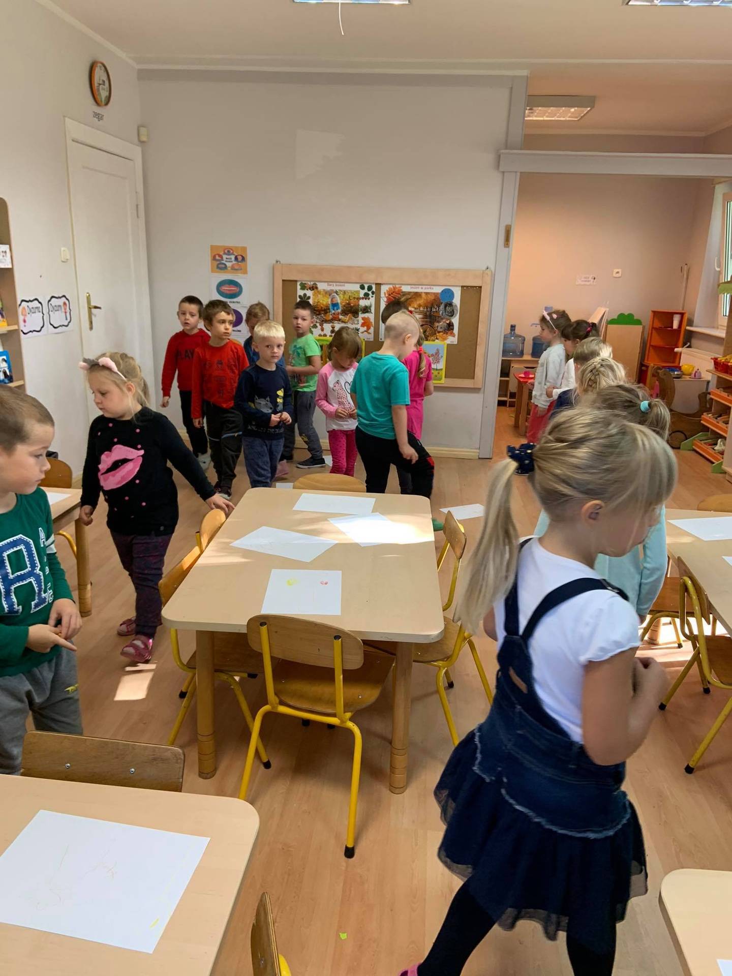 Dzisiaj dzieci z grupy III z wielkim zaangażowaniem uczestniczyły w zajęciach muzycznych. Przedszkolaki rysowały jesień na różnych kartkach do piosenki "Jesień maluje"