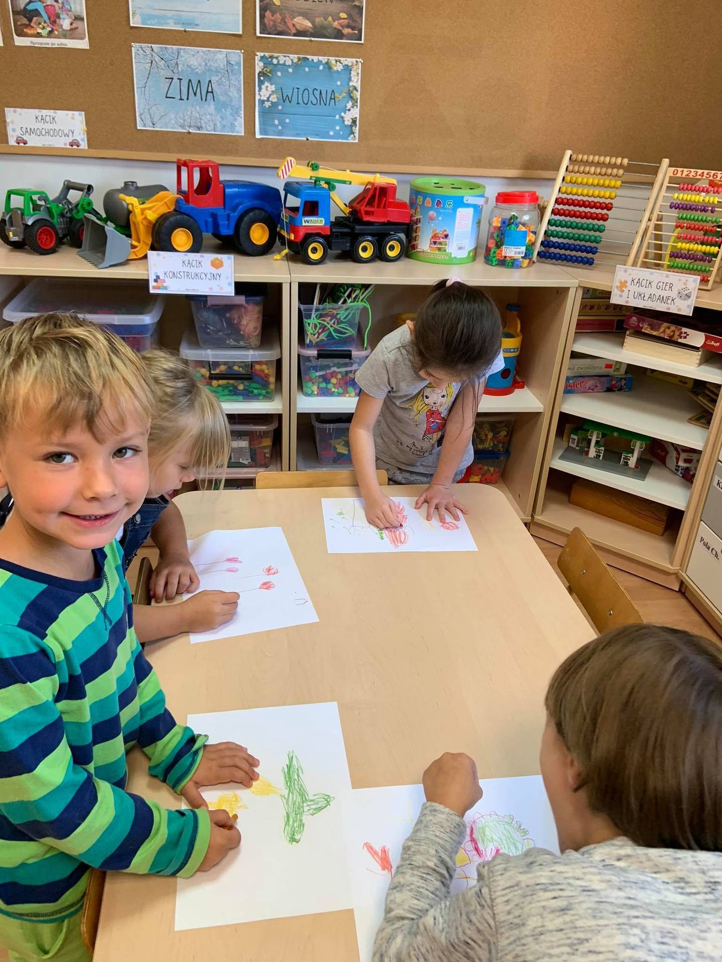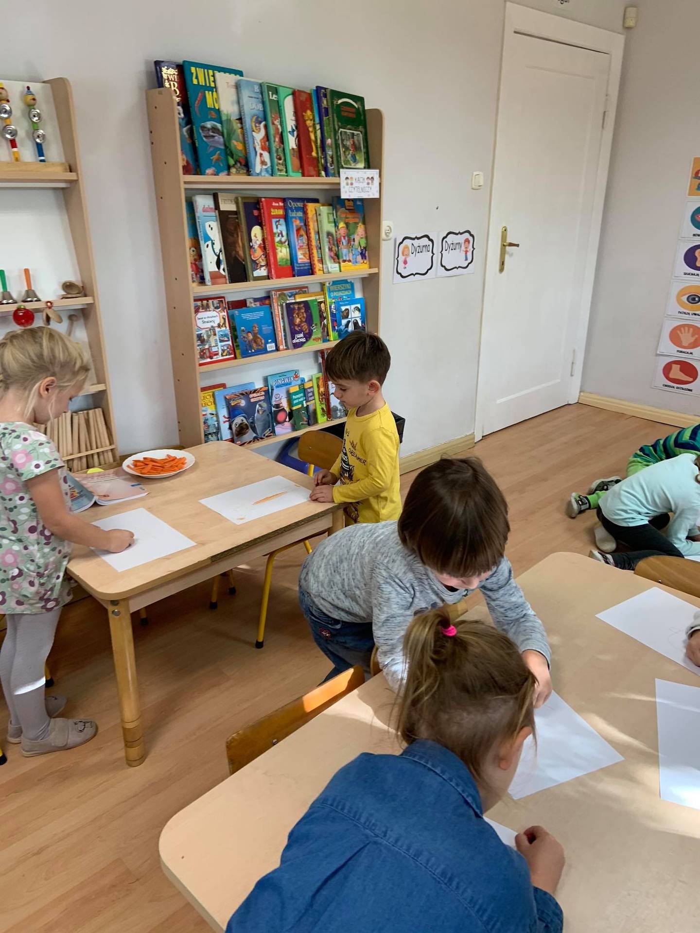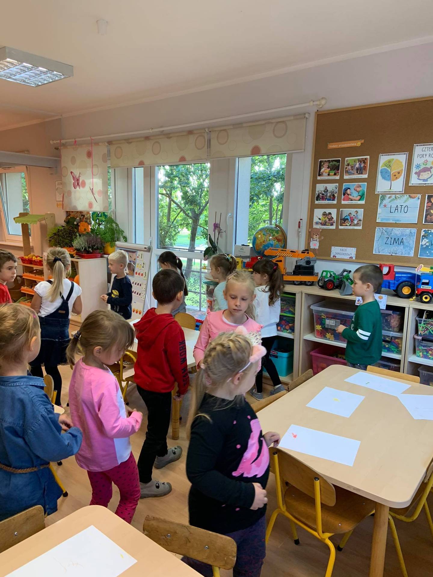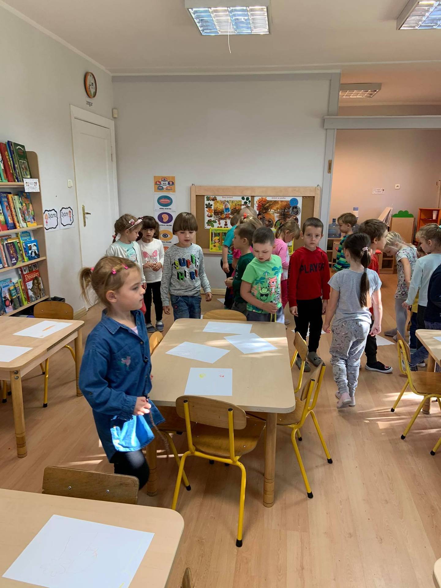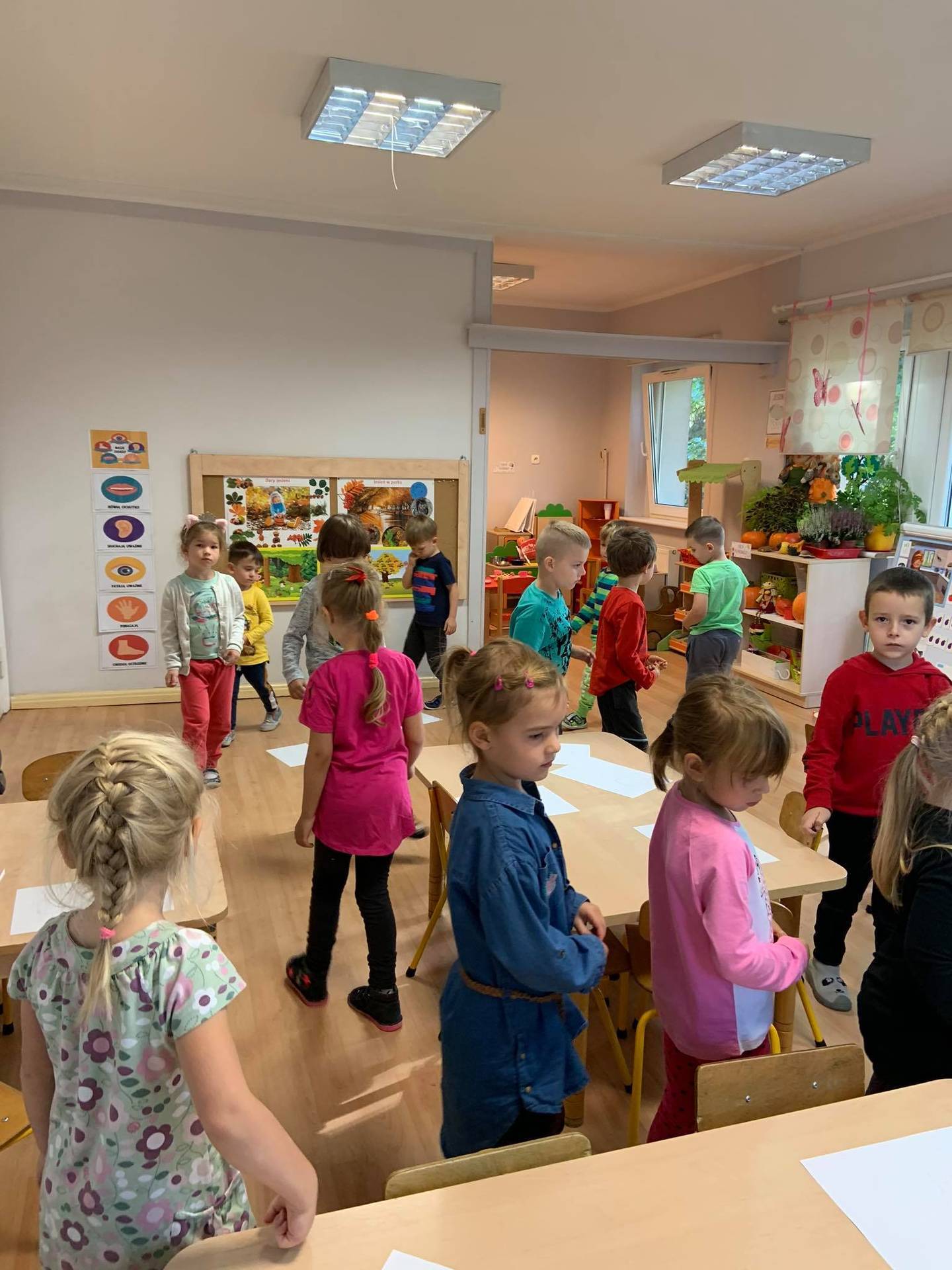 Dzisiaj dzieci z grupy III z wielkim zaangażowaniem uczestniczyły w zajęciach muzycznych. Przedszkolaki rysowały jesień na różnych kartkach do piosenki "Jesień maluje"