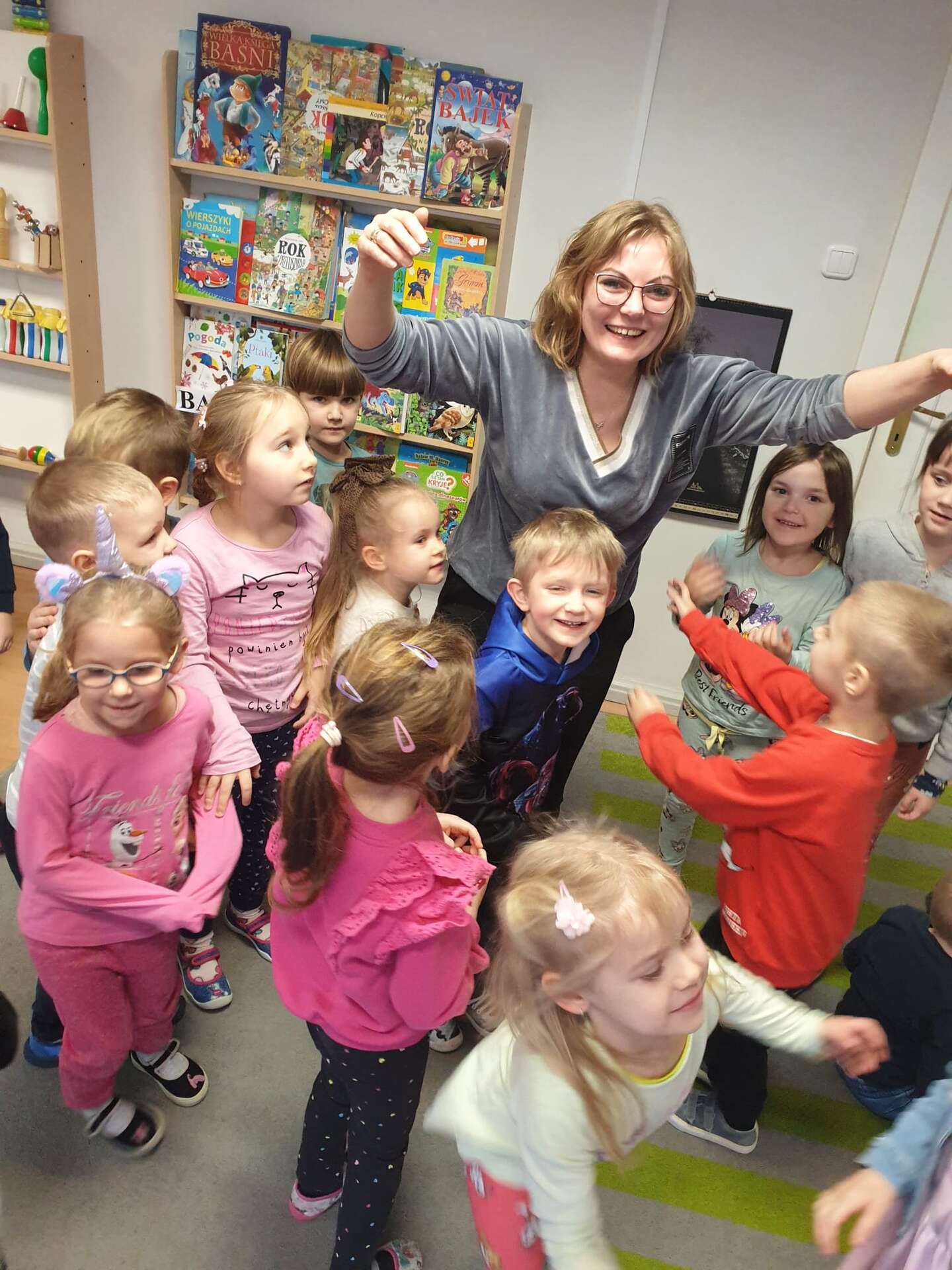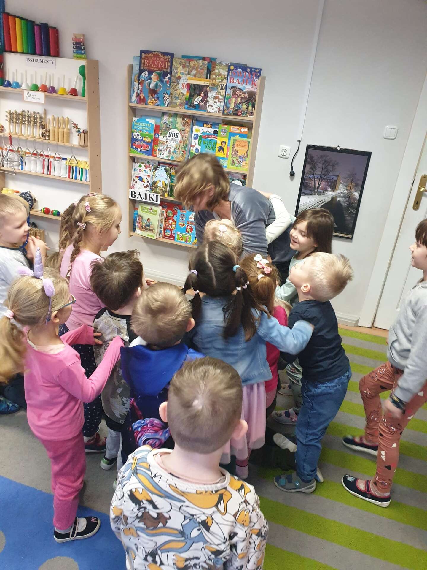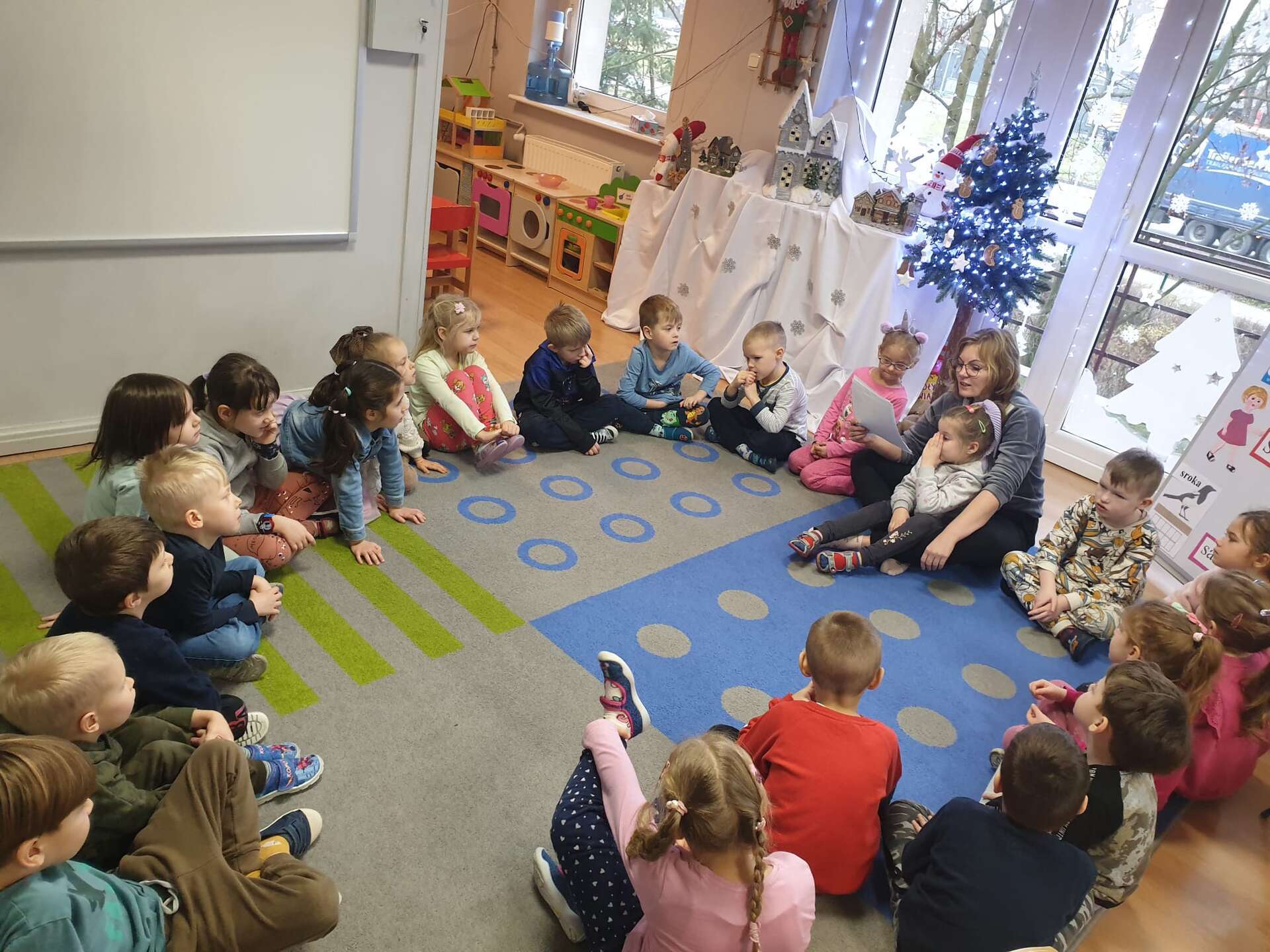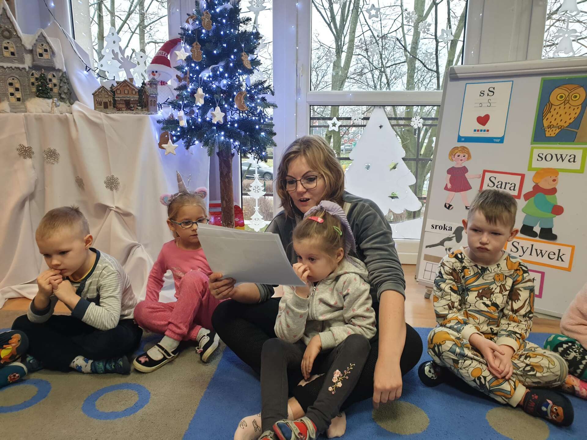 Mama Nadii czyta dzieciom, które siedzą na dywanie