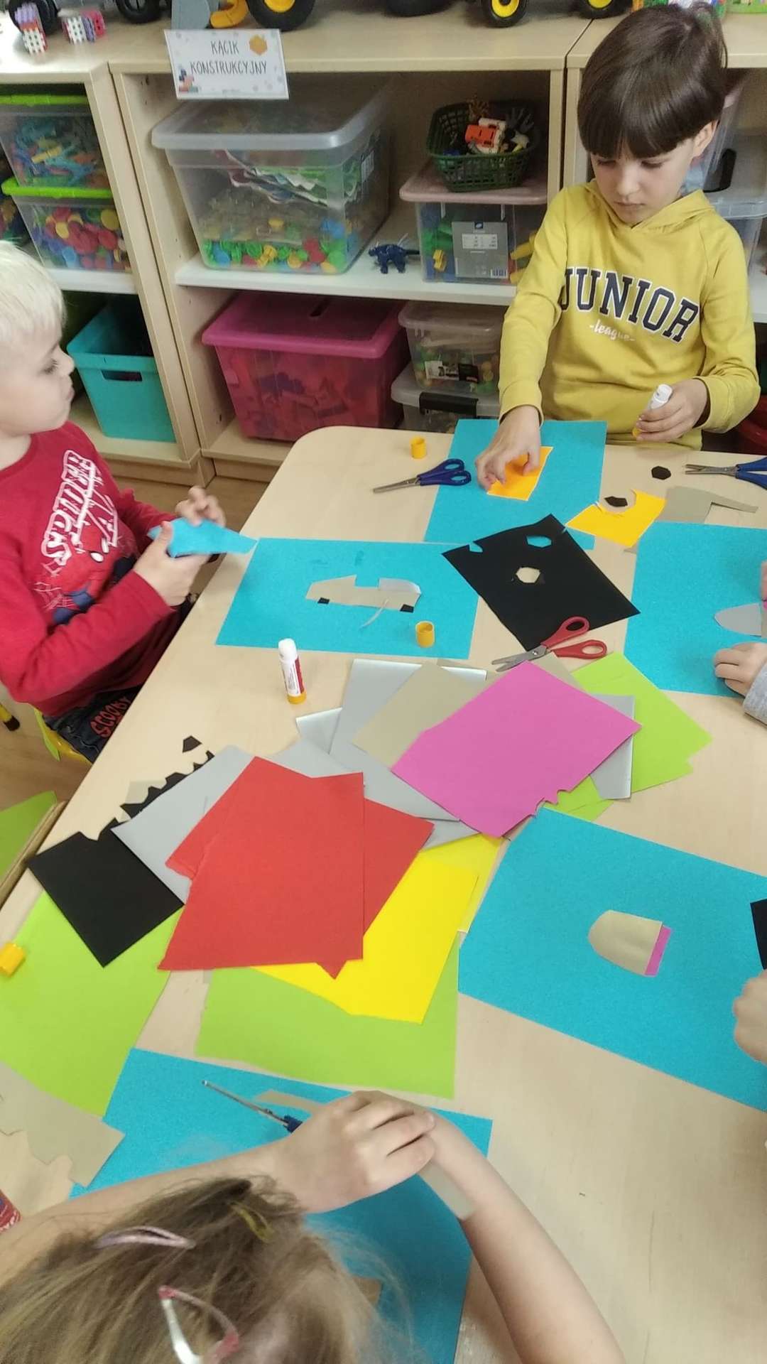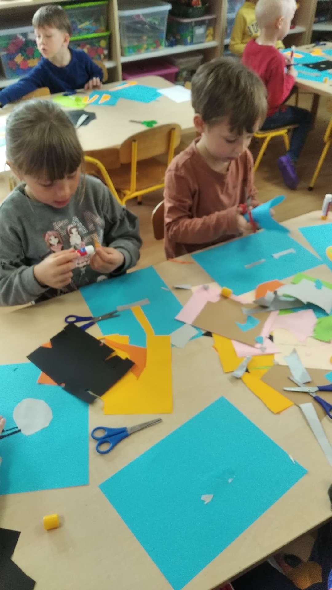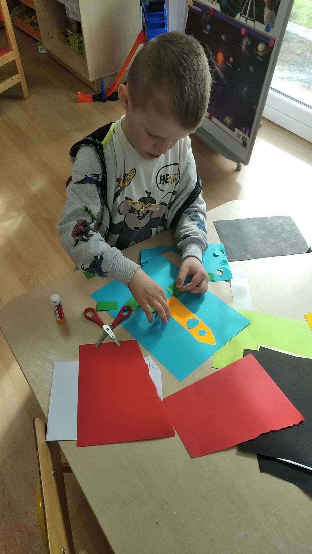 „Żeglarze” mówią, że ten kosmos to ma coraz mniej tajemnic przed nami…Pozostałe odkryjemy niebawem. A tymczasem konstruowaliśmy pojazdy kosmiczne – co kto chciał – rakiety, spodki i inne, równie ważne… Praca była indywidualna. Przedszkolaki z GR III wykazały się prawdziwą wyobraźnią, każdy pojazd był inny i każdy bardzo ciekawy.