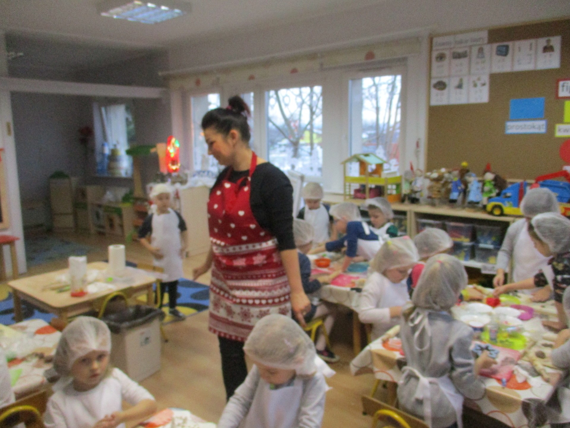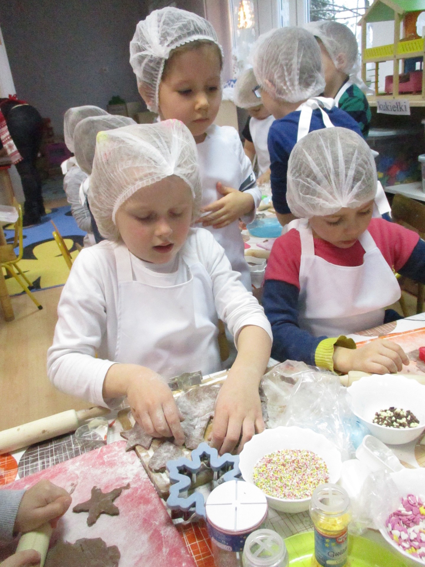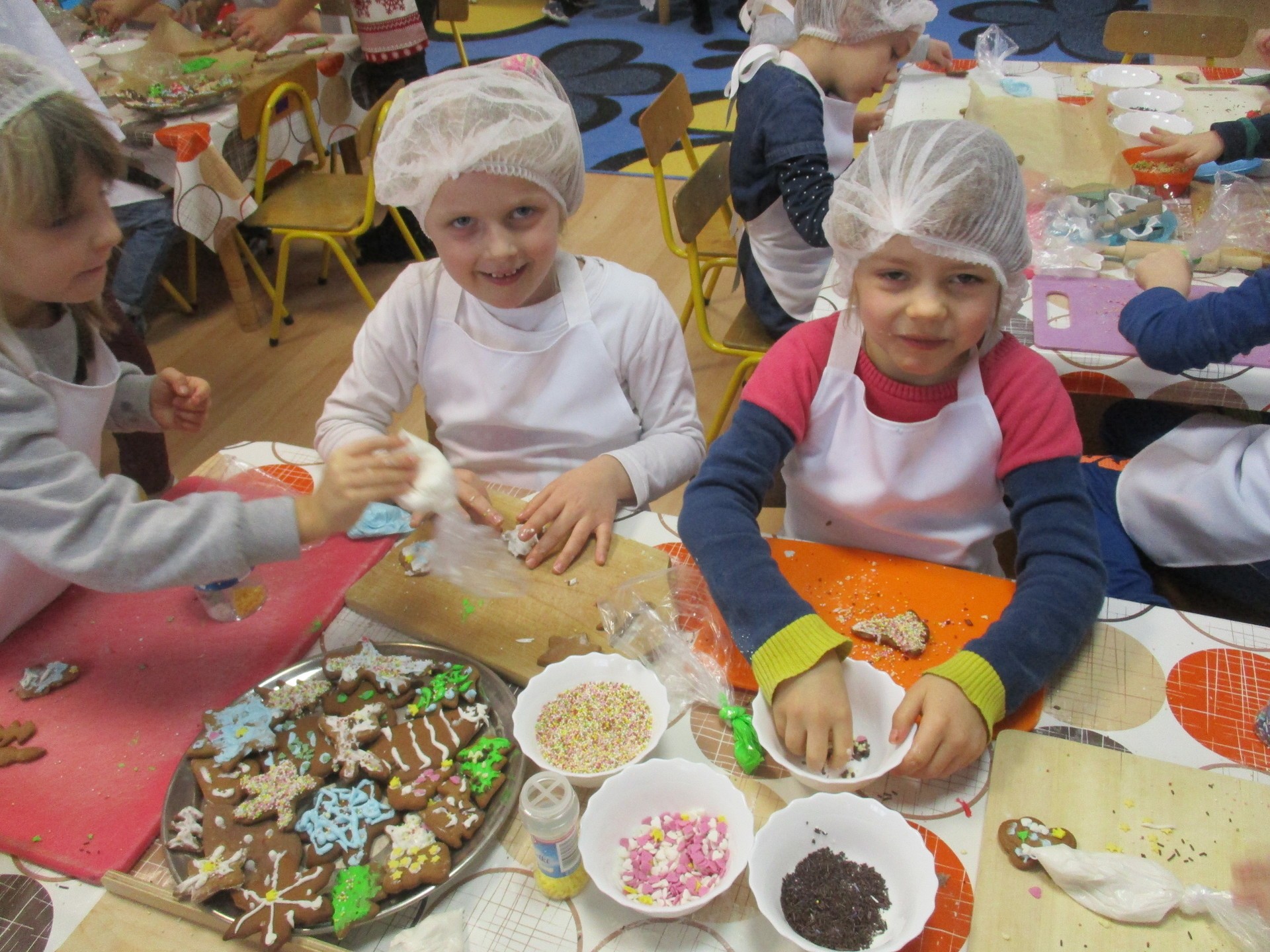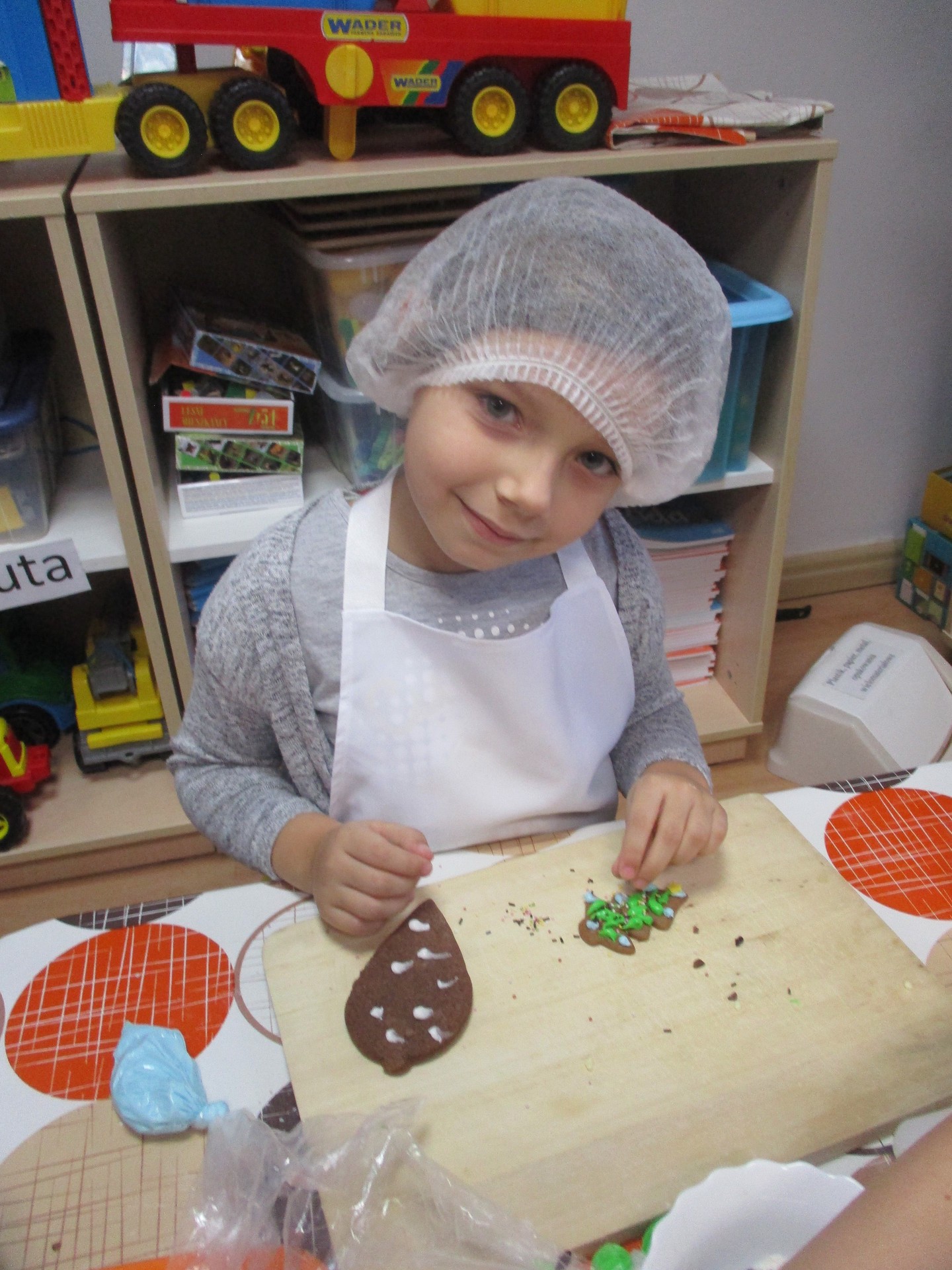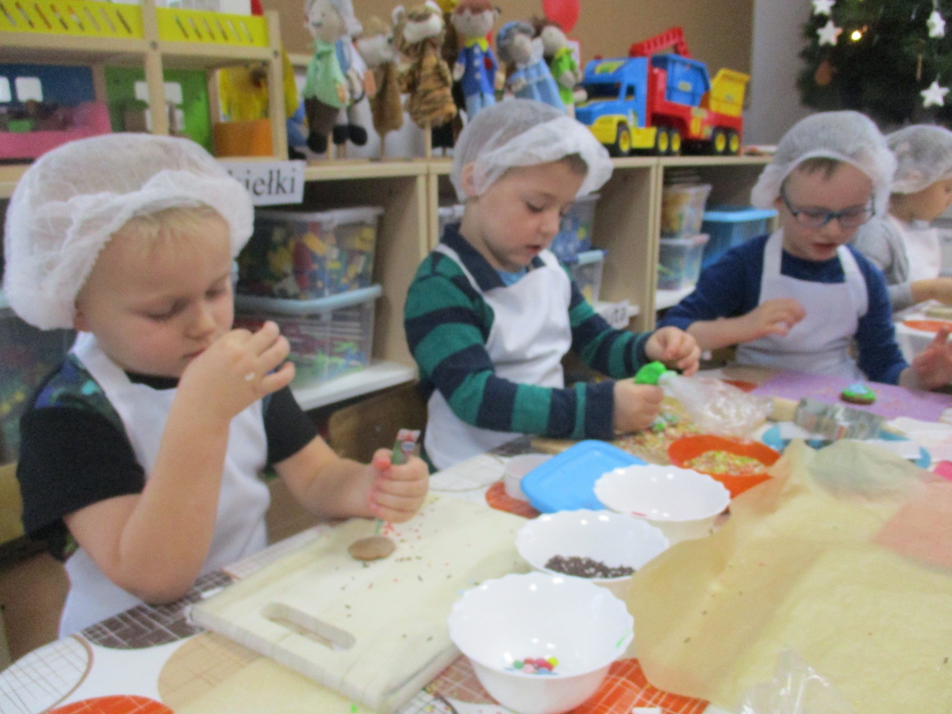 17 grudnia dla dzieci był bardzo pracowity dzień , bowiem tego dnia piekły one pierniczki. Najpierw odpowiednio się przygotowały dbając o czyste rączki oraz zakładając fartuszki. Poznały też składniki i sposób wykonania ciasta, potrzebne przybory kuchenne a także zasady bezpieczeństwa. Gdy wszystko było gotowe przedszkolaki z ogromnym zapałem i zaangażowaniem zabrały się do pracy – wałkowały ciasto, wykrawały ciasteczka. Efektem naszej pracy były pełne blaszki pierniczków, które zanieśliśmy do kuchni. Tu pod czujnym okiem naszych pań kuchareczek pierniki nabierały koloru piekąc się w piekarniku. Na koniec dzieci z wielką chęcią zdobiły pierniczki.
