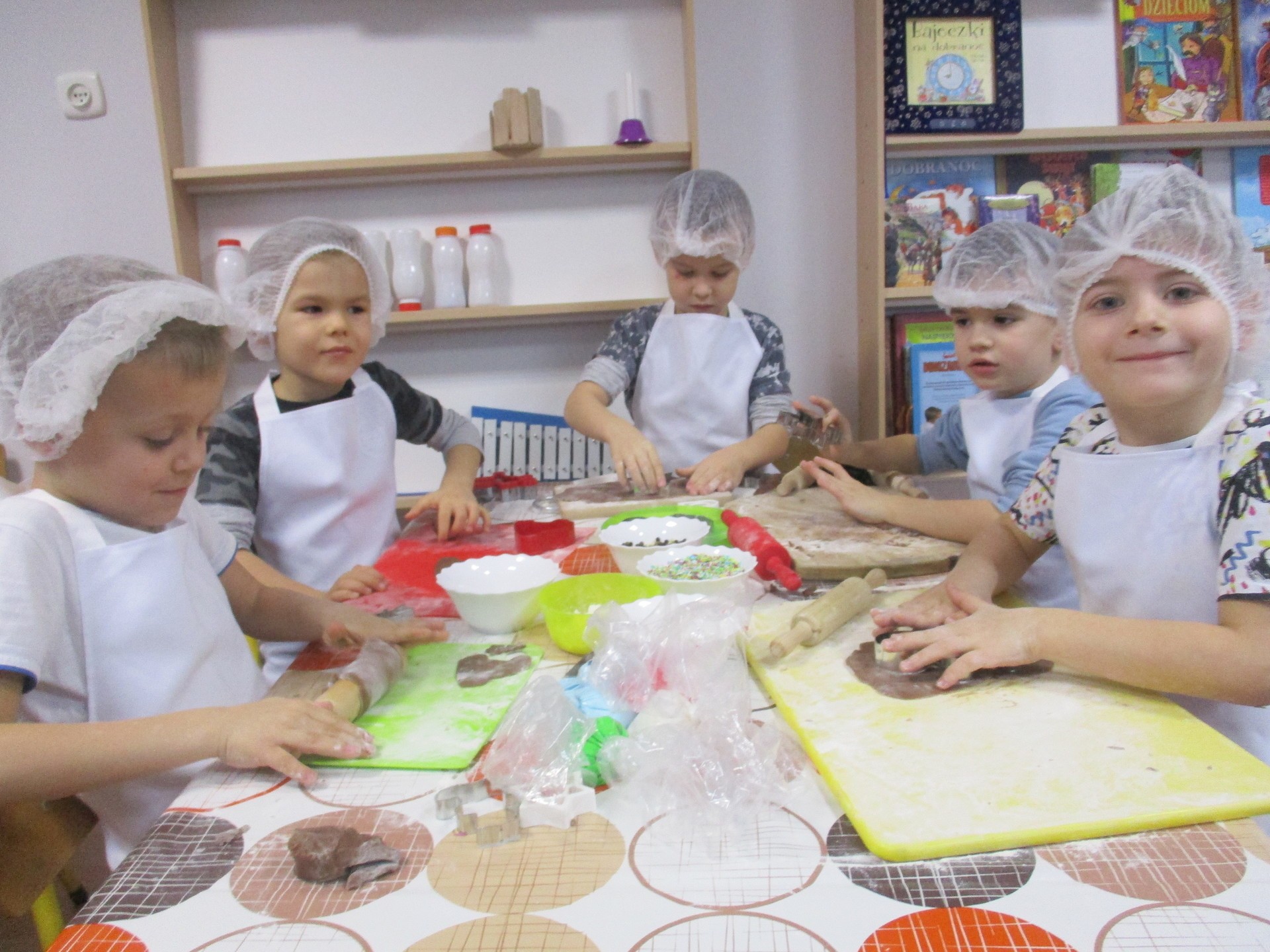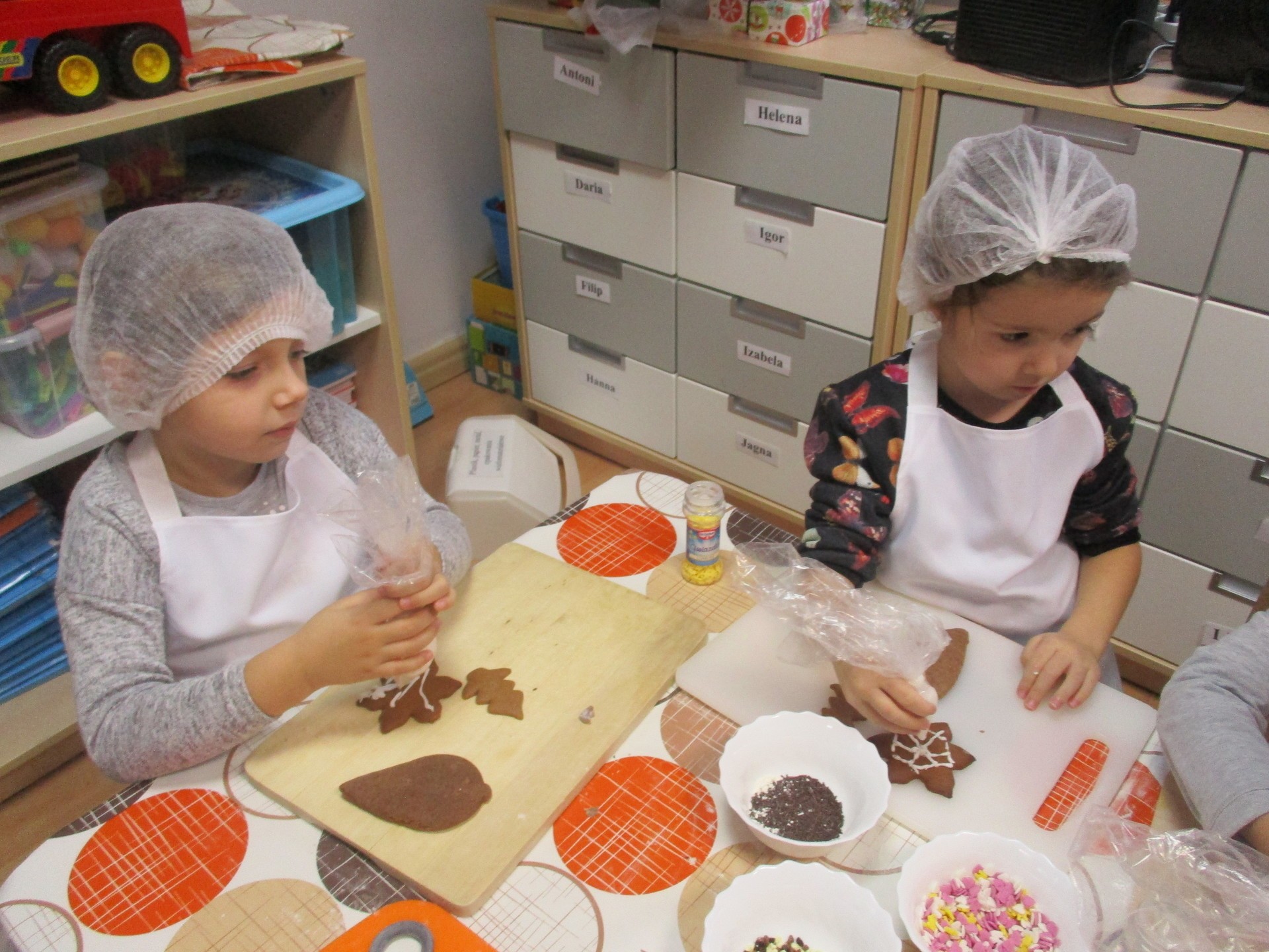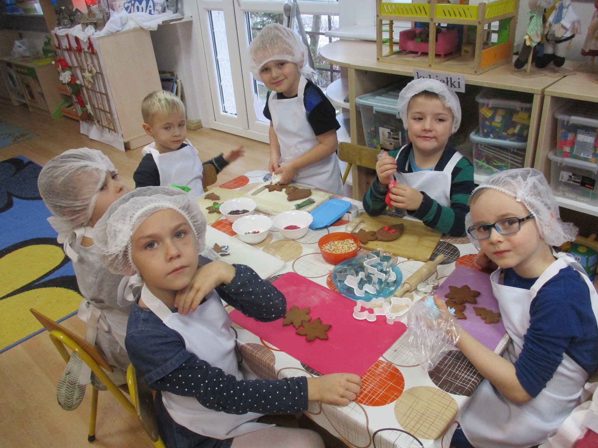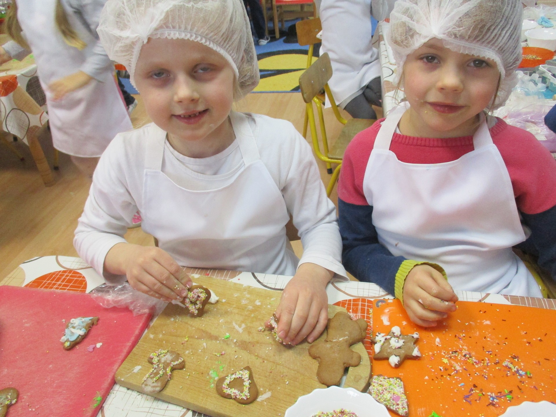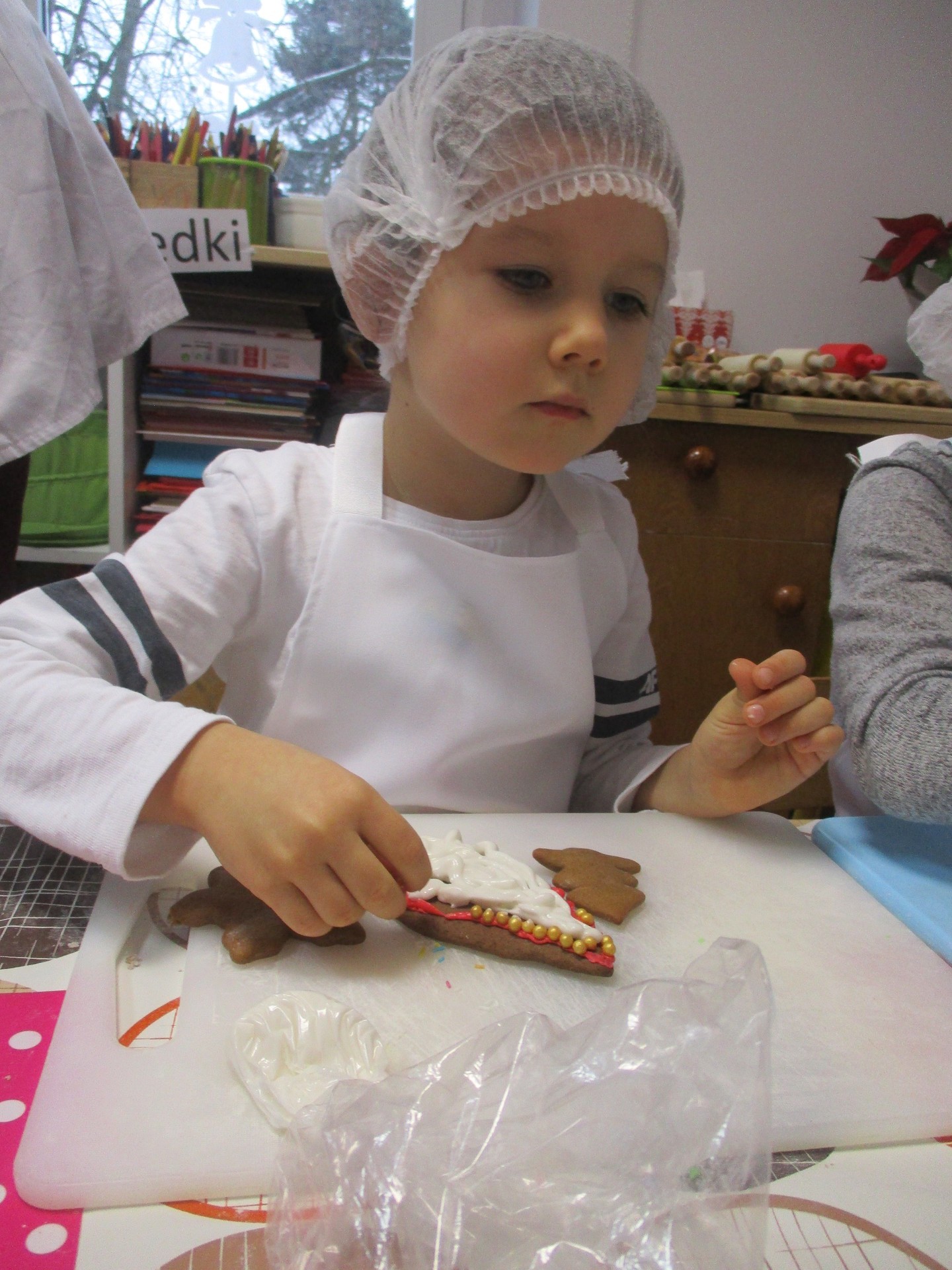 17 grudnia dla dzieci był bardzo pracowity dzień , bowiem tego dnia piekły one pierniczki. Najpierw odpowiednio się przygotowały dbając o czyste rączki oraz zakładając fartuszki. Poznały też składniki i sposób wykonania ciasta, potrzebne przybory kuchenne a także zasady bezpieczeństwa. Gdy wszystko było gotowe przedszkolaki z ogromnym zapałem i zaangażowaniem zabrały się do pracy – wałkowały ciasto, wykrawały ciasteczka. Efektem naszej pracy były pełne blaszki pierniczków, które zanieśliśmy do kuchni. Tu pod czujnym okiem naszych pań kuchareczek pierniki nabierały koloru piekąc się w piekarniku. Na koniec dzieci z wielką chęcią zdobiły pierniczki.