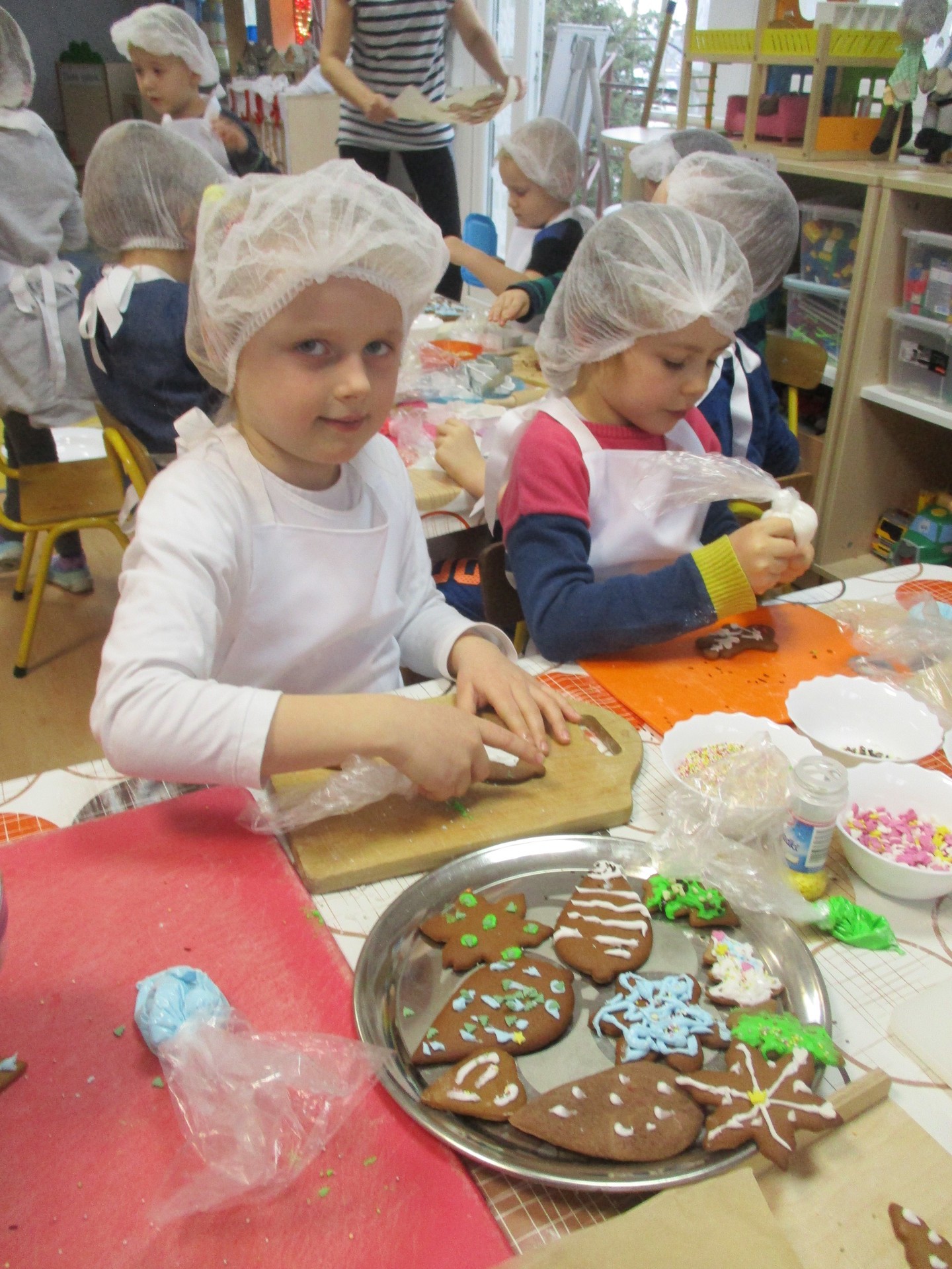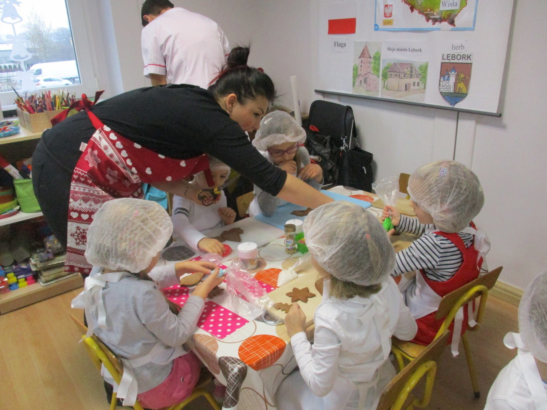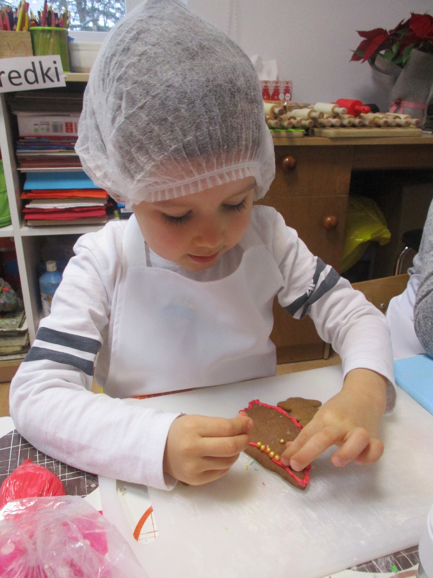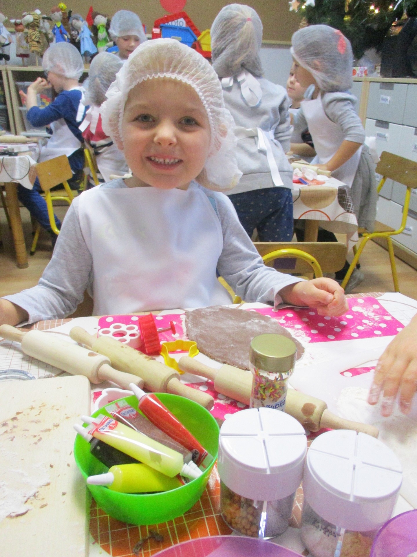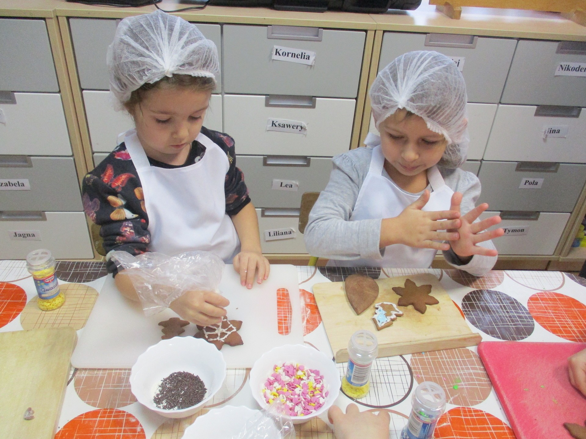 17 grudnia dla dzieci był bardzo pracowity dzień , bowiem tego dnia piekły one pierniczki. Najpierw odpowiednio się przygotowały dbając o czyste rączki oraz zakładając fartuszki. Poznały też składniki i sposób wykonania ciasta, potrzebne przybory kuchenne a także zasady bezpieczeństwa. Gdy wszystko było gotowe przedszkolaki z ogromnym zapałem i zaangażowaniem zabrały się do pracy – wałkowały ciasto, wykrawały ciasteczka. Efektem naszej pracy były pełne blaszki pierniczków, które zanieśliśmy do kuchni. Tu pod czujnym okiem naszych pań kuchareczek pierniki nabierały koloru piekąc się w piekarniku. Na koniec dzieci z wielką chęcią zdobiły pierniczki.