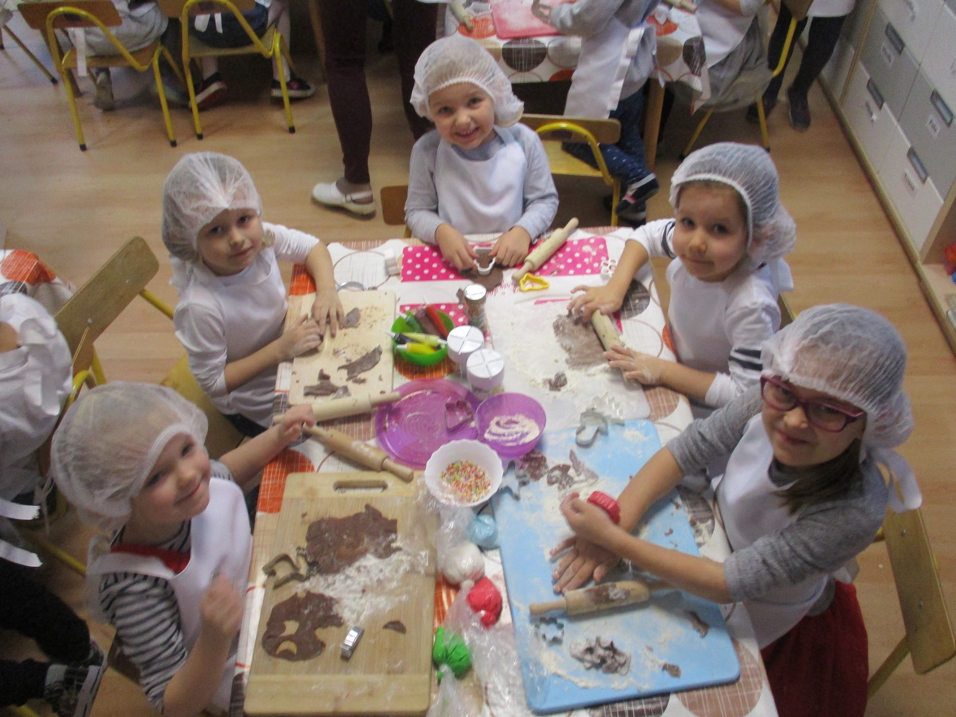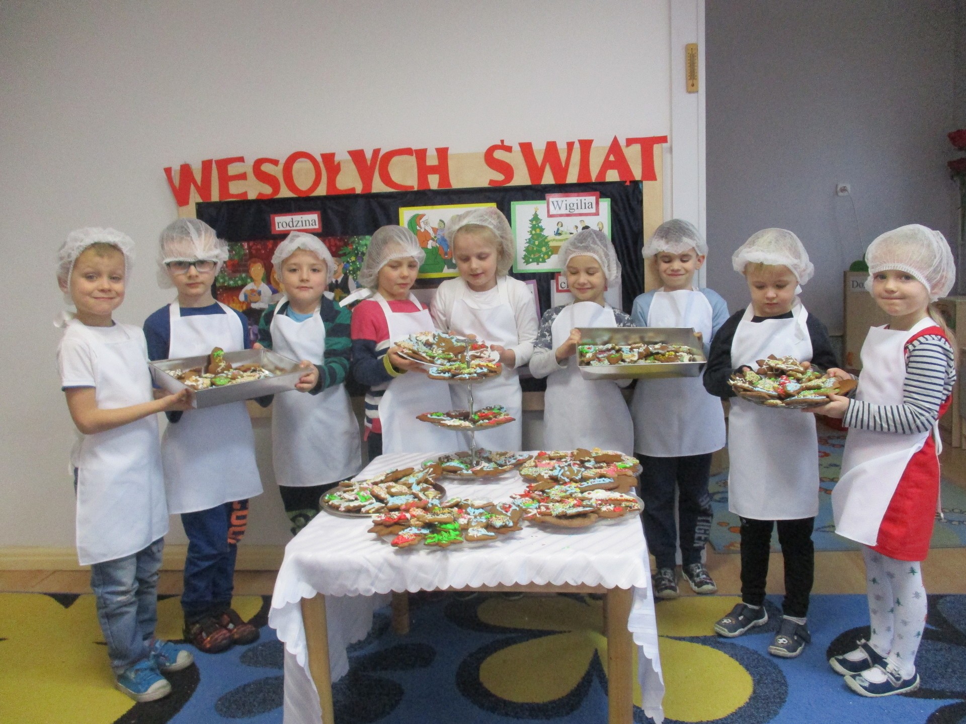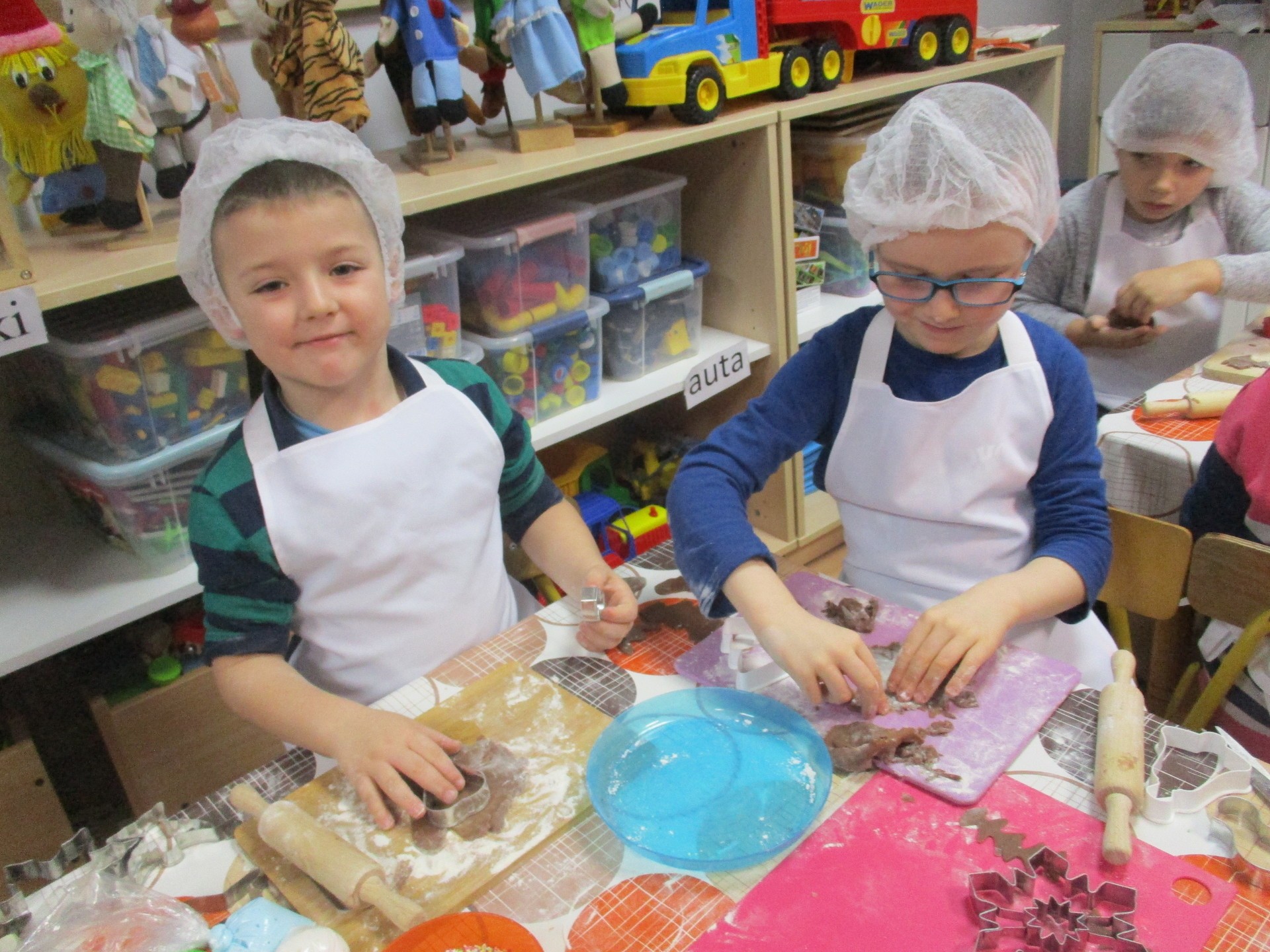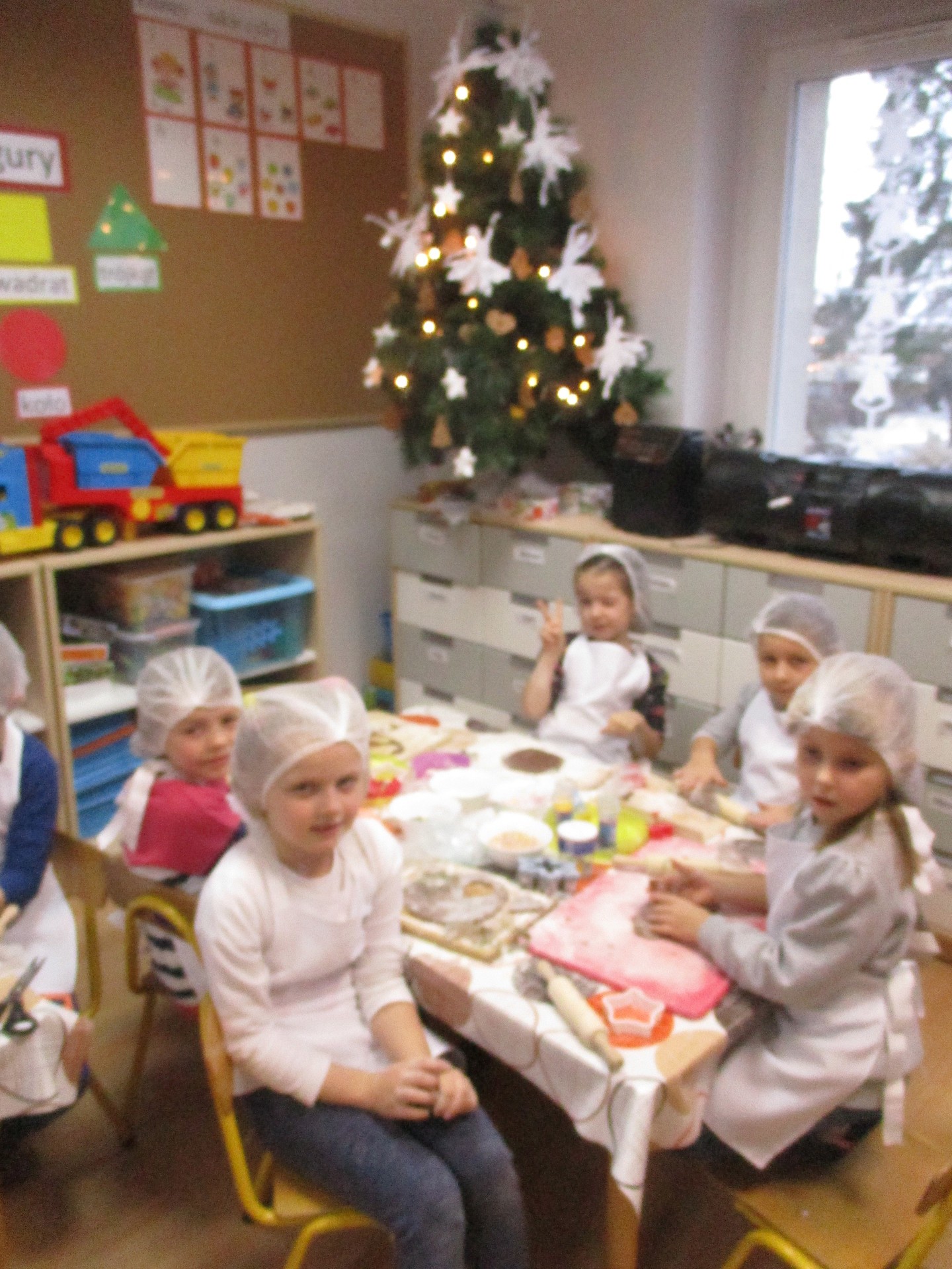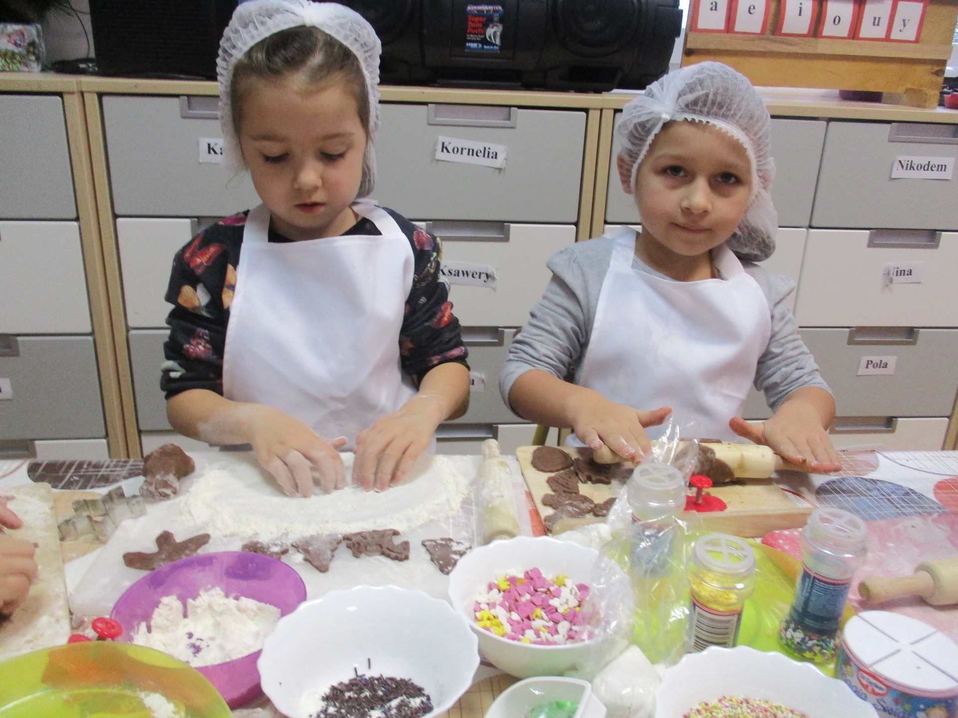 17 grudnia dla dzieci był bardzo pracowity dzień , bowiem tego dnia piekły one pierniczki. Najpierw odpowiednio się przygotowały dbając o czyste rączki oraz zakładając fartuszki. Poznały też składniki i sposób wykonania ciasta, potrzebne przybory kuchenne a także zasady bezpieczeństwa. Gdy wszystko było gotowe przedszkolaki z ogromnym zapałem i zaangażowaniem zabrały się do pracy – wałkowały ciasto, wykrawały ciasteczka. Efektem naszej pracy były pełne blaszki pierniczków, które zanieśliśmy do kuchni. Tu pod czujnym okiem naszych pań kuchareczek pierniki nabierały koloru piekąc się w piekarniku. Na koniec dzieci z wielką chęcią zdobiły pierniczki.