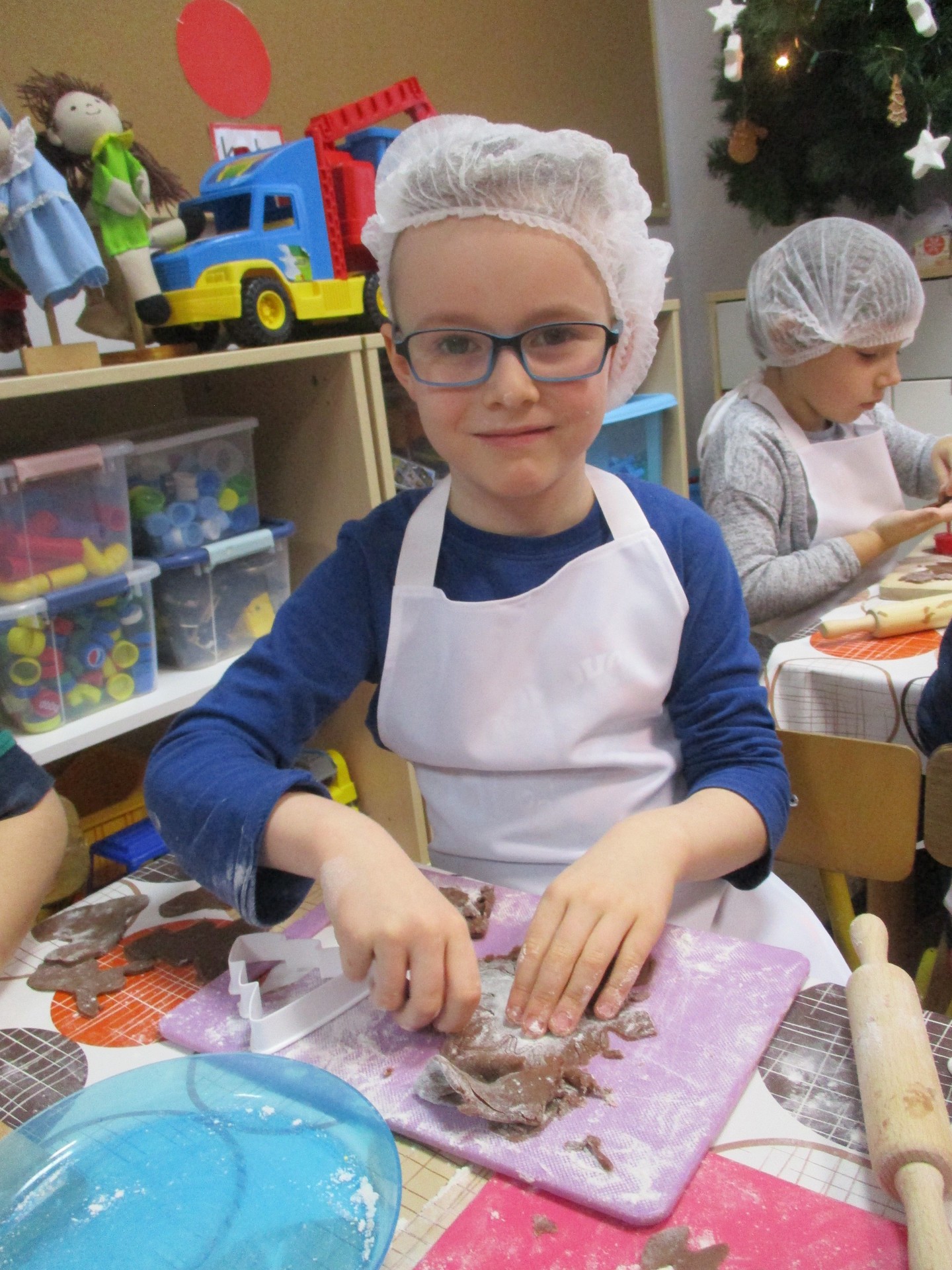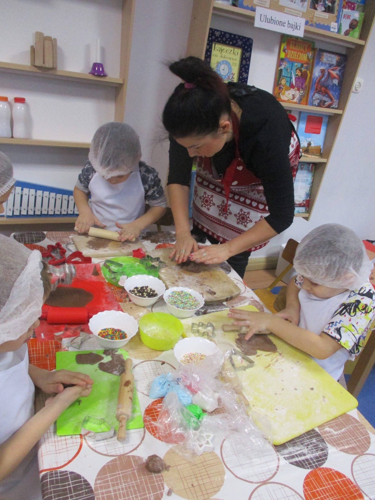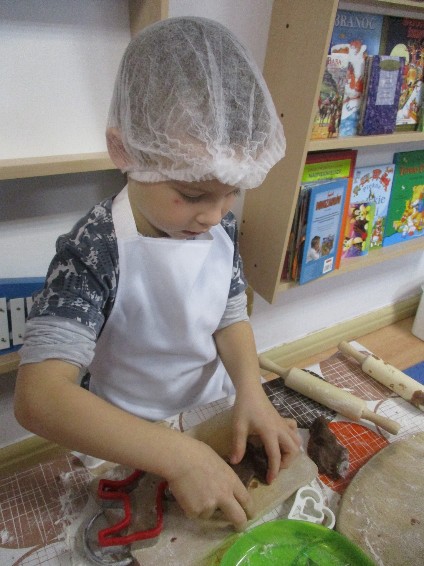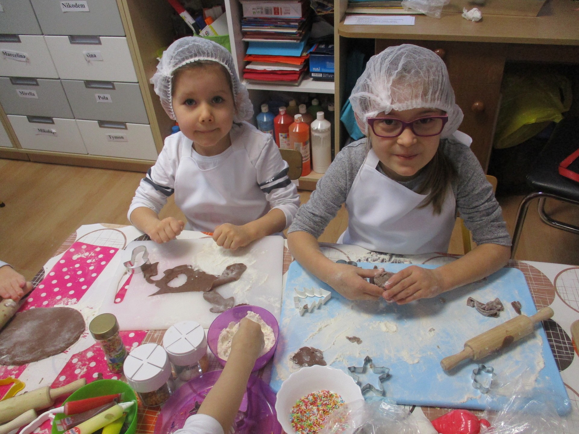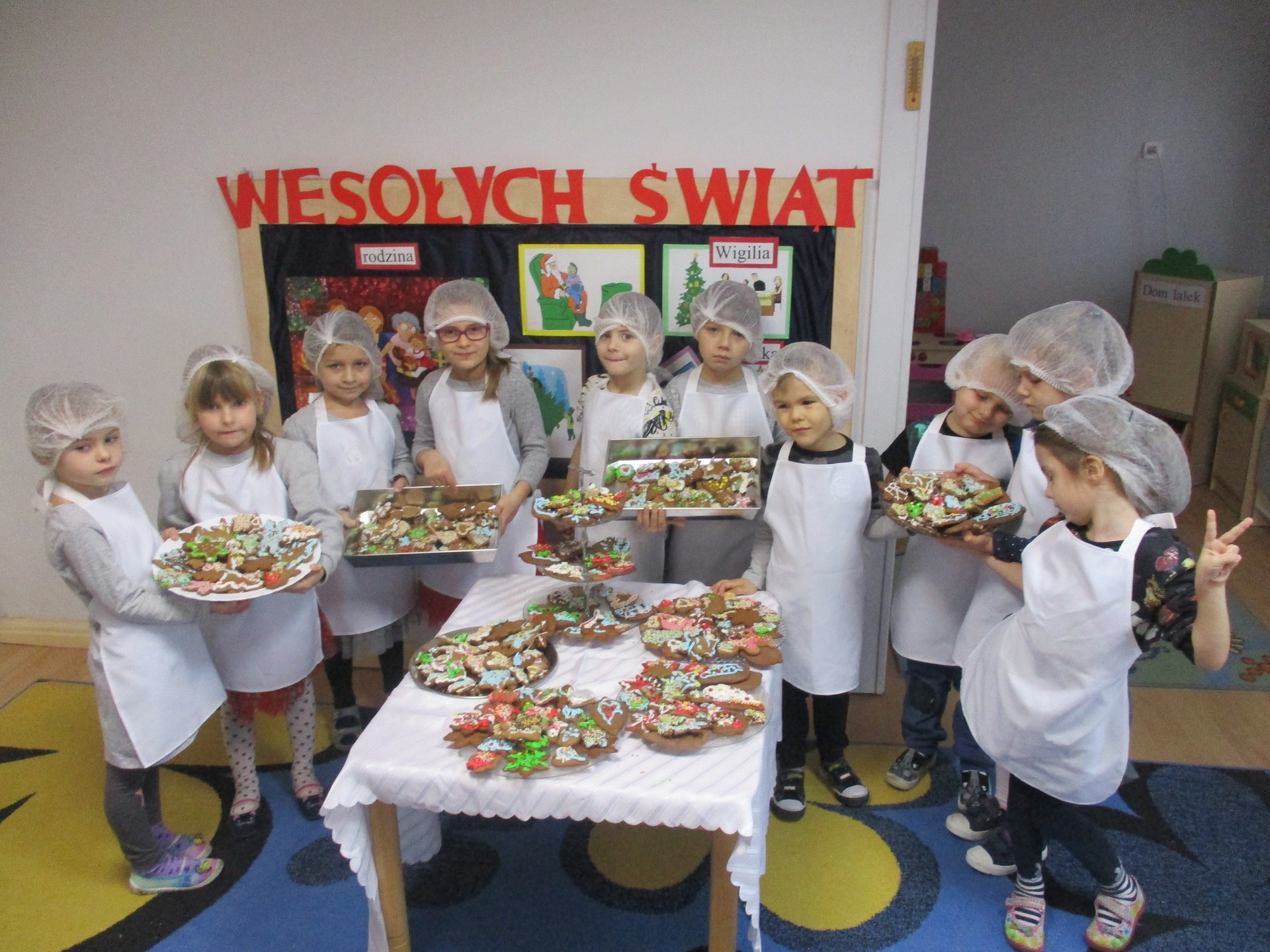 17 grudnia dla dzieci był bardzo pracowity dzień , bowiem tego dnia piekły one pierniczki. Najpierw odpowiednio się przygotowały dbając o czyste rączki oraz zakładając fartuszki. Poznały też składniki i sposób wykonania ciasta, potrzebne przybory kuchenne a także zasady bezpieczeństwa. Gdy wszystko było gotowe przedszkolaki z ogromnym zapałem i zaangażowaniem zabrały się do pracy – wałkowały ciasto, wykrawały ciasteczka. Efektem naszej pracy były pełne blaszki pierniczków, które zanieśliśmy do kuchni. Tu pod czujnym okiem naszych pań kuchareczek pierniki nabierały koloru piekąc się w piekarniku. Na koniec dzieci z wielką chęcią zdobiły pierniczki.