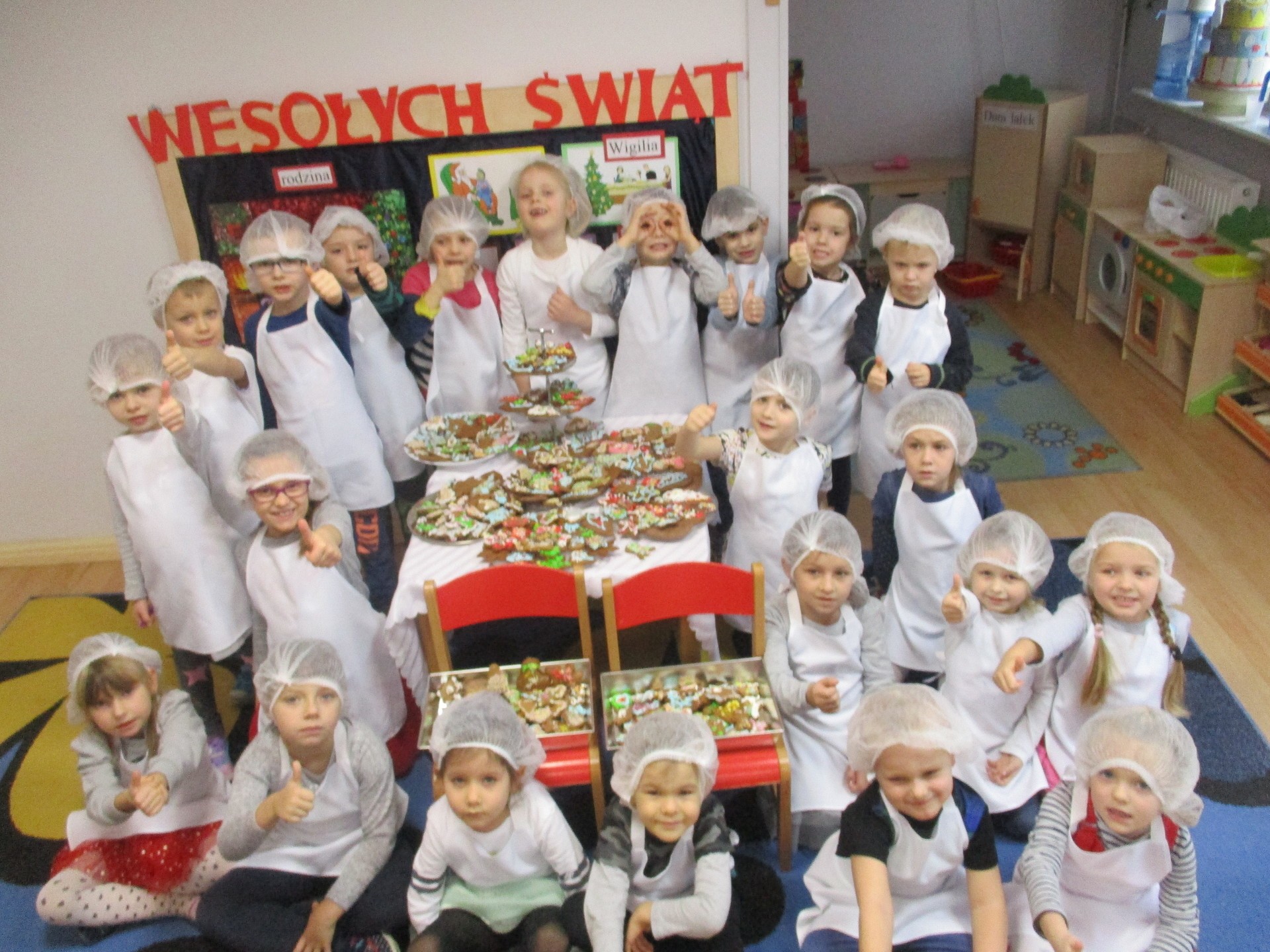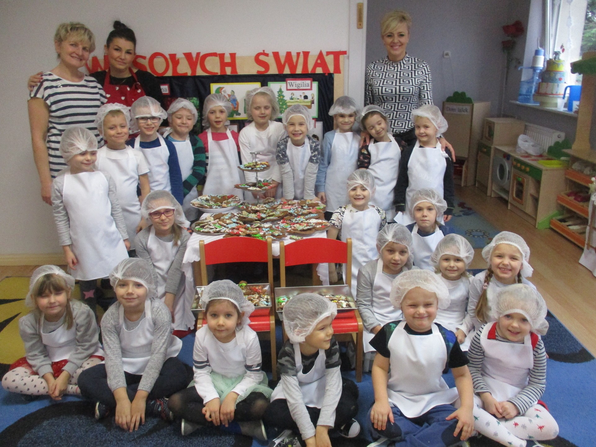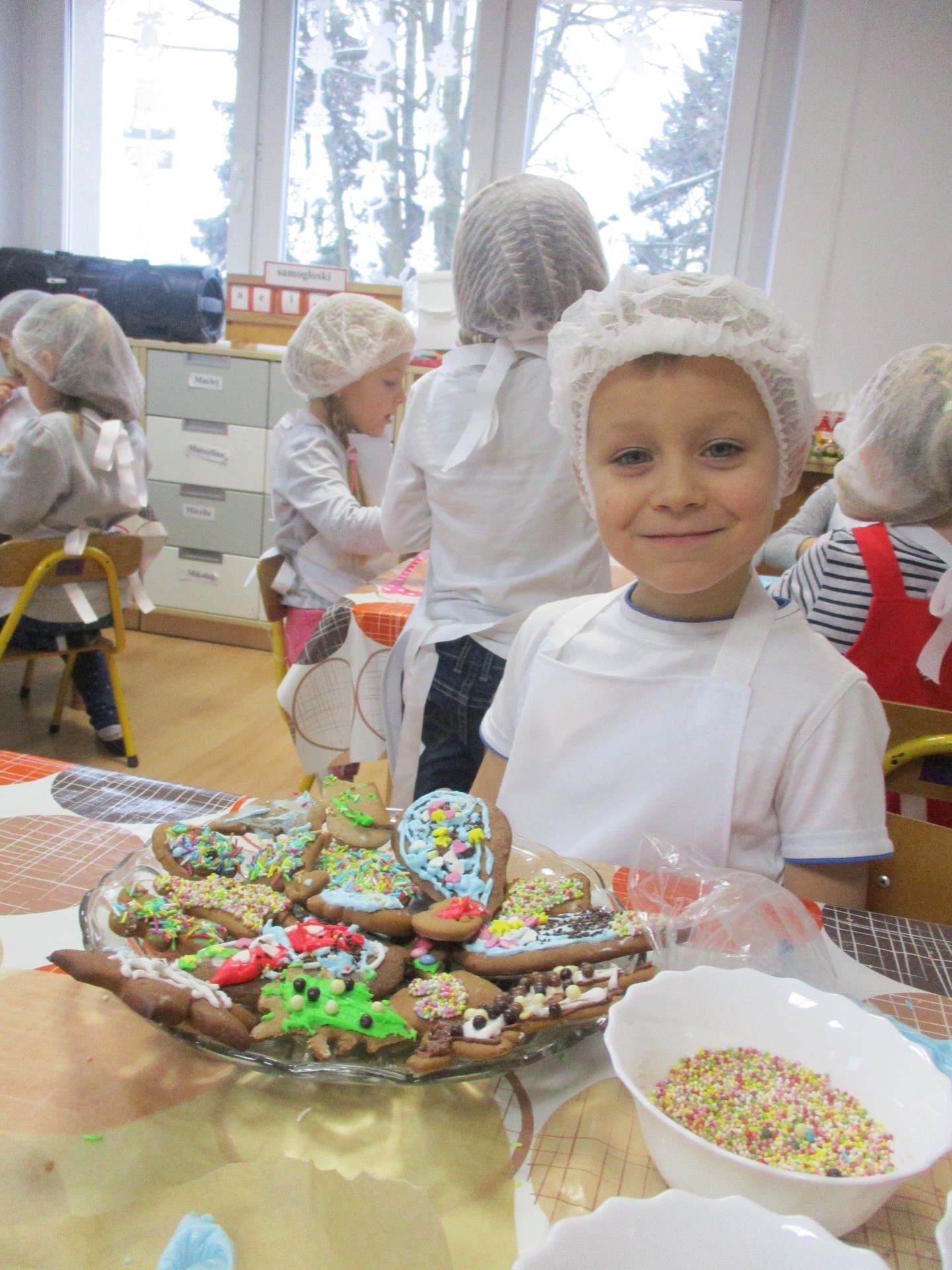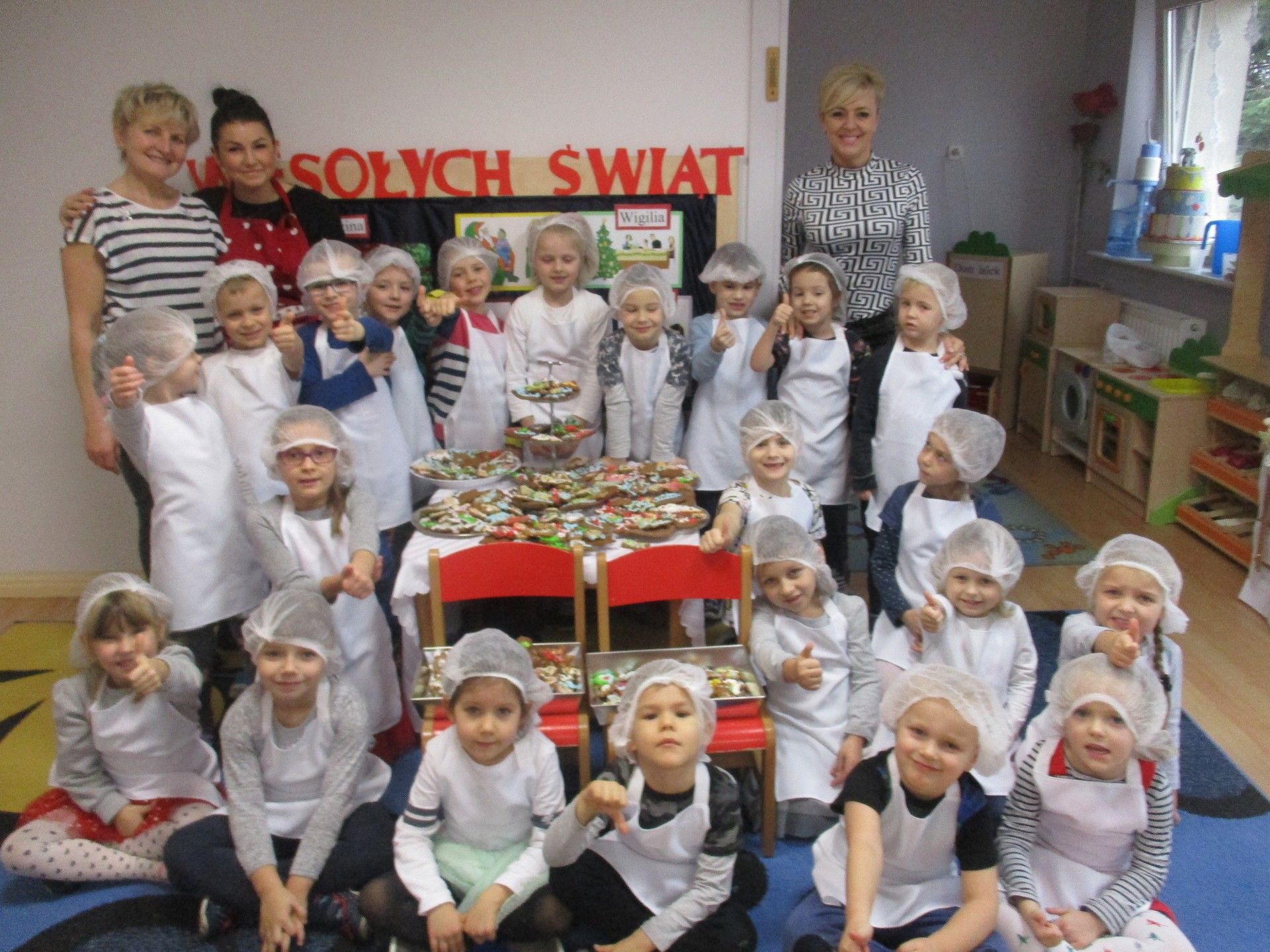 17 grudnia dla dzieci był bardzo pracowity dzień , bowiem tego dnia piekły one pierniczki. Najpierw odpowiednio się przygotowały dbając o czyste rączki oraz zakładając fartuszki. Poznały też składniki i sposób wykonania ciasta, potrzebne przybory kuchenne a także zasady bezpieczeństwa. Gdy wszystko było gotowe przedszkolaki z ogromnym zapałem i zaangażowaniem zabrały się do pracy – wałkowały ciasto, wykrawały ciasteczka. Efektem naszej pracy były pełne blaszki pierniczków, które zanieśliśmy do kuchni. Tu pod czujnym okiem naszych pań kuchareczek pierniki nabierały koloru piekąc się w piekarniku. Na koniec dzieci z wielką chęcią zdobiły pierniczki.