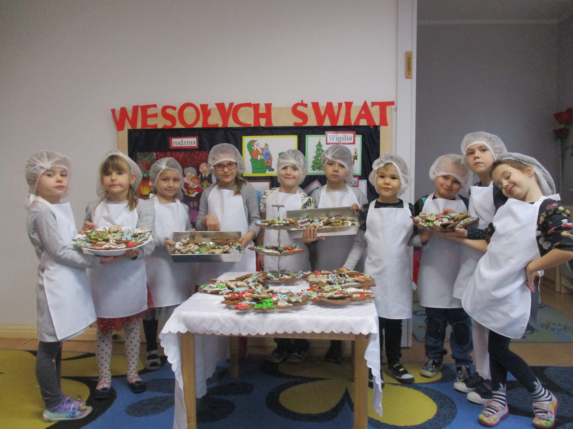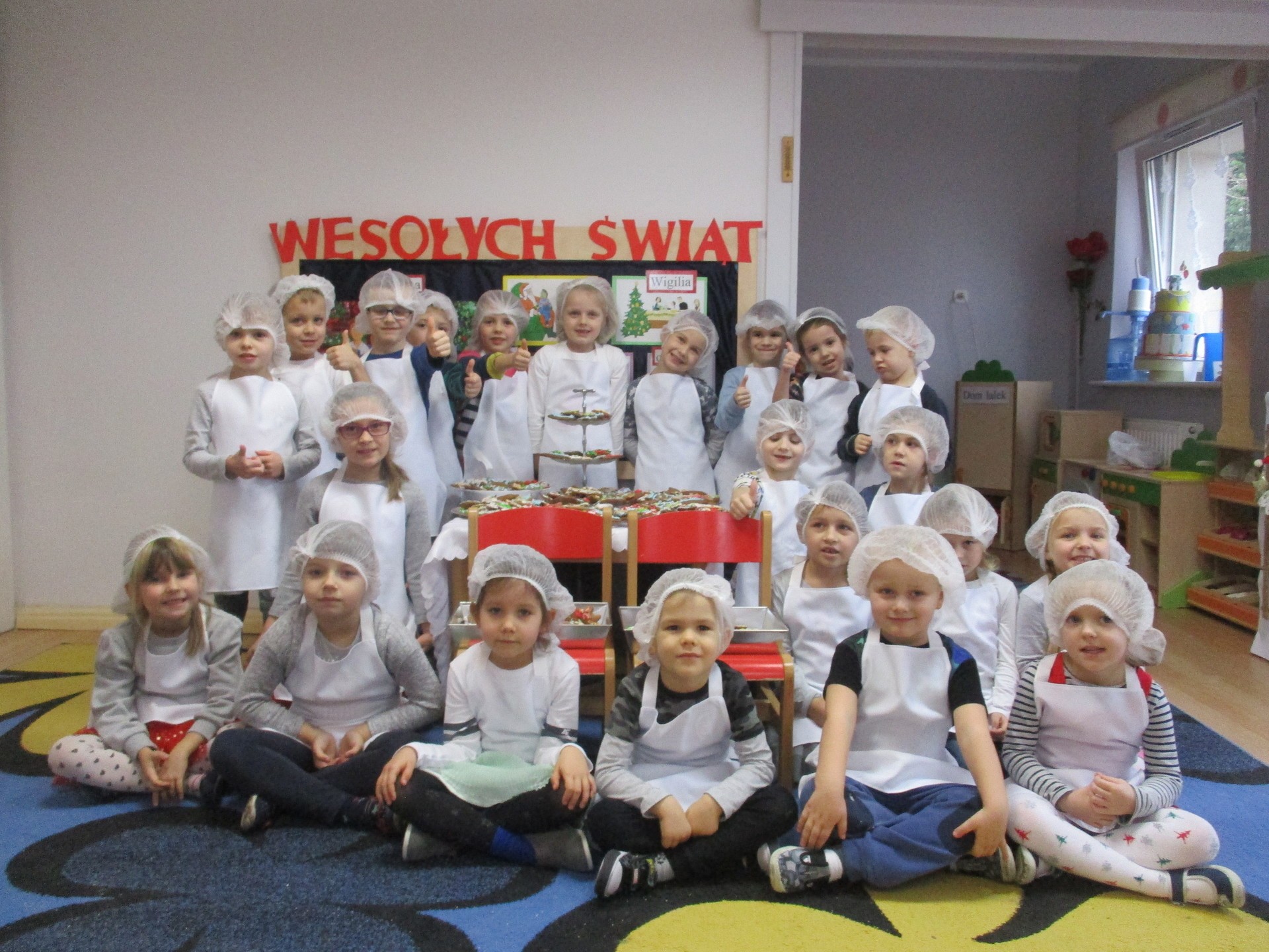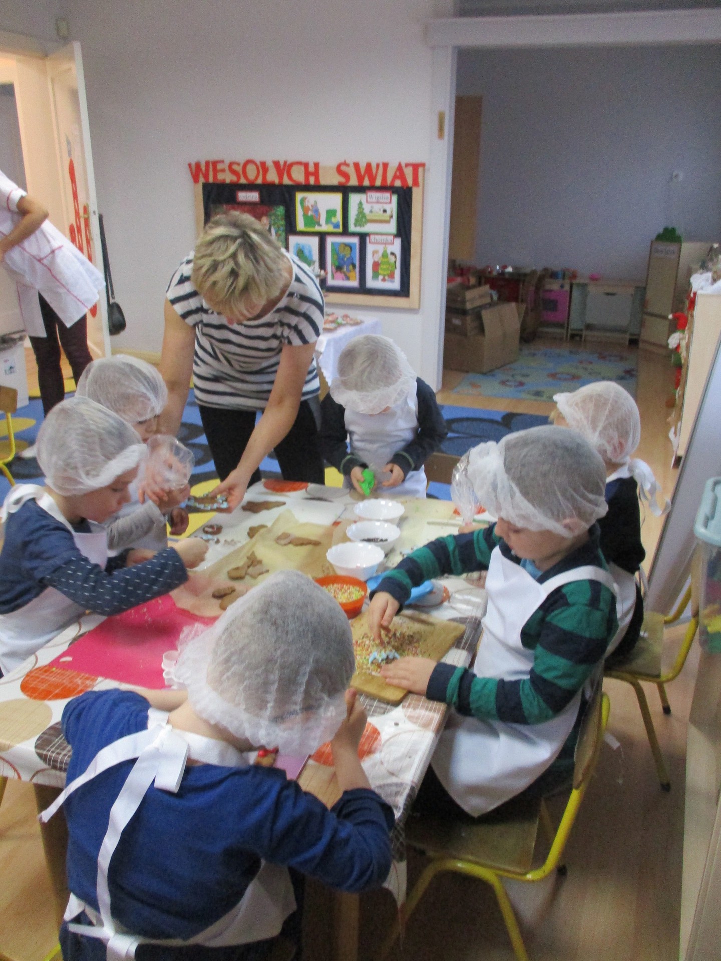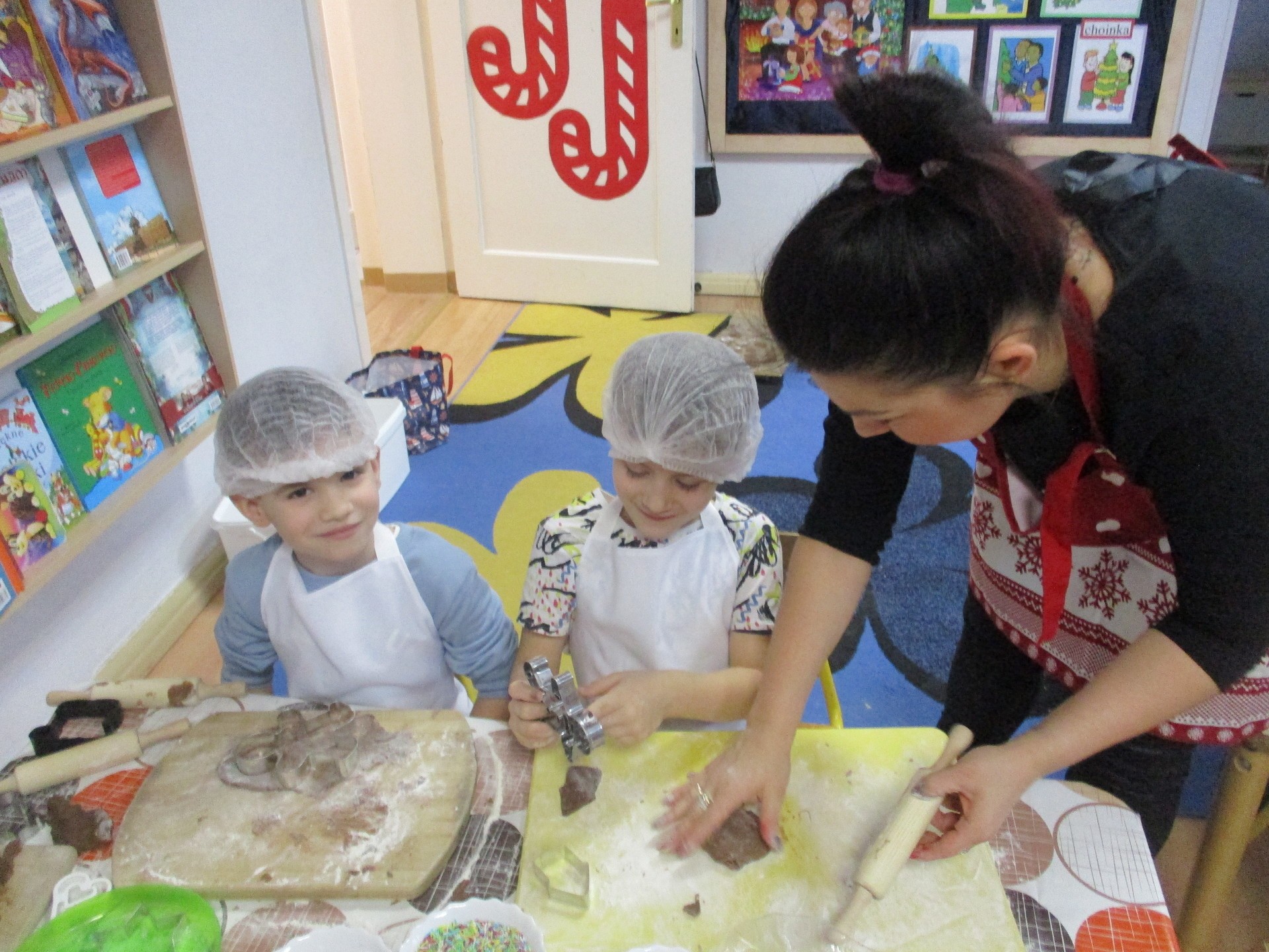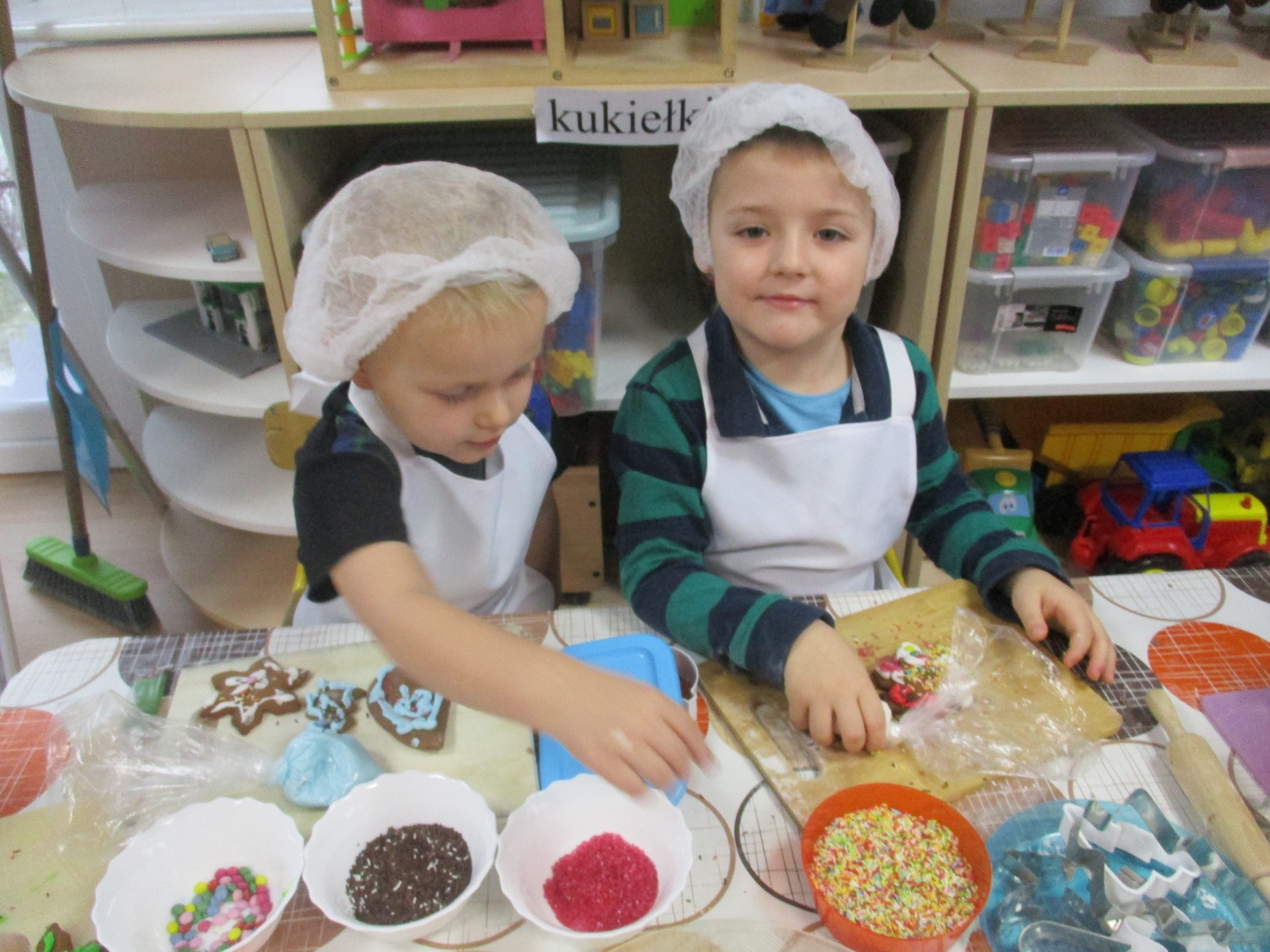 17 grudnia dla dzieci był bardzo pracowity dzień , bowiem tego dnia piekły one pierniczki. Najpierw odpowiednio się przygotowały dbając o czyste rączki oraz zakładając fartuszki. Poznały też składniki i sposób wykonania ciasta, potrzebne przybory kuchenne a także zasady bezpieczeństwa. Gdy wszystko było gotowe przedszkolaki z ogromnym zapałem i zaangażowaniem zabrały się do pracy – wałkowały ciasto, wykrawały ciasteczka. Efektem naszej pracy były pełne blaszki pierniczków, które zanieśliśmy do kuchni. Tu pod czujnym okiem naszych pań kuchareczek pierniki nabierały koloru piekąc się w piekarniku. Na koniec dzieci z wielką chęcią zdobiły pierniczki.