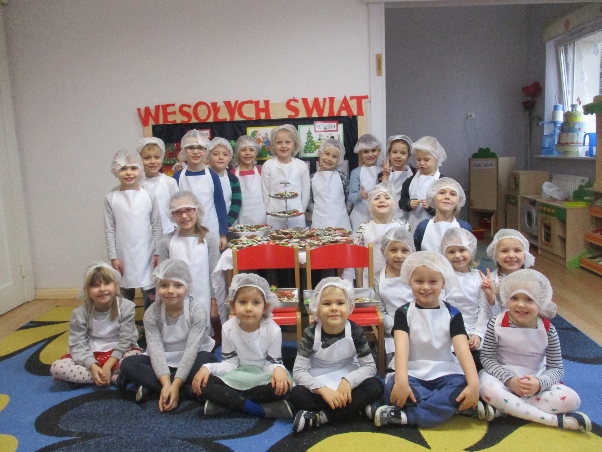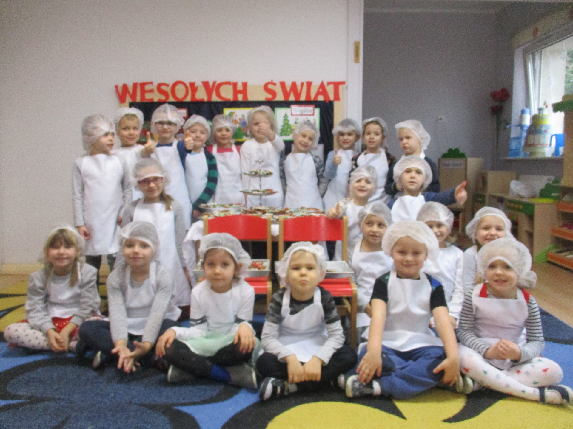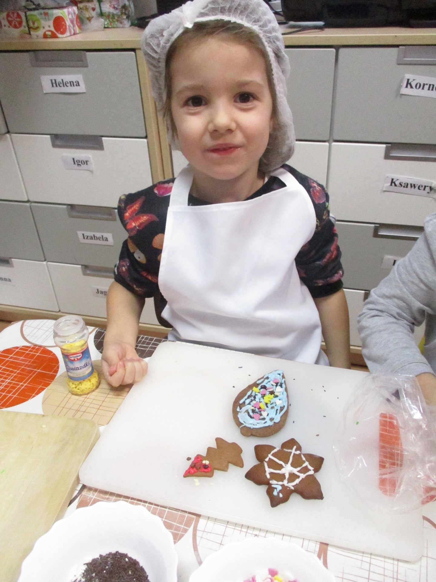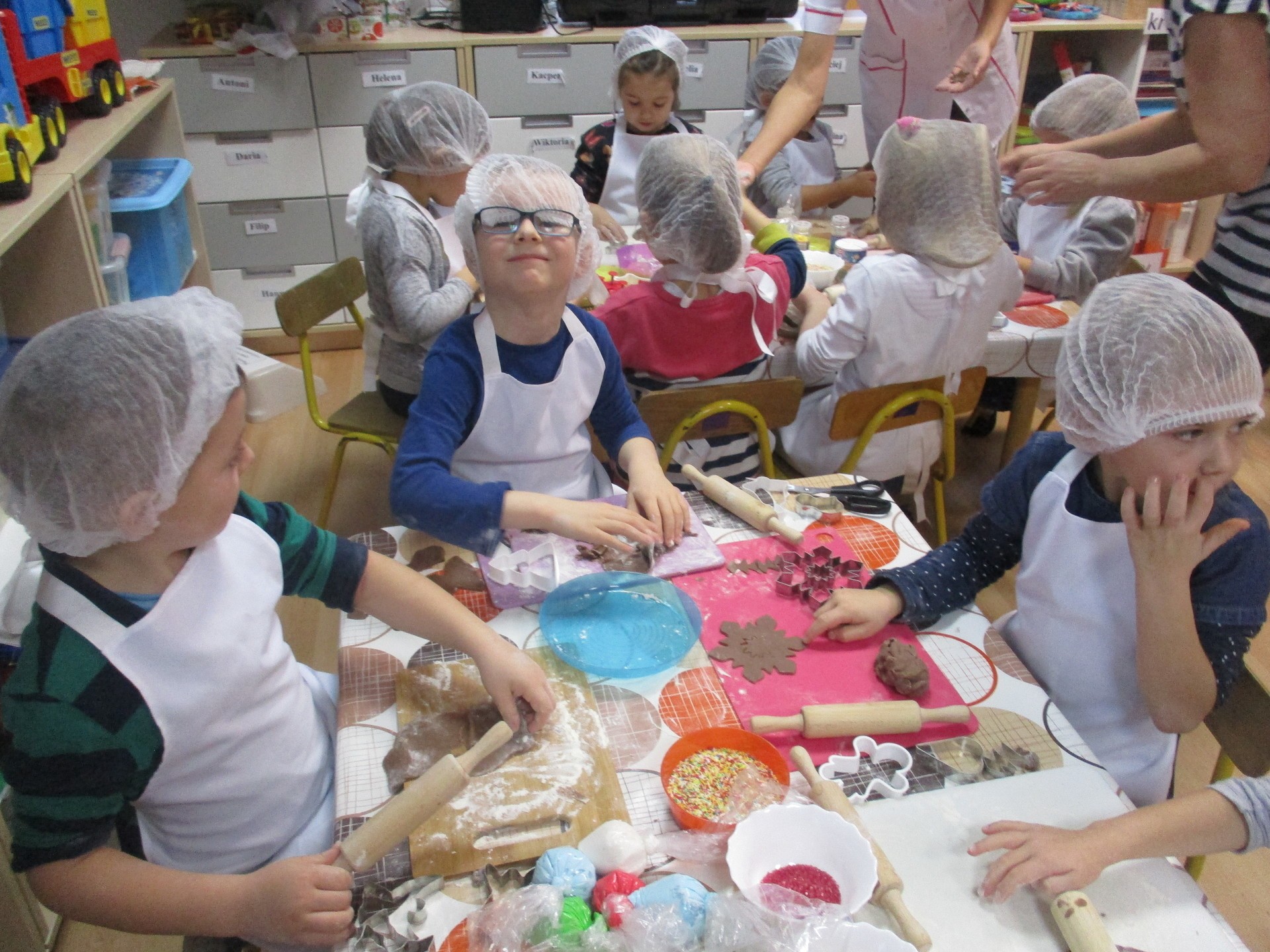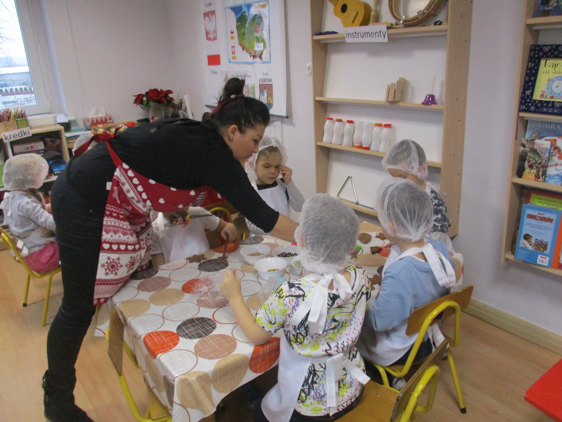 17 grudnia dla dzieci był bardzo pracowity dzień , bowiem tego dnia piekły one pierniczki. Najpierw odpowiednio się przygotowały dbając o czyste rączki oraz zakładając fartuszki. Poznały też składniki i sposób wykonania ciasta, potrzebne przybory kuchenne a także zasady bezpieczeństwa. Gdy wszystko było gotowe przedszkolaki z ogromnym zapałem i zaangażowaniem zabrały się do pracy – wałkowały ciasto, wykrawały ciasteczka. Efektem naszej pracy były pełne blaszki pierniczków, które zanieśliśmy do kuchni. Tu pod czujnym okiem naszych pań kuchareczek pierniki nabierały koloru piekąc się w piekarniku. Na koniec dzieci z wielką chęcią zdobiły pierniczki.