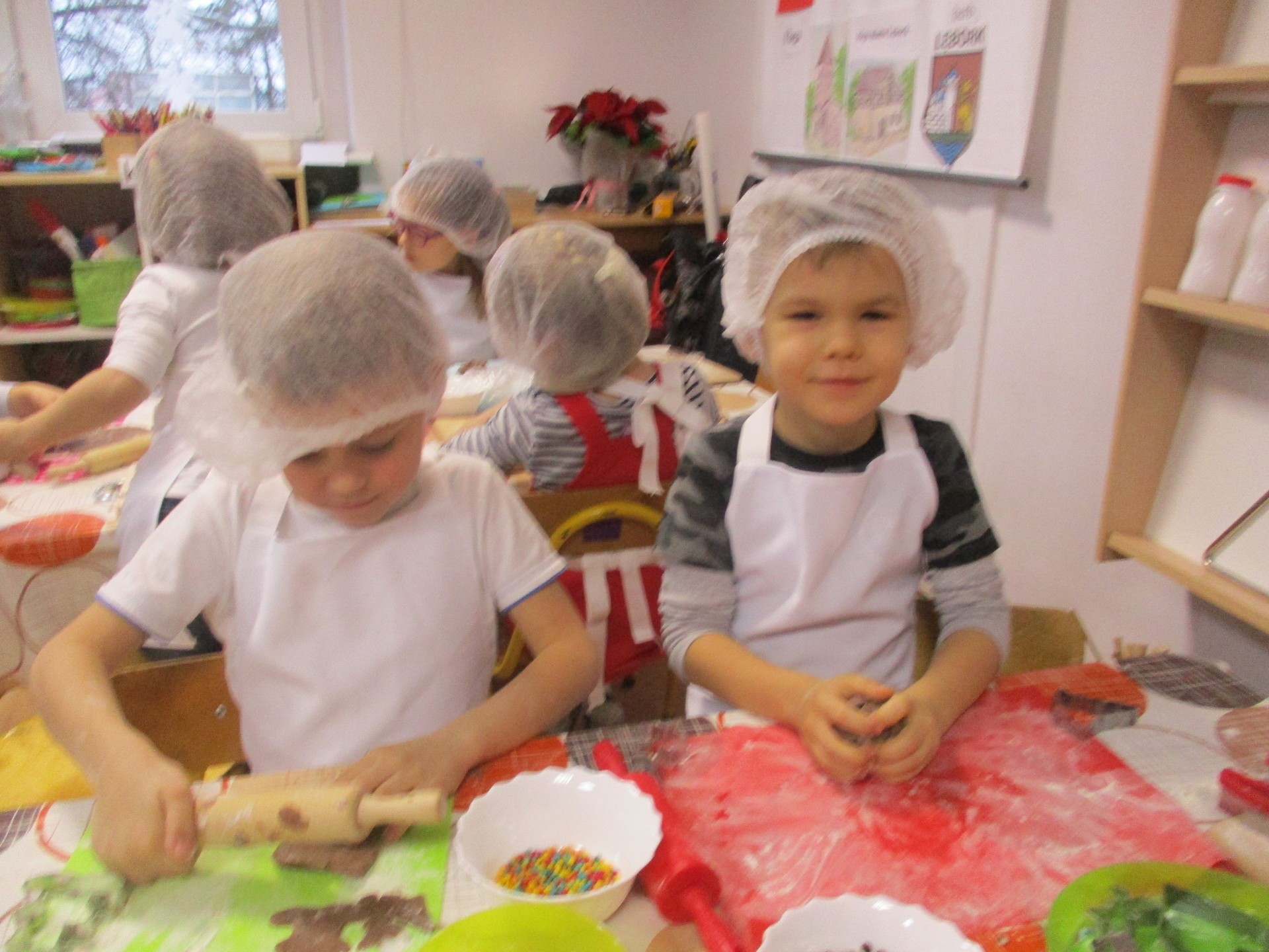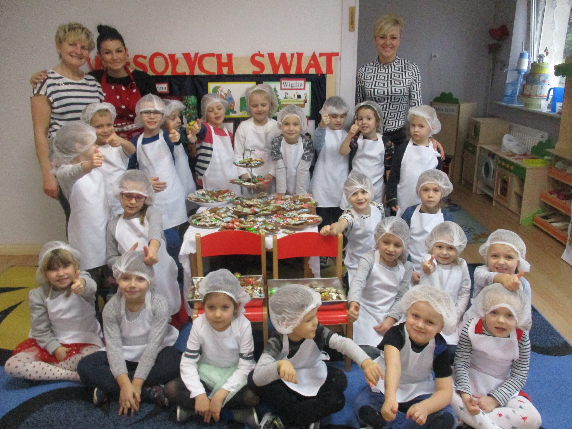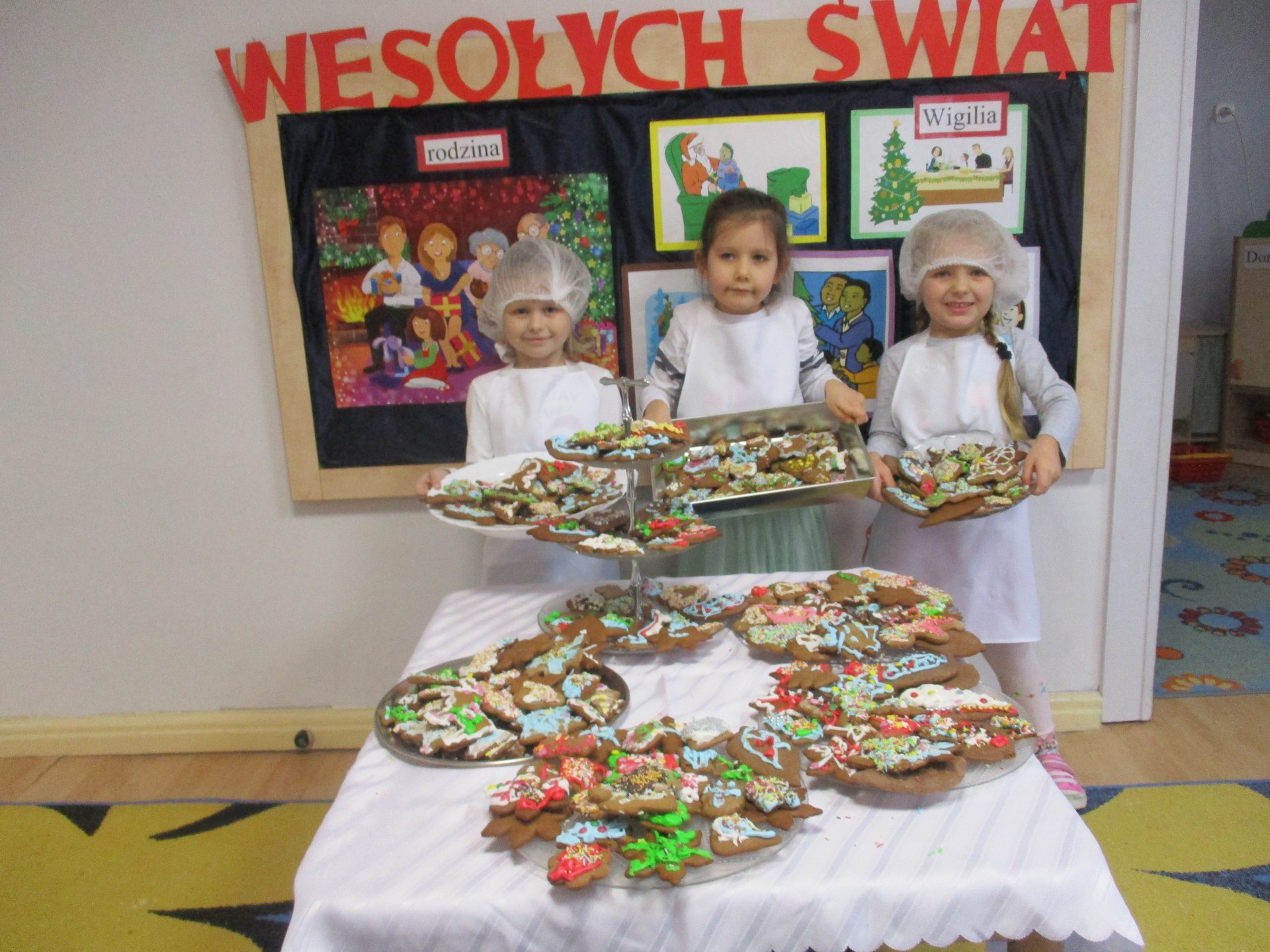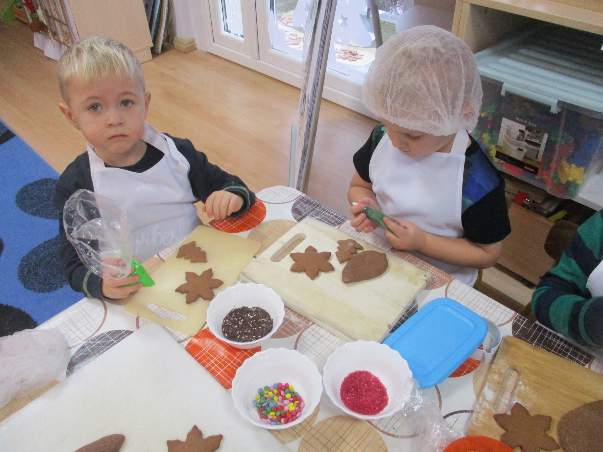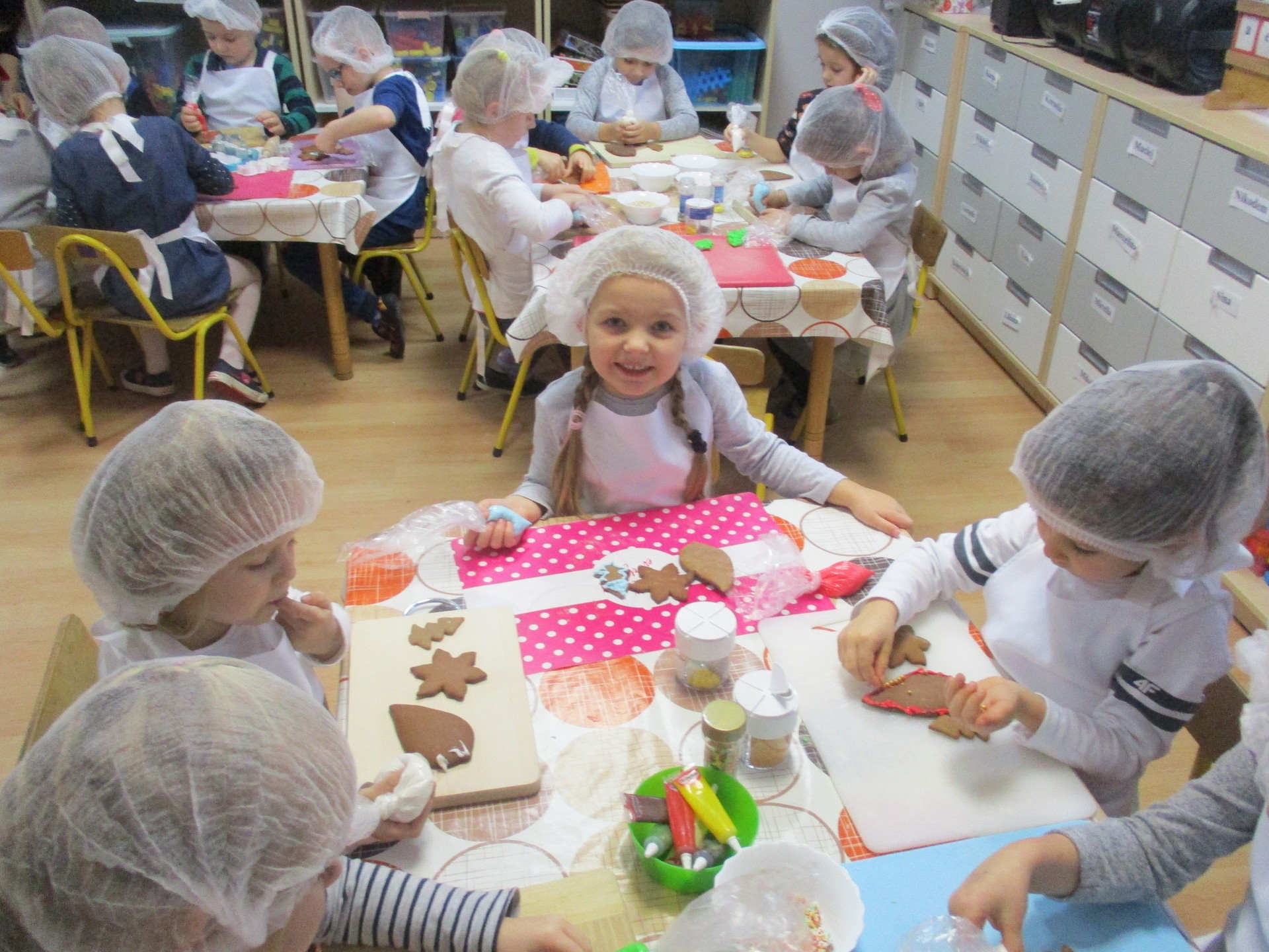 17 grudnia dla dzieci był bardzo pracowity dzień , bowiem tego dnia piekły one pierniczki. Najpierw odpowiednio się przygotowały dbając o czyste rączki oraz zakładając fartuszki. Poznały też składniki i sposób wykonania ciasta, potrzebne przybory kuchenne a także zasady bezpieczeństwa. Gdy wszystko było gotowe przedszkolaki z ogromnym zapałem i zaangażowaniem zabrały się do pracy – wałkowały ciasto, wykrawały ciasteczka. Efektem naszej pracy były pełne blaszki pierniczków, które zanieśliśmy do kuchni. Tu pod czujnym okiem naszych pań kuchareczek pierniki nabierały koloru piekąc się w piekarniku. Na koniec dzieci z wielką chęcią zdobiły pierniczki.