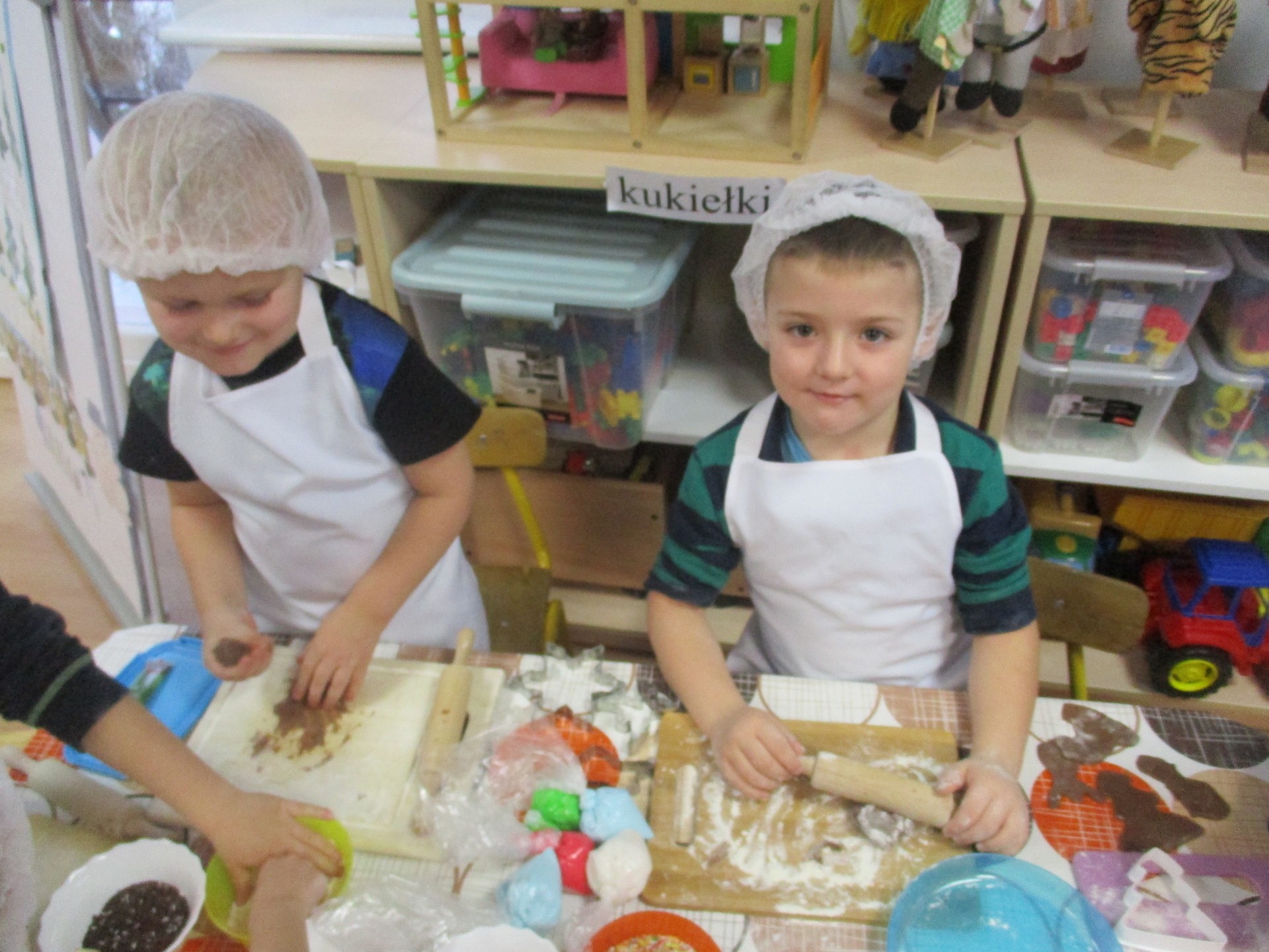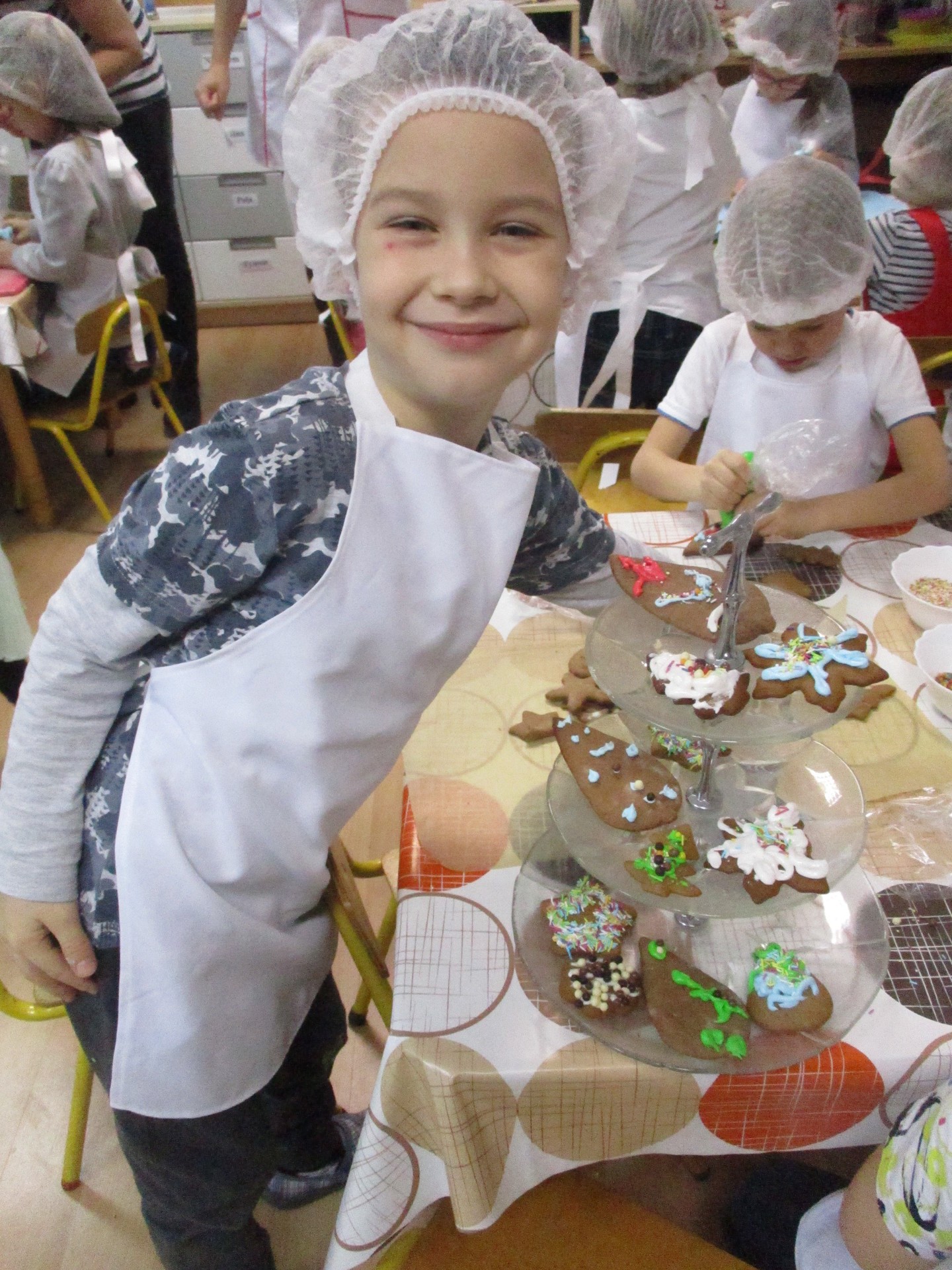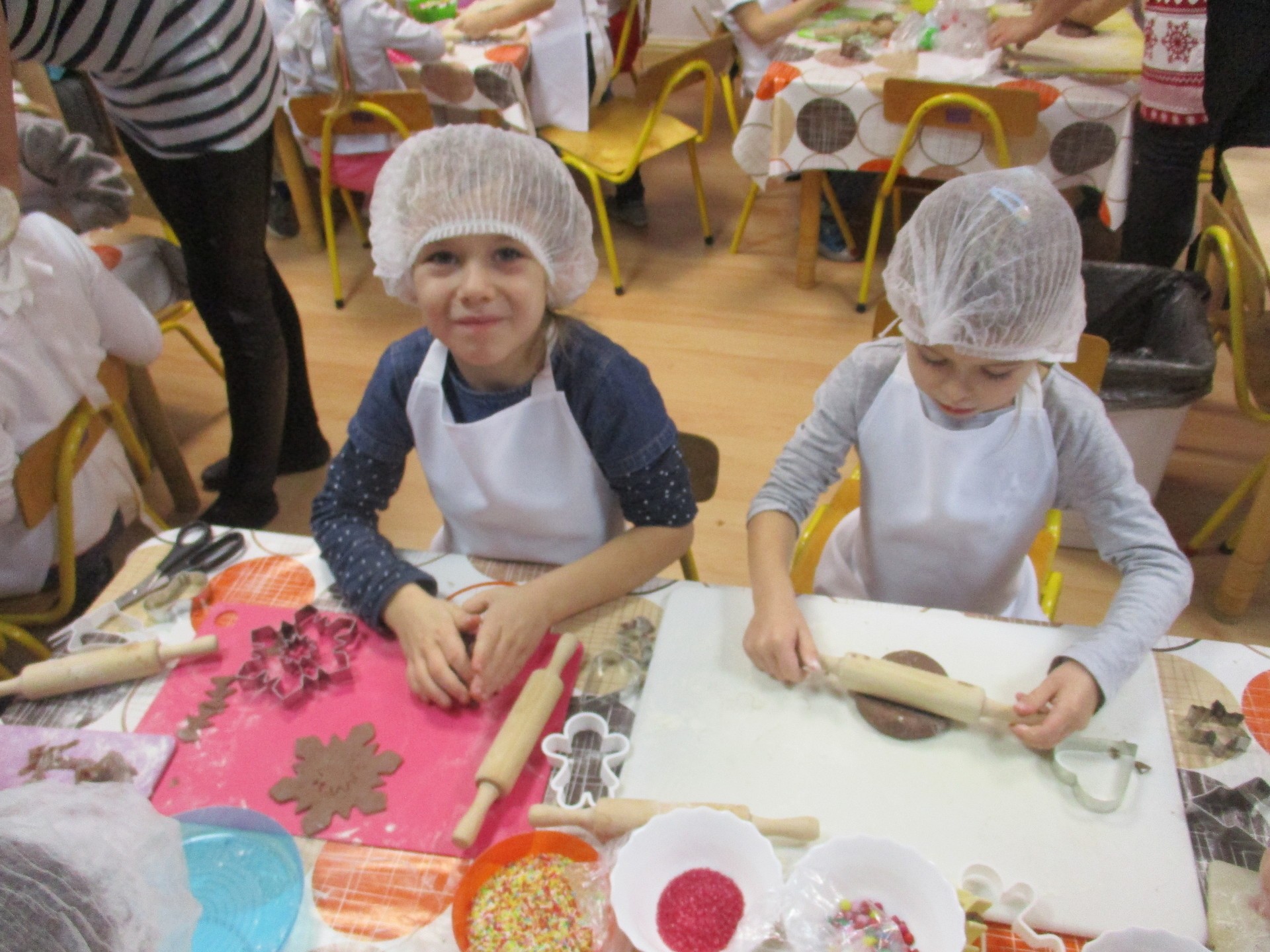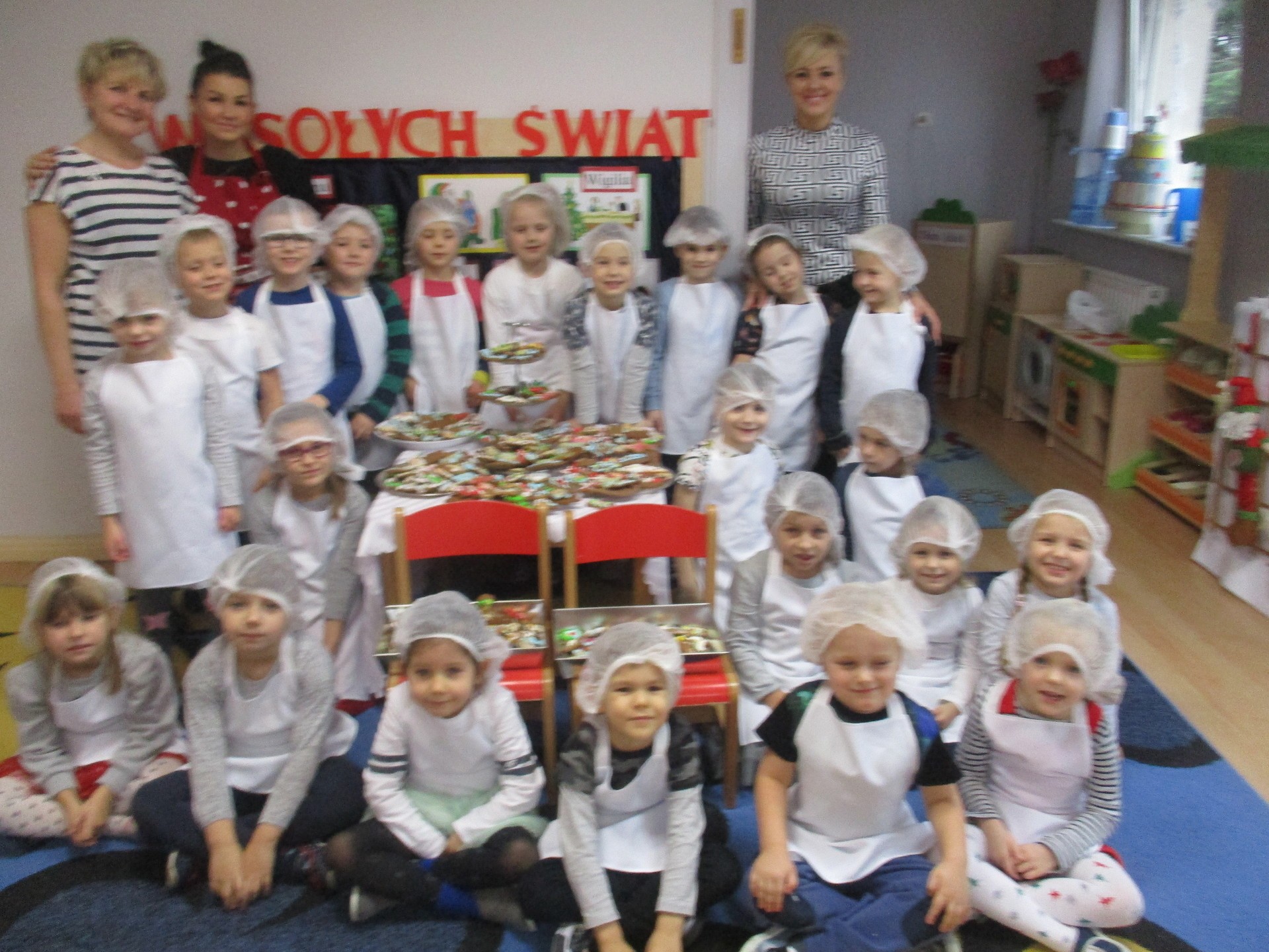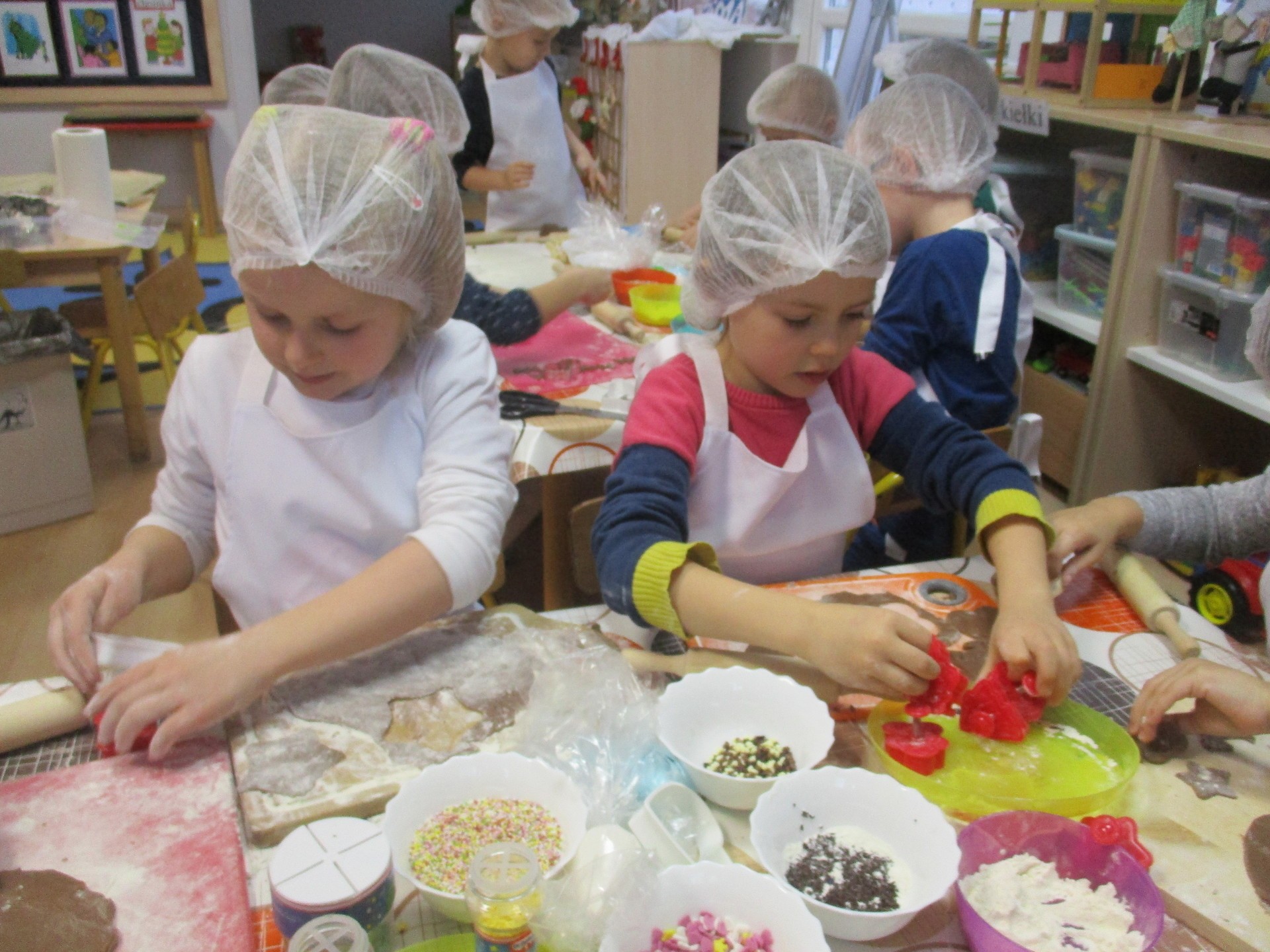 17 grudnia dla dzieci był bardzo pracowity dzień , bowiem tego dnia piekły one pierniczki. Najpierw odpowiednio się przygotowały dbając o czyste rączki oraz zakładając fartuszki. Poznały też składniki i sposób wykonania ciasta, potrzebne przybory kuchenne a także zasady bezpieczeństwa. Gdy wszystko było gotowe przedszkolaki z ogromnym zapałem i zaangażowaniem zabrały się do pracy – wałkowały ciasto, wykrawały ciasteczka. Efektem naszej pracy były pełne blaszki pierniczków, które zanieśliśmy do kuchni. Tu pod czujnym okiem naszych pań kuchareczek pierniki nabierały koloru piekąc się w piekarniku. Na koniec dzieci z wielką chęcią zdobiły pierniczki.