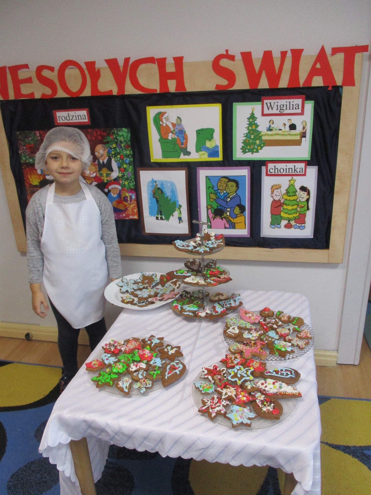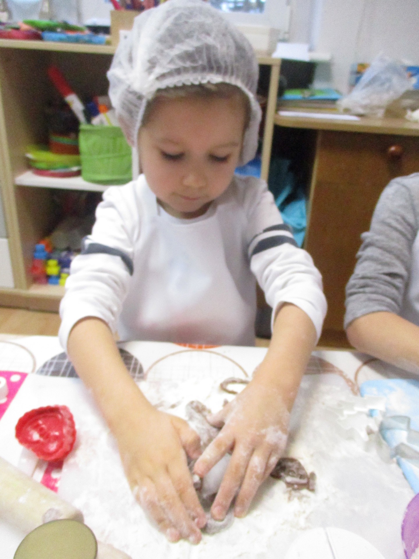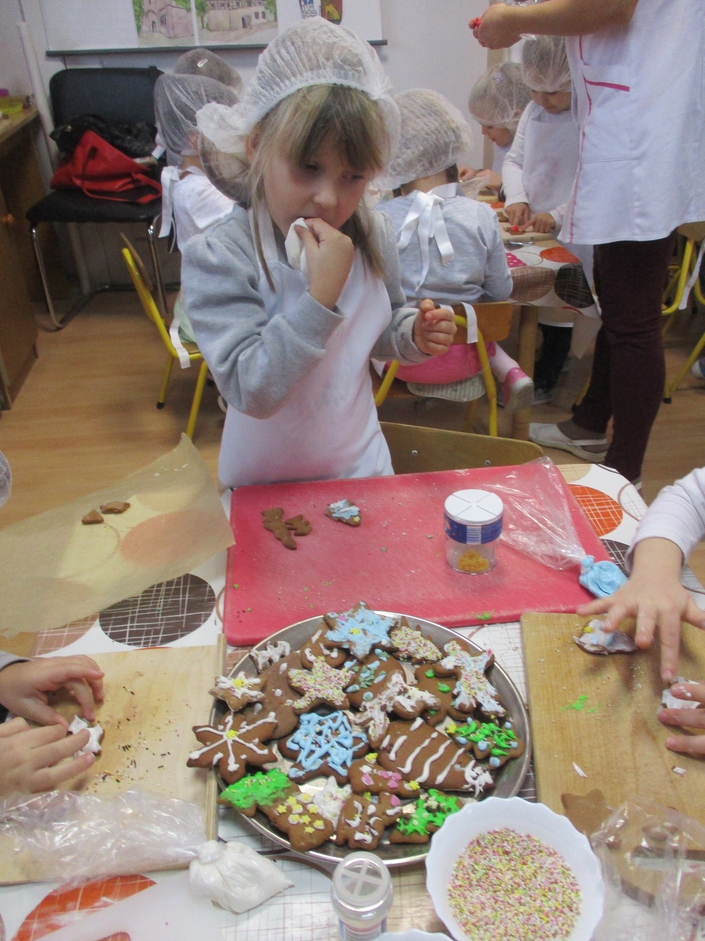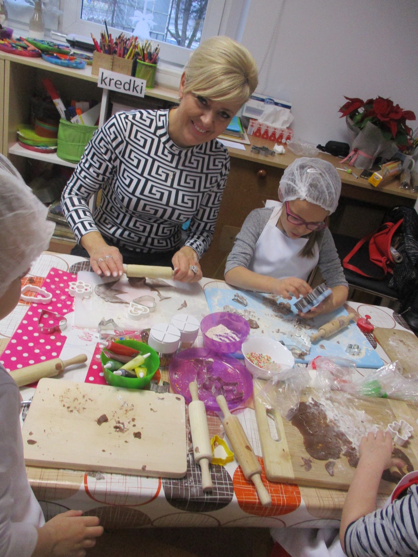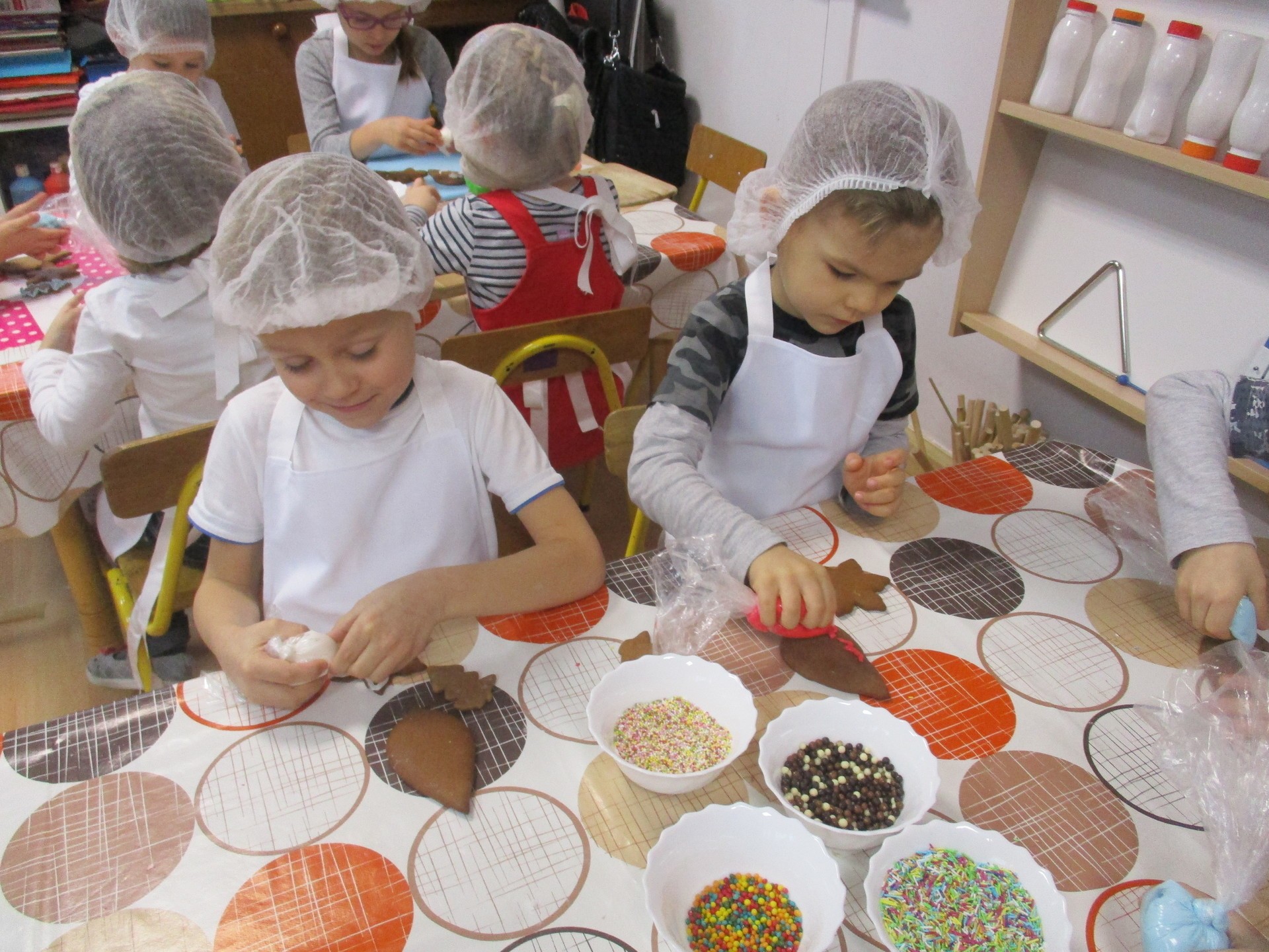 17 grudnia dla dzieci był bardzo pracowity dzień , bowiem tego dnia piekły one pierniczki. Najpierw odpowiednio się przygotowały dbając o czyste rączki oraz zakładając fartuszki. Poznały też składniki i sposób wykonania ciasta, potrzebne przybory kuchenne a także zasady bezpieczeństwa. Gdy wszystko było gotowe przedszkolaki z ogromnym zapałem i zaangażowaniem zabrały się do pracy – wałkowały ciasto, wykrawały ciasteczka. Efektem naszej pracy były pełne blaszki pierniczków, które zanieśliśmy do kuchni. Tu pod czujnym okiem naszych pań kuchareczek pierniki nabierały koloru piekąc się w piekarniku. Na koniec dzieci z wielką chęcią zdobiły pierniczki.