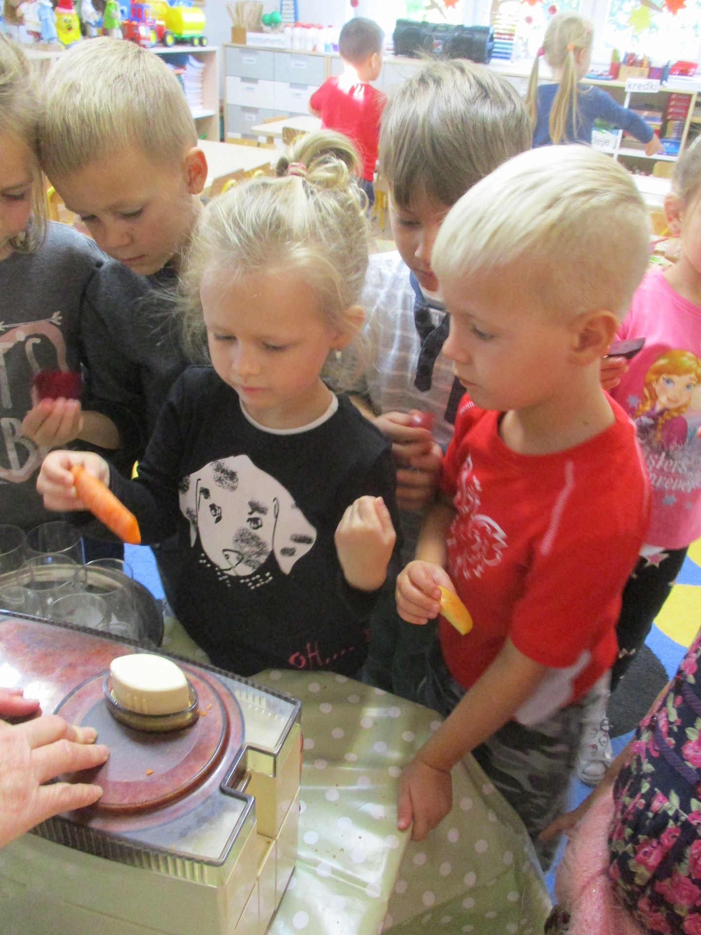 Jednak zanim przystąpiliśmy do pracy, dzieci zapoznały się z urządzeniem do robienia soku- sokowirówką, jego działaniem i utrwalały sobie zasady bezpieczeństwa. Pozostało tylko wrzucenie składników do maszyny i sok gotowy! Świeżo wyciśnięty sok wszystkim bardzo smakował, najważniejsze, że był, bez dodatku cukru i bez konserwantów.
