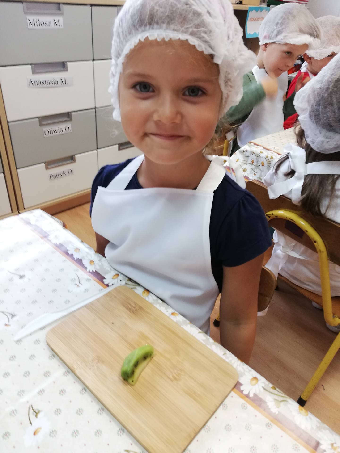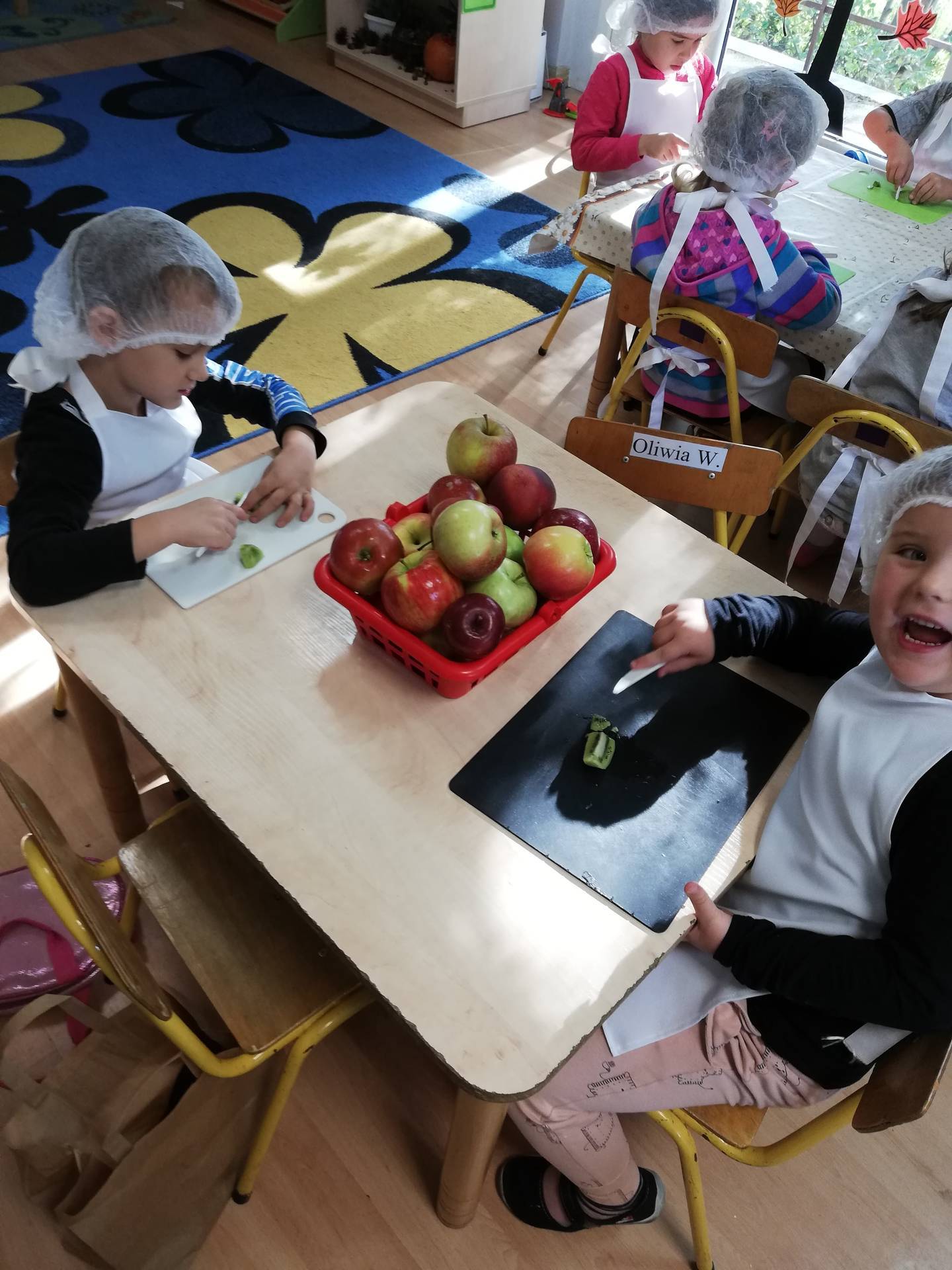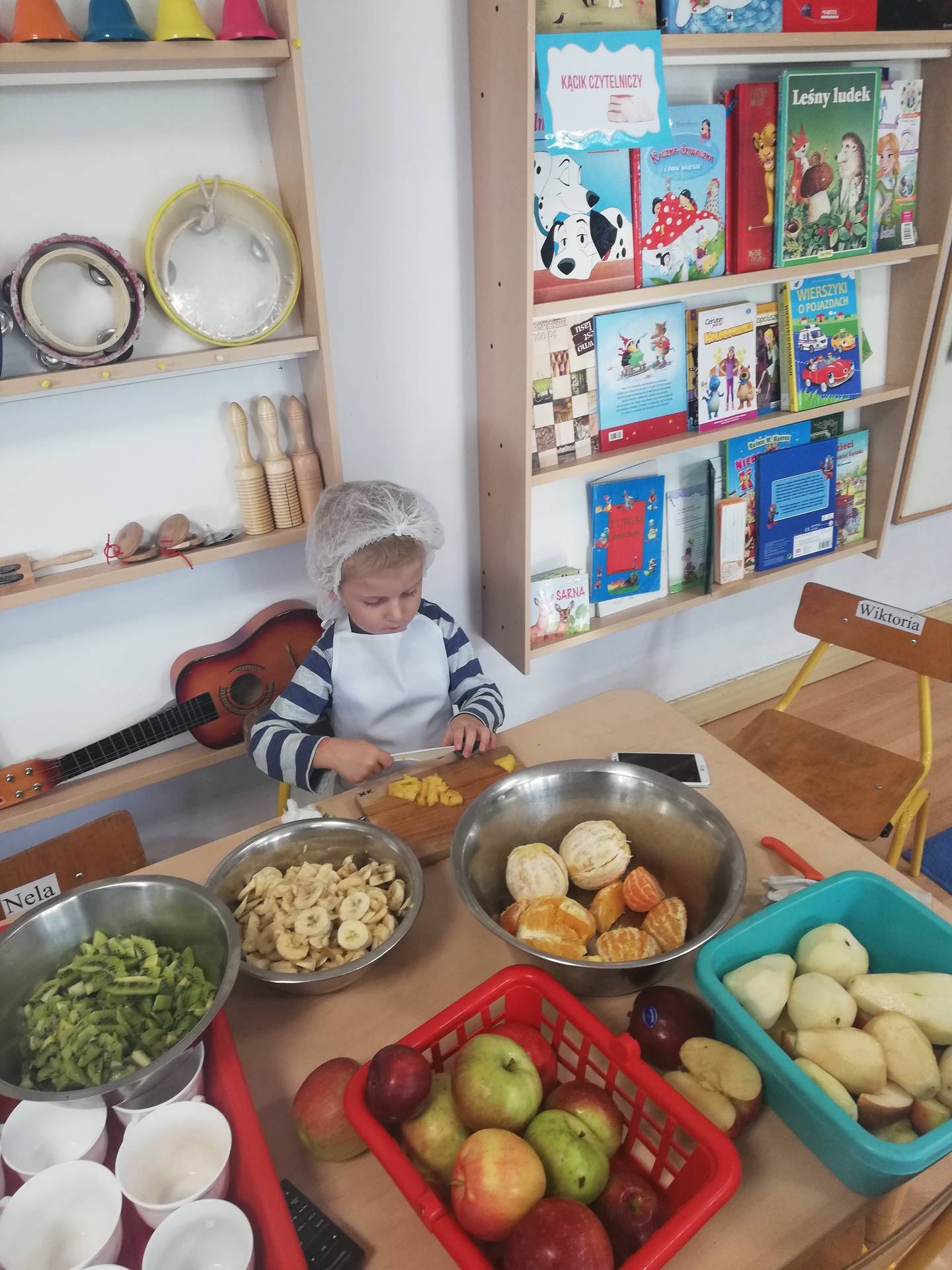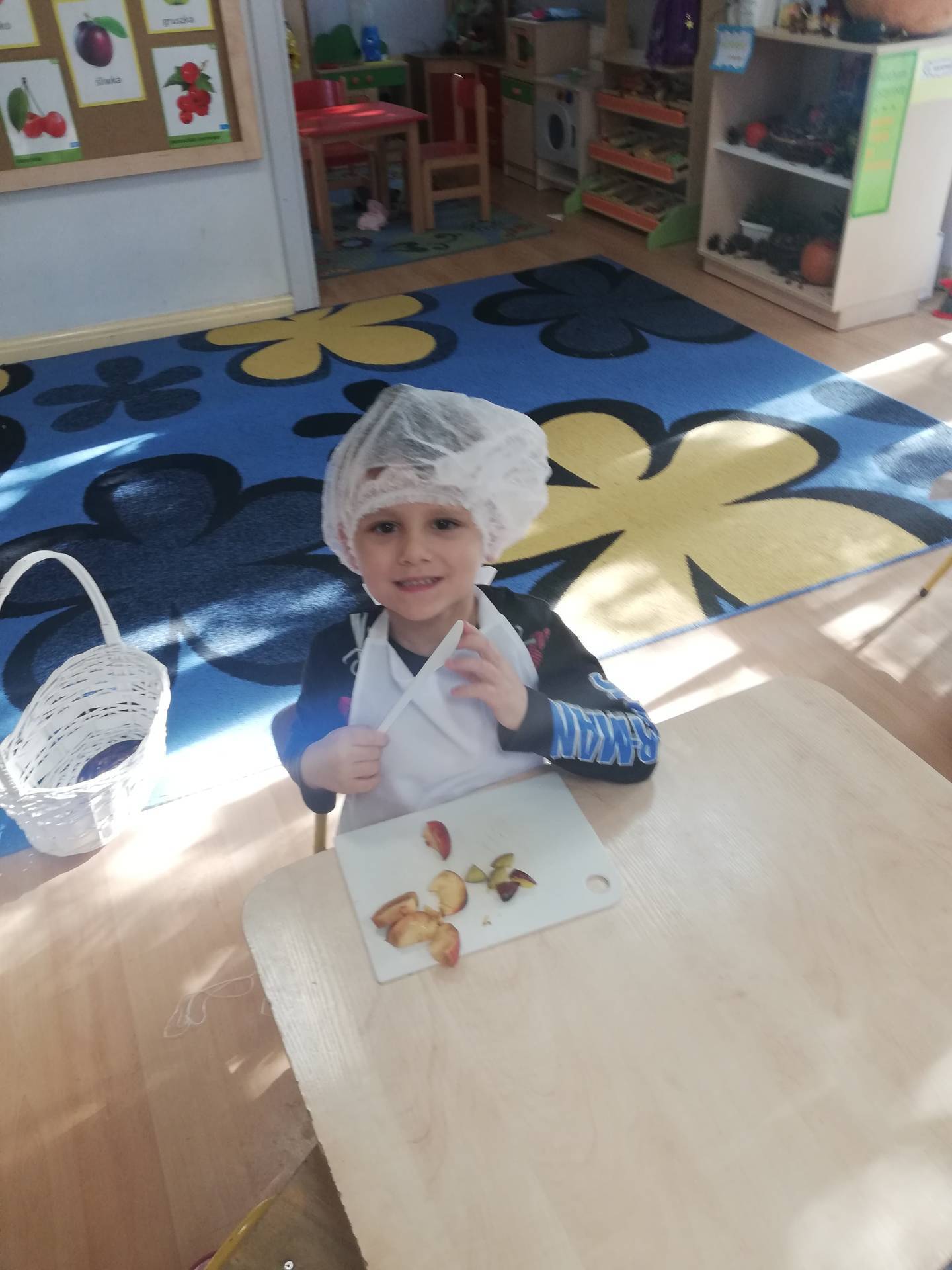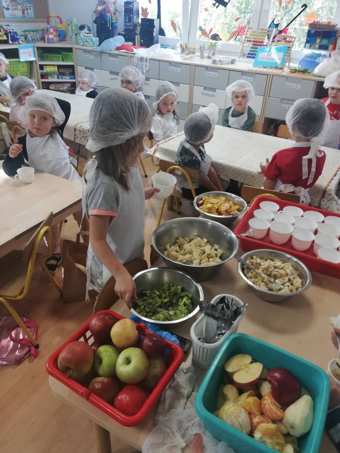W czwartek 27 września było w naszej grupie smacznie a przede wszystkim zdrowo! Dzieci przygotowały pyszną, witaminową sałatkę. Przyniosły z domów różne świeże owoce. Były jabłka, gruszki banany, śliwki, brzoskwinie, nektarynki, kiwi, pomarańcze, mandarynki i winogrona.Wszyscy mieli soczyste minki na widok tak smakowitych owoców i każdy z chęcią zabrał się do pracy.Dokładnie umyliśmy rączki i ubraliśmy fartuszki.Każdy miał swoją deseczkę, nożyk i tak zabraliśmy się do krojenia. Dzieci samodzielnie kroiły sałatkę owocową przestrzegając zasad bezpieczeństwa przy posługiwaniu się nożem.