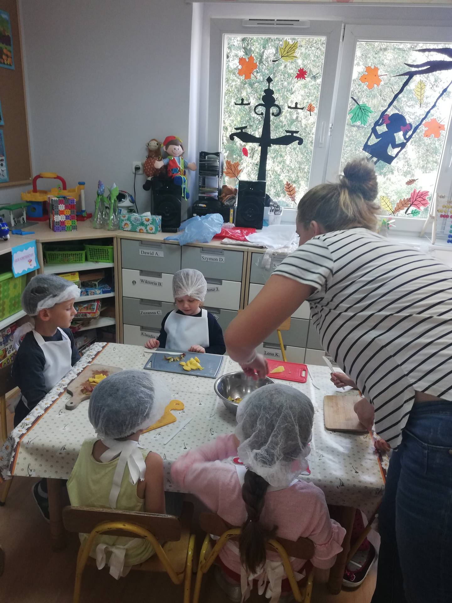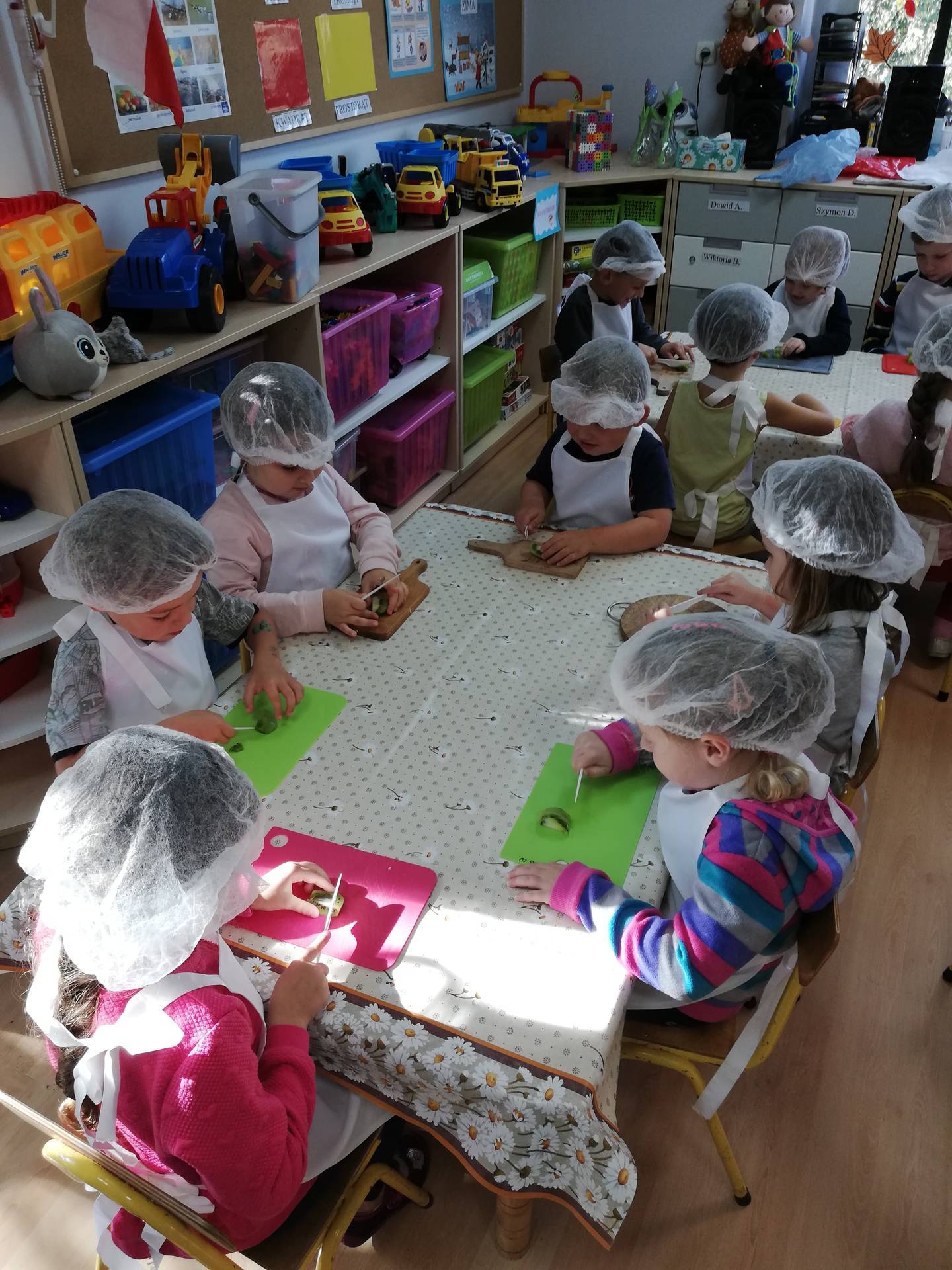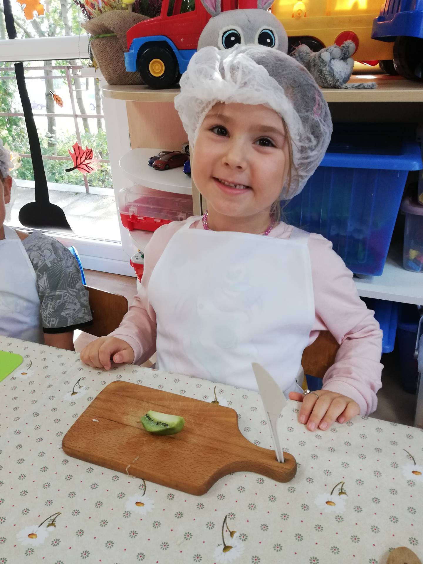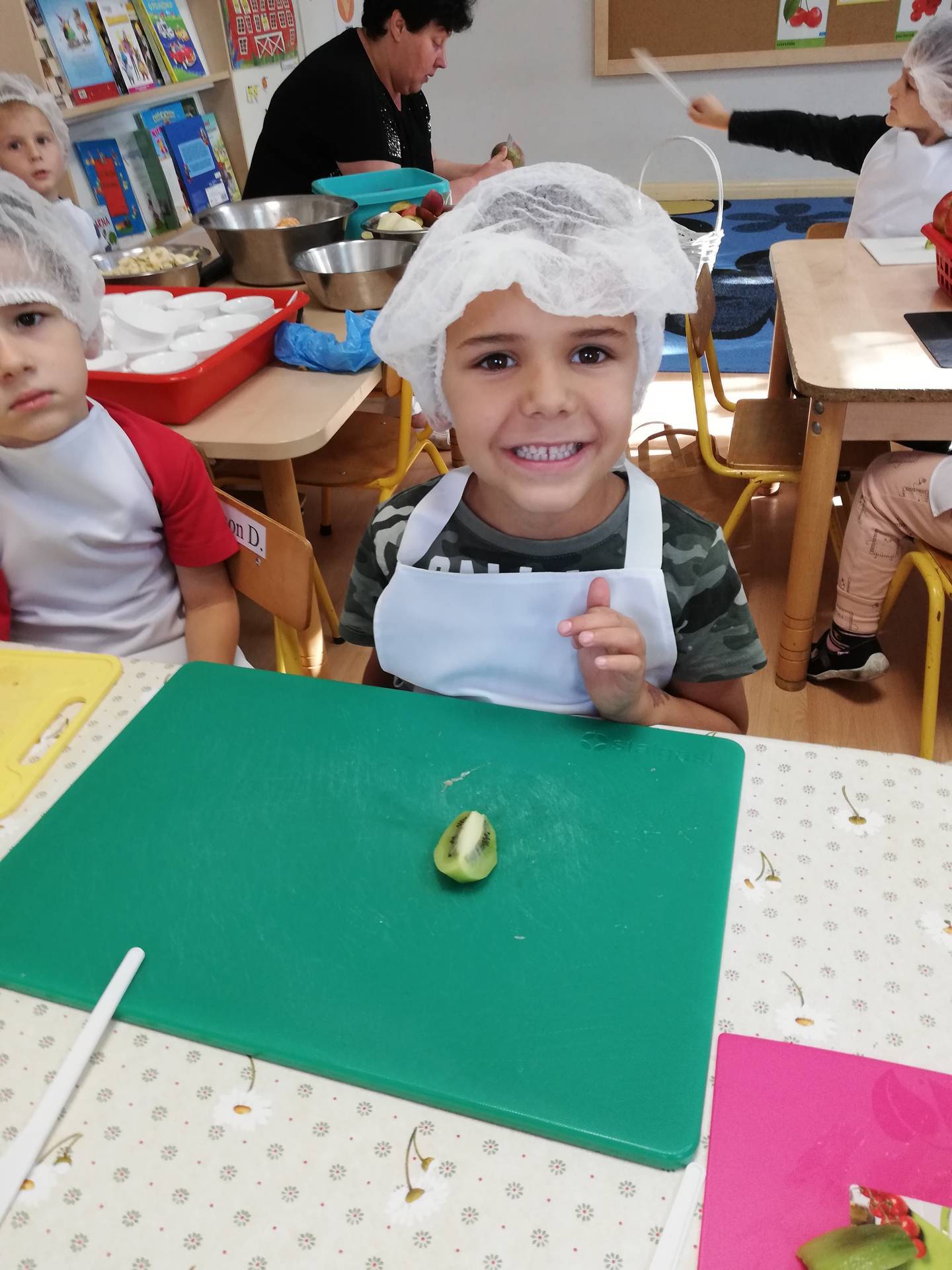W czwartek 27 września było w naszej grupie smacznie a przede wszystkim zdrowo! Dzieci przygotowały pyszną, witaminową sałatkę. Przyniosły z domów różne świeże owoce. Były jabłka, gruszki banany, śliwki, brzoskwinie, nektarynki, kiwi, pomarańcze, mandarynki i winogrona.Wszyscy mieli soczyste minki na widok tak smakowitych owoców i każdy z chęcią zabrał się do pracy.Dokładnie umyliśmy rączki i ubraliśmy fartuszki.Każdy miał swoją deseczkę, nożyk i tak zabraliśmy się do krojenia. Dzieci samodzielnie kroiły sałatkę owocową przestrzegając zasad bezpieczeństwa przy posługiwaniu się nożem.