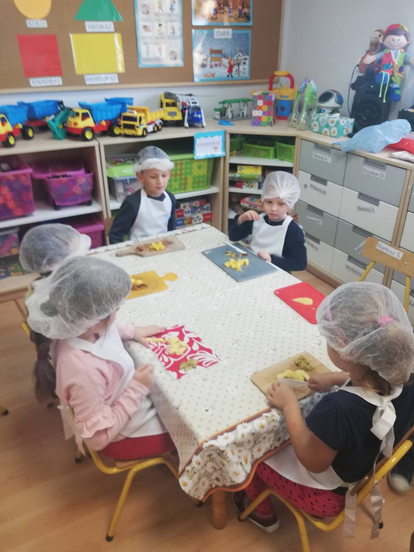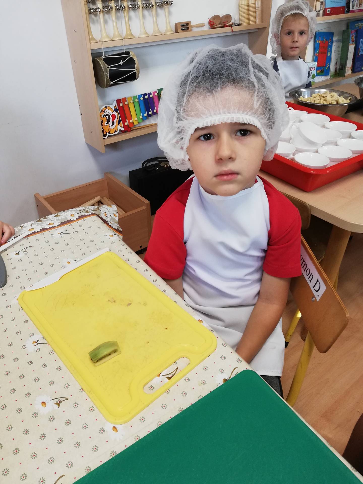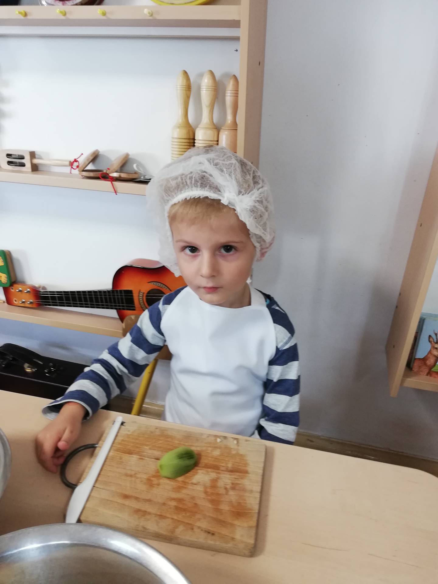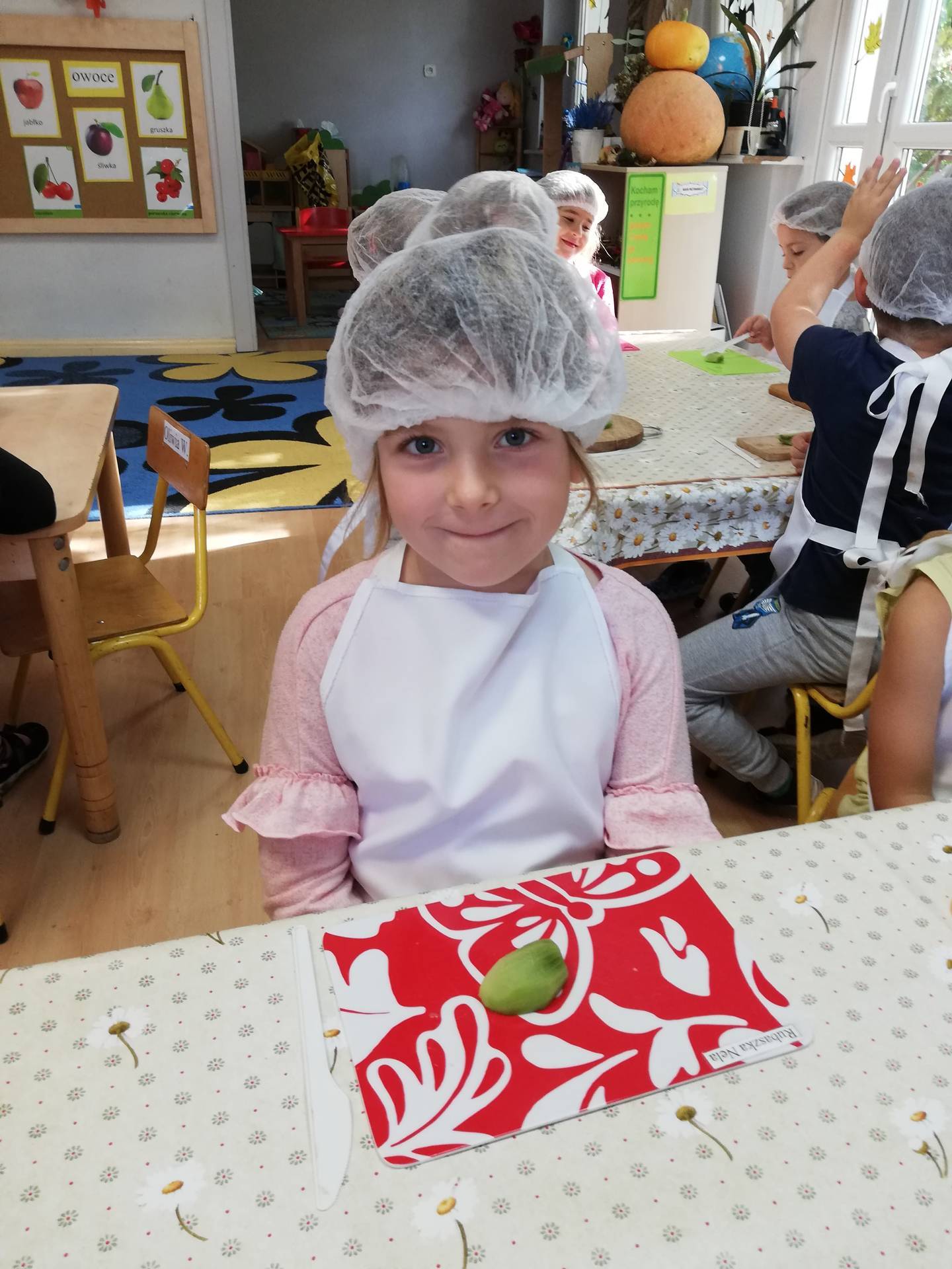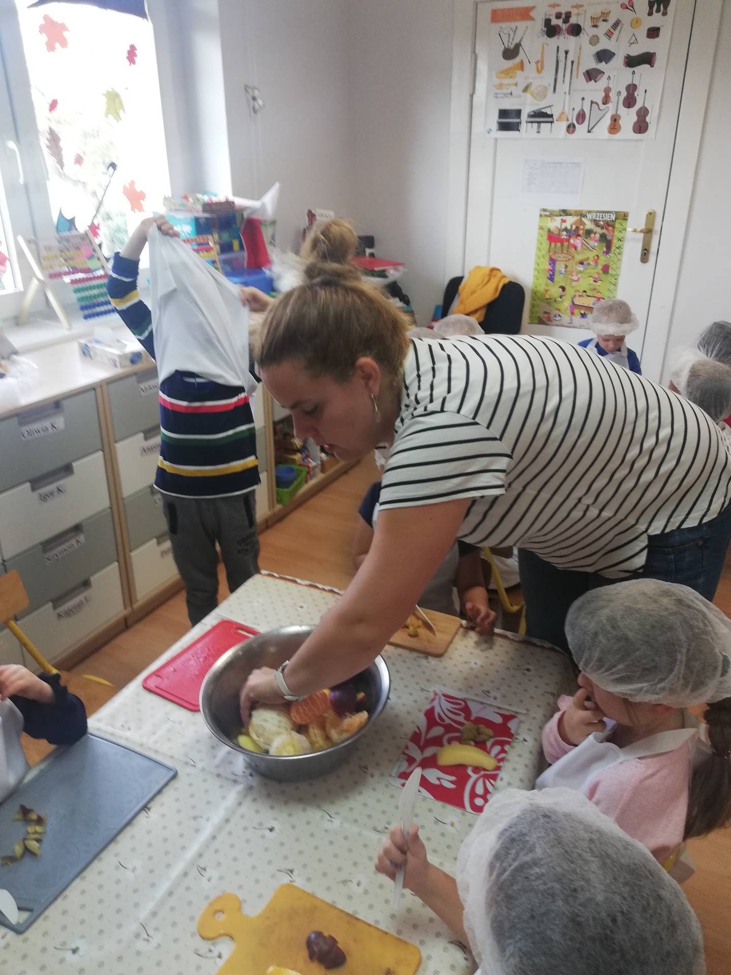 W czwartek 27 września było w naszej grupie smacznie a przede wszystkim zdrowo! Dzieci przygotowały pyszną, witaminową sałatkę. Przyniosły z domów różne świeże owoce. Były jabłka, gruszki banany, śliwki, brzoskwinie, nektarynki, kiwi, pomarańcze, mandarynki i winogrona.Wszyscy mieli soczyste minki na widok tak smakowitych owoców i każdy z chęcią zabrał się do pracy.Dokładnie umyliśmy rączki i ubraliśmy fartuszki.Każdy miał swoją deseczkę, nożyk i tak zabraliśmy się do krojenia. Dzieci samodzielnie kroiły sałatkę owocową przestrzegając zasad bezpieczeństwa przy posługiwaniu się nożem.