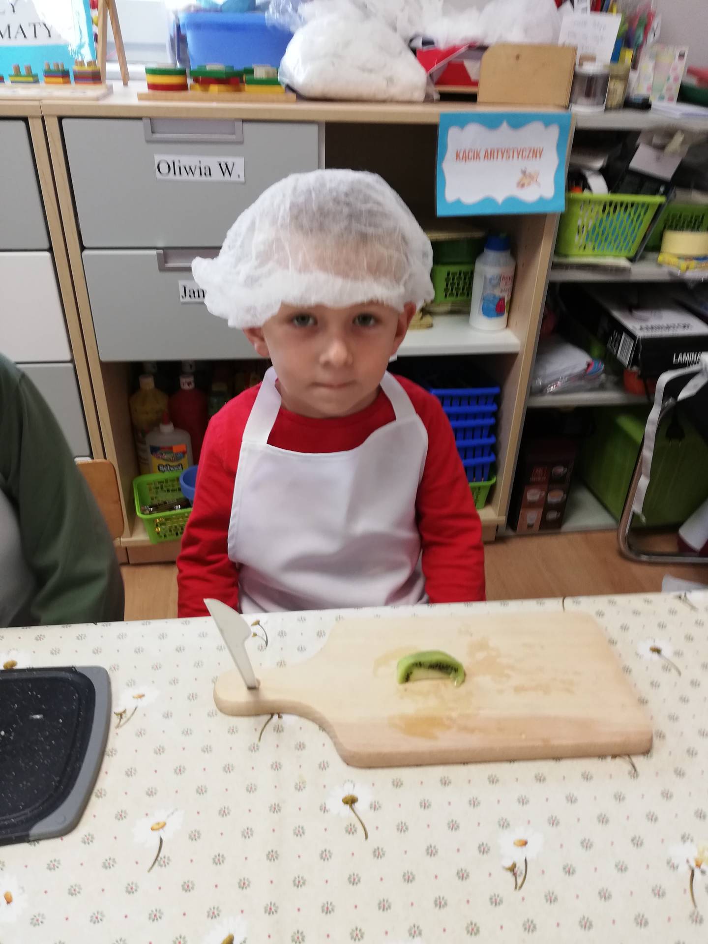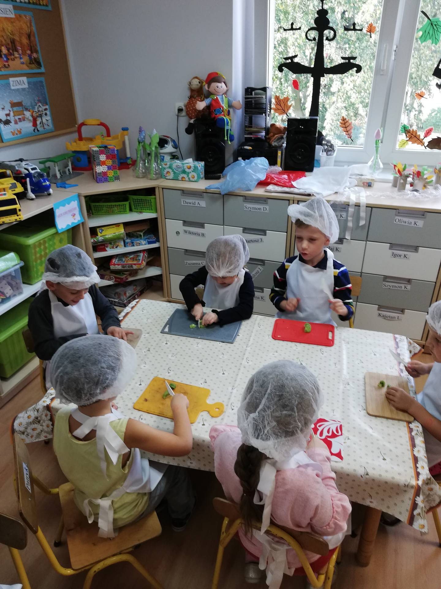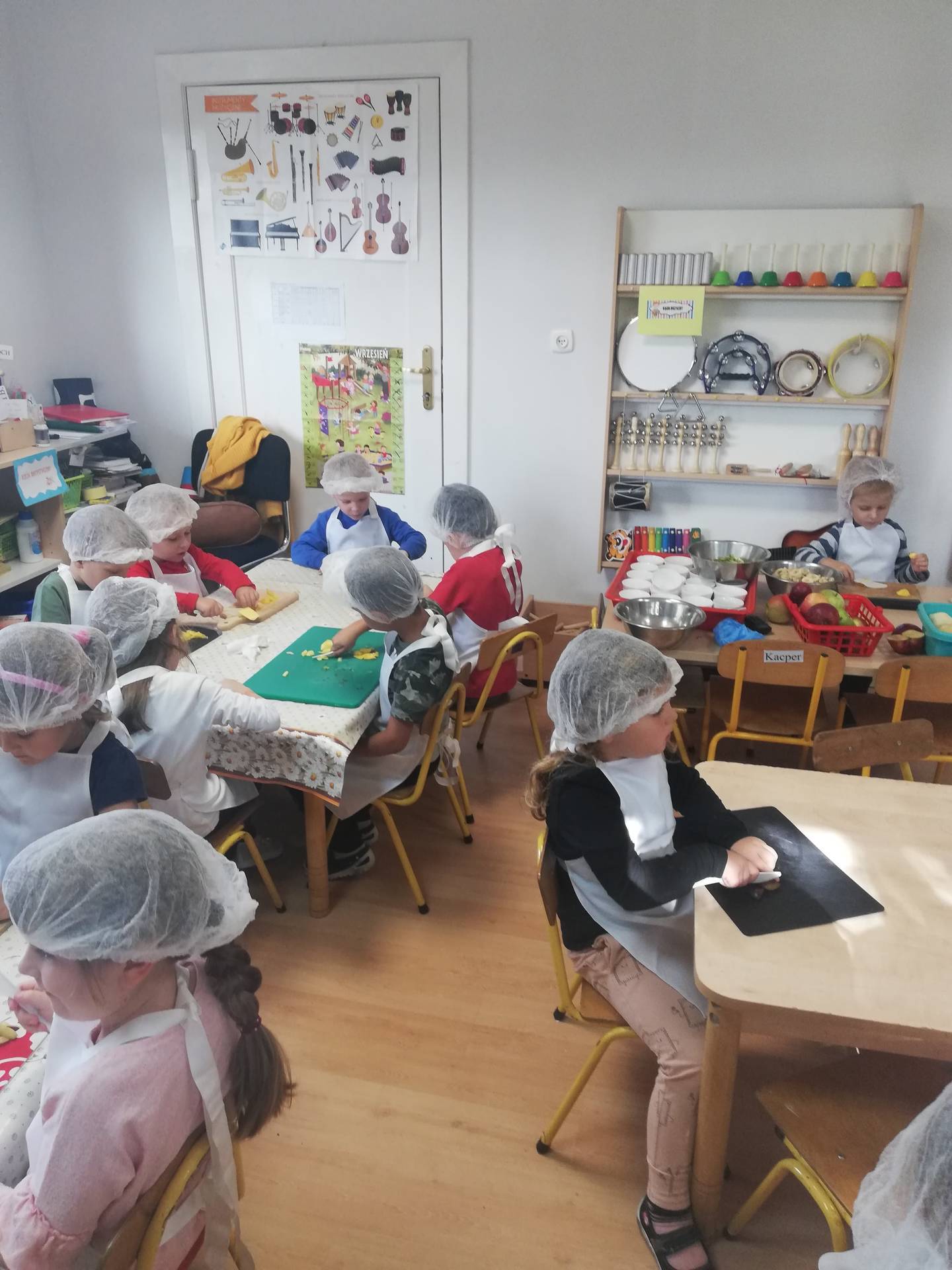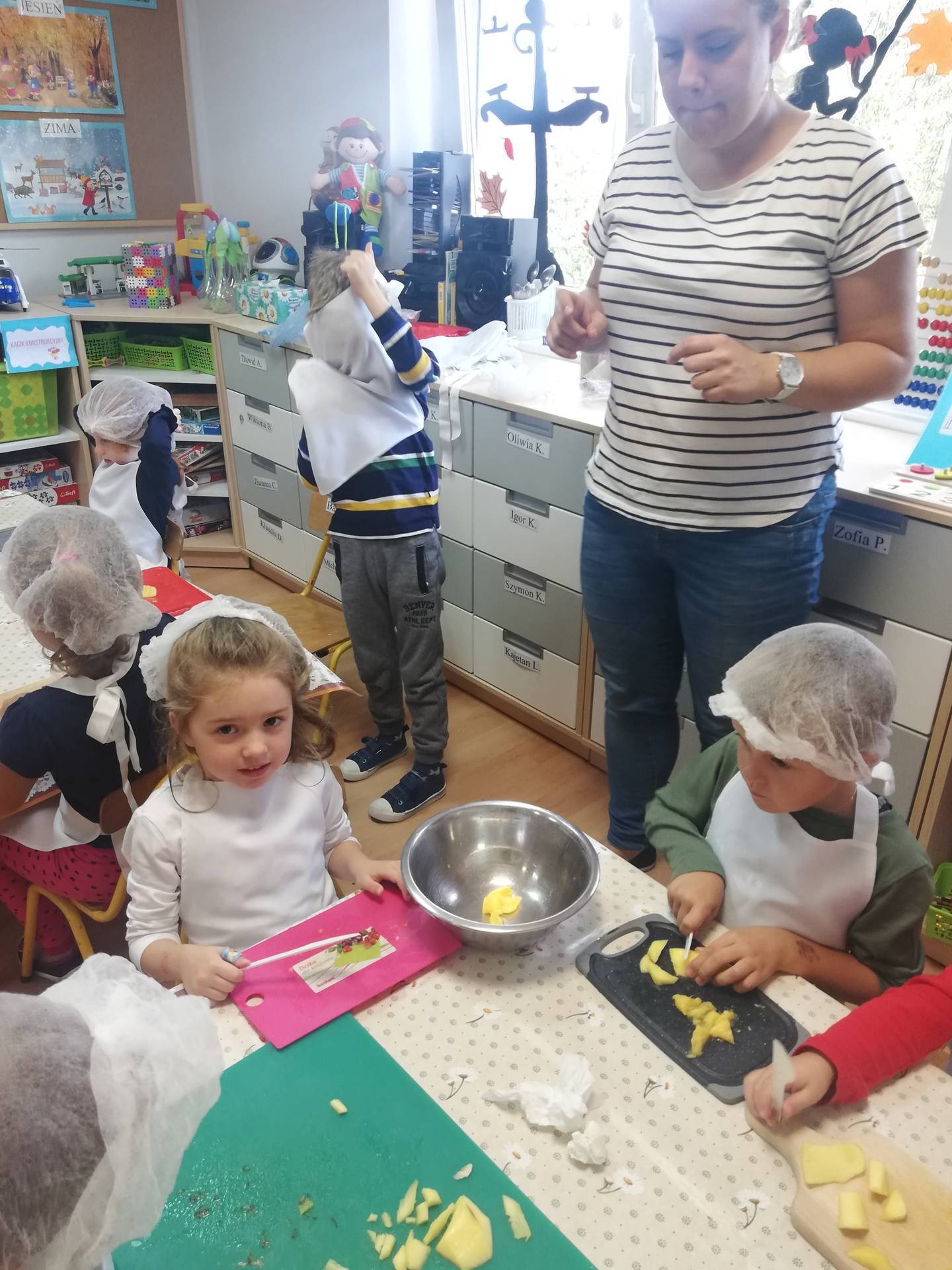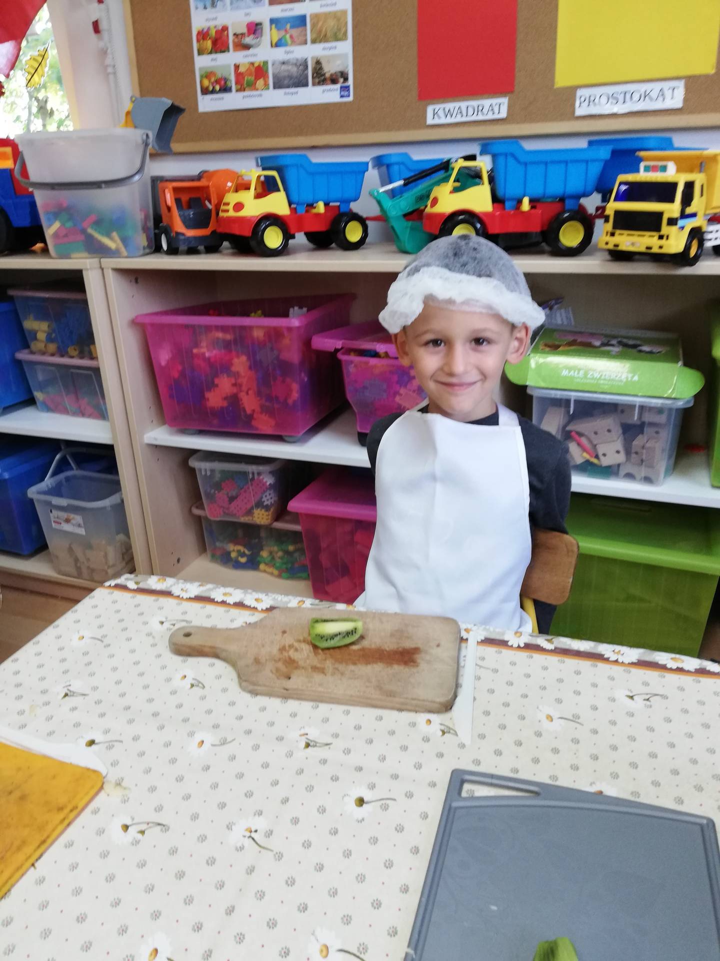 W czwartek 27 września było w naszej grupie smacznie a przede wszystkim zdrowo! Dzieci przygotowały pyszną, witaminową sałatkę. Przyniosły z domów różne świeże owoce. Były jabłka, gruszki banany, śliwki, brzoskwinie, nektarynki, kiwi, pomarańcze, mandarynki i winogrona.Wszyscy mieli soczyste minki na widok tak smakowitych owoców i każdy z chęcią zabrał się do pracy.Dokładnie umyliśmy rączki i ubraliśmy fartuszki.Każdy miał swoją deseczkę, nożyk i tak zabraliśmy się do krojenia. Dzieci samodzielnie kroiły sałatkę owocową przestrzegając zasad bezpieczeństwa przy posługiwaniu się nożem.