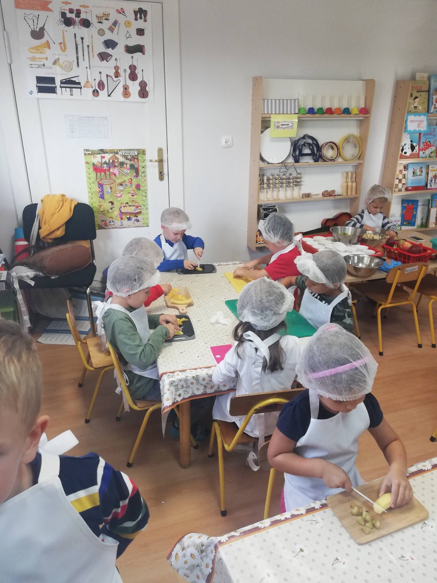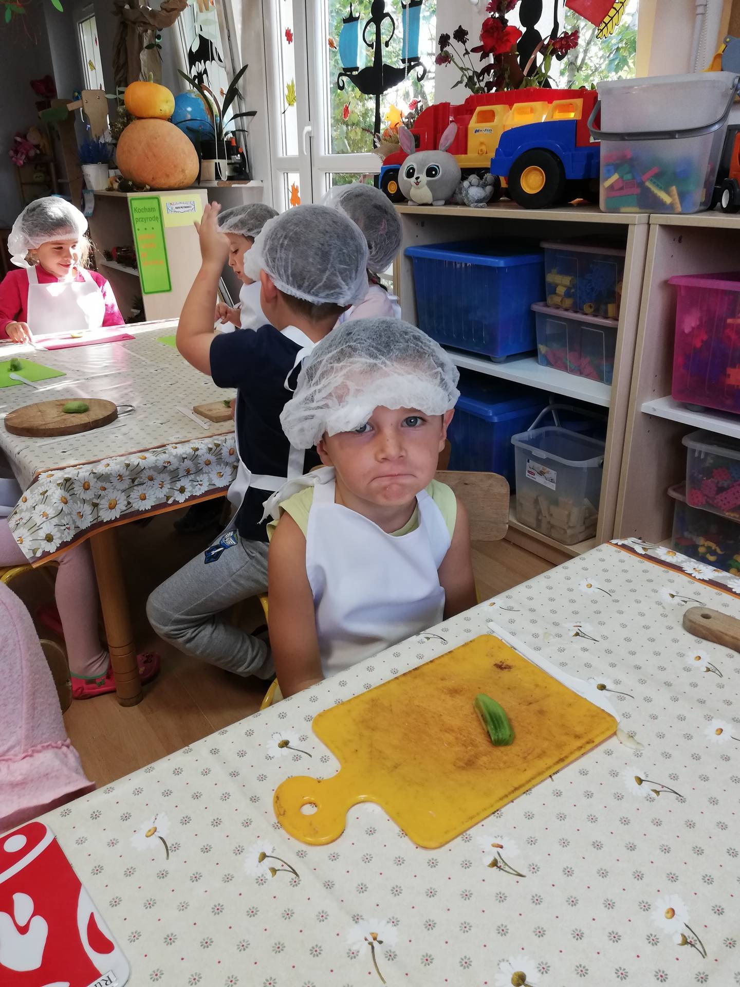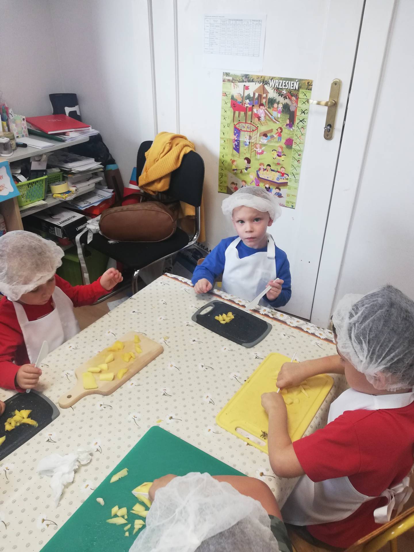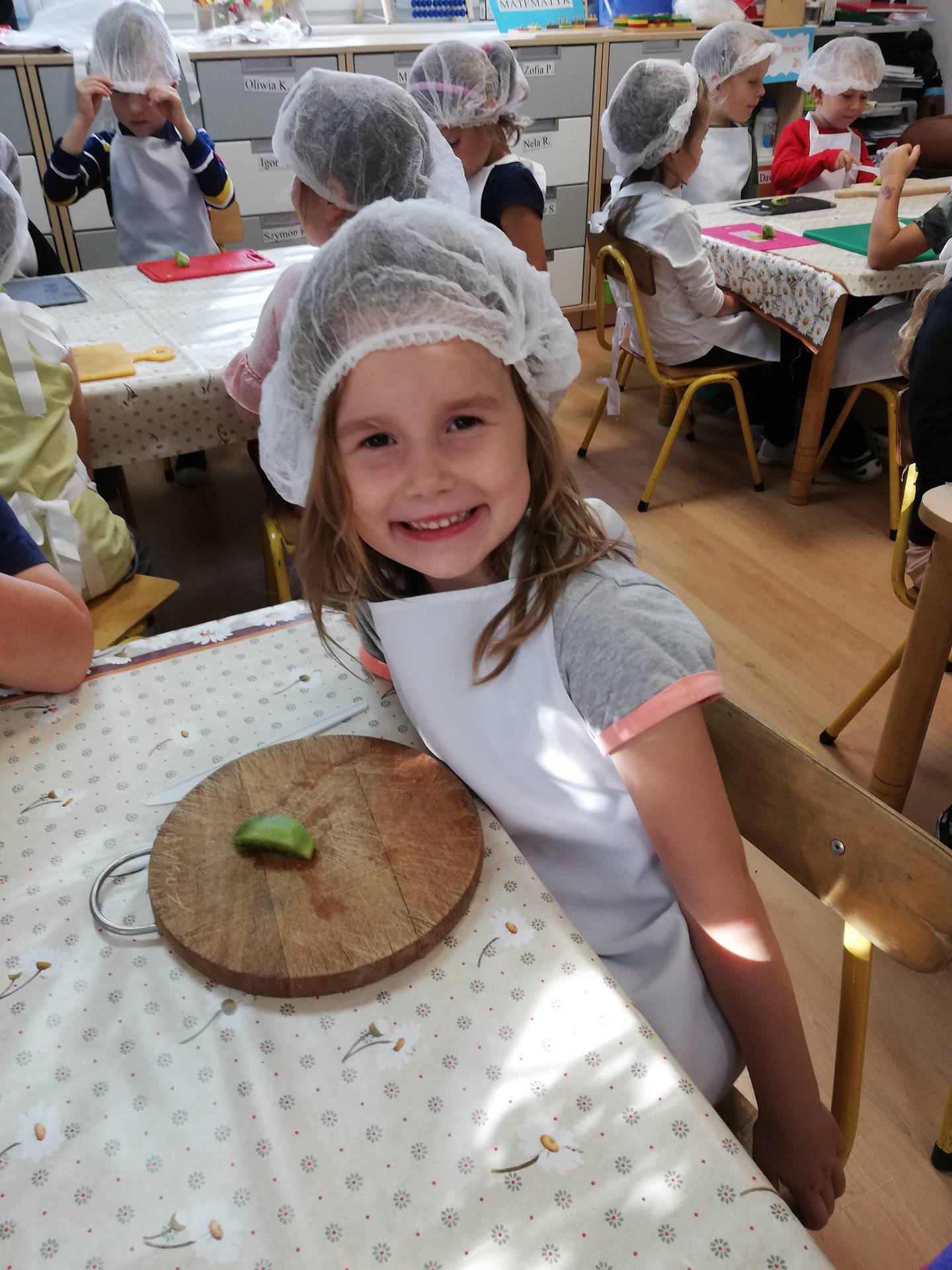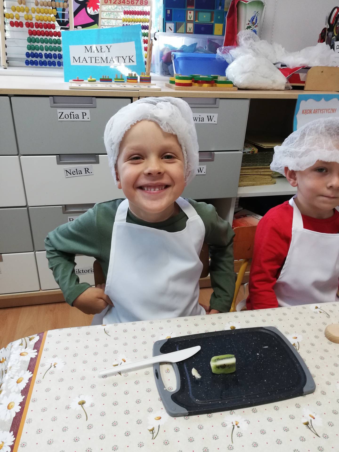 W czwartek 27 września było w naszej grupie smacznie a przede wszystkim zdrowo! Dzieci przygotowały pyszną, witaminową sałatkę. Przyniosły z domów różne świeże owoce. Były jabłka, gruszki banany, śliwki, brzoskwinie, nektarynki, kiwi, pomarańcze, mandarynki i winogrona.Wszyscy mieli soczyste minki na widok tak smakowitych owoców i każdy z chęcią zabrał się do pracy.Dokładnie umyliśmy rączki i ubraliśmy fartuszki.Każdy miał swoją deseczkę, nożyk i tak zabraliśmy się do krojenia. Dzieci samodzielnie kroiły sałatkę owocową przestrzegając zasad bezpieczeństwa przy posługiwaniu się nożem.