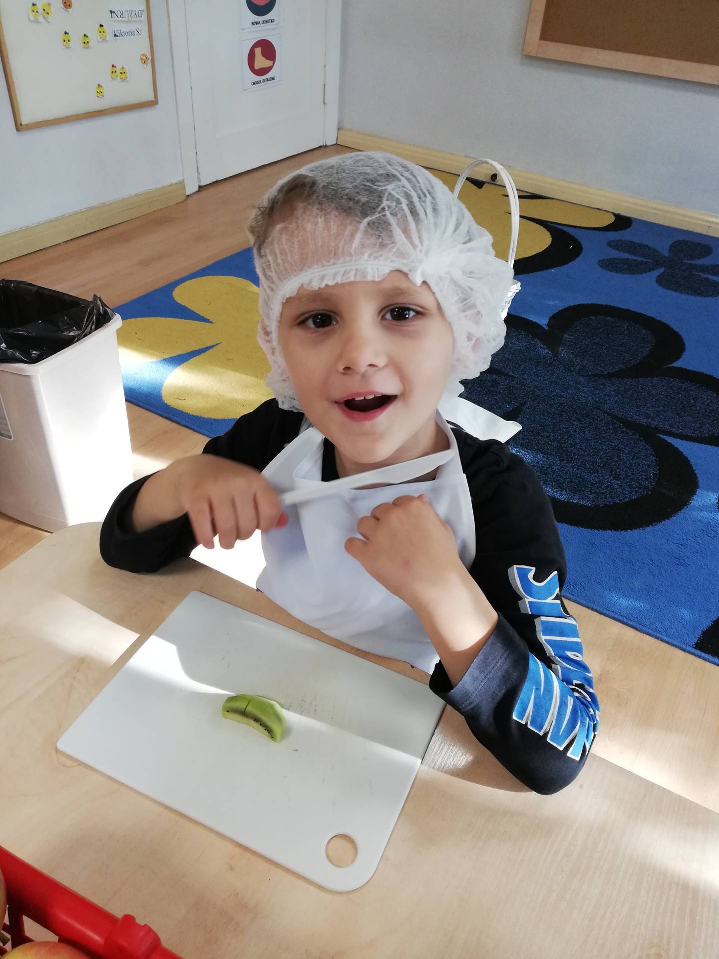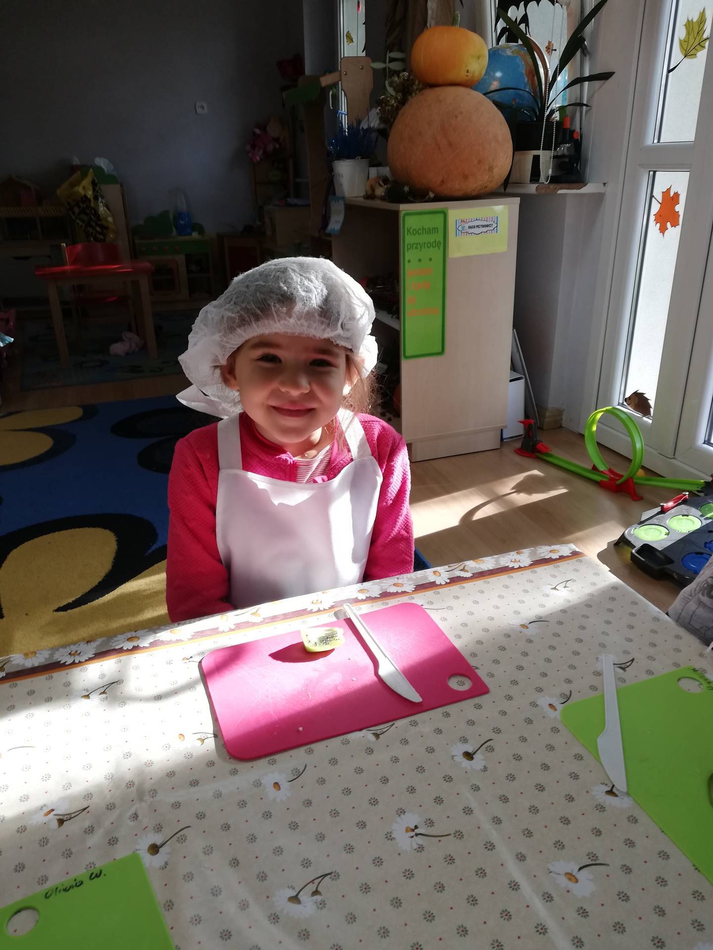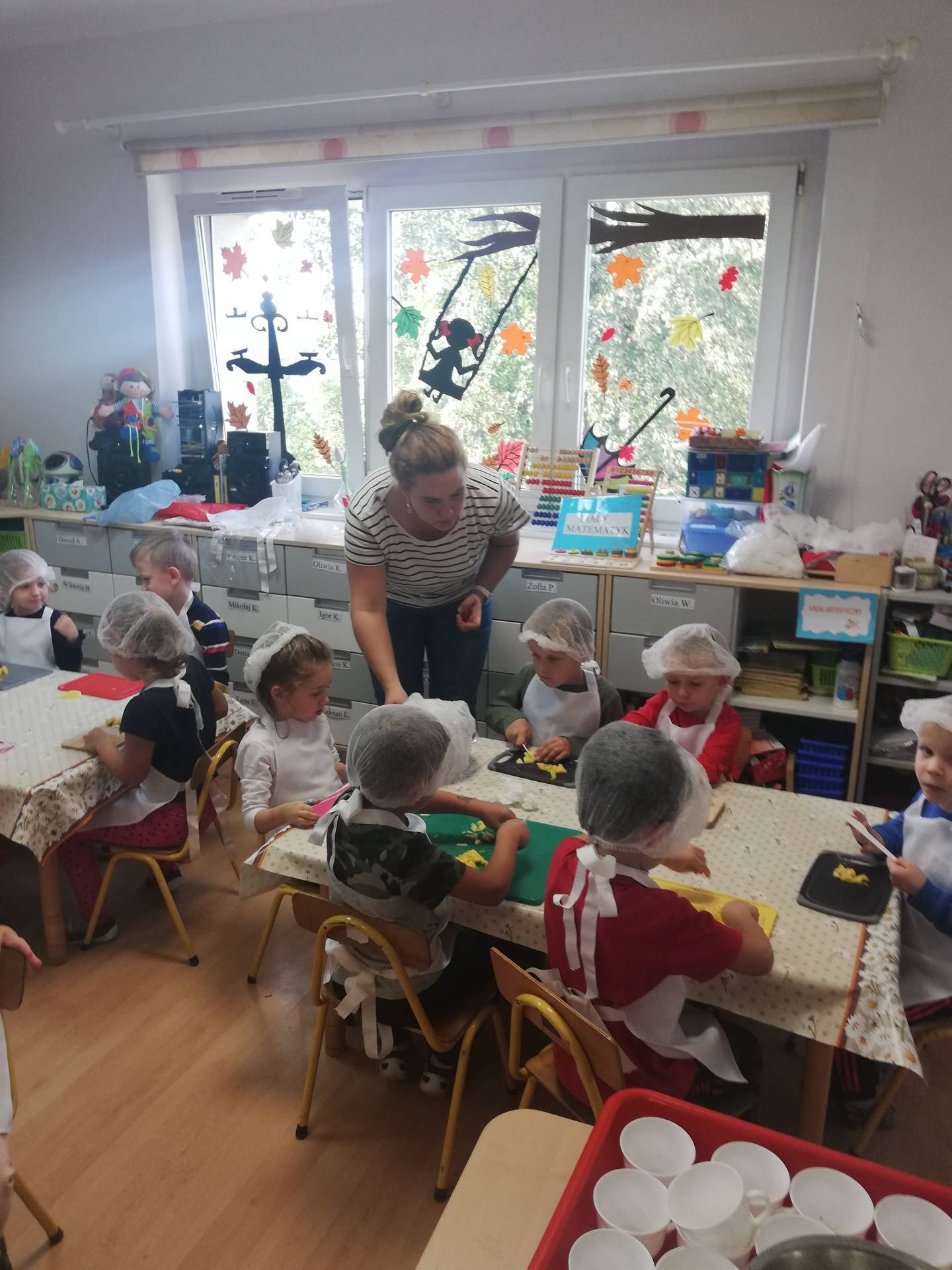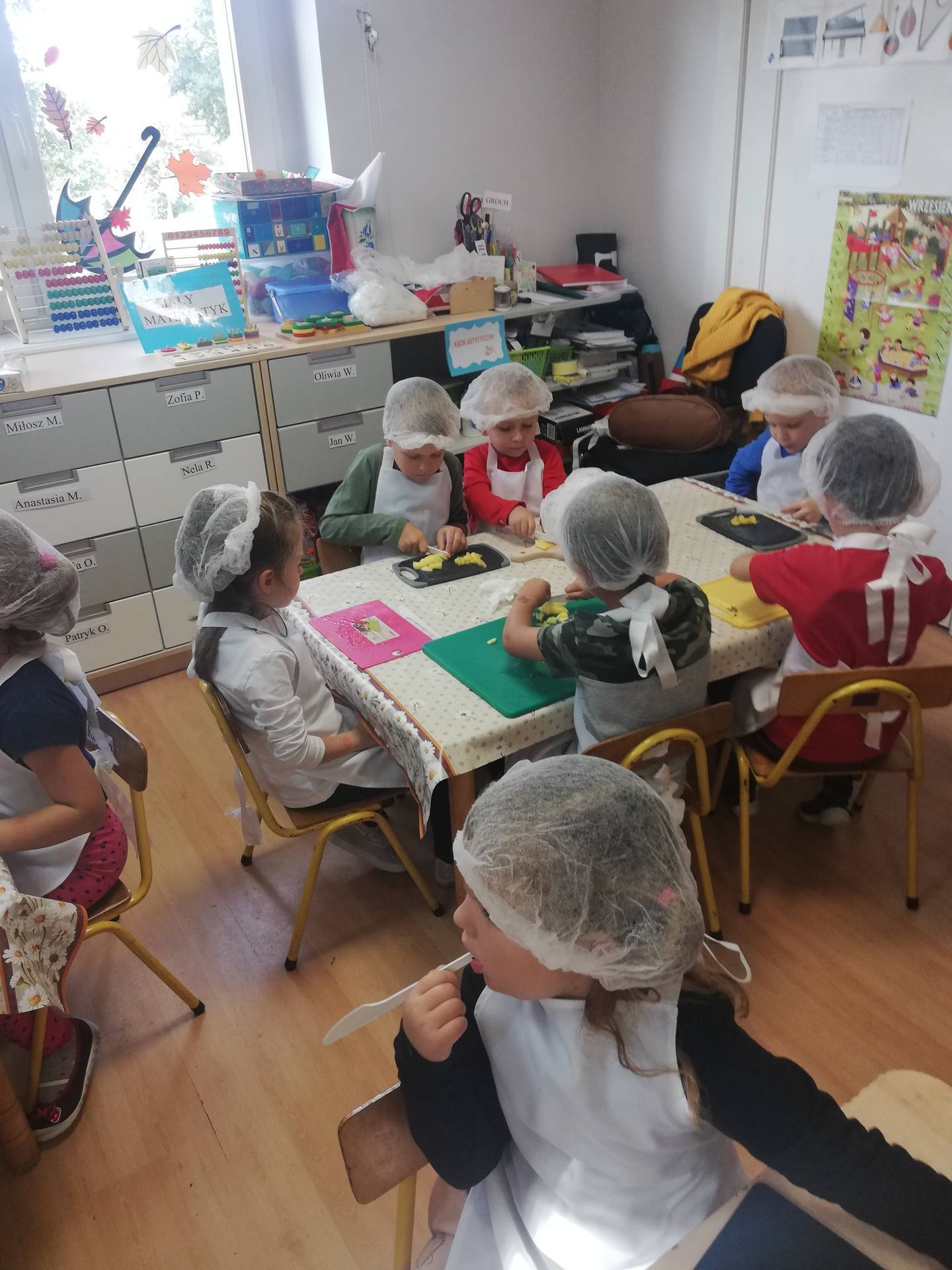 W czwartek 27 września było w naszej grupie smacznie a przede wszystkim zdrowo! Dzieci przygotowały pyszną, witaminową sałatkę. Przyniosły z domów różne świeże owoce. Były jabłka, gruszki banany, śliwki, brzoskwinie, nektarynki, kiwi, pomarańcze, mandarynki i winogrona.Wszyscy mieli soczyste minki na widok tak smakowitych owoców i każdy z chęcią zabrał się do pracy.Dokładnie umyliśmy rączki i ubraliśmy fartuszki.Każdy miał swoją deseczkę, nożyk i tak zabraliśmy się do krojenia. Dzieci samodzielnie kroiły sałatkę owocową przestrzegając zasad bezpieczeństwa przy posługiwaniu się nożem.