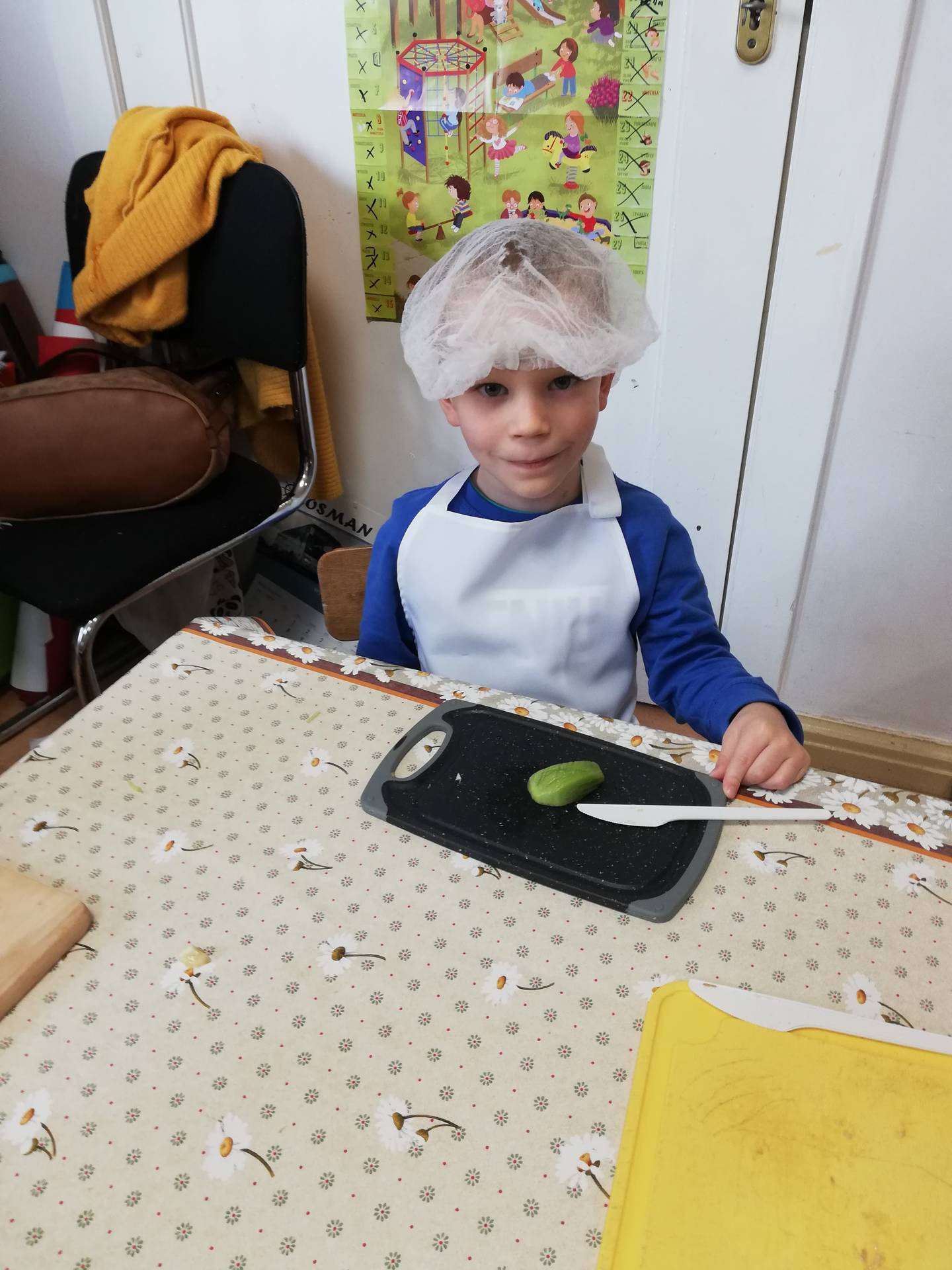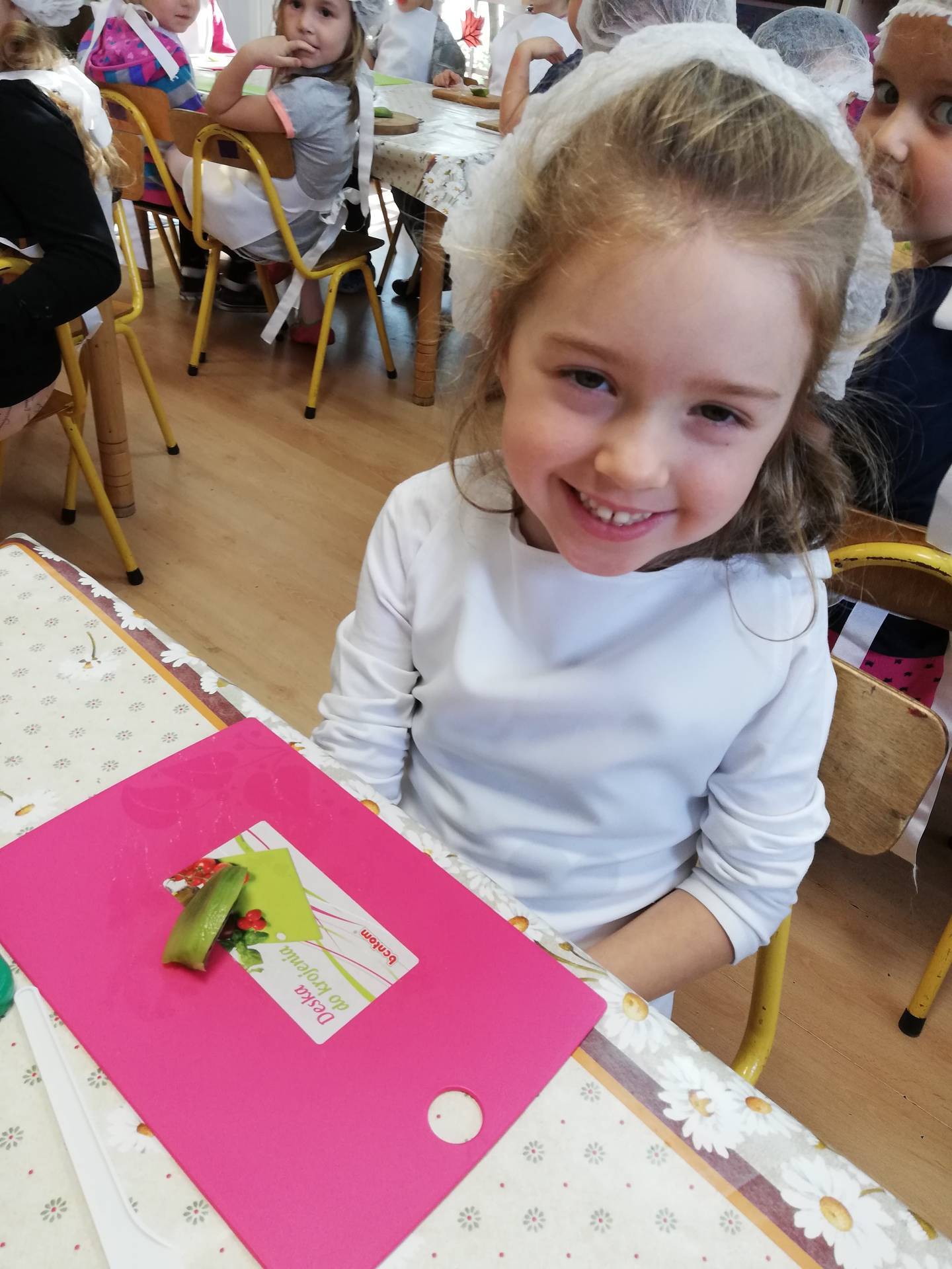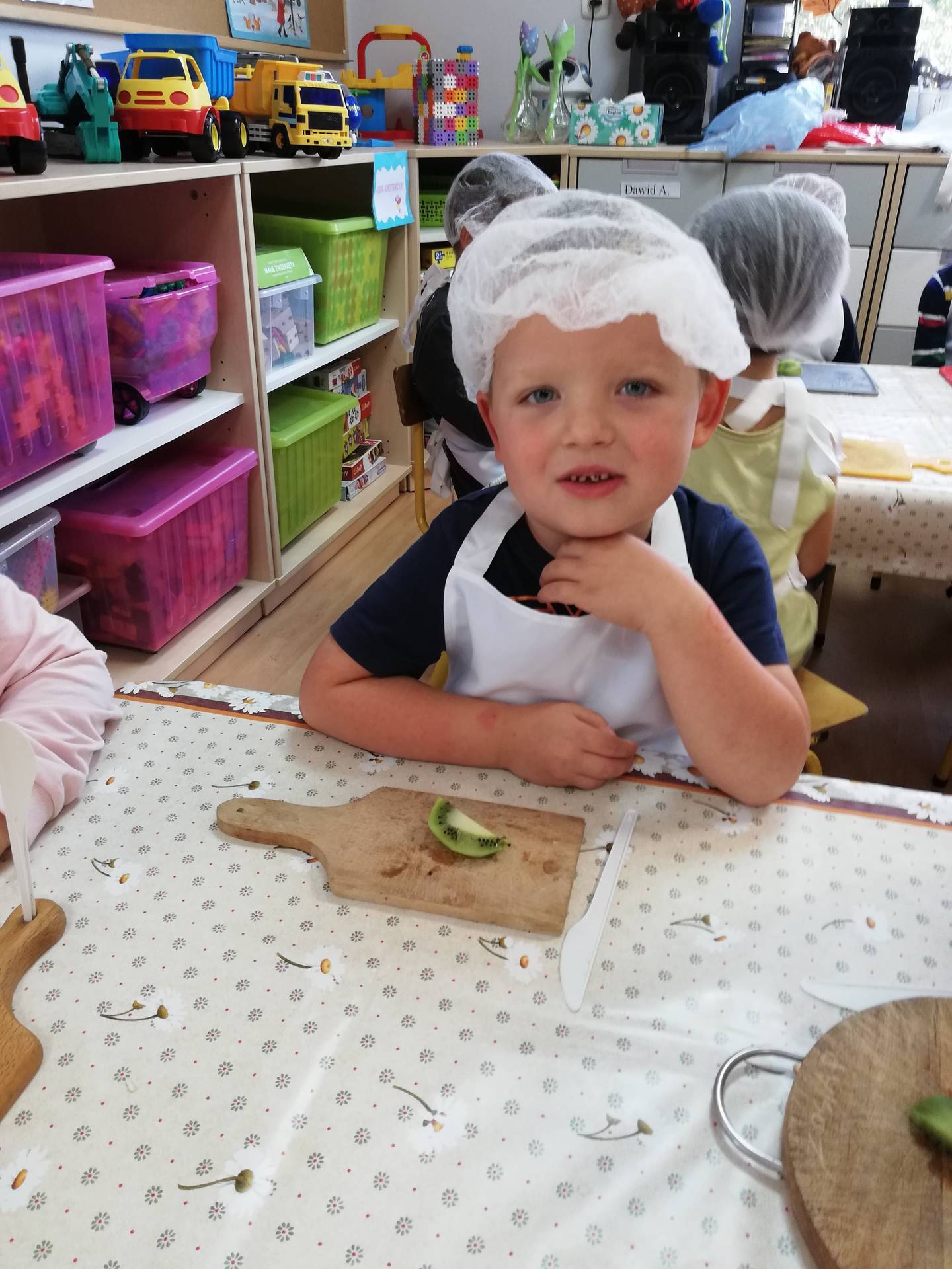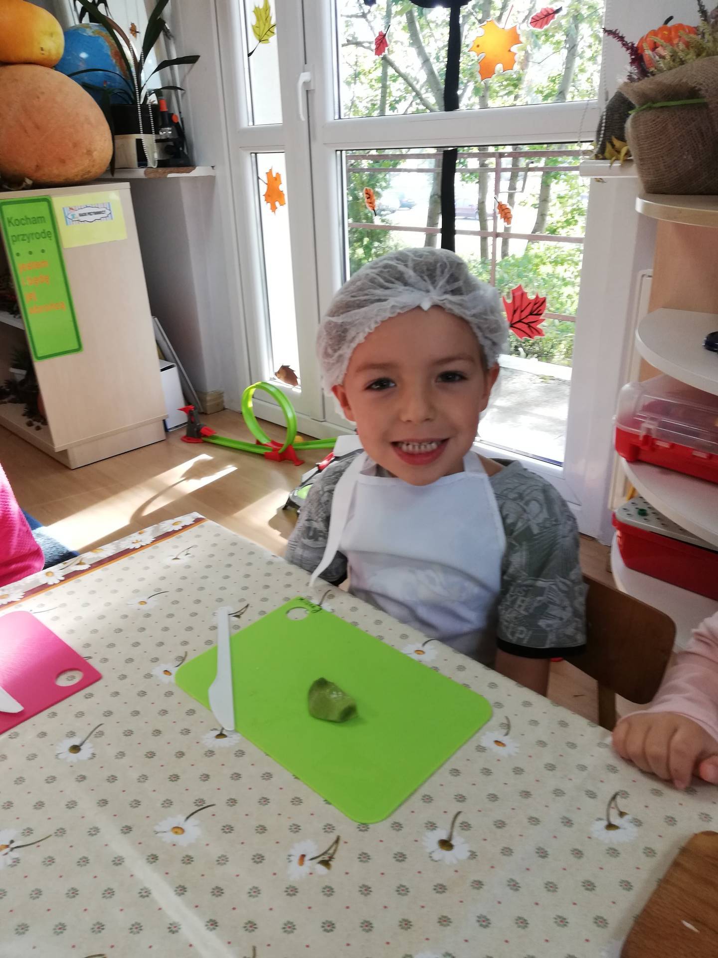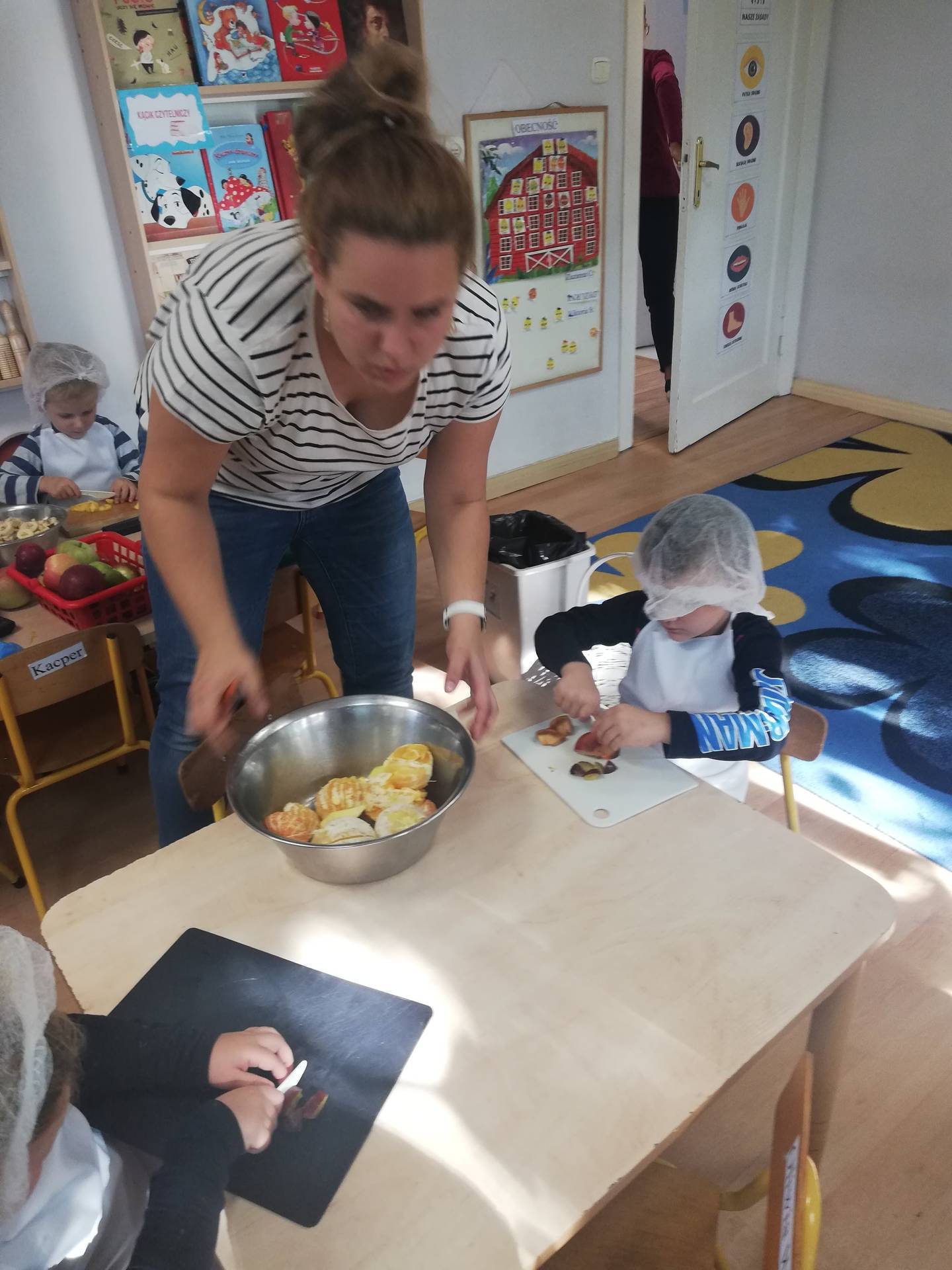 W czwartek 27 września było w naszej grupie smacznie a przede wszystkim zdrowo! Dzieci przygotowały pyszną, witaminową sałatkę. Przyniosły z domów różne świeże owoce. Były jabłka, gruszki banany, śliwki, brzoskwinie, nektarynki, kiwi, pomarańcze, mandarynki i winogrona.Wszyscy mieli soczyste minki na widok tak smakowitych owoców i każdy z chęcią zabrał się do pracy.Dokładnie umyliśmy rączki i ubraliśmy fartuszki.Każdy miał swoją deseczkę, nożyk i tak zabraliśmy się do krojenia. Dzieci samodzielnie kroiły sałatkę owocową przestrzegając zasad bezpieczeństwa przy posługiwaniu się nożem.