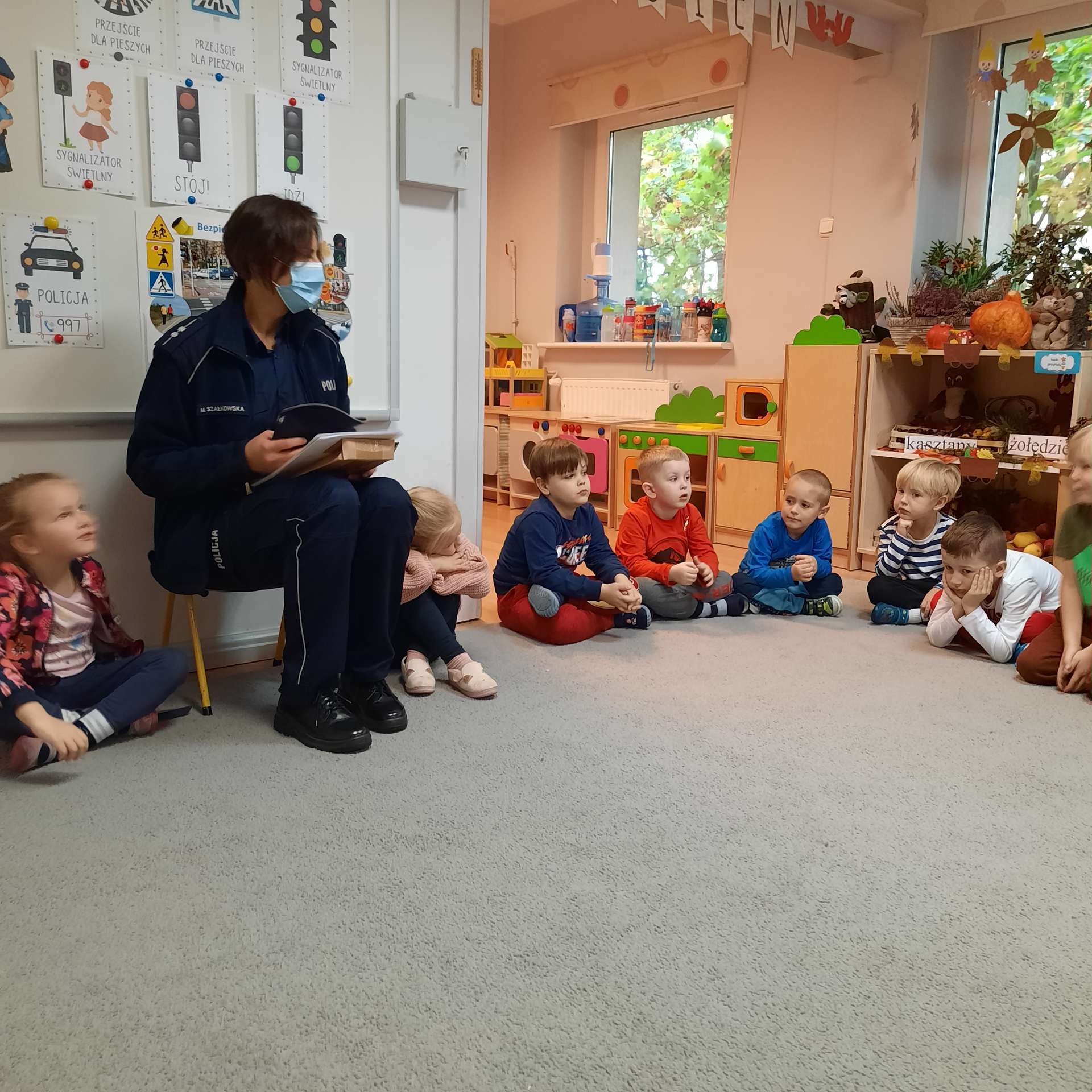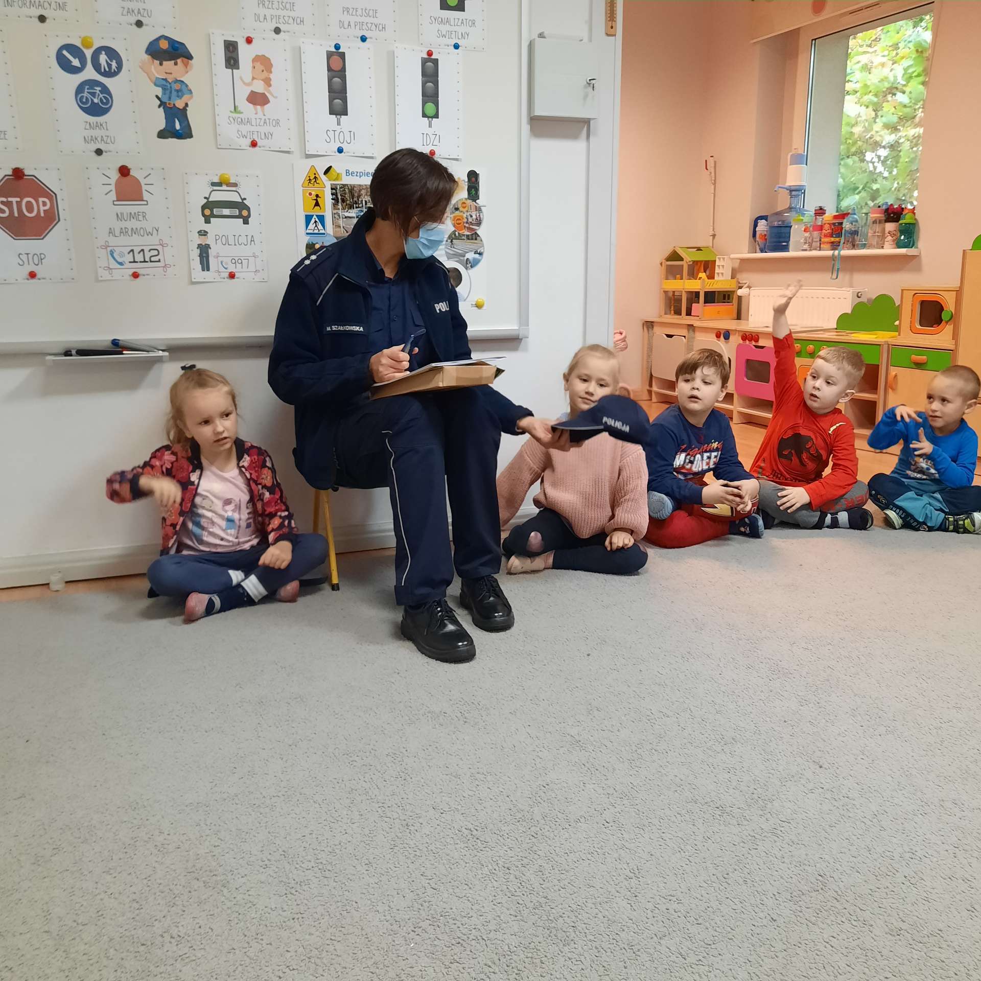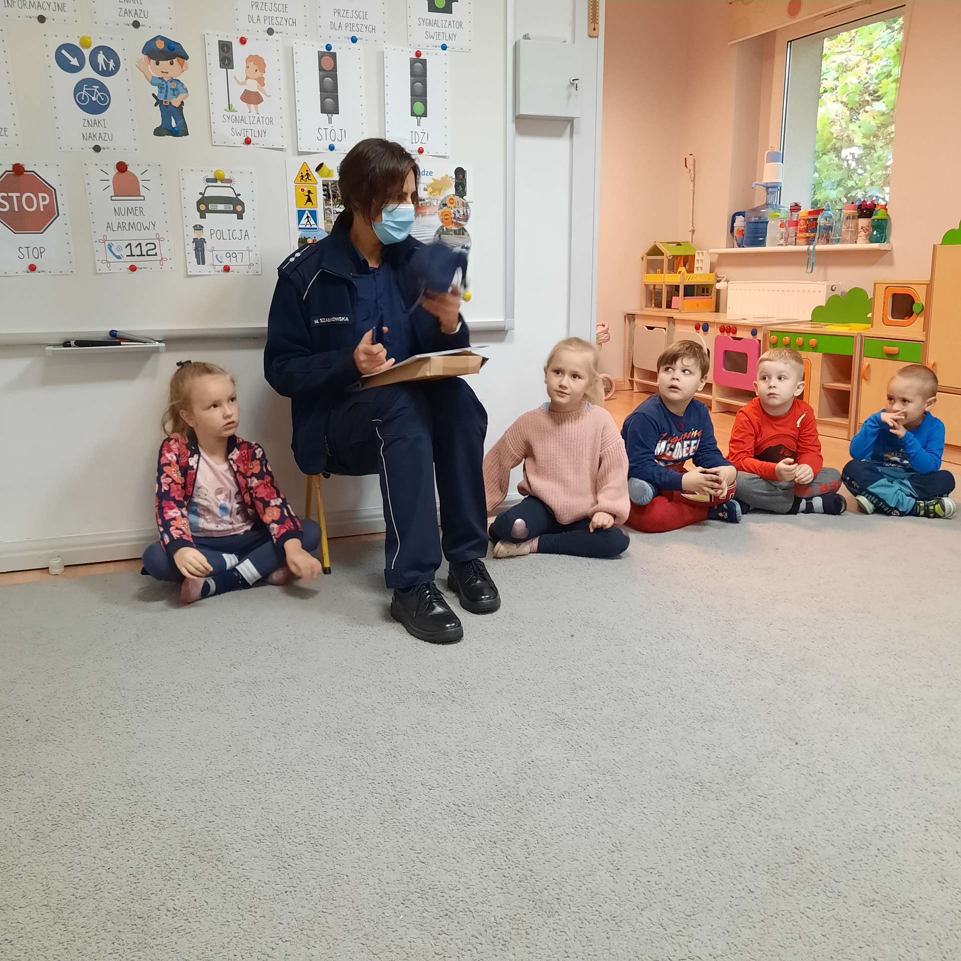 15.10.2021 r. gościliśmy w przedszkolu p. policjantkę, która przybliżyła dzieciom zasady bezpieczeństwa ruchu drogowego. Spotkania odbyły się oddzielnie w każdej grupie wiekowej.