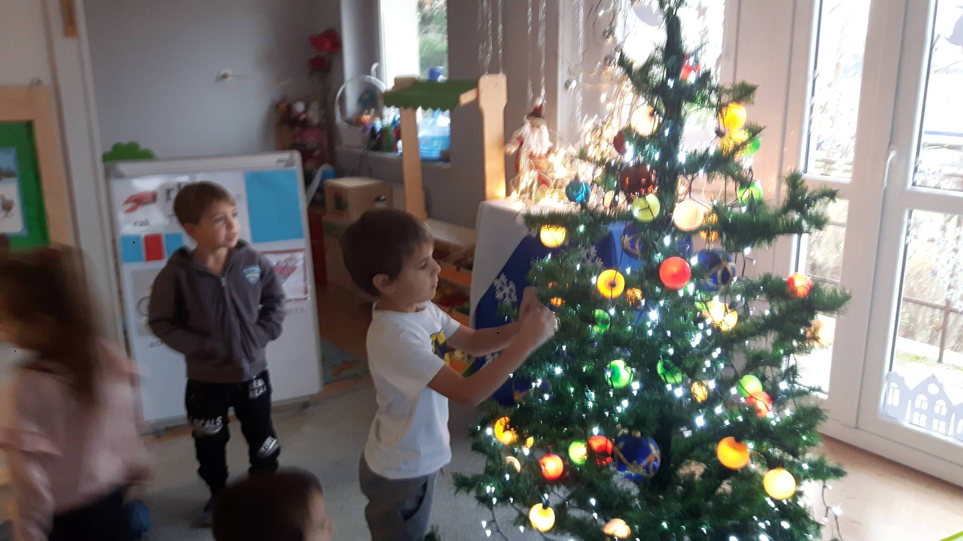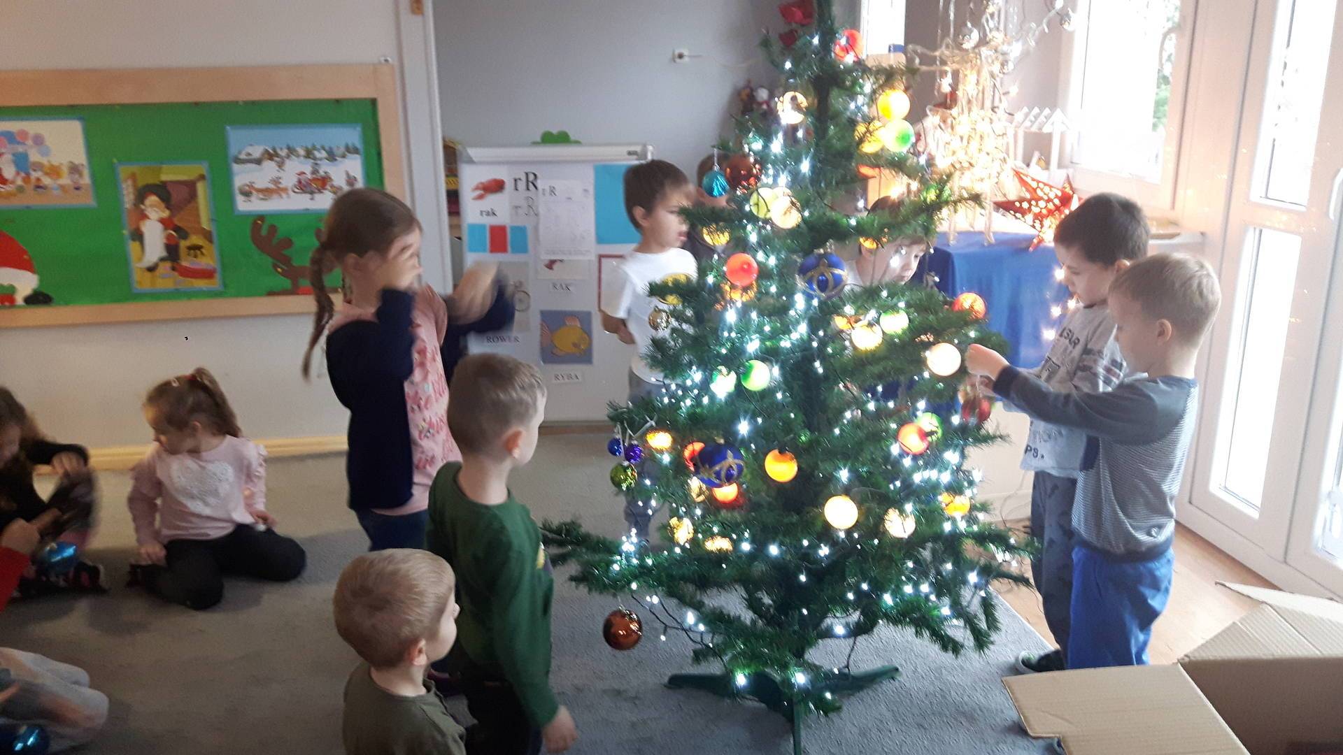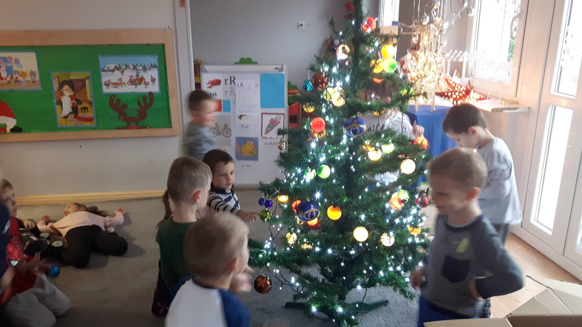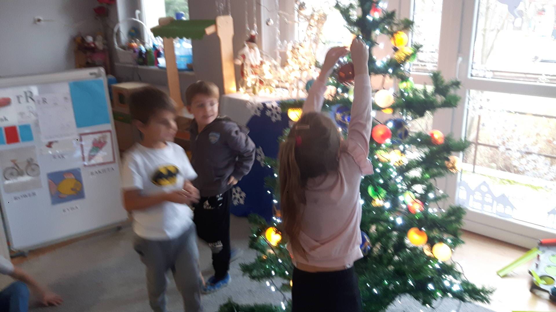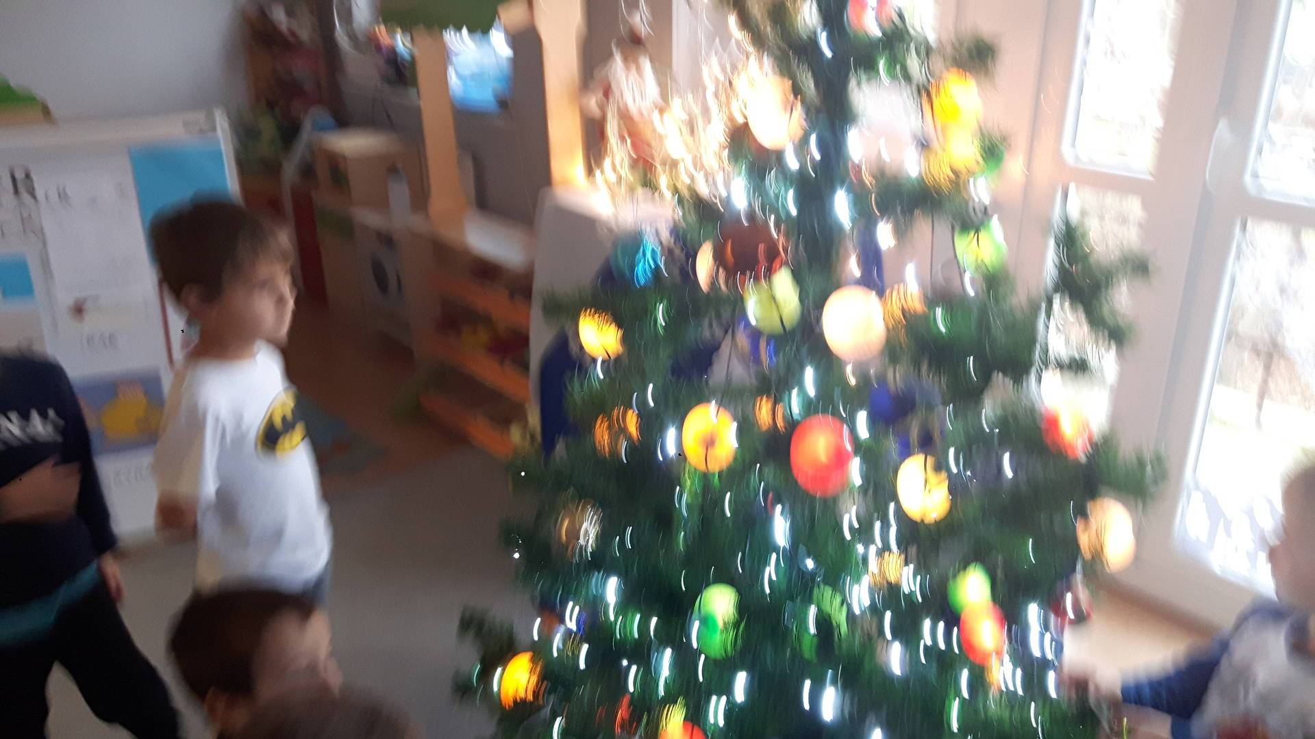 Zbliżają się święta Bożego Narodzenia a ich głównym symbolem jest choinka. I również w przedszkolu ją ubieraliśmy. Bombki, łańcuchy i lampki, każde dziecko chciało pomóc i z radością ozdabiało nasze grupowe drzewko.