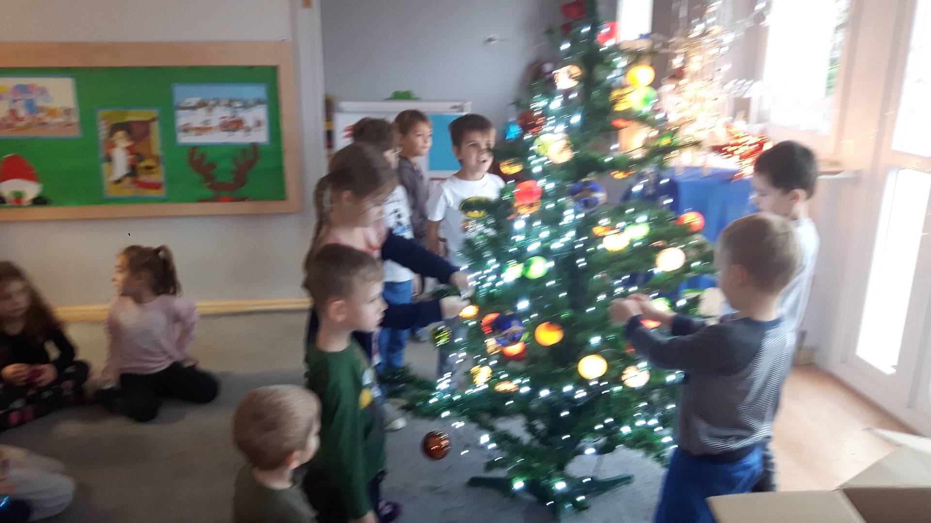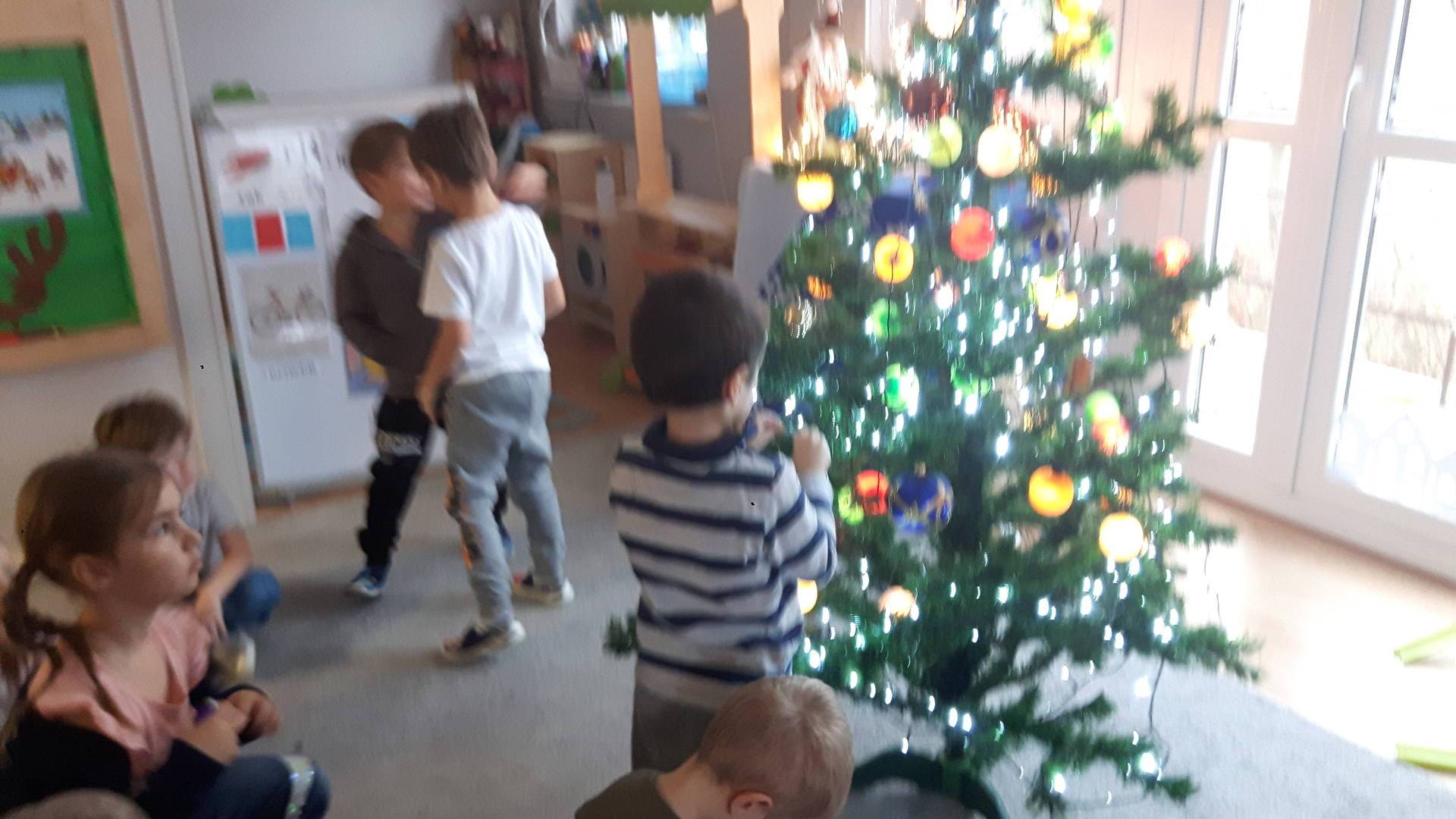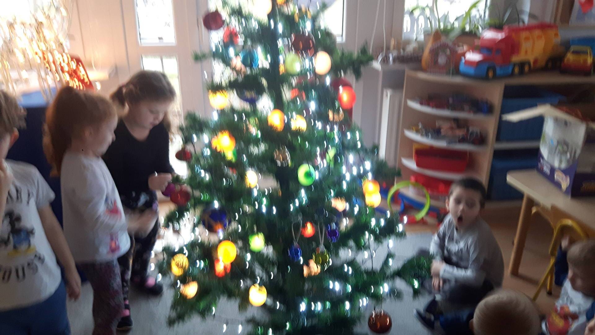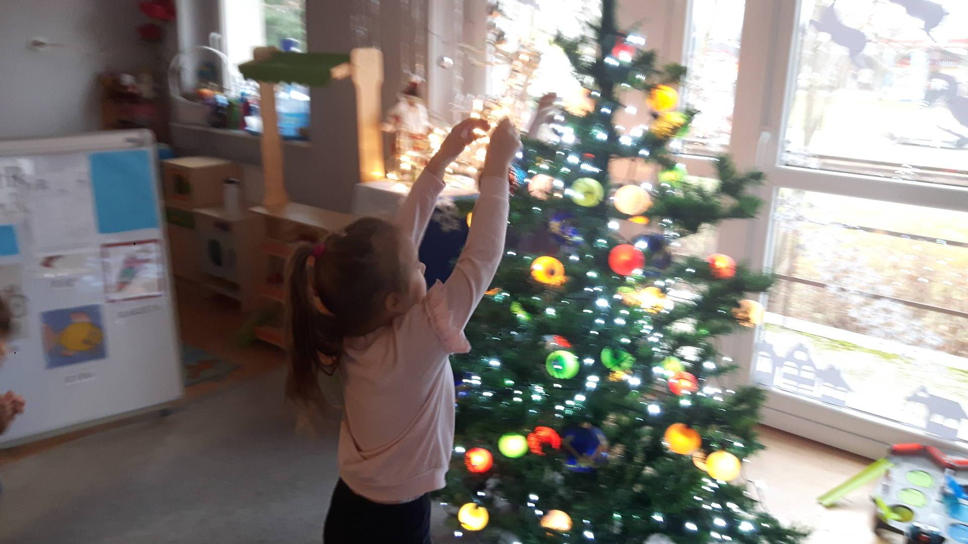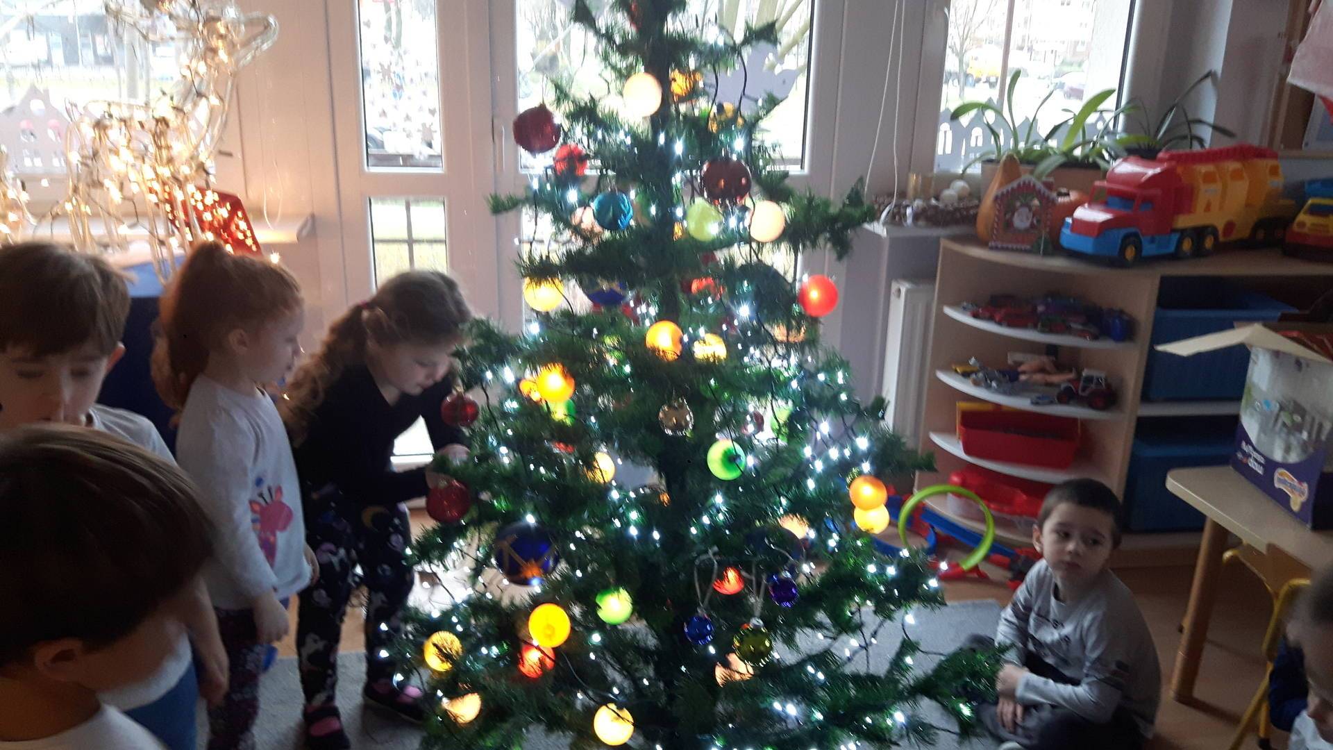 Zbliżają się święta Bożego Narodzenia a ich głównym symbolem jest choinka. I również w przedszkolu ją ubieraliśmy. Bombki, łańcuchy i lampki, każde dziecko chciało pomóc i z radością ozdabiało nasze grupowe drzewko.