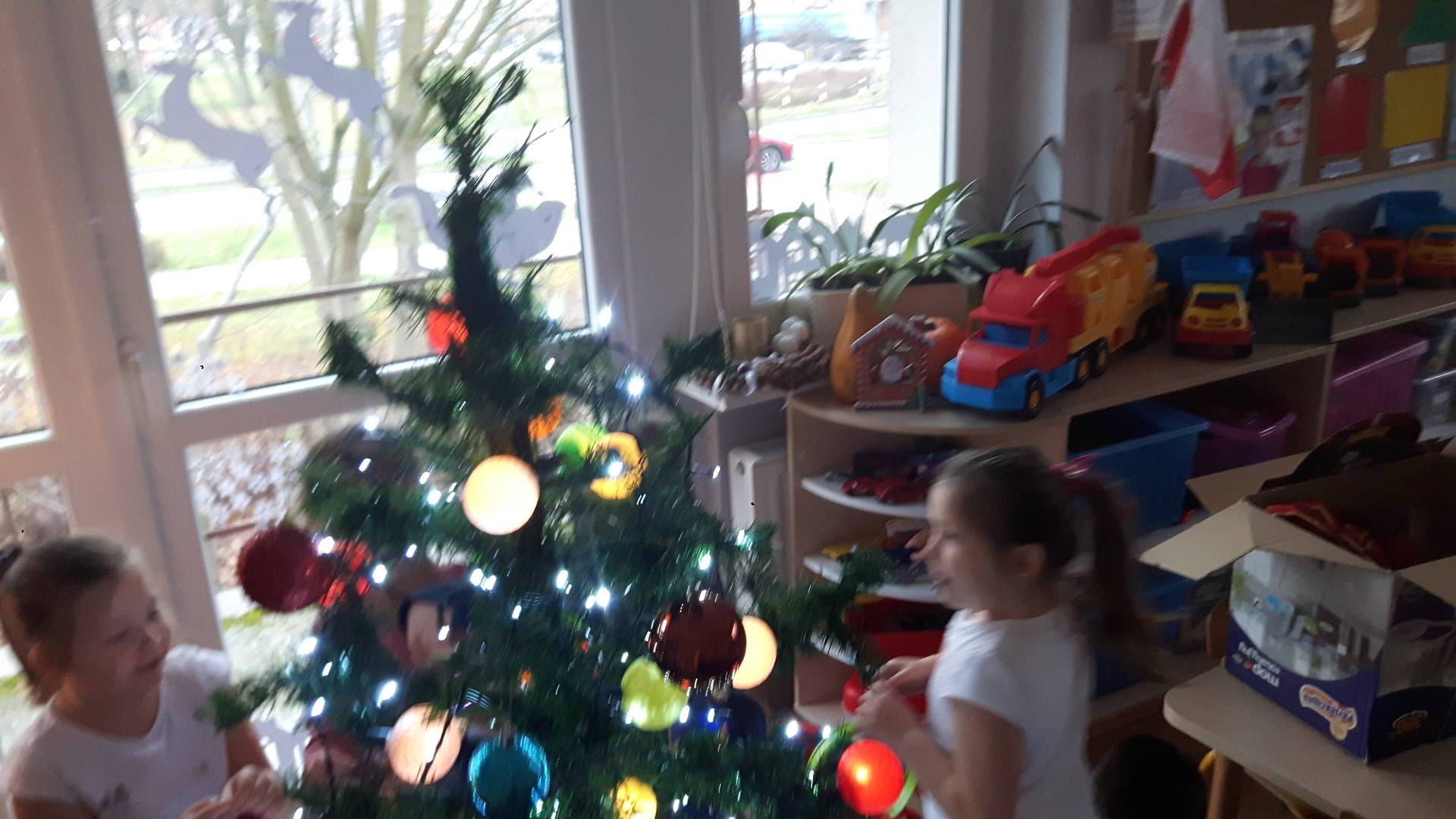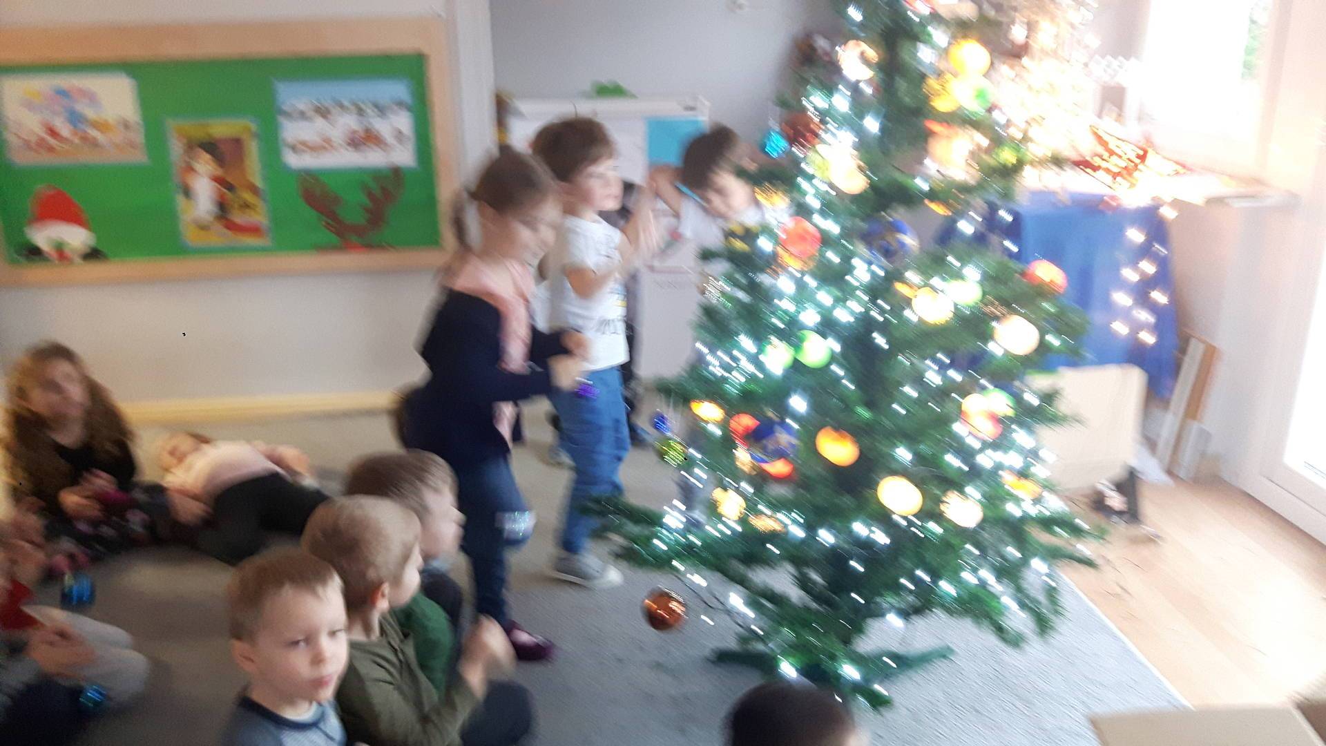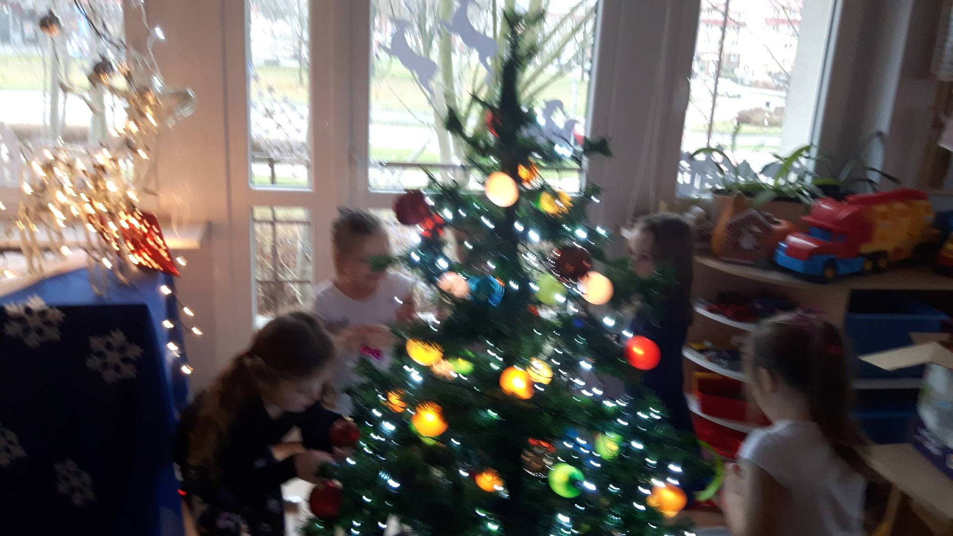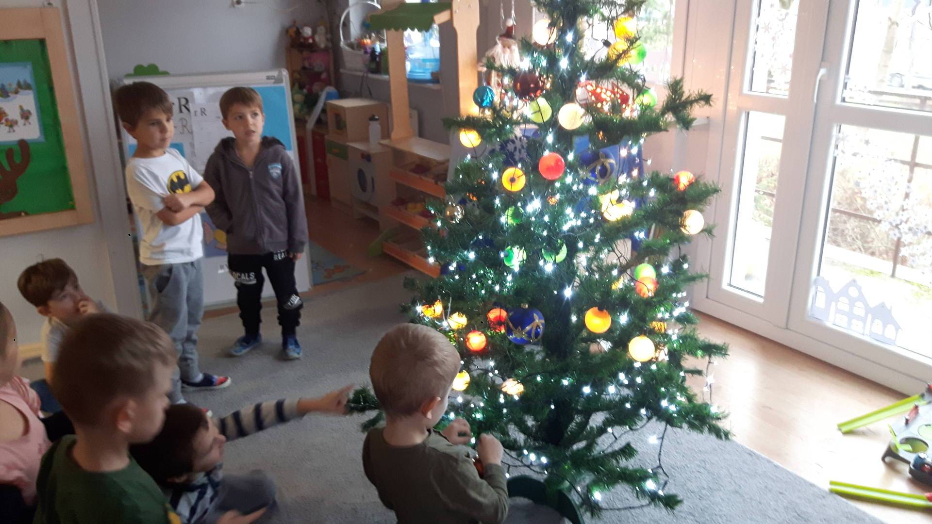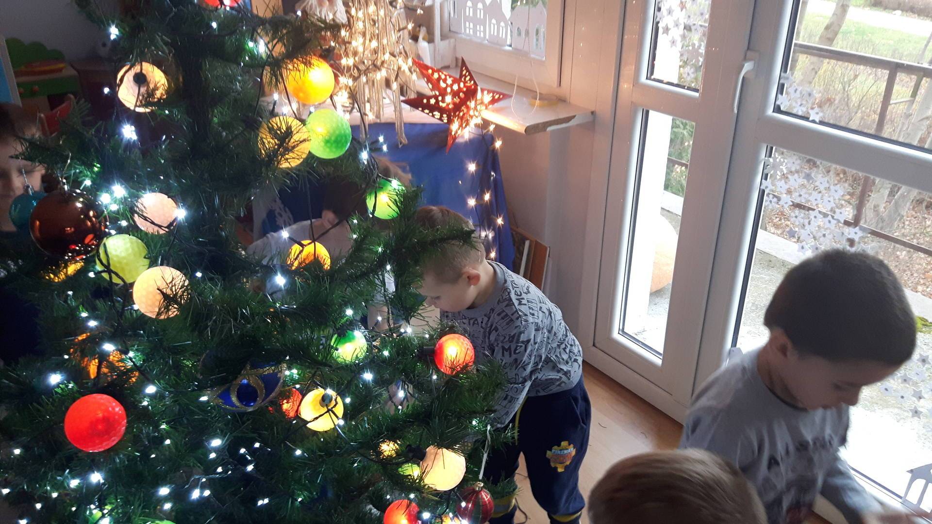 Zbliżają się święta Bożego Narodzenia a ich głównym symbolem jest choinka. I również w przedszkolu ją ubieraliśmy. Bombki, łańcuchy i lampki, każde dziecko chciało pomóc i z radością ozdabiało nasze grupowe drzewko.