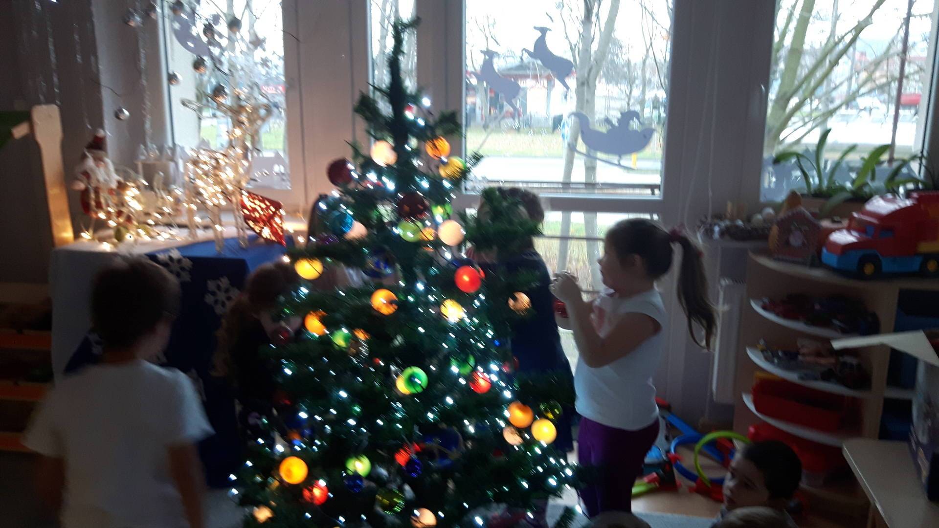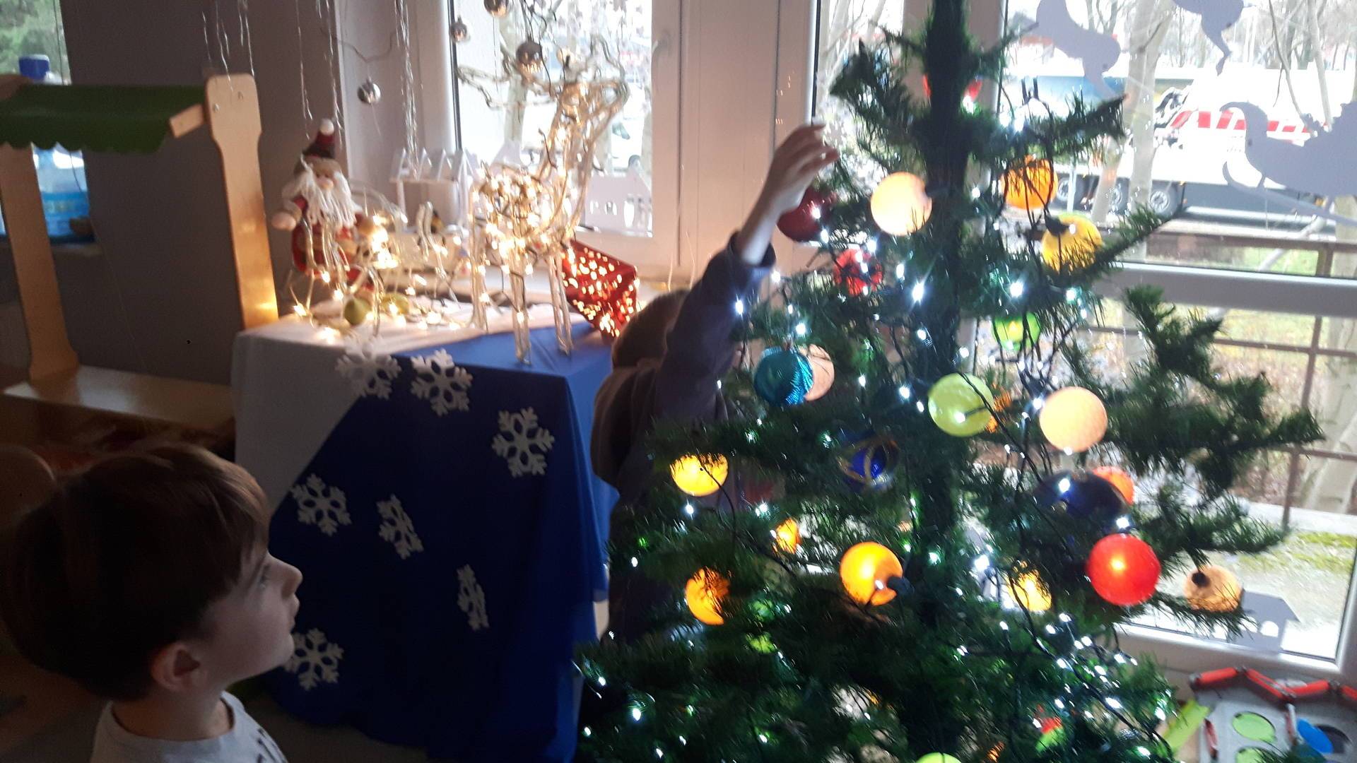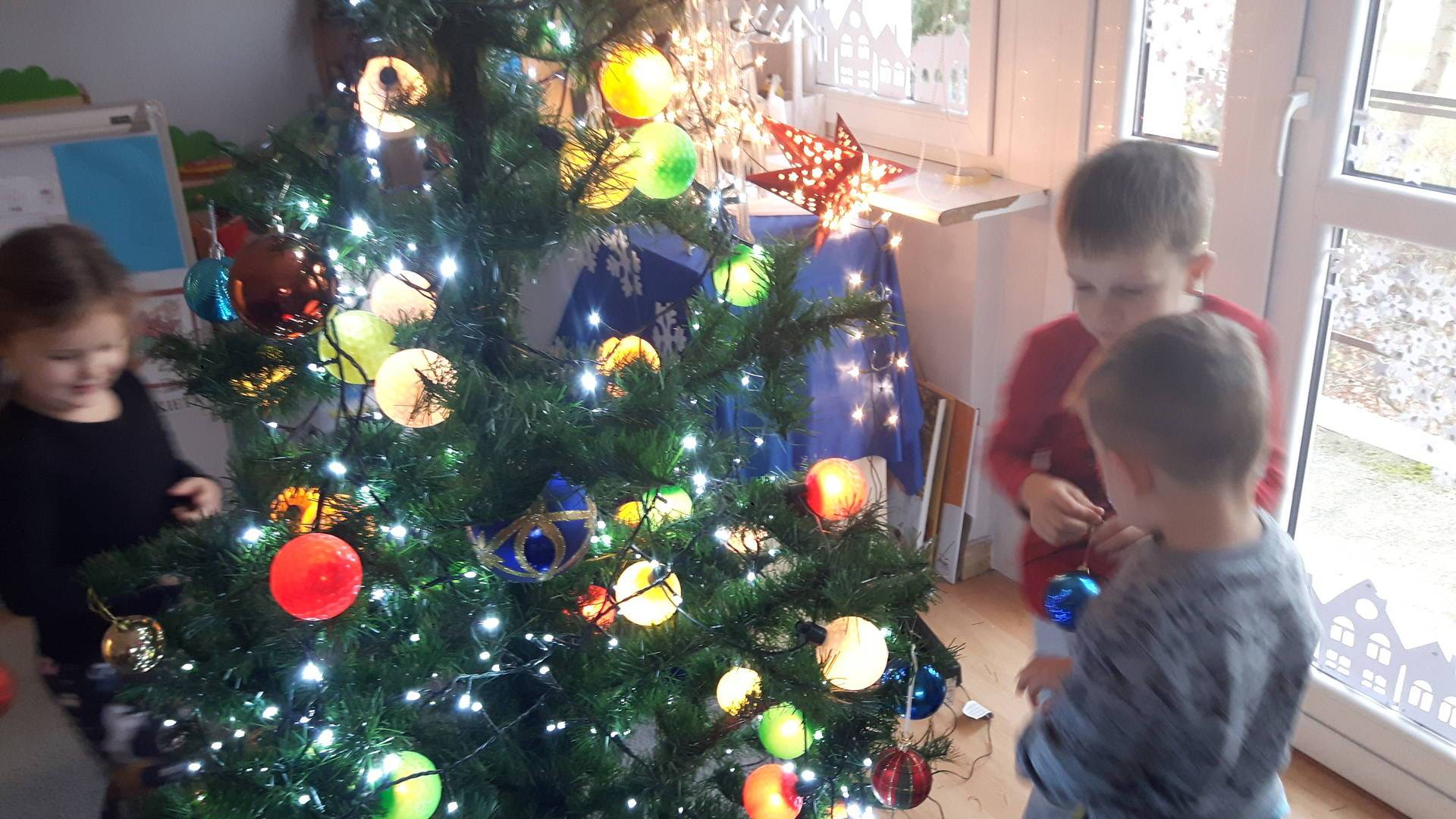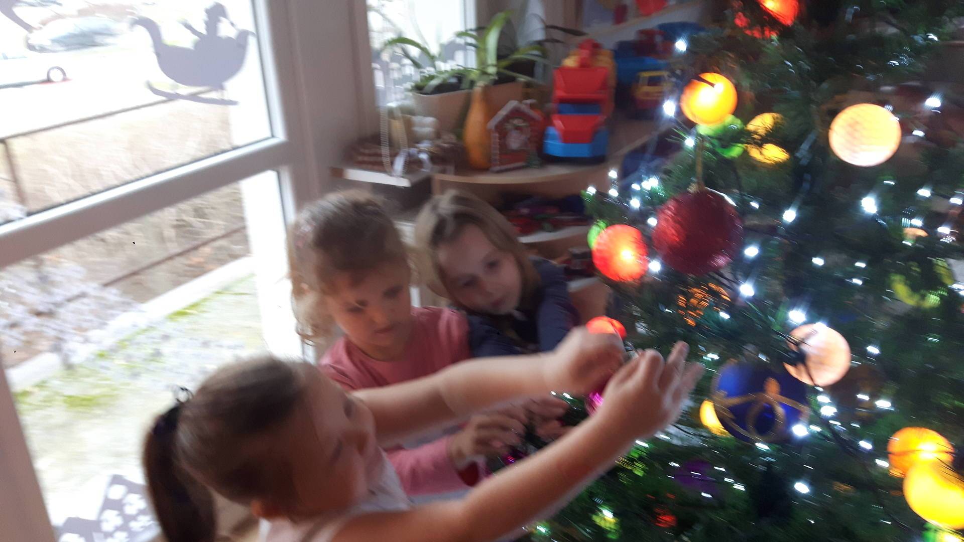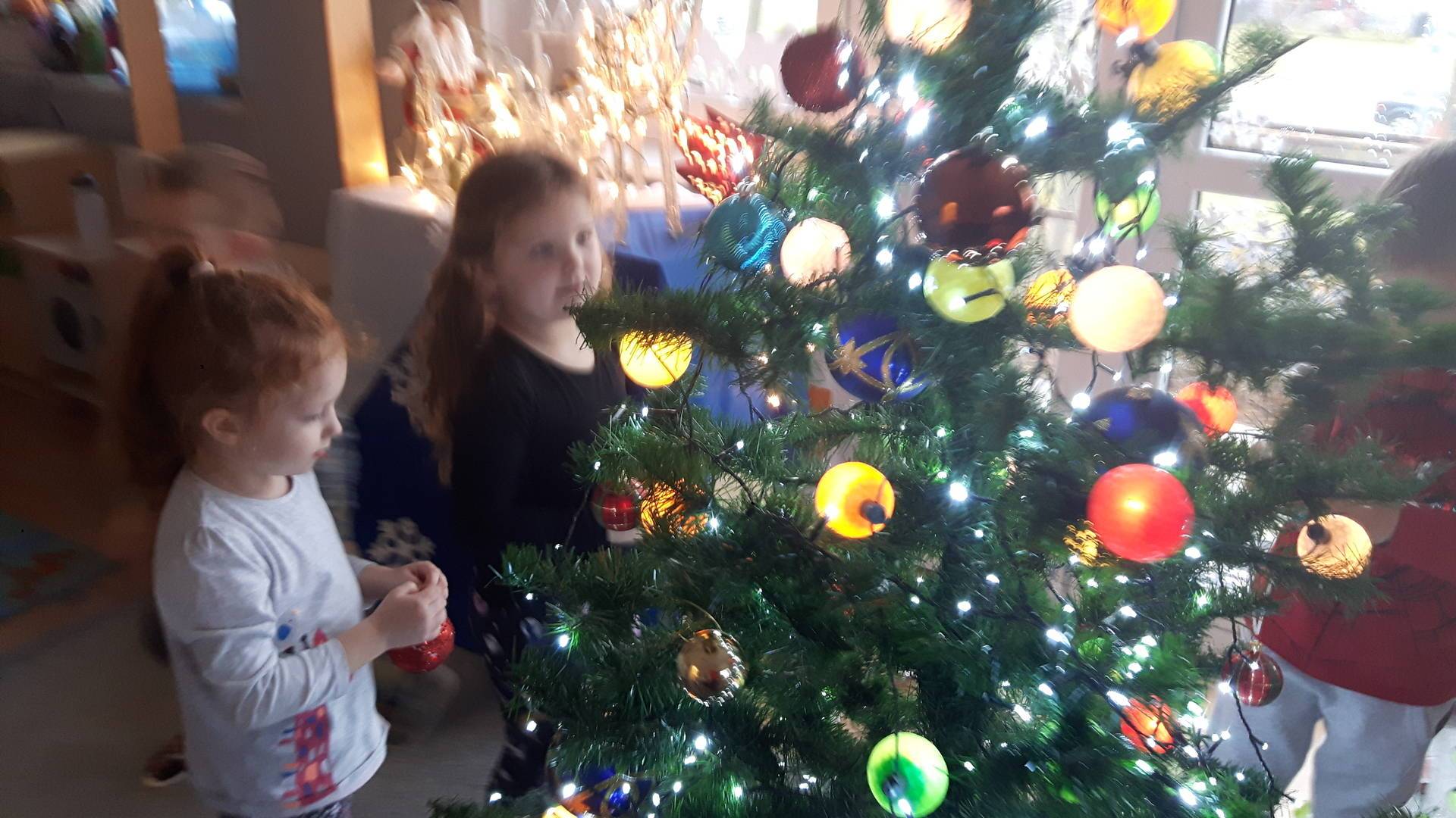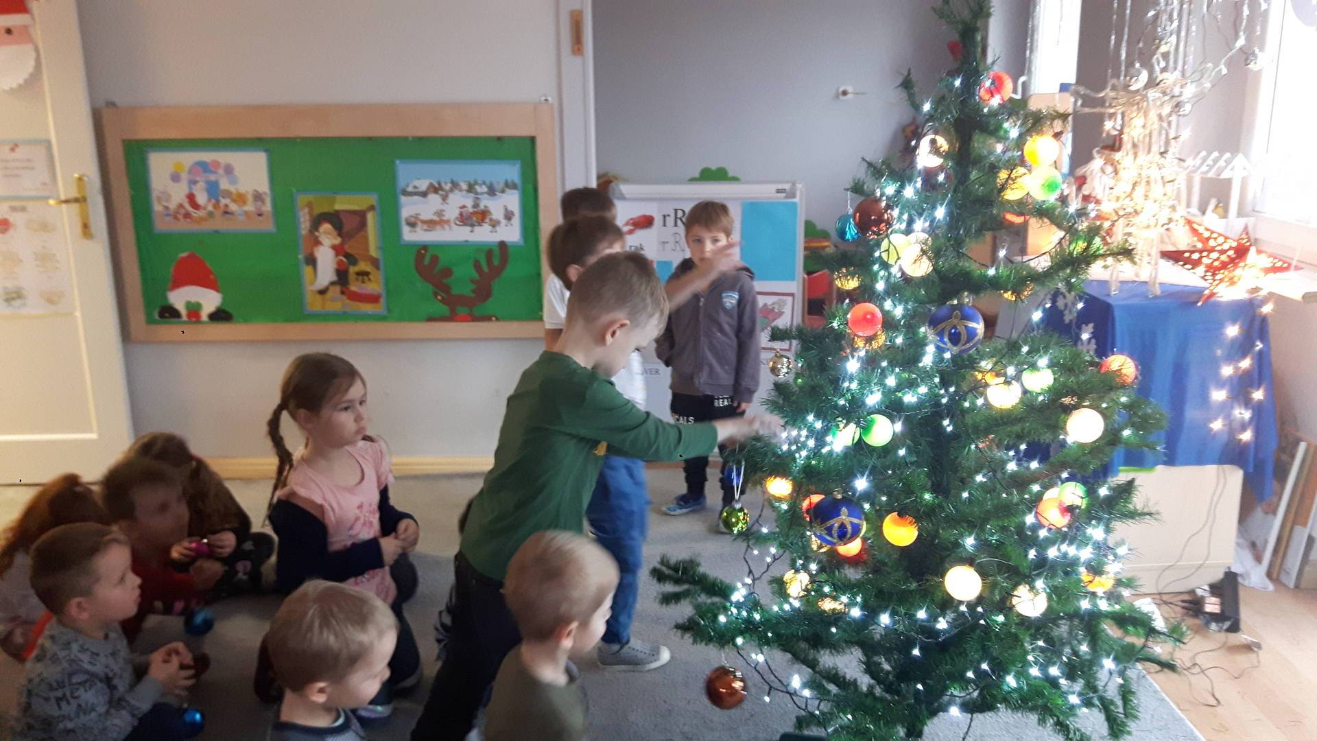 Zbliżają się święta Bożego Narodzenia a ich głównym symbolem jest choinka. I również w przedszkolu ją ubieraliśmy. Bombki, łańcuchy i lampki, każde dziecko chciało pomóc i z radością ozdabiało nasze grupowe drzewko.