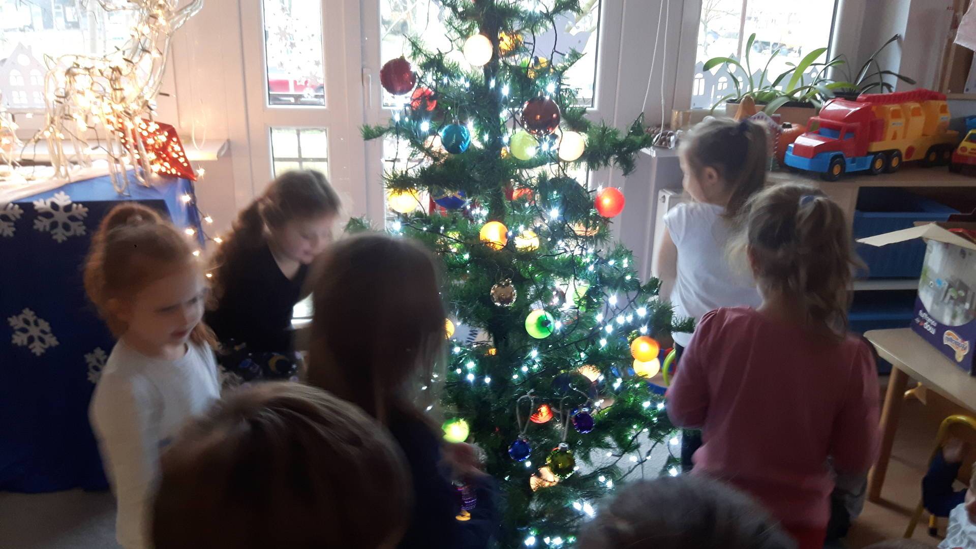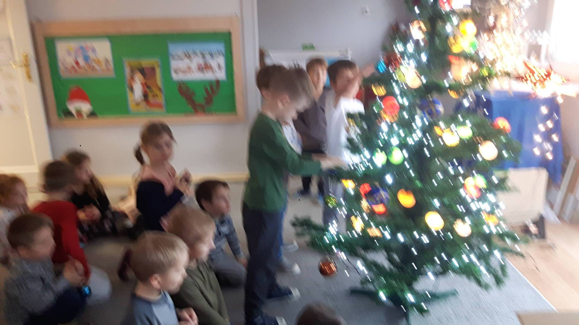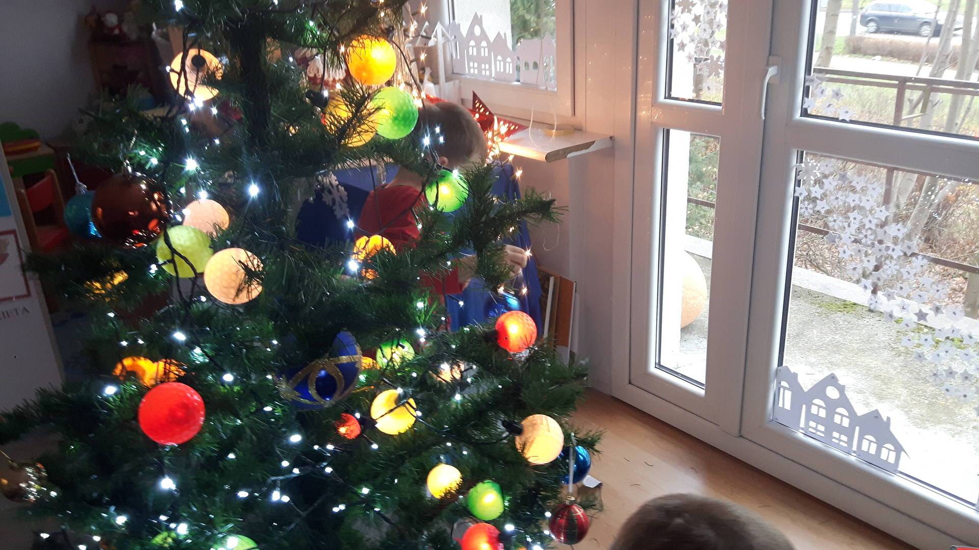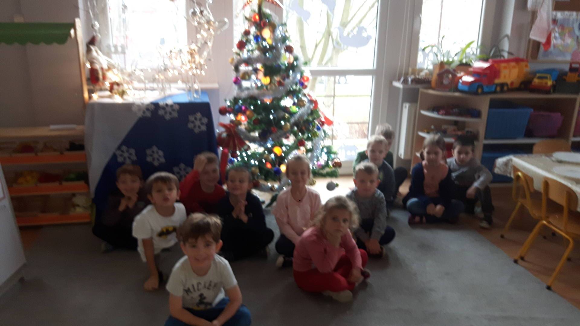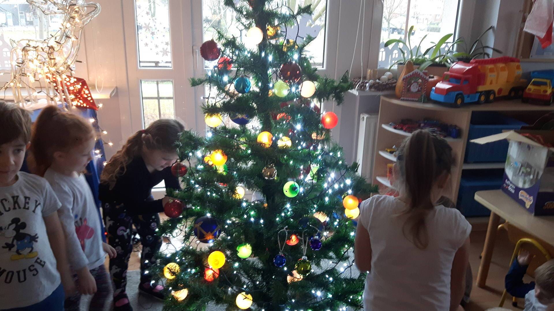 Zbliżają się święta Bożego Narodzenia a ich głównym symbolem jest choinka. I również w przedszkolu ją ubieraliśmy. Bombki, łańcuchy i lampki, każde dziecko chciało pomóc i z radością ozdabiało nasze grupowe drzewko.